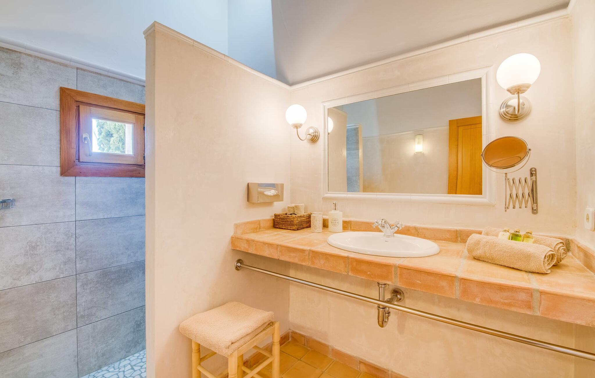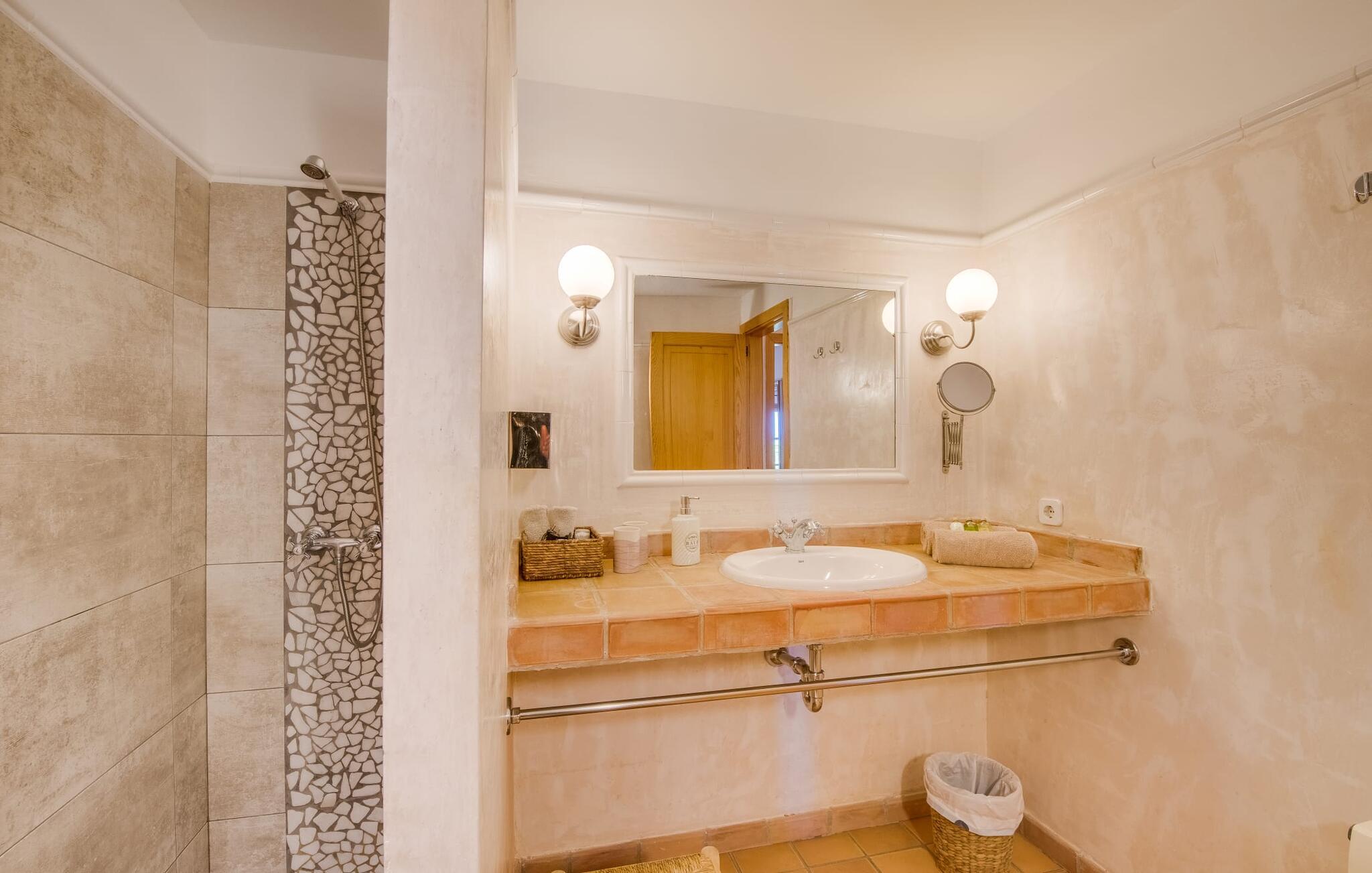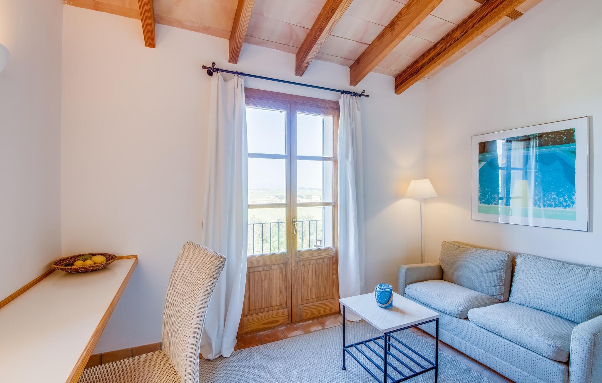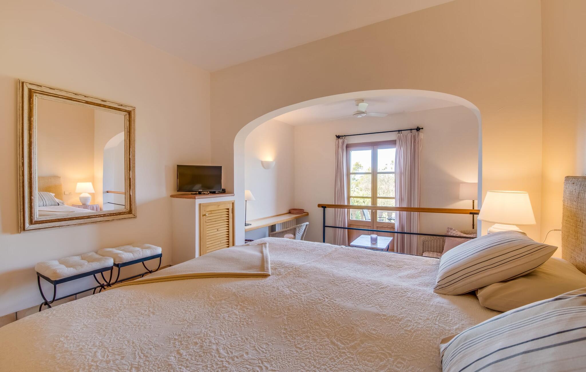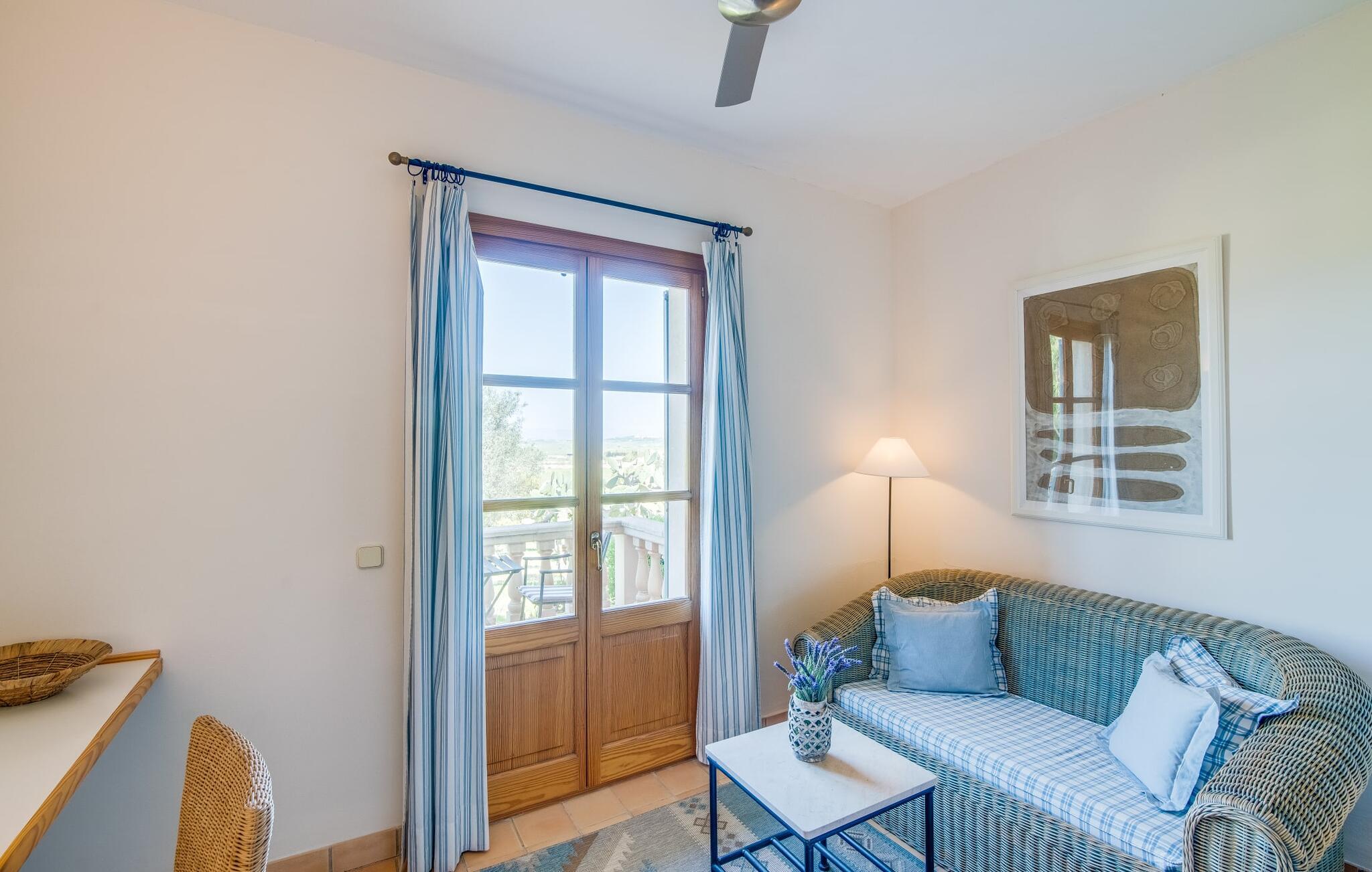 Når I ankommer til Villa "Son Canals", tag et øjeblik til at indånde skønheden i den 14.300 m² store ejendom er omgivet af en rummelig terrasse med en lang pool Højkvalitets træstole og lærredsparasoller inviterer jer til at solbade og tilbyde en betagende udsigt. på den solbeskinnede morgenmadsterrasse Det alsidige udendørsområde omfatter et smukt sommerkøkken med et stort bord, ideelt til afslapning med en solid grill. Indenfor inviterer den rummelige stue med pejs og højt til loftet en afslappet atmosfære med en god bog eller film Det lyse køkken i spansk stil er fuldt udstyret med alle de nødvendige apparater og det lange spisebord rummer komfortabelt alle. Seks dobbeltværelser, hver med eget badeværelse og direkte adgang til en balkon eller terrasse, tilbyder afslappende tilflugtssteder. Med sin stilfulde indretning sikrer denne villa en uforglemmelig ferieoplevelse. De venlige ejere bor i et separat hus og sikrer eksklusiv brug af haven og poolen. Den slående komfortable villa "Son Canals" er beliggende i en rolig beliggenhed nær Petra, en smuk lille by i den østlige del af Mallorca Med sine supermarkeder, barer og gode restauranter tilbyder Petra alt hvad I behøver for en afslappende ferie i dette indbydende feriehus. Den attraktive naturlige sandstrand fra Son Serra de Marina ligger kun omkring 15 minutter i bil fra villaen. Der er også fem forskellige golfbaner i nærheden.