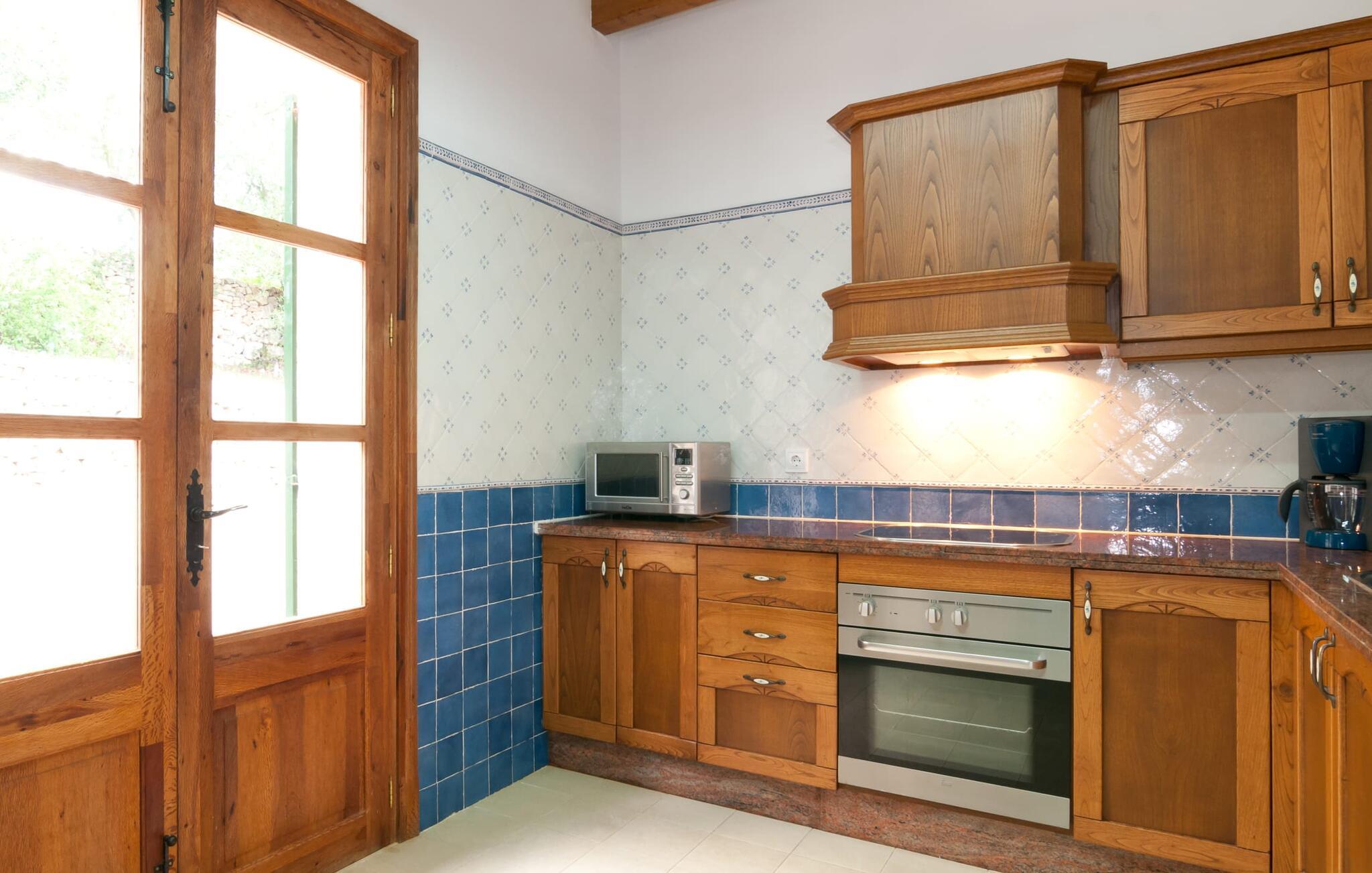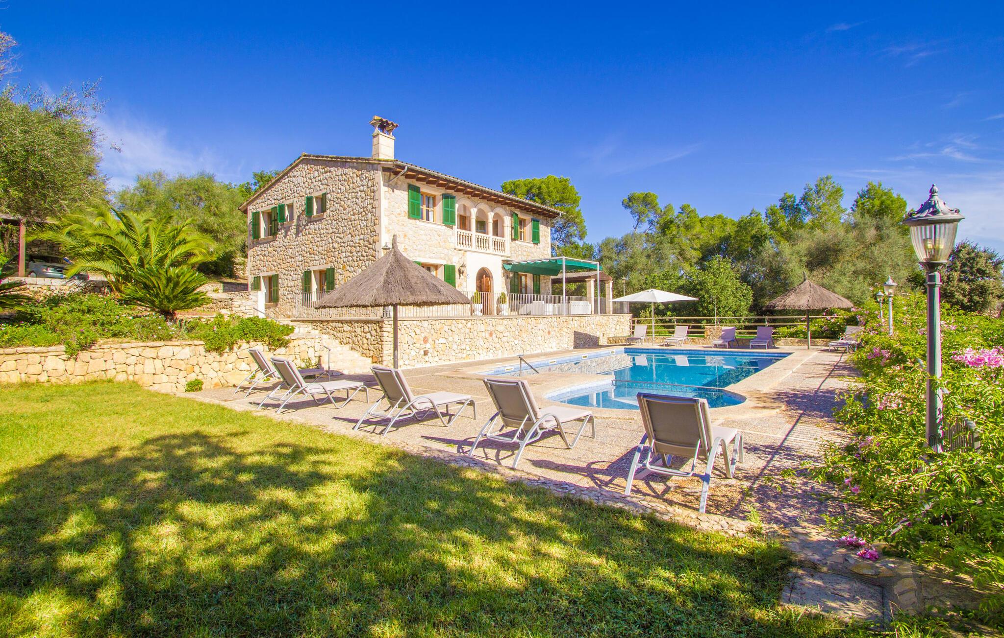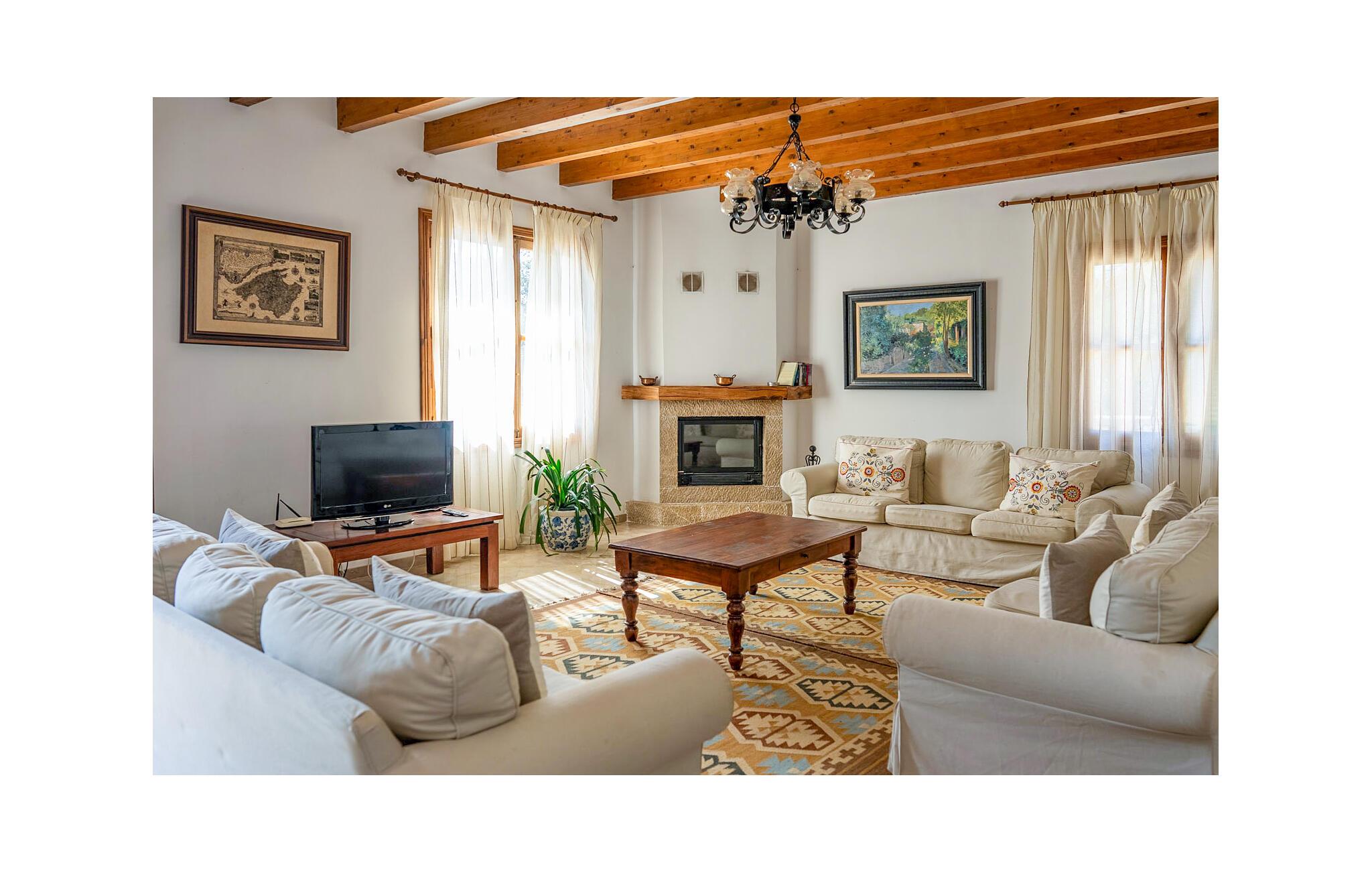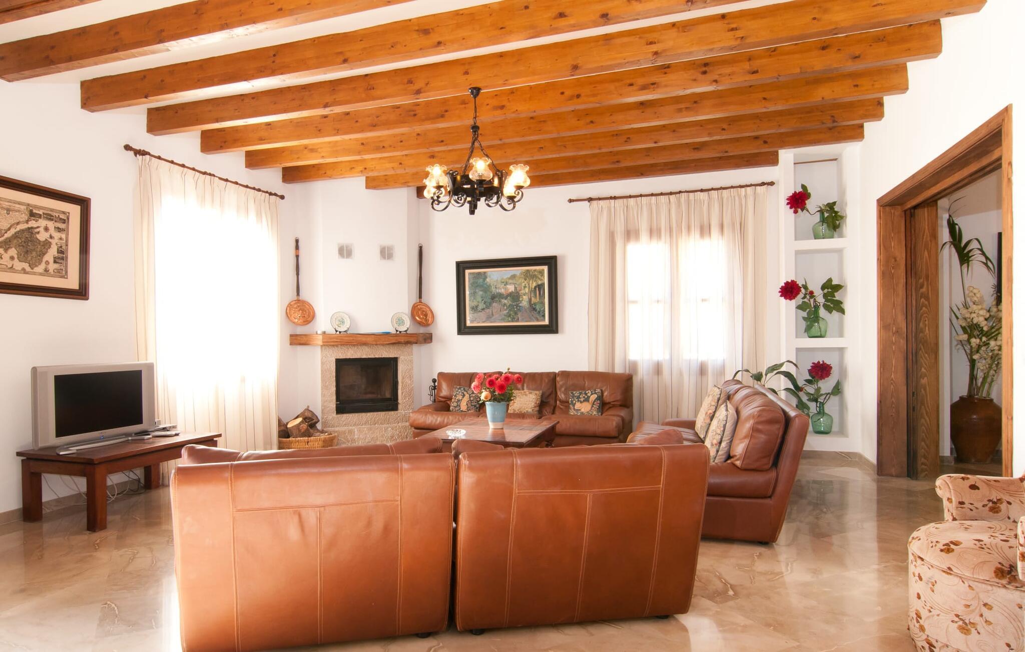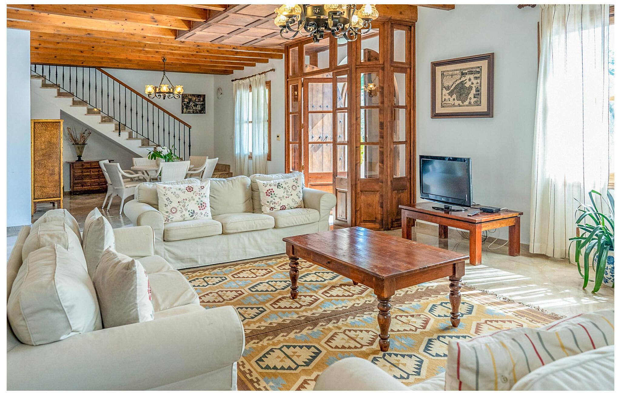Indenfor kombinerer villaen smagfuld indretning med traditionelle bjælkelofter, marmorgulve og værelser med aircondition. Den rummelige opholdsstue har et fladskærms-tv, og det fuldt udstyrede køkken har alt, hvad I behøver for at lave mad derhjemme. Der er fem dobbeltværelser, hver med eget badeværelse, hvilket gør det perfekt til store grupper eller familier.