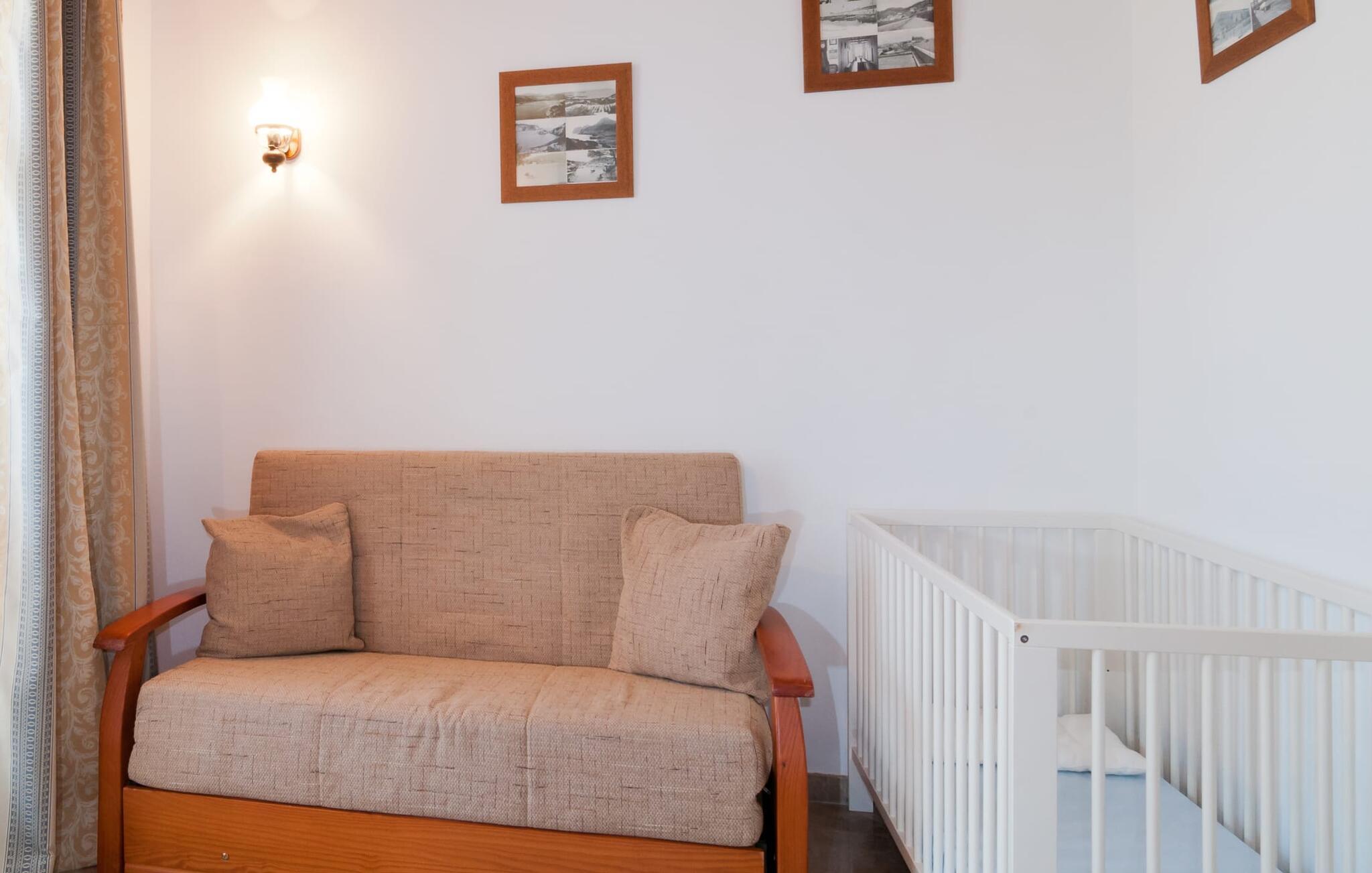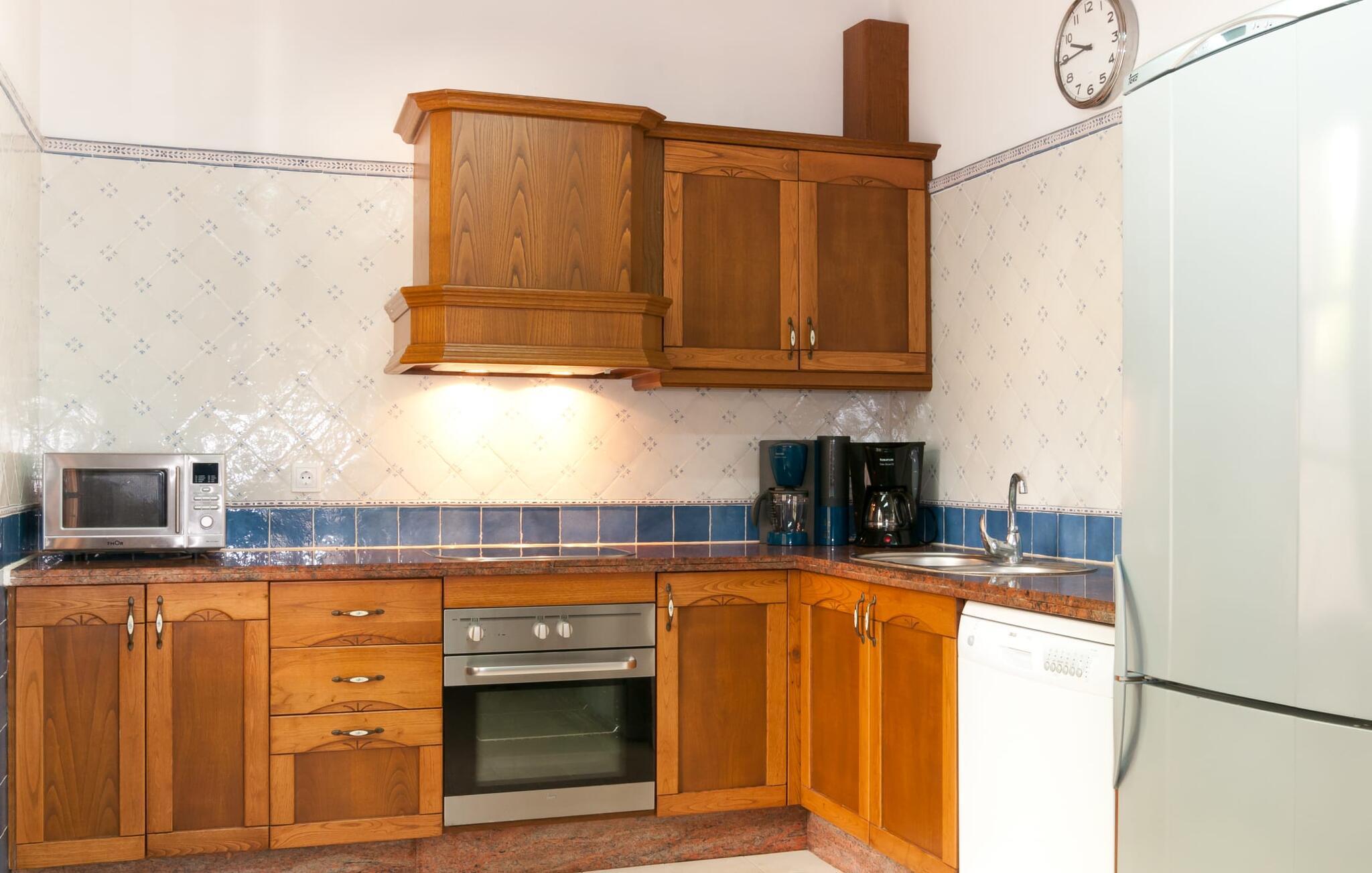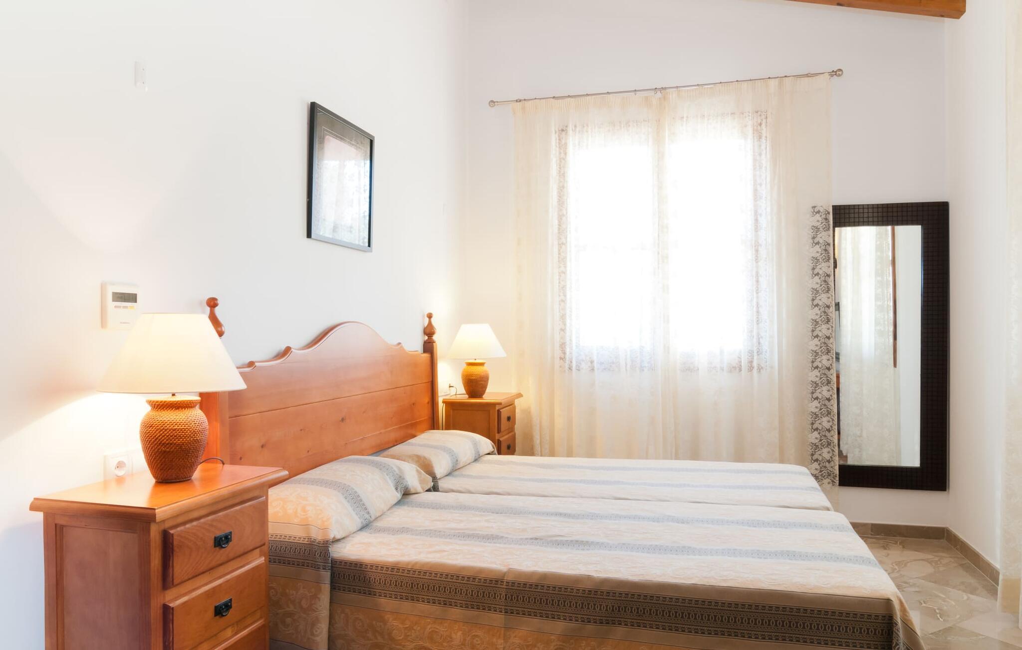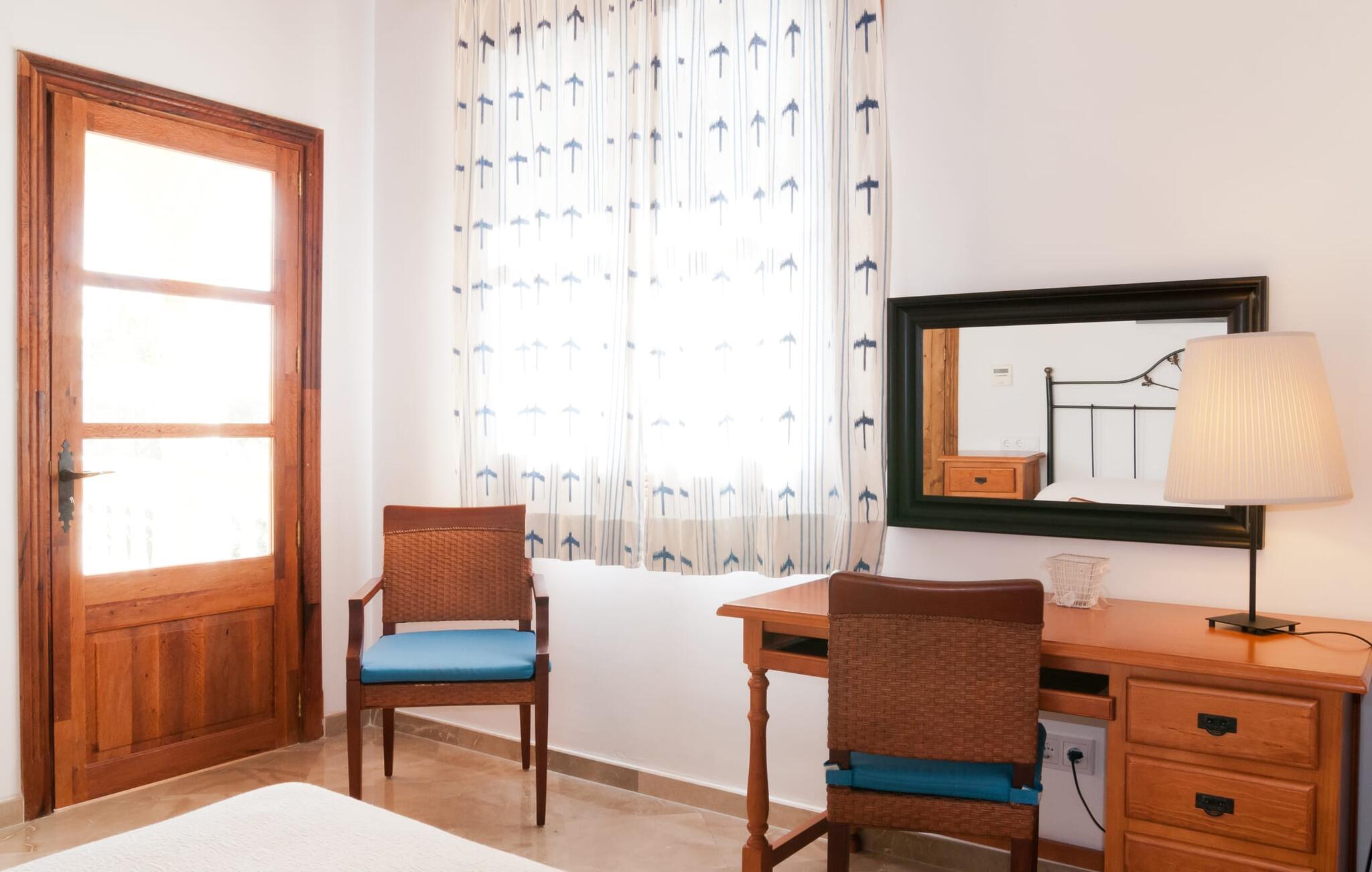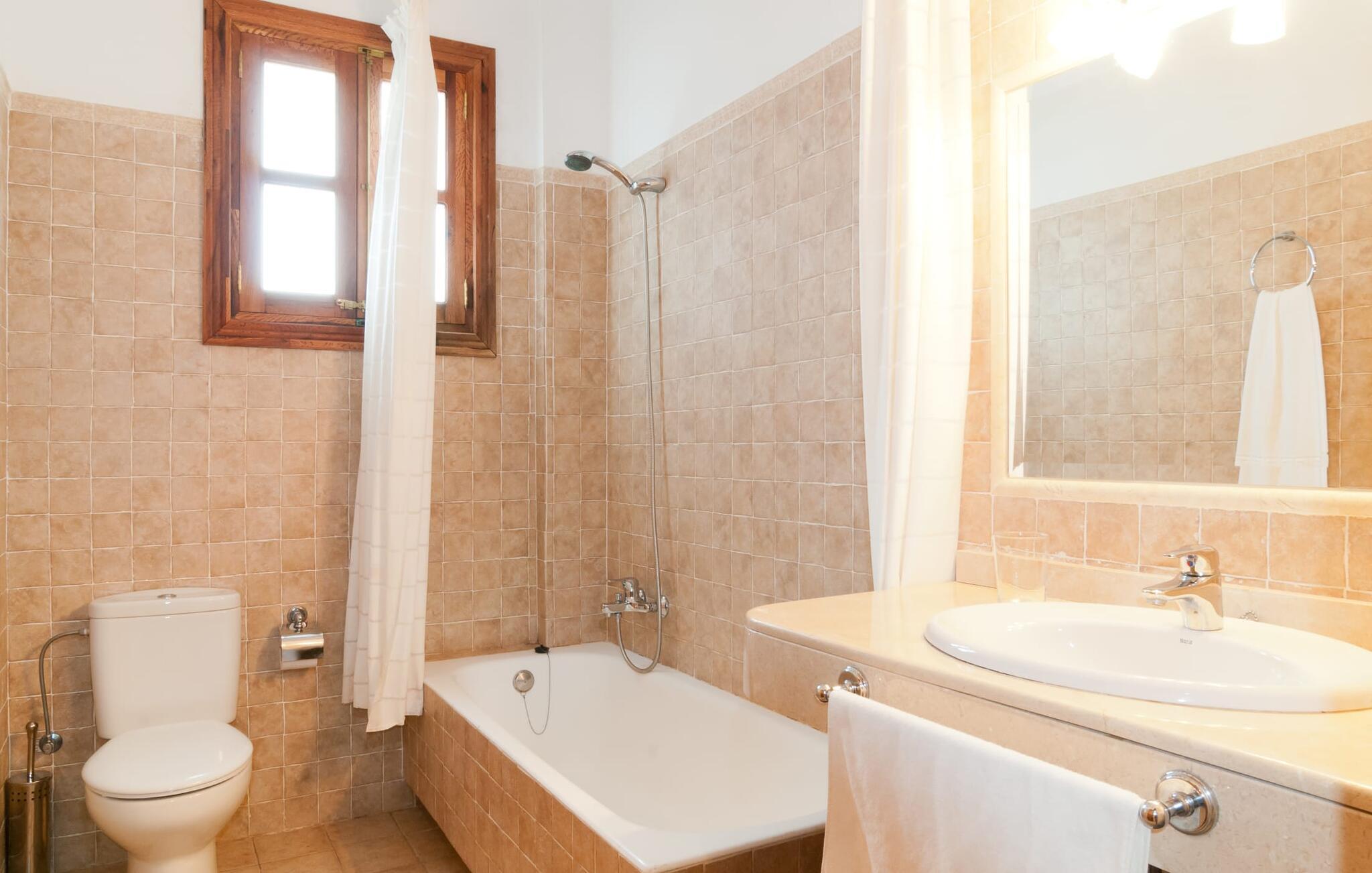 Indenfor kombinerer villaen smagfuld indretning med traditionelle bjælkelofter, marmorgulve og værelser med aircondition. Den rummelige opholdsstue har et fladskærms-tv, og det fuldt udstyrede køkken har alt, hvad I behøver for at lave mad derhjemme. Der er fem dobbeltværelser, hver med eget badeværelse, hvilket gør det perfekt til store grupper eller familier.