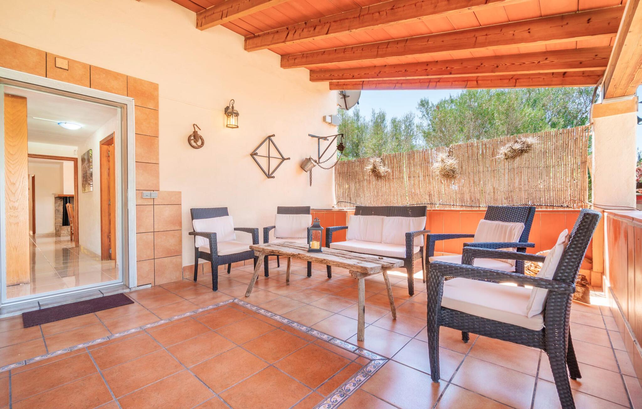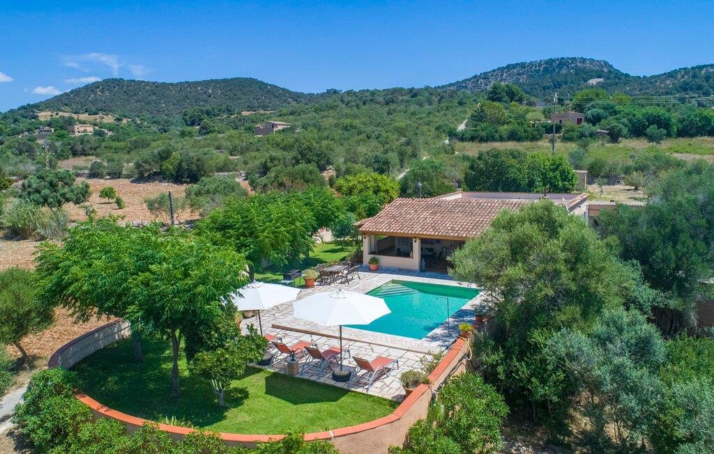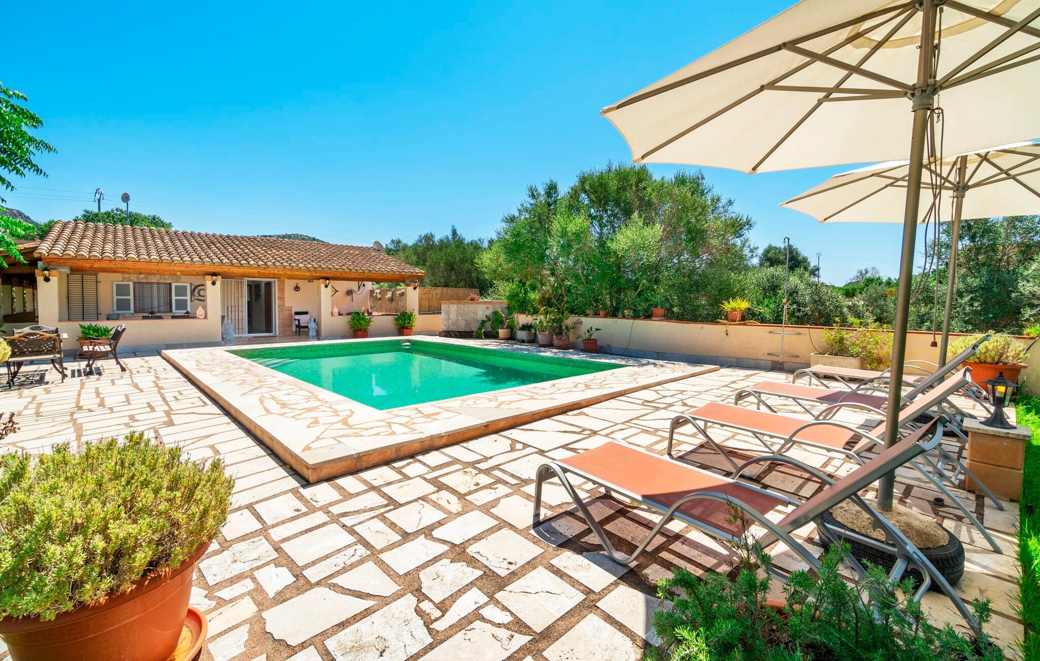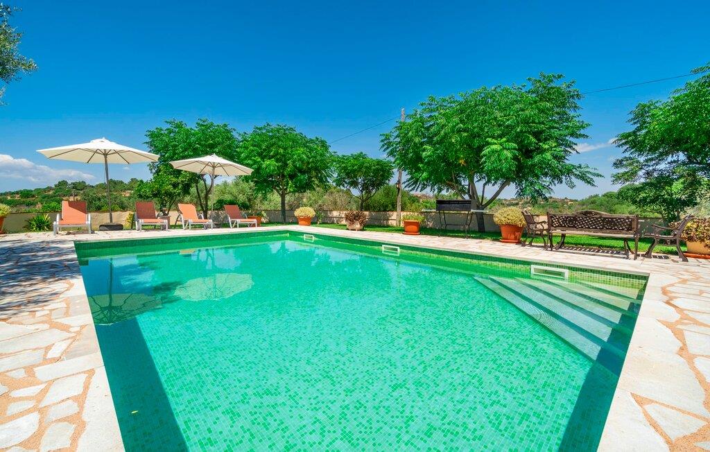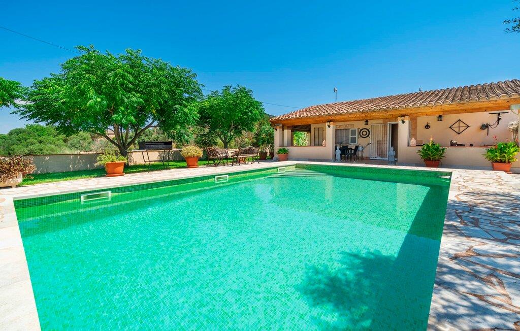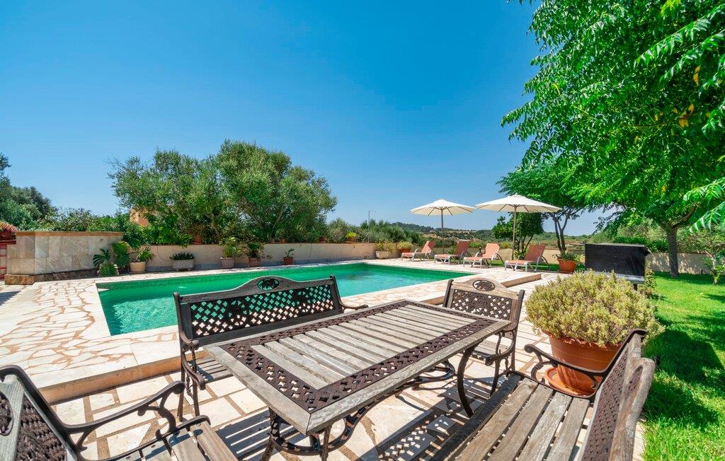 Villaen "Son Cladera Petit" er et ideelt tilflugtssted for feriegæster, der leder efter fred og enkelhed. Beliggende i en diskret mur midt i det maleriske, let bakkede landskab i den østlige del af Mallorca, ligger ejendommen kun 12 km fra havet. Haven har græsplæner og middelhavsplanter. Der er en smukt foret pool omgivet af en smagfuldt brolagt solterrasse med masser af liggestole og moderne rattanmøbler til afslapning. Det overdækkede terrasseområde, indrettet i terracotta og træ, byder på to siddepladser: et lounge-område og et spisebord, begge designet til komfort og nydelse af den betagende udsigt. Indvendigt er bungalowen rummelig og lys og har en hyggelig opholdsstue med tv og åben pejs, en spisestue og et fuldt udstyret køkken. Soveværelserne er funktionelle og velindrettede og har tilstrækkelig opbevaringsplads. Villaen har to badeværelser, det ene med badekar og det andet med rummelig bruseniche. Stuerne er udstyret med aircondition for komfort. Villaen “Son Cladera Petit” har en helt rolig beliggenhed og med en fantastisk udsigt over det bakkede landskab omkring ejendommen. De smukkeste strande på Mallorca – de såkaldte “Calas de Mallorca” – kan nås herfra på kort tid. Byen Son Macia, hvor I kan gøre jeres daglige indkøb eller finde caféer og restauranter, ligger kun omkring 2 km væk. Elektricitet er inkluderet i prisen, hvis den anvendes hensigtsmæssigt. I sjældne tilfælde vil I blive opkrævet gebyret kontant på stedet.