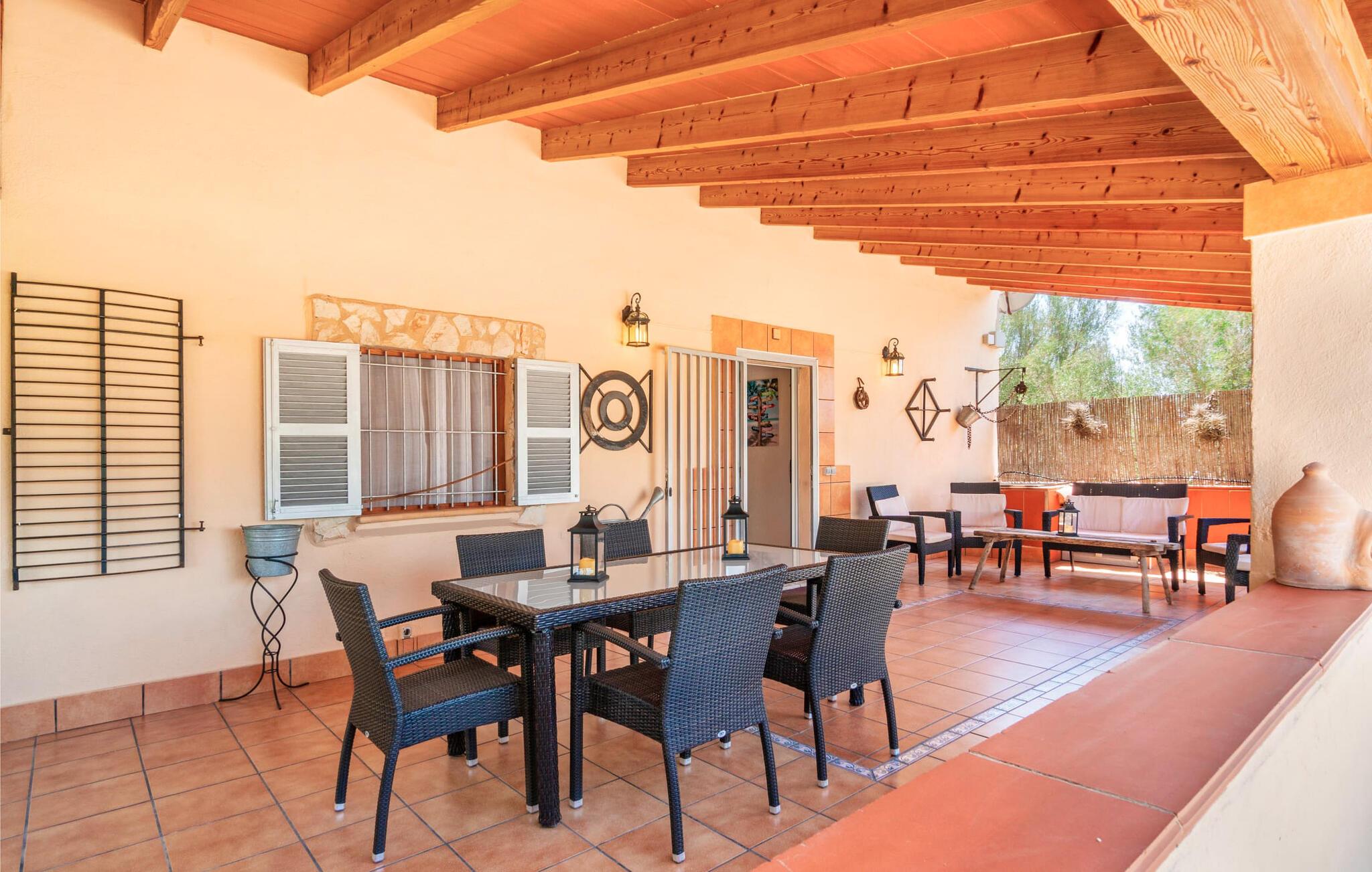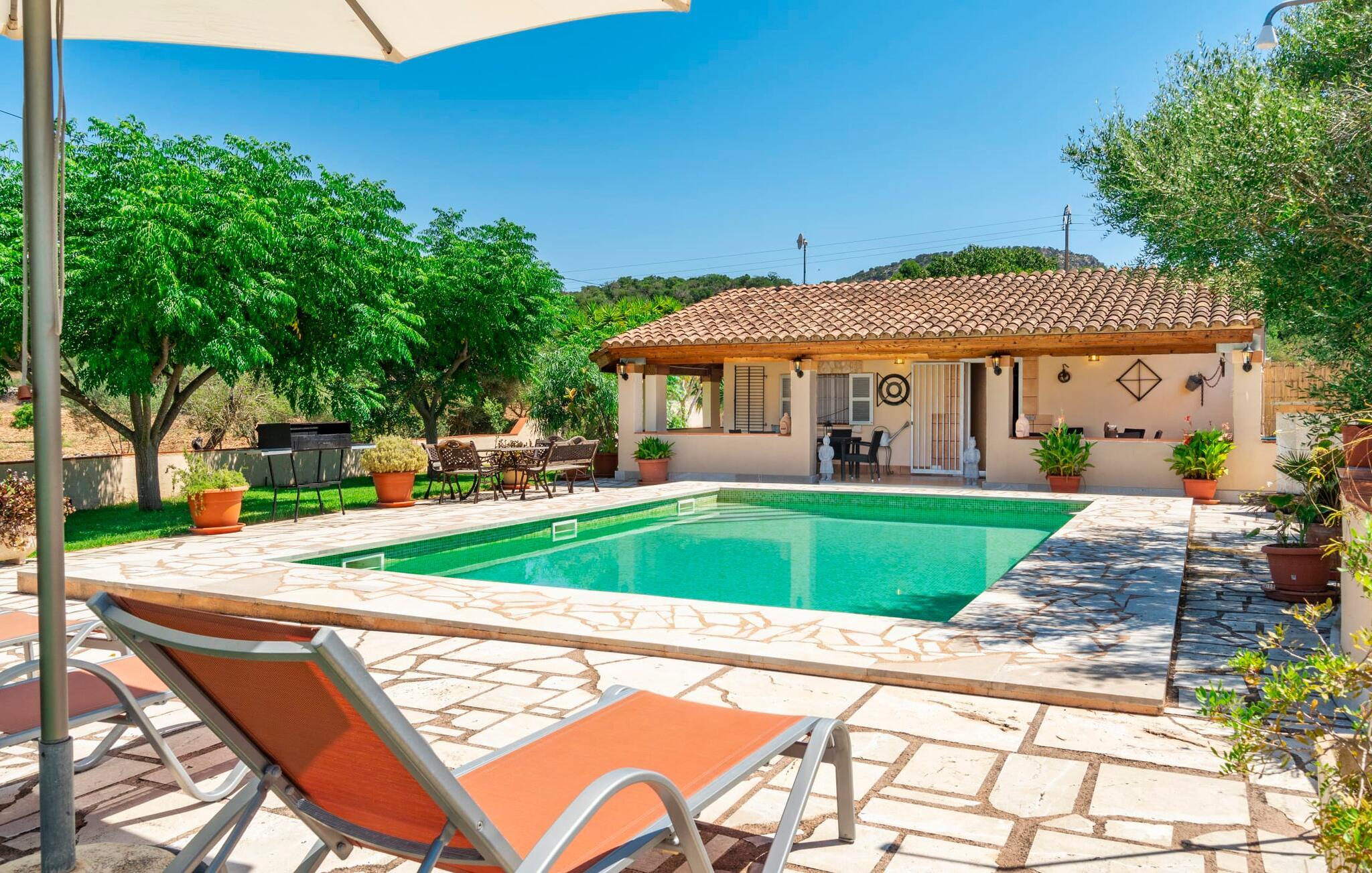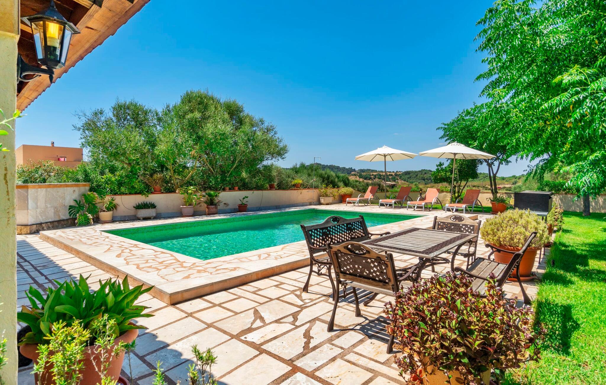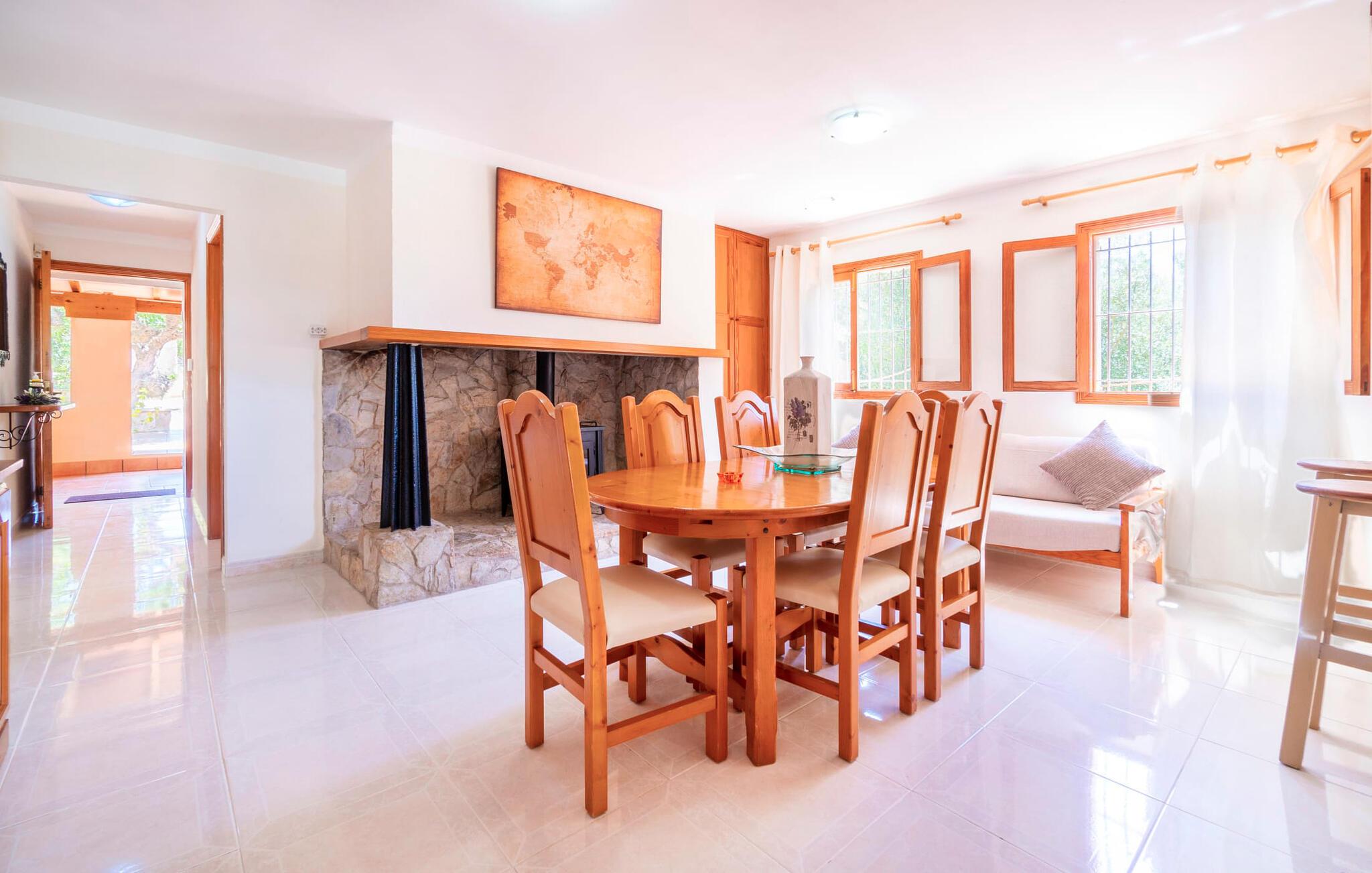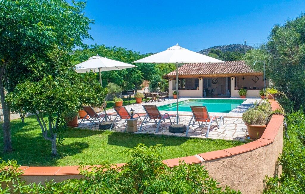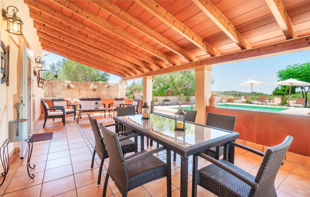 Villaen "Son Cladera Petit" er et ideelt tilflugtssted for feriegæster, der leder efter fred og enkelhed. Beliggende i en diskret mur midt i det maleriske, let bakkede landskab i den østlige del af Mallorca, ligger ejendommen kun 12 km fra havet. Haven har græsplæner og middelhavsplanter. Der er en smukt foret pool omgivet af en smagfuldt brolagt solterrasse med masser af liggestole og moderne rattanmøbler til afslapning. Det overdækkede terrasseområde, indrettet i terracotta og træ, byder på to siddepladser: et lounge-område og et spisebord, begge designet til komfort og nydelse af den betagende udsigt. Indvendigt er bungalowen rummelig og lys og har en hyggelig opholdsstue med tv og åben pejs, en spisestue og et fuldt udstyret køkken. Soveværelserne er funktionelle og velindrettede og har tilstrækkelig opbevaringsplads. Villaen har to badeværelser, det ene med badekar og det andet med rummelig bruseniche. Stuerne er udstyret med aircondition for komfort. Villaen “Son Cladera Petit” har en helt rolig beliggenhed og med en fantastisk udsigt over det bakkede landskab omkring ejendommen. De smukkeste strande på Mallorca – de såkaldte “Calas de Mallorca” – kan nås herfra på kort tid. Byen Son Macia, hvor I kan gøre jeres daglige indkøb eller finde caféer og restauranter, ligger kun omkring 2 km væk. Elektricitet er inkluderet i prisen, hvis den anvendes hensigtsmæssigt. I sjældne tilfælde vil I blive opkrævet gebyret kontant på stedet.