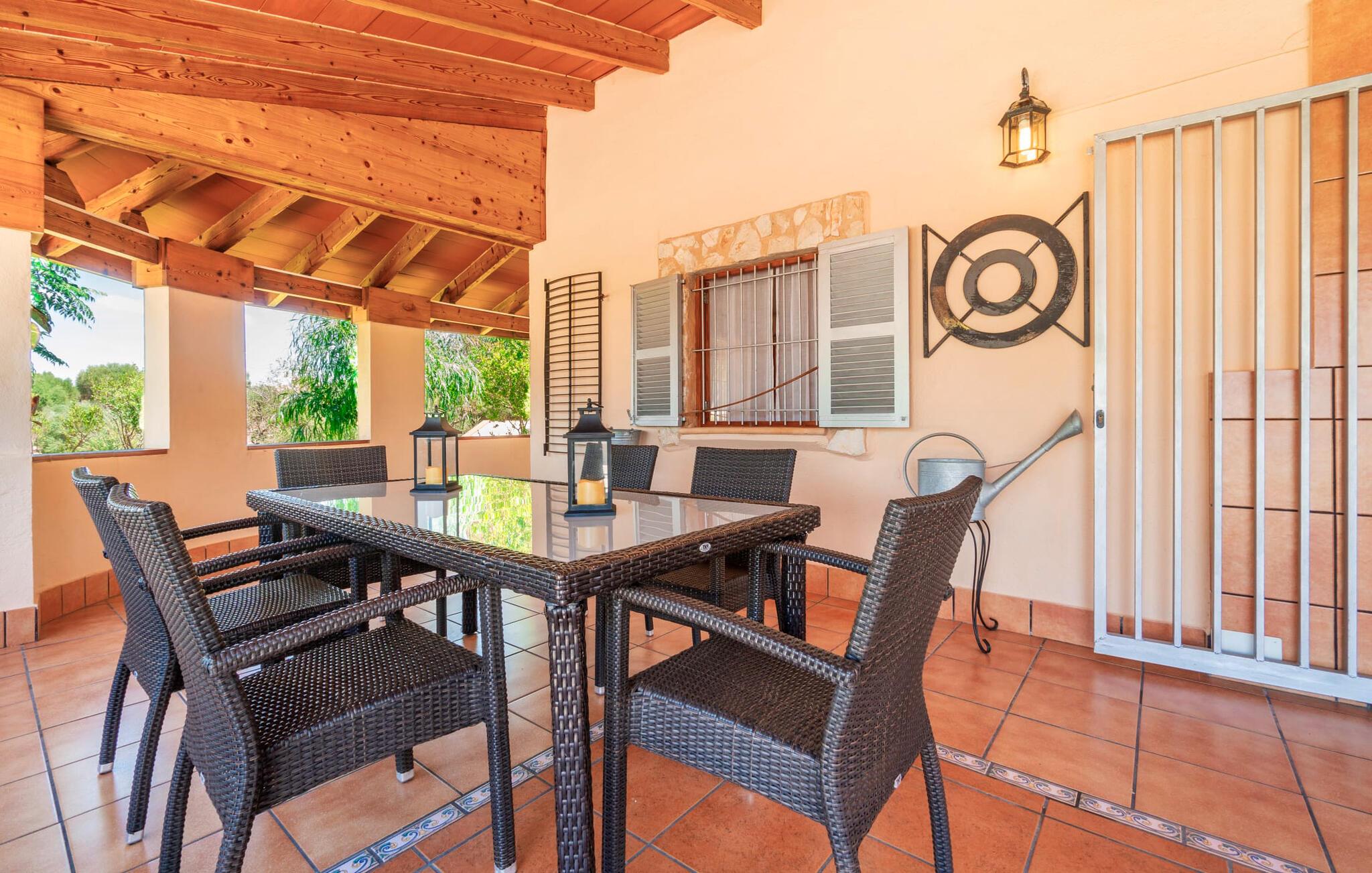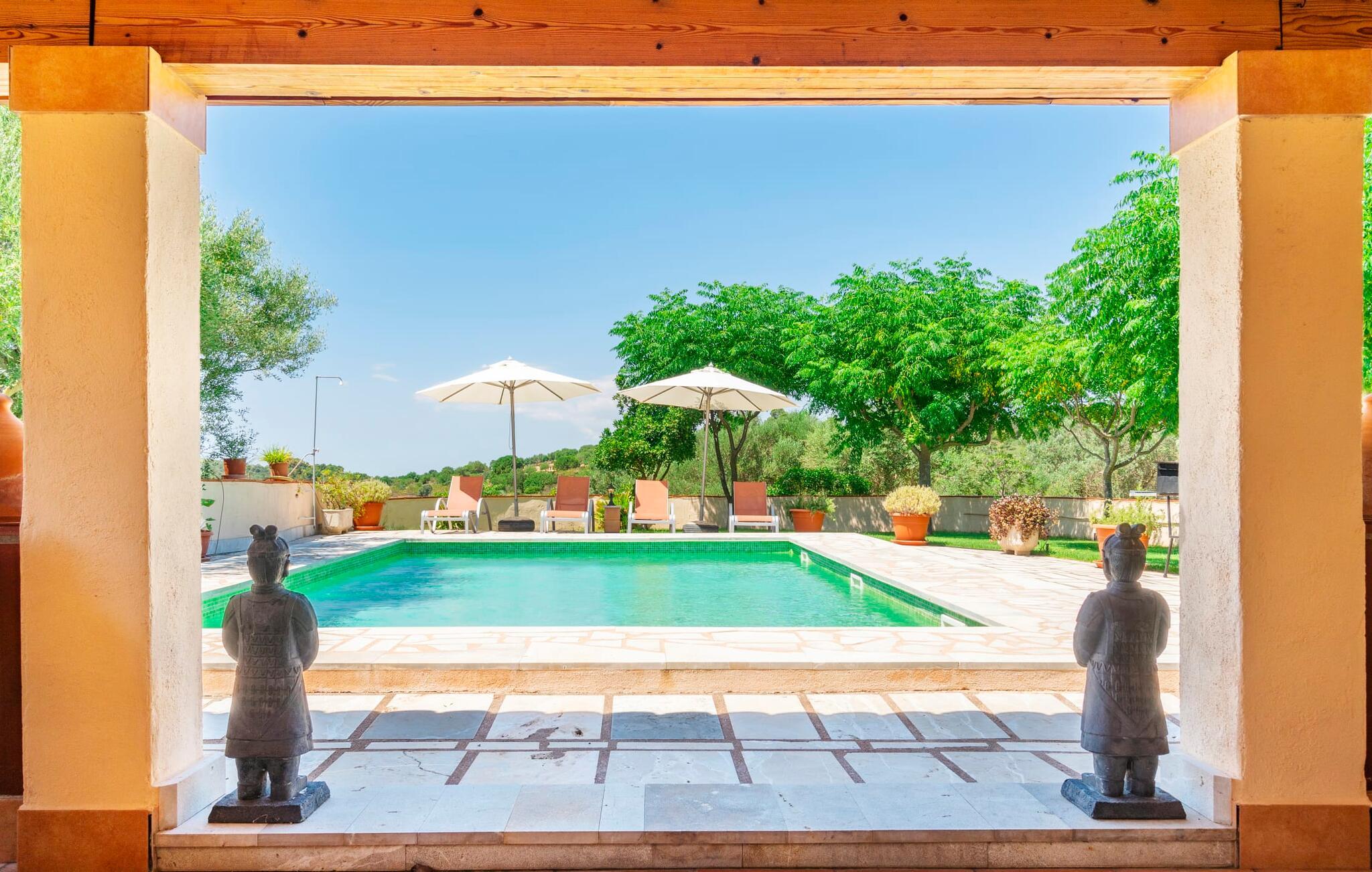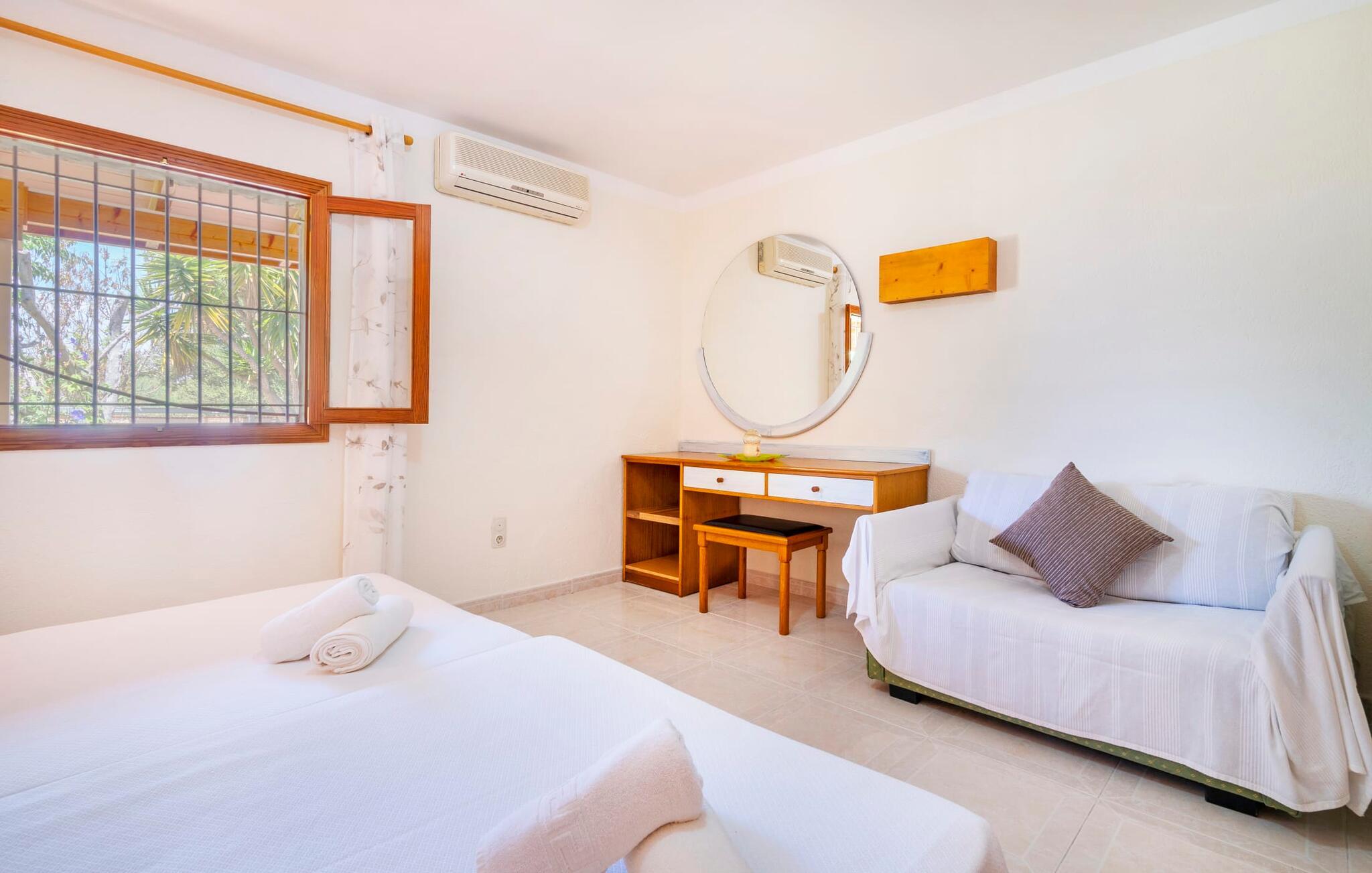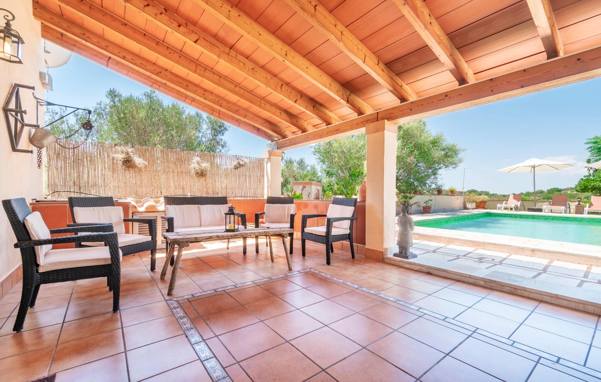 Villaen "Son Cladera Petit" er et ideelt tilflugtssted for feriegæster, der leder efter fred og enkelhed. Beliggende i en diskret mur midt i det maleriske, let bakkede landskab i den østlige del af Mallorca, ligger ejendommen kun 12 km fra havet. Haven har græsplæner og middelhavsplanter. Der er en smukt foret pool omgivet af en smagfuldt brolagt solterrasse med masser af liggestole og moderne rattanmøbler til afslapning. Det overdækkede terrasseområde, indrettet i terracotta og træ, byder på to siddepladser: et lounge-område og et spisebord, begge designet til komfort og nydelse af den betagende udsigt. Indvendigt er bungalowen rummelig og lys og har en hyggelig opholdsstue med tv og åben pejs, en spisestue og et fuldt udstyret køkken. Soveværelserne er funktionelle og velindrettede og har tilstrækkelig opbevaringsplads. Villaen har to badeværelser, det ene med badekar og det andet med rummelig bruseniche. Stuerne er udstyret med aircondition for komfort. Villaen “Son Cladera Petit” har en helt rolig beliggenhed og med en fantastisk udsigt over det bakkede landskab omkring ejendommen. De smukkeste strande på Mallorca – de såkaldte “Calas de Mallorca” – kan nås herfra på kort tid. Byen Son Macia, hvor I kan gøre jeres daglige indkøb eller finde caféer og restauranter, ligger kun omkring 2 km væk. Elektricitet er inkluderet i prisen, hvis den anvendes hensigtsmæssigt. I sjældne tilfælde vil I blive opkrævet gebyret kontant på stedet.