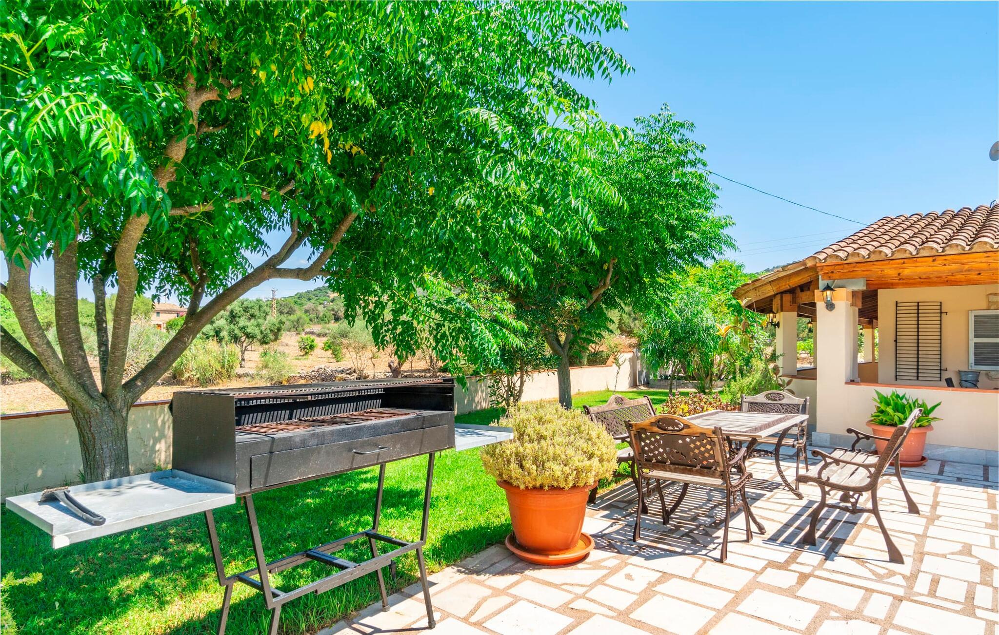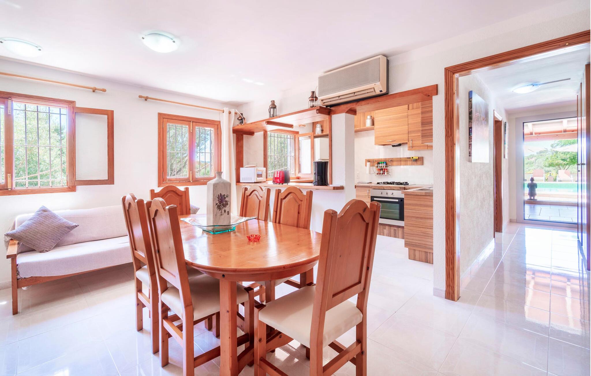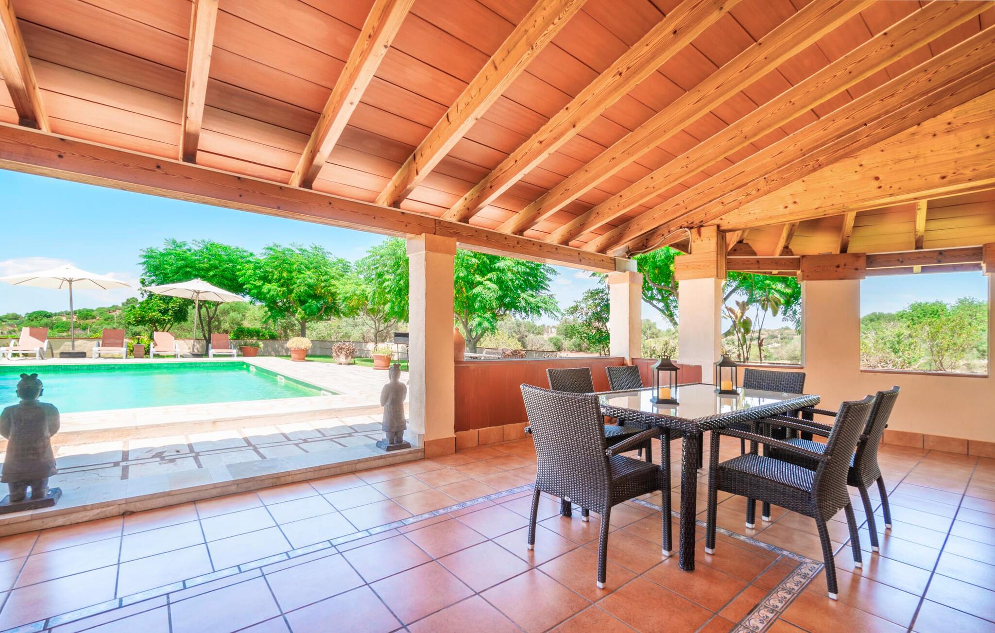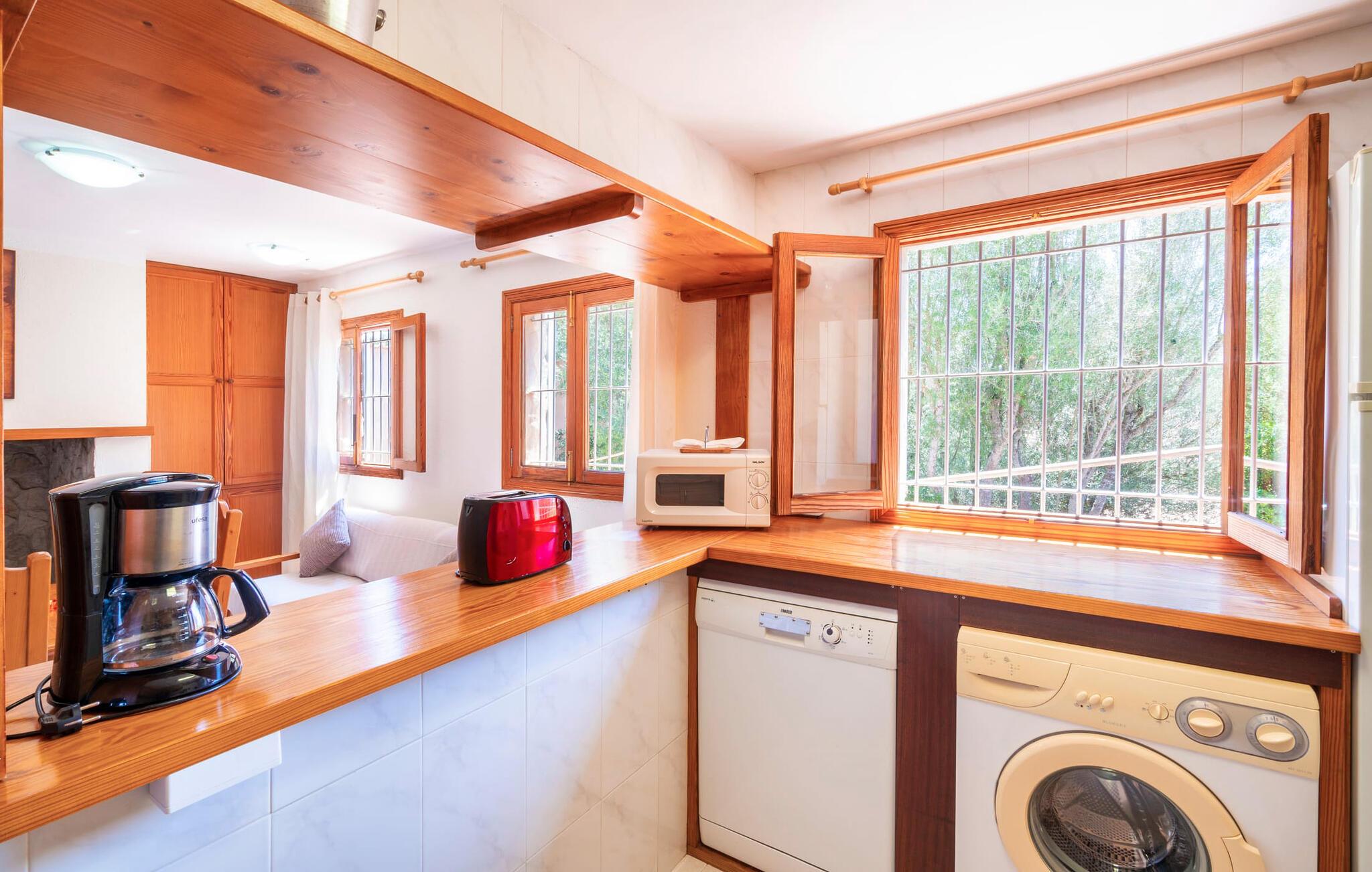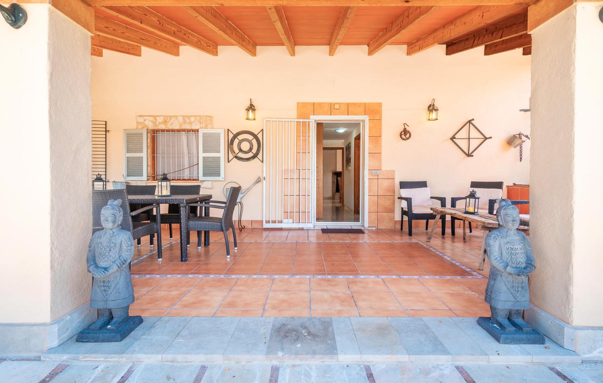 Villaen "Son Cladera Petit" er et ideelt tilflugtssted for feriegæster, der leder efter fred og enkelhed. Beliggende i en diskret mur midt i det maleriske, let bakkede landskab i den østlige del af Mallorca, ligger ejendommen kun 12 km fra havet. Haven har græsplæner og middelhavsplanter. Der er en smukt foret pool omgivet af en smagfuldt brolagt solterrasse med masser af liggestole og moderne rattanmøbler til afslapning. Det overdækkede terrasseområde, indrettet i terracotta og træ, byder på to siddepladser: et lounge-område og et spisebord, begge designet til komfort og nydelse af den betagende udsigt. Indvendigt er bungalowen rummelig og lys og har en hyggelig opholdsstue med tv og åben pejs, en spisestue og et fuldt udstyret køkken. Soveværelserne er funktionelle og velindrettede og har tilstrækkelig opbevaringsplads. Villaen har to badeværelser, det ene med badekar og det andet med rummelig bruseniche. Stuerne er udstyret med aircondition for komfort. Villaen “Son Cladera Petit” har en helt rolig beliggenhed og med en fantastisk udsigt over det bakkede landskab omkring ejendommen. De smukkeste strande på Mallorca – de såkaldte “Calas de Mallorca” – kan nås herfra på kort tid. Byen Son Macia, hvor I kan gøre jeres daglige indkøb eller finde caféer og restauranter, ligger kun omkring 2 km væk. Elektricitet er inkluderet i prisen, hvis den anvendes hensigtsmæssigt. I sjældne tilfælde vil I blive opkrævet gebyret kontant på stedet.