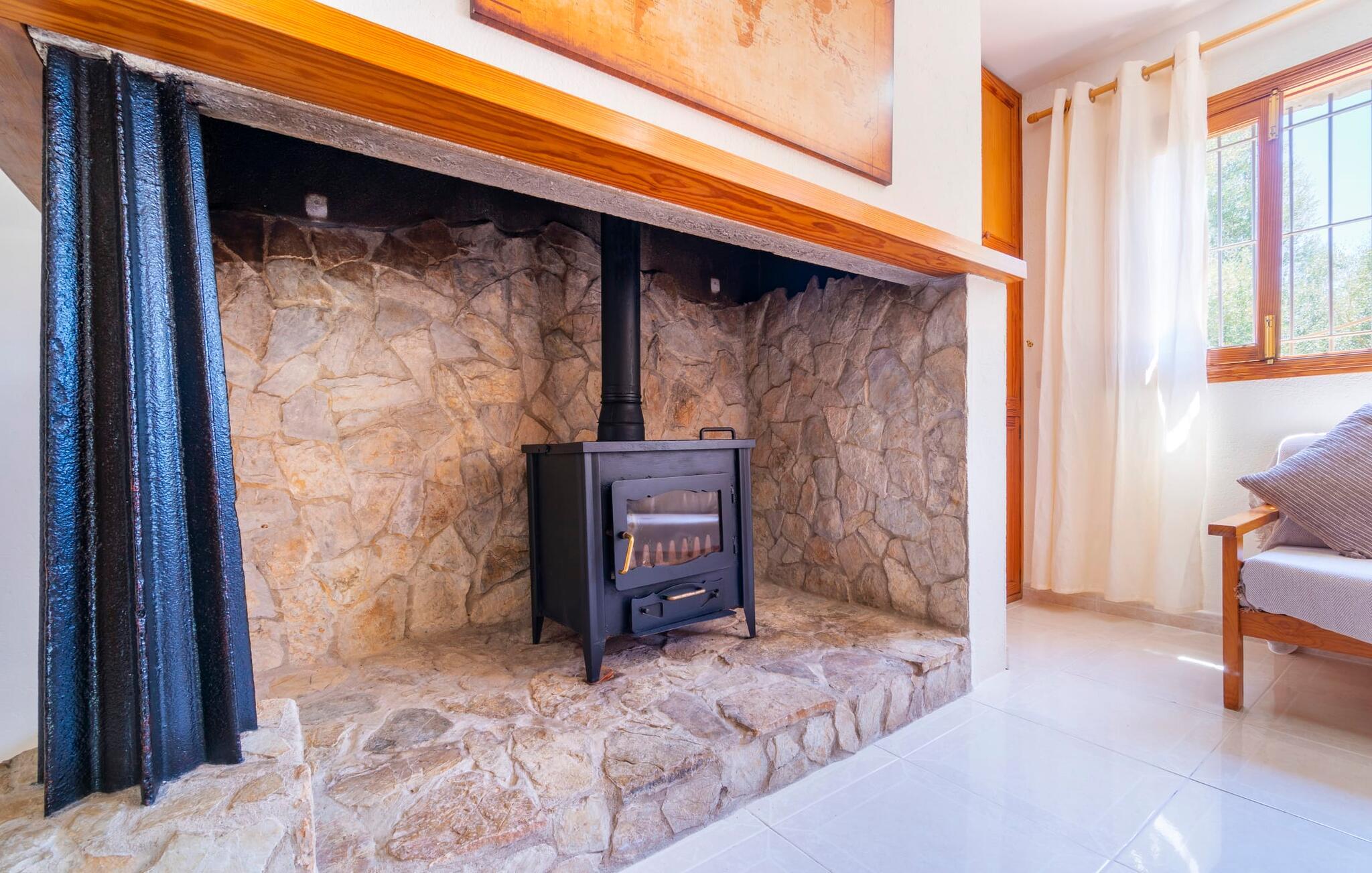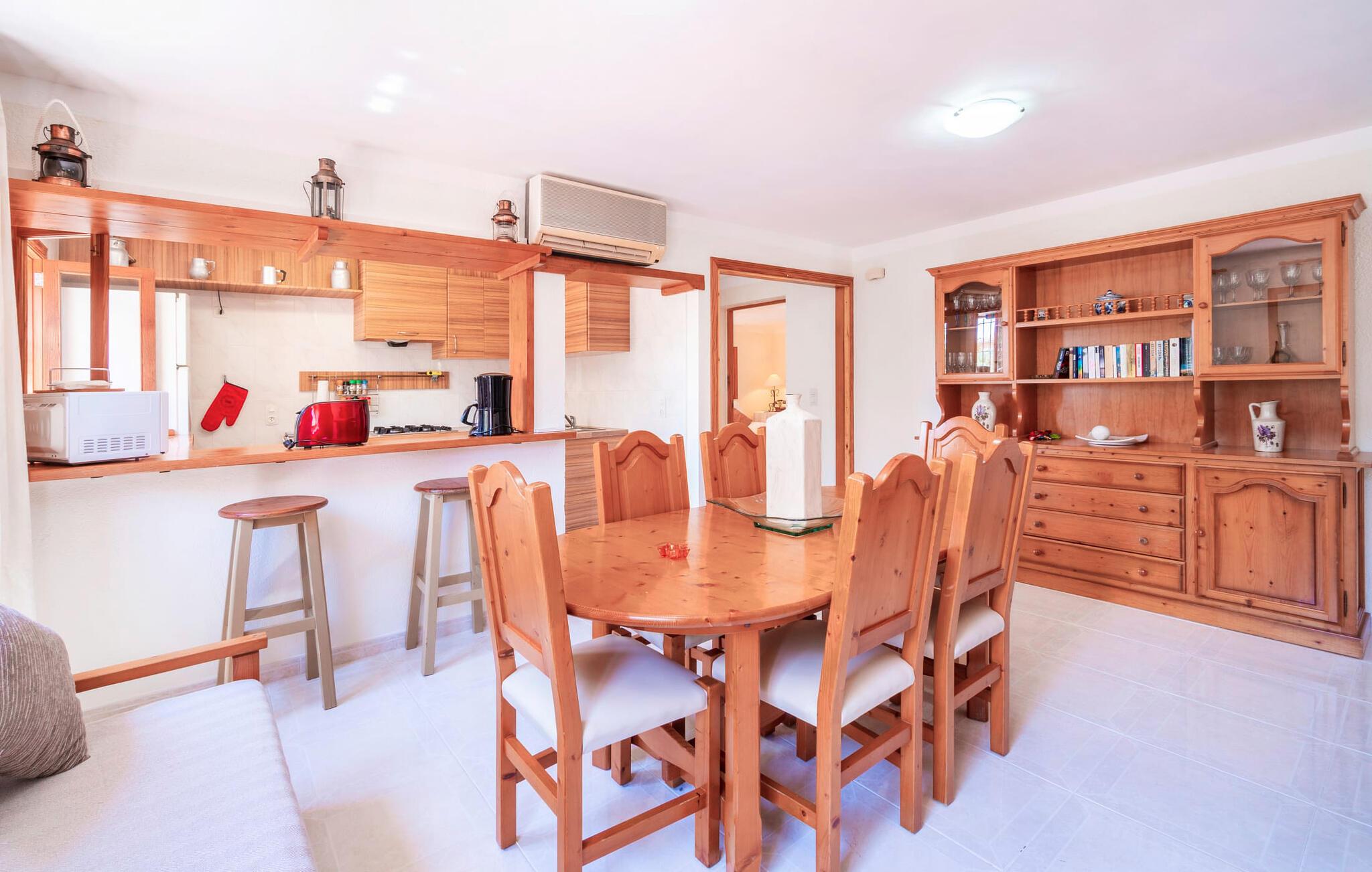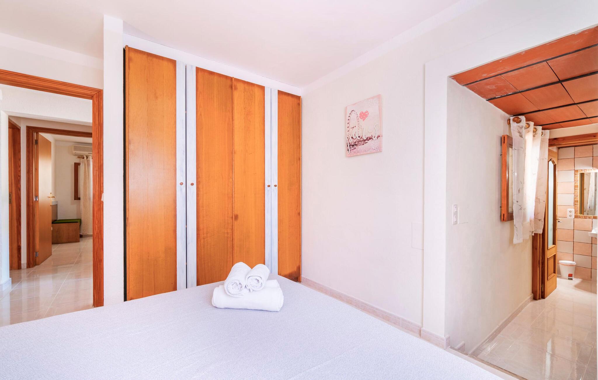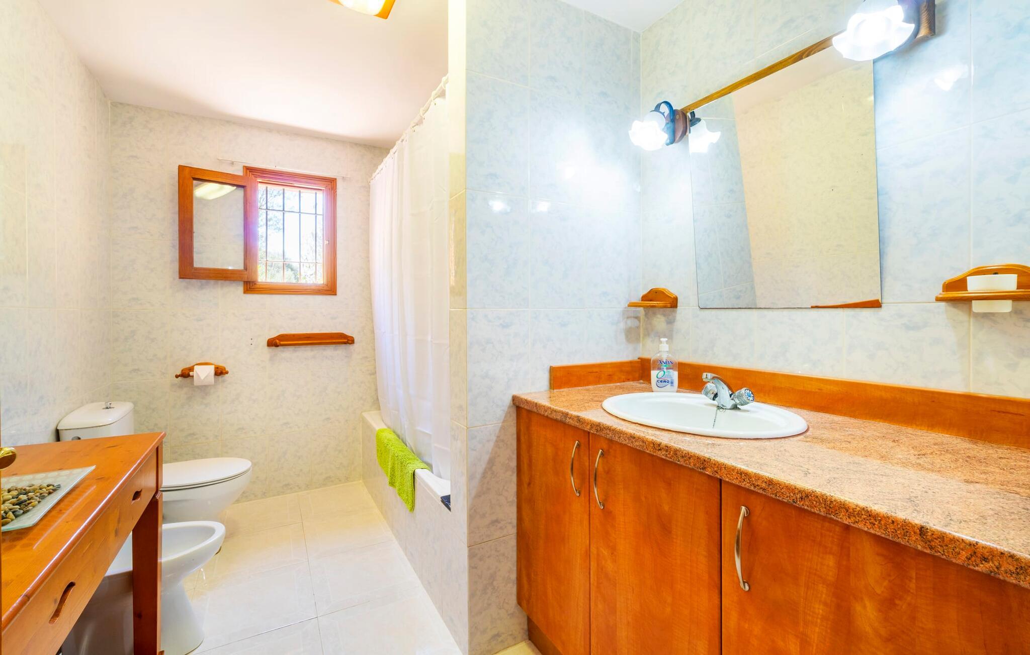 Villaen "Son Cladera Petit" er et ideelt tilflugtssted for feriegæster, der leder efter fred og enkelhed. Beliggende i en diskret mur midt i det maleriske, let bakkede landskab i den østlige del af Mallorca, ligger ejendommen kun 12 km fra havet. Haven har græsplæner og middelhavsplanter. Der er en smukt foret pool omgivet af en smagfuldt brolagt solterrasse med masser af liggestole og moderne rattanmøbler til afslapning. Det overdækkede terrasseområde, indrettet i terracotta og træ, byder på to siddepladser: et lounge-område og et spisebord, begge designet til komfort og nydelse af den betagende udsigt. Indvendigt er bungalowen rummelig og lys og har en hyggelig opholdsstue med tv og åben pejs, en spisestue og et fuldt udstyret køkken. Soveværelserne er funktionelle og velindrettede og har tilstrækkelig opbevaringsplads. Villaen har to badeværelser, det ene med badekar og det andet med rummelig bruseniche. Stuerne er udstyret med aircondition for komfort. Villaen “Son Cladera Petit” har en helt rolig beliggenhed og med en fantastisk udsigt over det bakkede landskab omkring ejendommen. De smukkeste strande på Mallorca – de såkaldte “Calas de Mallorca” – kan nås herfra på kort tid. Byen Son Macia, hvor I kan gøre jeres daglige indkøb eller finde caféer og restauranter, ligger kun omkring 2 km væk. Elektricitet er inkluderet i prisen, hvis den anvendes hensigtsmæssigt. I sjældne tilfælde vil I blive opkrævet gebyret kontant på stedet.