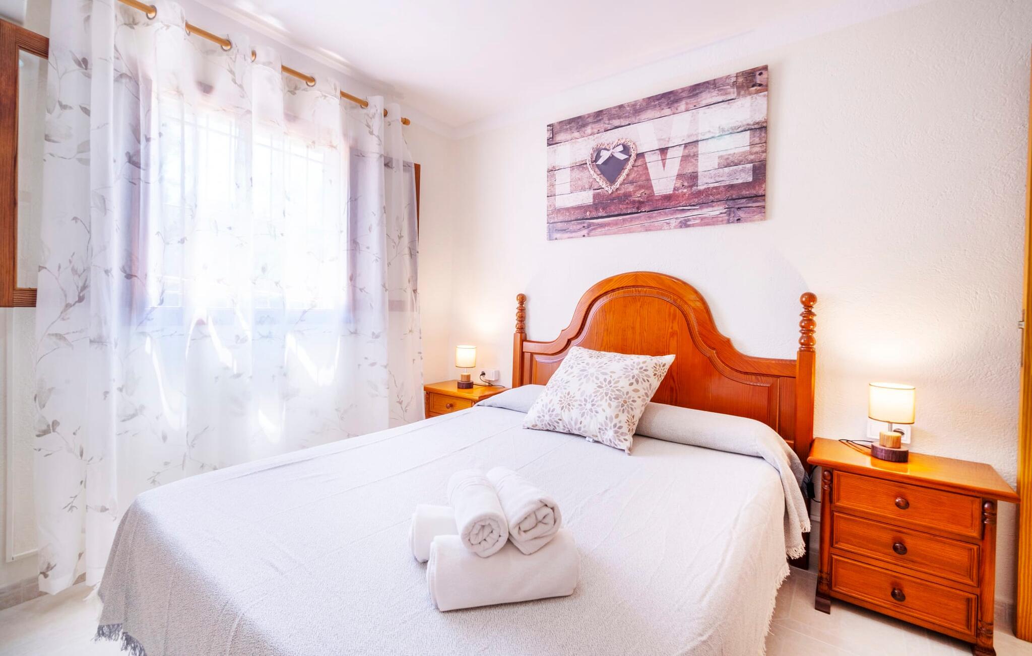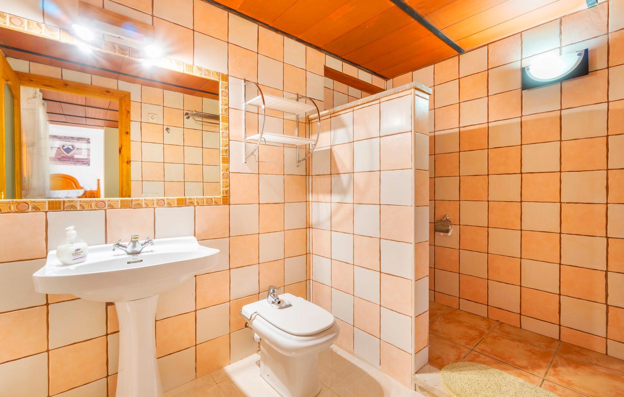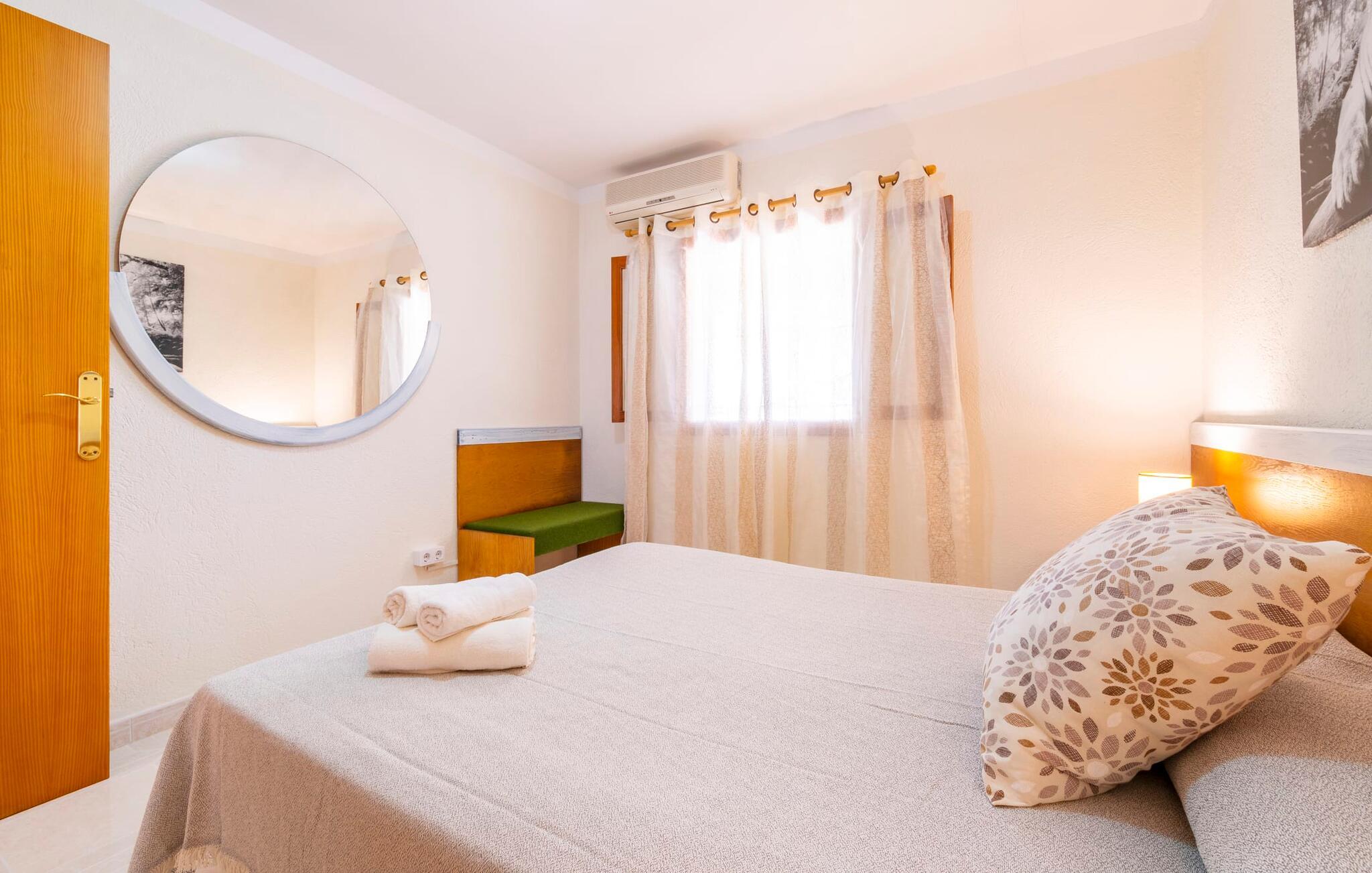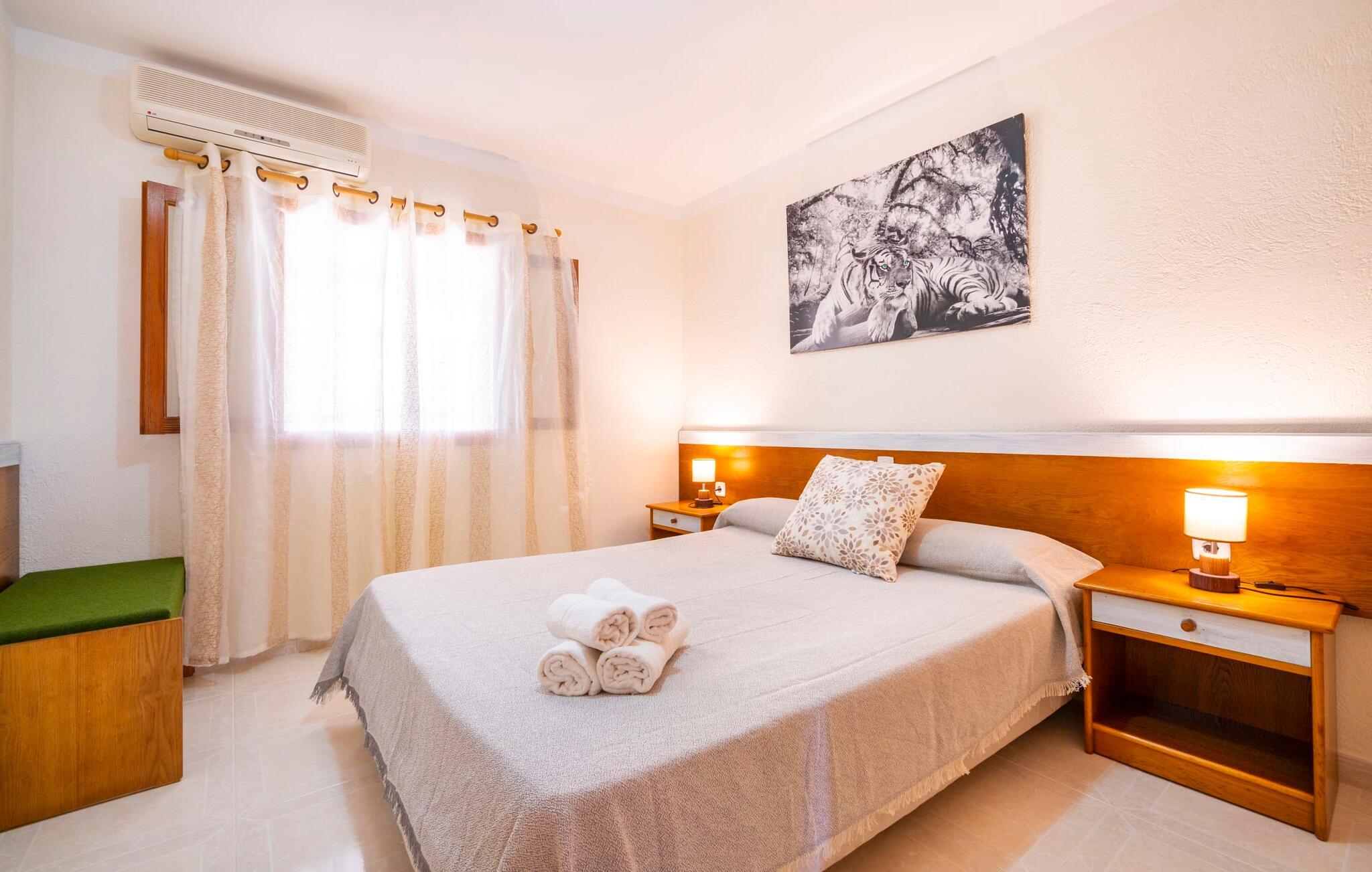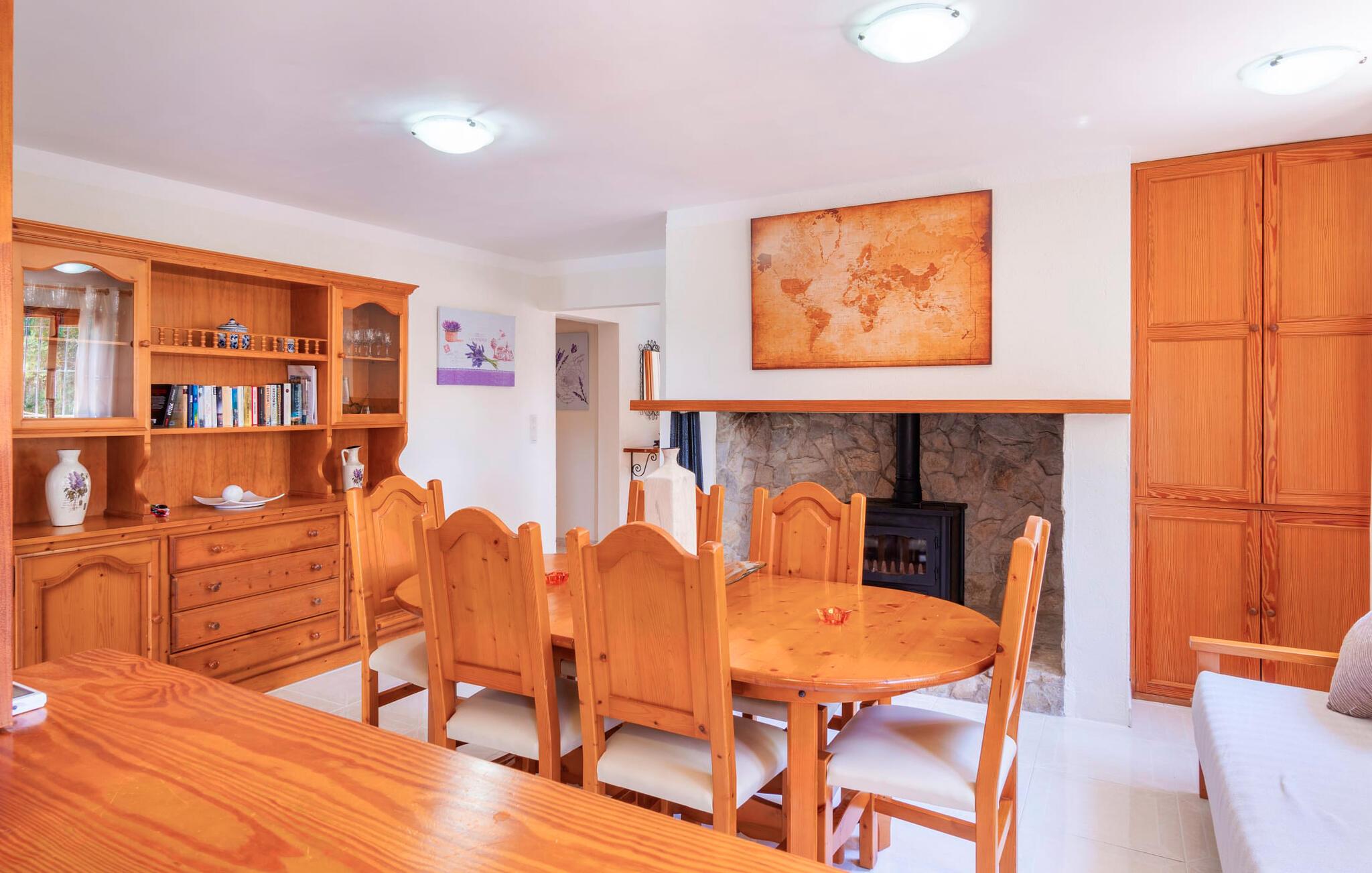 Villaen "Son Cladera Petit" er et ideelt tilflugtssted for feriegæster, der leder efter fred og enkelhed. Beliggende i en diskret mur midt i det maleriske, let bakkede landskab i den østlige del af Mallorca, ligger ejendommen kun 12 km fra havet. Haven har græsplæner og middelhavsplanter. Der er en smukt foret pool omgivet af en smagfuldt brolagt solterrasse med masser af liggestole og moderne rattanmøbler til afslapning. Det overdækkede terrasseområde, indrettet i terracotta og træ, byder på to siddepladser: et lounge-område og et spisebord, begge designet til komfort og nydelse af den betagende udsigt. Indvendigt er bungalowen rummelig og lys og har en hyggelig opholdsstue med tv og åben pejs, en spisestue og et fuldt udstyret køkken. Soveværelserne er funktionelle og velindrettede og har tilstrækkelig opbevaringsplads. Villaen har to badeværelser, det ene med badekar og det andet med rummelig bruseniche. Stuerne er udstyret med aircondition for komfort. Villaen “Son Cladera Petit” har en helt rolig beliggenhed og med en fantastisk udsigt over det bakkede landskab omkring ejendommen. De smukkeste strande på Mallorca – de såkaldte “Calas de Mallorca” – kan nås herfra på kort tid. Byen Son Macia, hvor I kan gøre jeres daglige indkøb eller finde caféer og restauranter, ligger kun omkring 2 km væk. Elektricitet er inkluderet i prisen, hvis den anvendes hensigtsmæssigt. I sjældne tilfælde vil I blive opkrævet gebyret kontant på stedet.