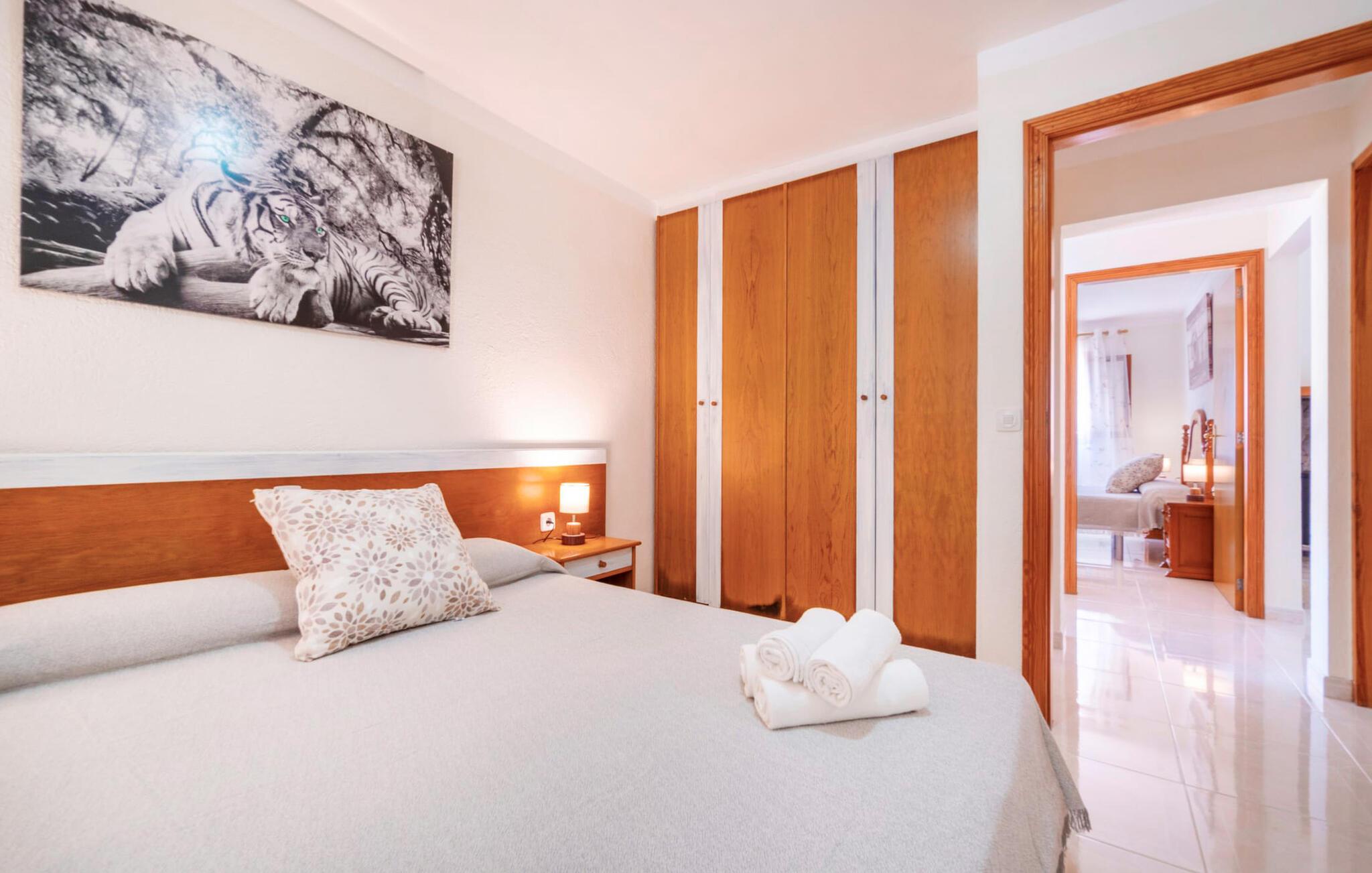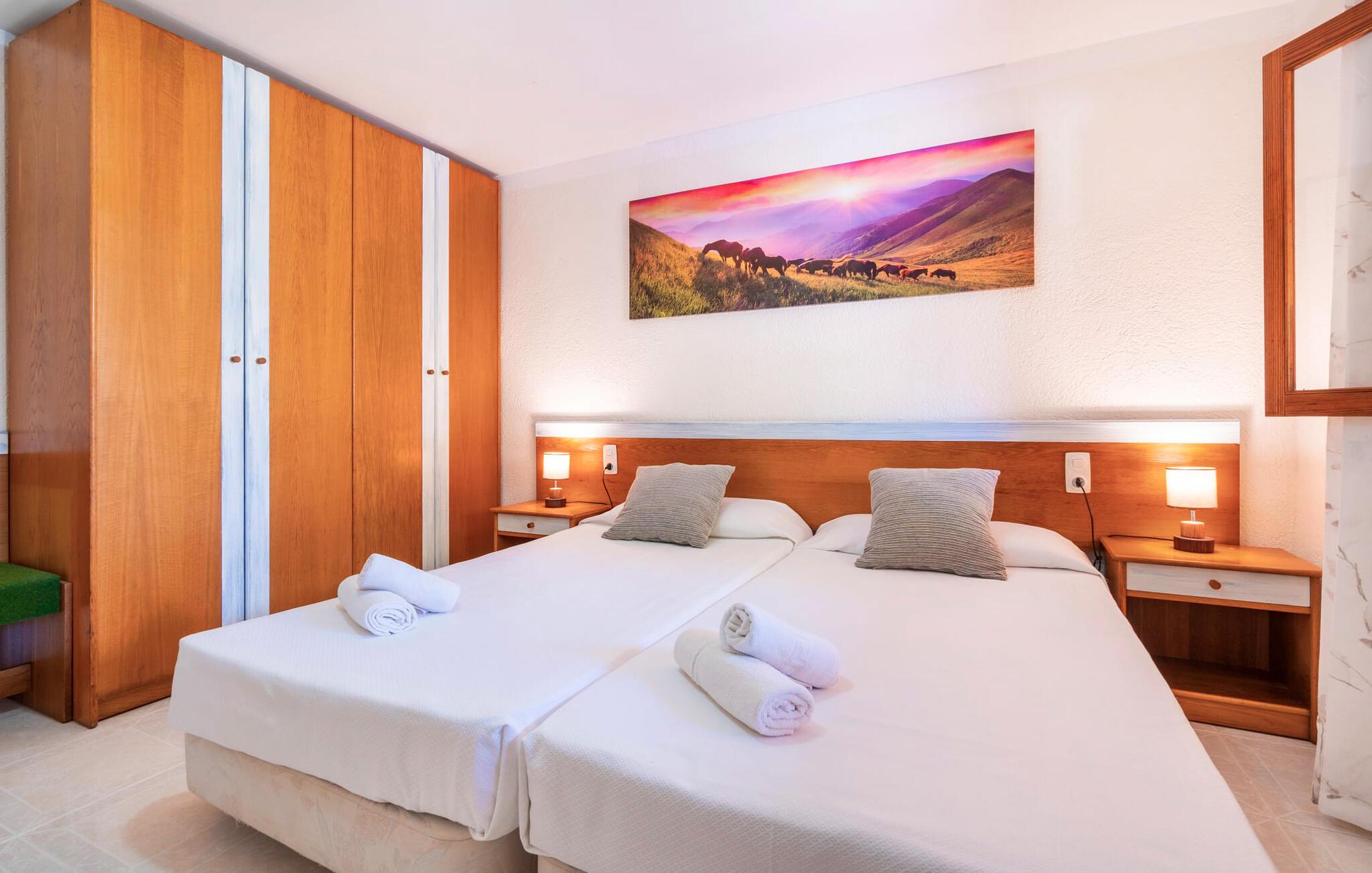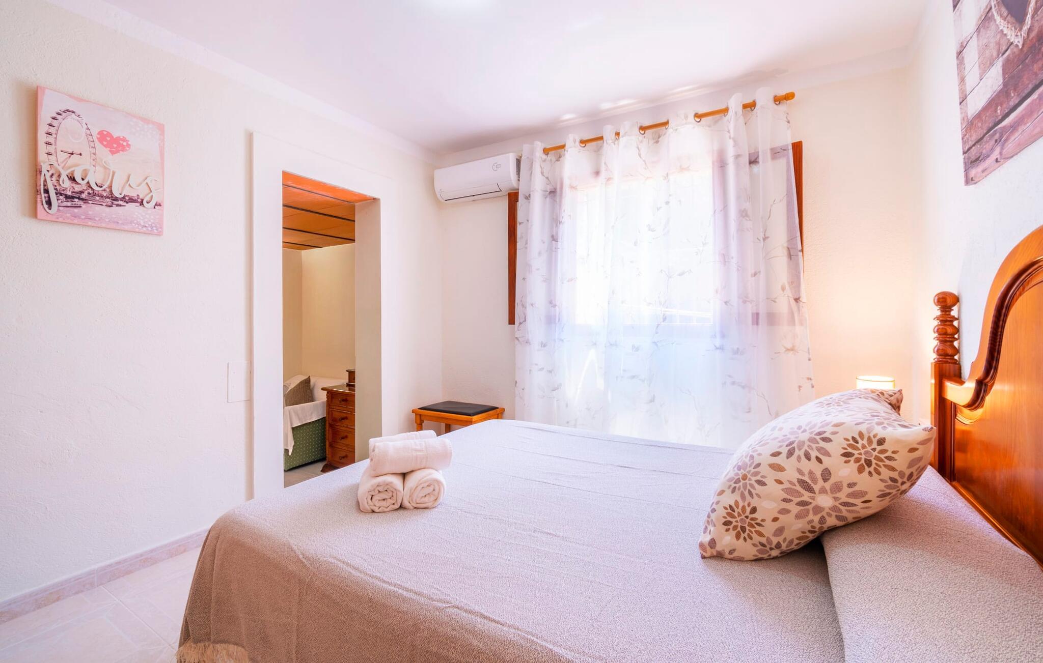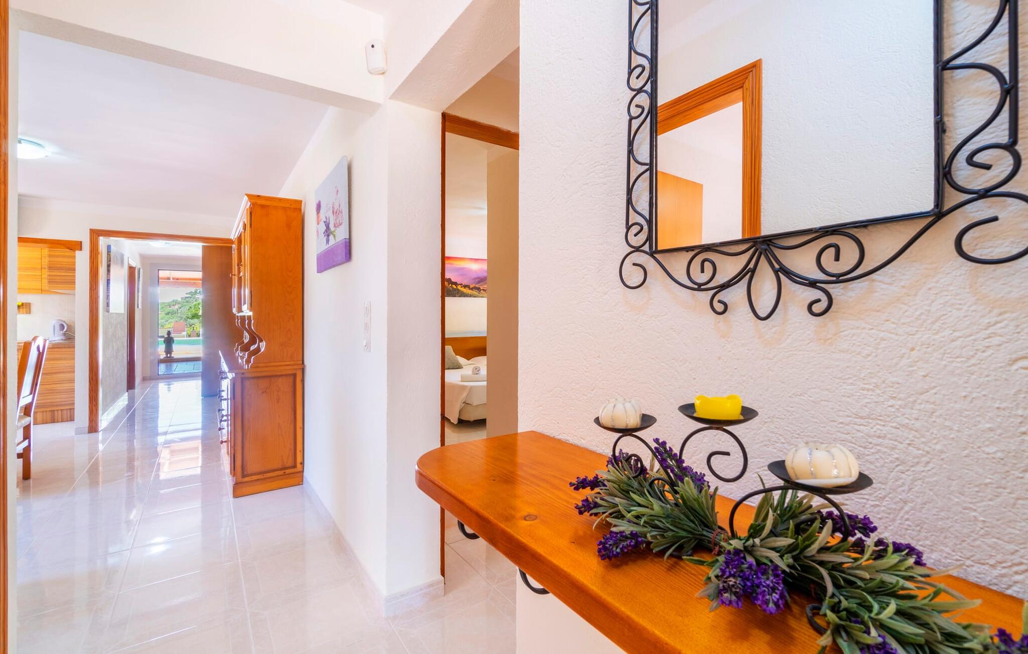 Villaen "Son Cladera Petit" er et ideelt tilflugtssted for feriegæster, der leder efter fred og enkelhed. Beliggende i en diskret mur midt i det maleriske, let bakkede landskab i den østlige del af Mallorca, ligger ejendommen kun 12 km fra havet. Haven har græsplæner og middelhavsplanter. Der er en smukt foret pool omgivet af en smagfuldt brolagt solterrasse med masser af liggestole og moderne rattanmøbler til afslapning. Det overdækkede terrasseområde, indrettet i terracotta og træ, byder på to siddepladser: et lounge-område og et spisebord, begge designet til komfort og nydelse af den betagende udsigt. Indvendigt er bungalowen rummelig og lys og har en hyggelig opholdsstue med tv og åben pejs, en spisestue og et fuldt udstyret køkken. Soveværelserne er funktionelle og velindrettede og har tilstrækkelig opbevaringsplads. Villaen har to badeværelser, det ene med badekar og det andet med rummelig bruseniche. Stuerne er udstyret med aircondition for komfort. Villaen “Son Cladera Petit” har en helt rolig beliggenhed og med en fantastisk udsigt over det bakkede landskab omkring ejendommen. De smukkeste strande på Mallorca – de såkaldte “Calas de Mallorca” – kan nås herfra på kort tid. Byen Son Macia, hvor I kan gøre jeres daglige indkøb eller finde caféer og restauranter, ligger kun omkring 2 km væk. Elektricitet er inkluderet i prisen, hvis den anvendes hensigtsmæssigt. I sjældne tilfælde vil I blive opkrævet gebyret kontant på stedet.