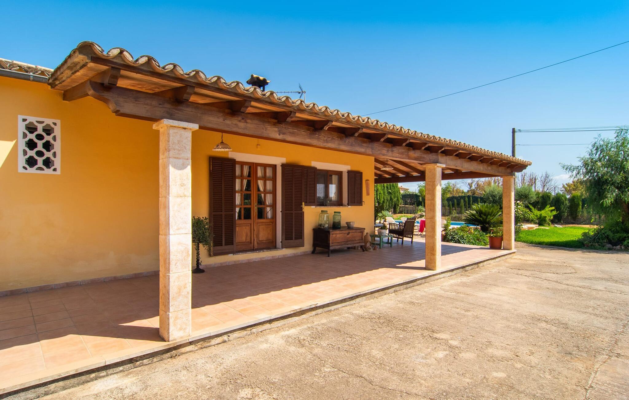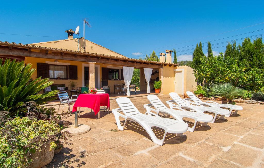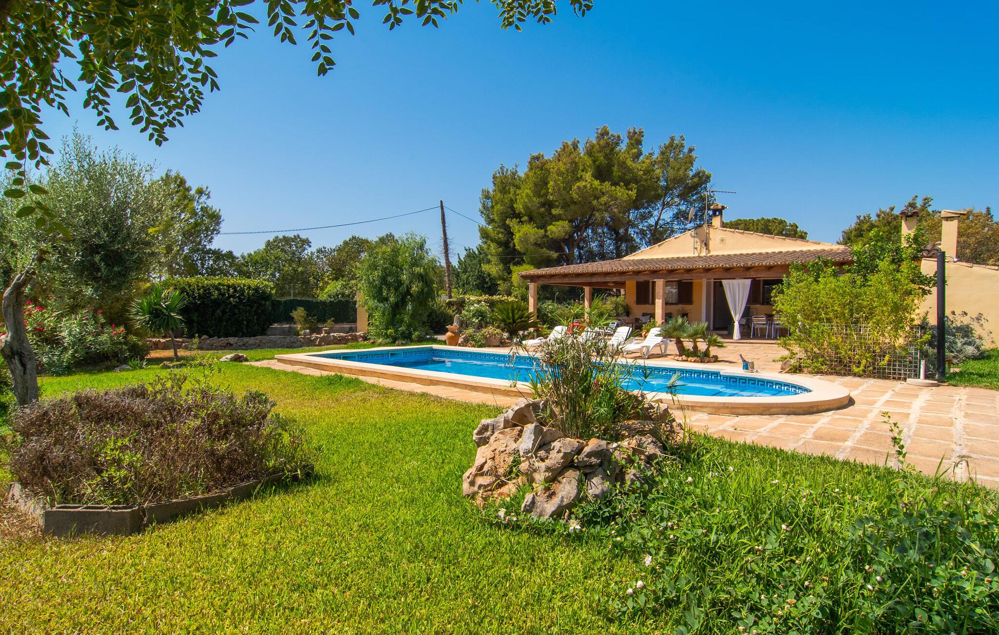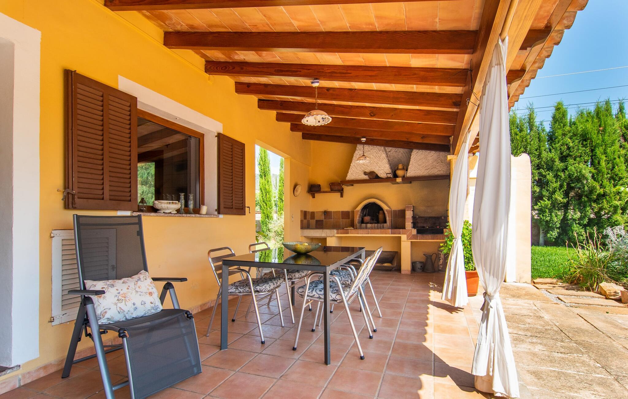 Nyd en sporty ferie i det klassiske bondehus "Son Coll" i hjertet af Mallorca, beliggende mellem Tramuntana-bjergene og Palma. Dette hyggelige feriehus er perfekt til vandreture, cykling og afslapning ved poolen, som har et smukt mosaikdesign og er omgivet af terrasser og græsplæner. Der er komfortable liggestole og skyggefulde områder at slappe af i, mens børn kan lege på græsplænen eller svømme i poolen. Udendørsområdet er designet til nydelse og har en udendørs bruser, flere terrasser med siddepladser til afslapning og et overdækket udendørs køkken med kulgrill og pizzaovn. Haven, omkranset af en grøn hæk, sikrer privatlivets fred og er samtidig bekvemt placeret i gåafstand til restauranter og caféer. Indenfor giver det fuldt udstyrede spisekøkken mulighed for familiemåltider, suppleret med en hyggelig tv-stue med pejs. Det lyst indrettede feriehus har værelser med varme og aircondition. Tilbyder overnatning for op til fem gæster i tre velindrettede soveværelser, med masser af opbevaringsplads til jeres ejendele og to badeværelser med badekar eller bruser. Oplev en varieret ferie med en central beliggenhed med historiske byer, kulturelle seværdigheder og de betagende Tramuntana-bjerge i nærheden. Vi ser frem til jeres besøg! Feriehuset "Son Coll" ligger i gåafstand fra landsbyen Lloseta i hjertet af Mallorca. Det er 30 minutters kørsel til den lange, familievenlige strand Playa de Muro. Toglinjen, der kører langs ejendommen, forbinder jer til øens hovedstad Palma på 40 minutter og til Incas centrum på 16 minutter.