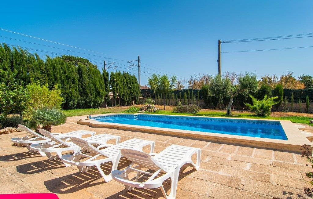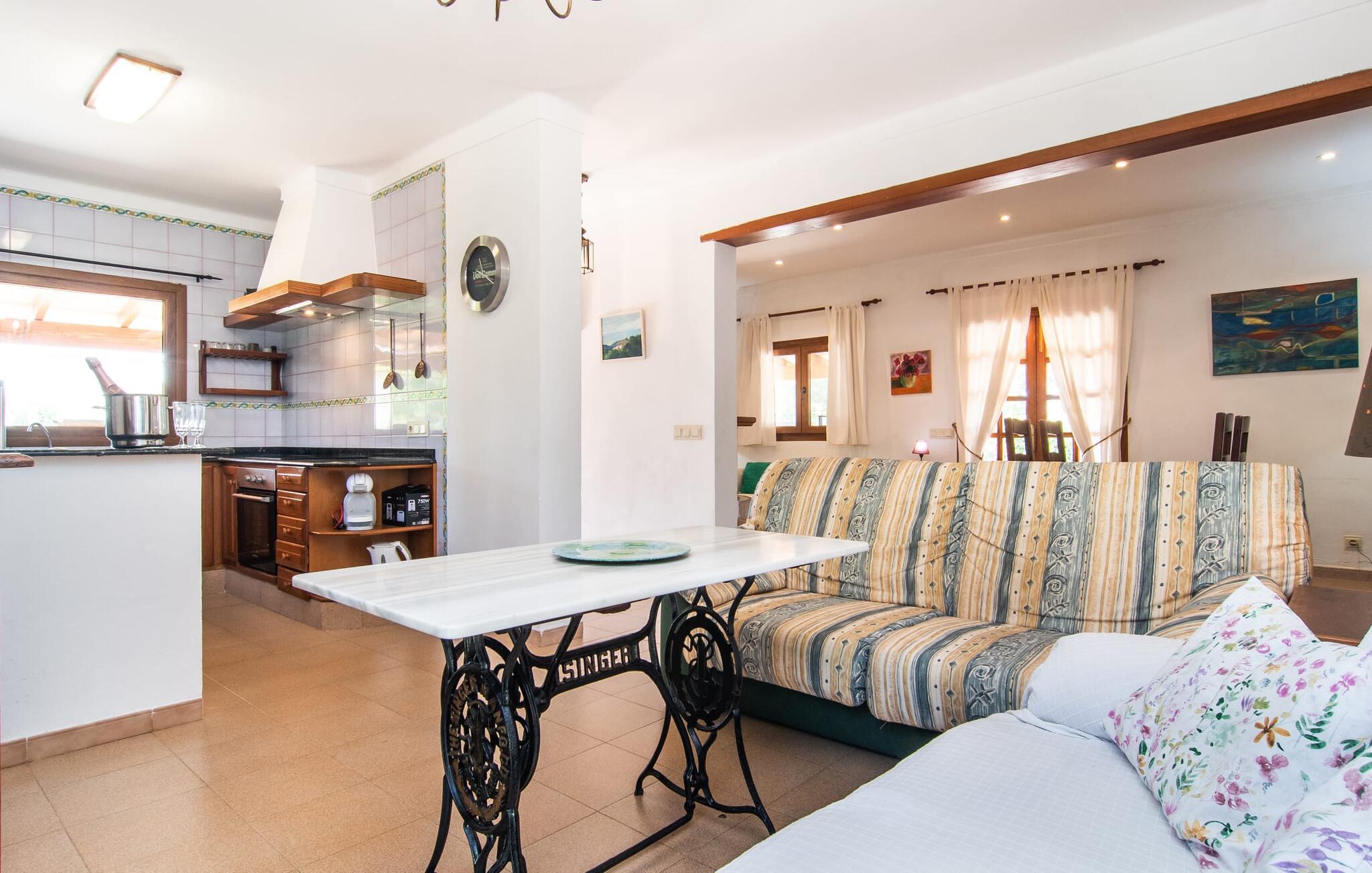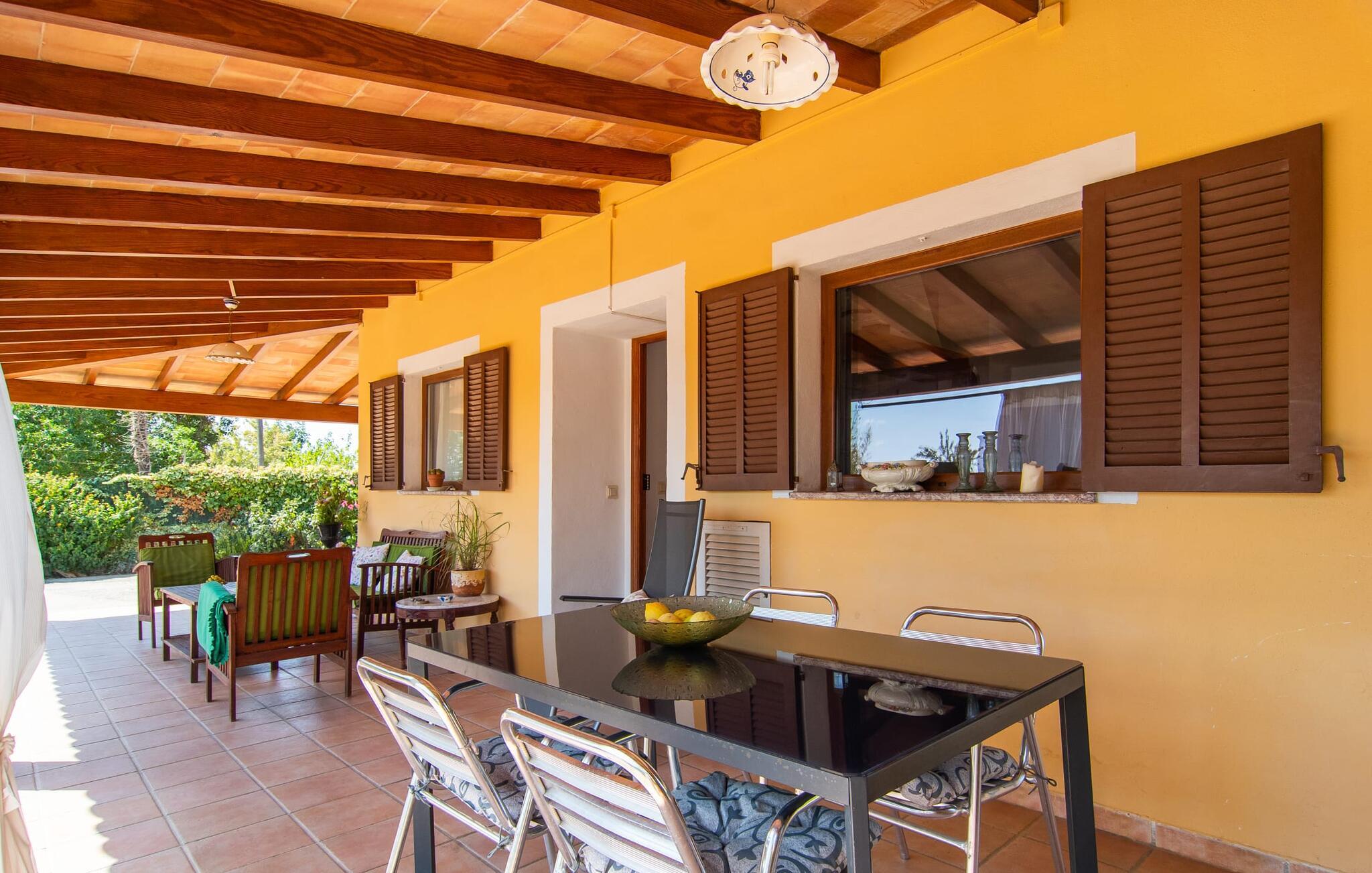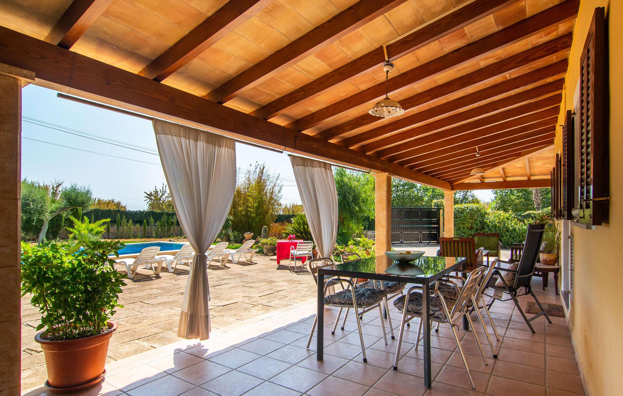 Nyd en sporty ferie i det klassiske bondehus "Son Coll" i hjertet af Mallorca, beliggende mellem Tramuntana-bjergene og Palma. Dette hyggelige feriehus er perfekt til vandreture, cykling og afslapning ved poolen, som har et smukt mosaikdesign og er omgivet af terrasser og græsplæner. Der er komfortable liggestole og skyggefulde områder at slappe af i, mens børn kan lege på græsplænen eller svømme i poolen. Udendørsområdet er designet til nydelse og har en udendørs bruser, flere terrasser med siddepladser til afslapning og et overdækket udendørs køkken med kulgrill og pizzaovn. Haven, omkranset af en grøn hæk, sikrer privatlivets fred og er samtidig bekvemt placeret i gåafstand til restauranter og caféer. Indenfor giver det fuldt udstyrede spisekøkken mulighed for familiemåltider, suppleret med en hyggelig tv-stue med pejs. Det lyst indrettede feriehus har værelser med varme og aircondition. Tilbyder overnatning for op til fem gæster i tre velindrettede soveværelser, med masser af opbevaringsplads til jeres ejendele og to badeværelser med badekar eller bruser. Oplev en varieret ferie med en central beliggenhed med historiske byer, kulturelle seværdigheder og de betagende Tramuntana-bjerge i nærheden. Vi ser frem til jeres besøg! Feriehuset "Son Coll" ligger i gåafstand fra landsbyen Lloseta i hjertet af Mallorca. Det er 30 minutters kørsel til den lange, familievenlige strand Playa de Muro. Toglinjen, der kører langs ejendommen, forbinder jer til øens hovedstad Palma på 40 minutter og til Incas centrum på 16 minutter.