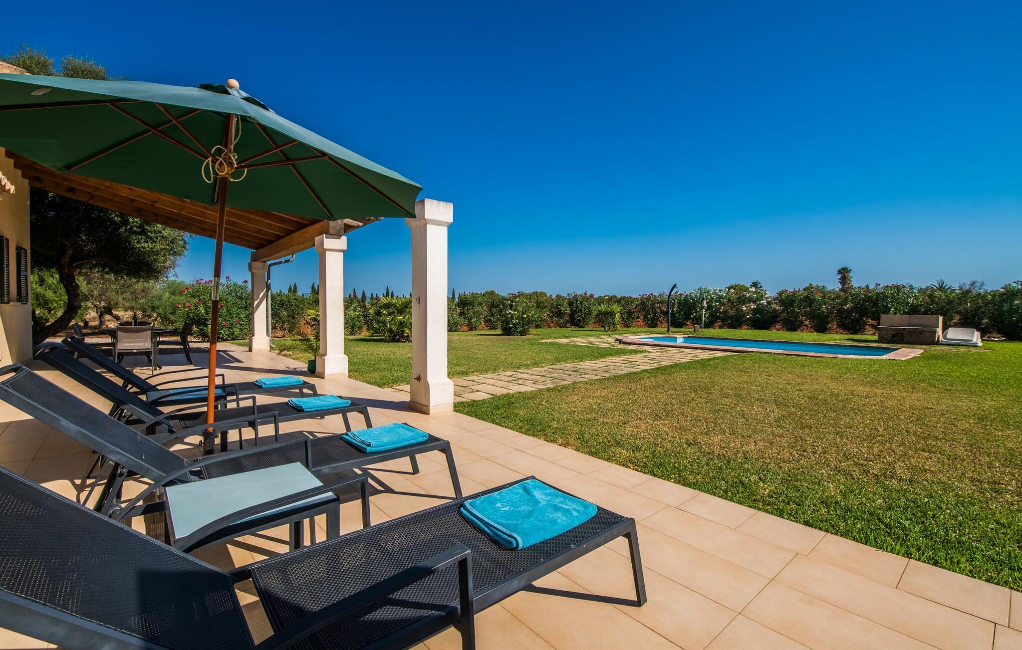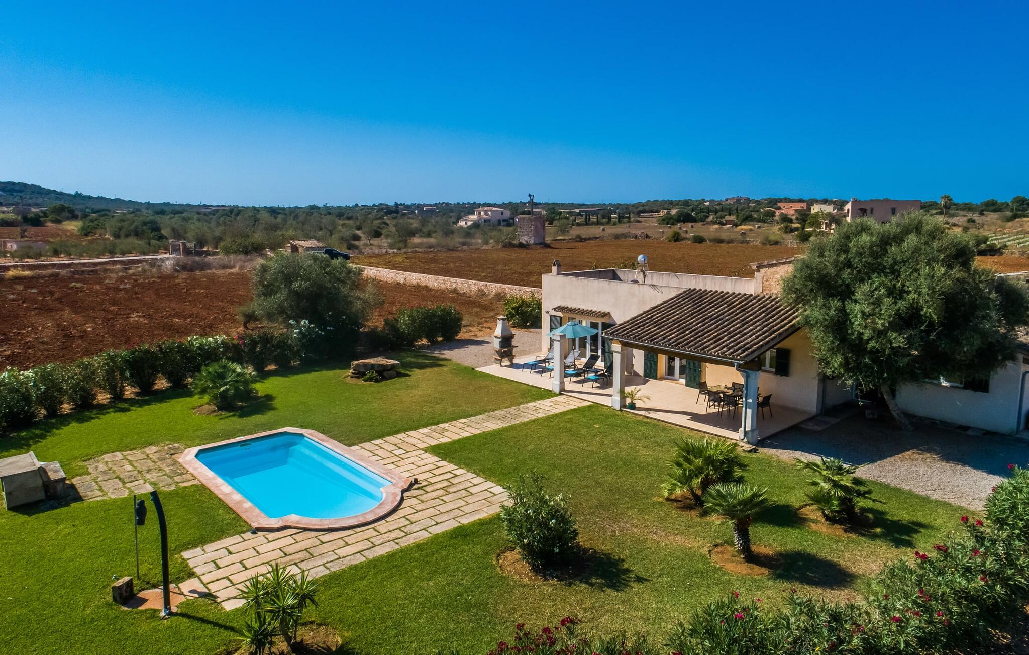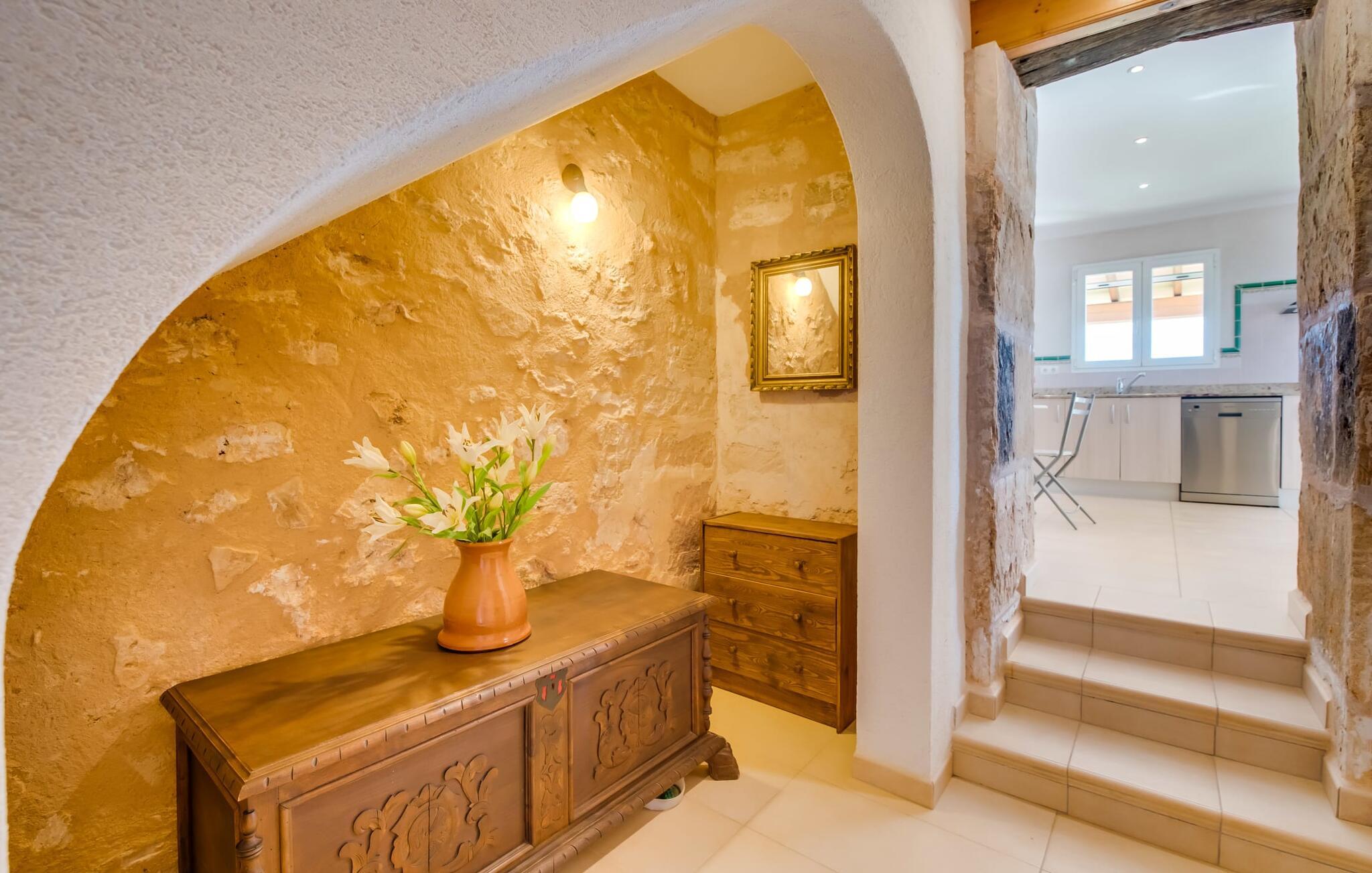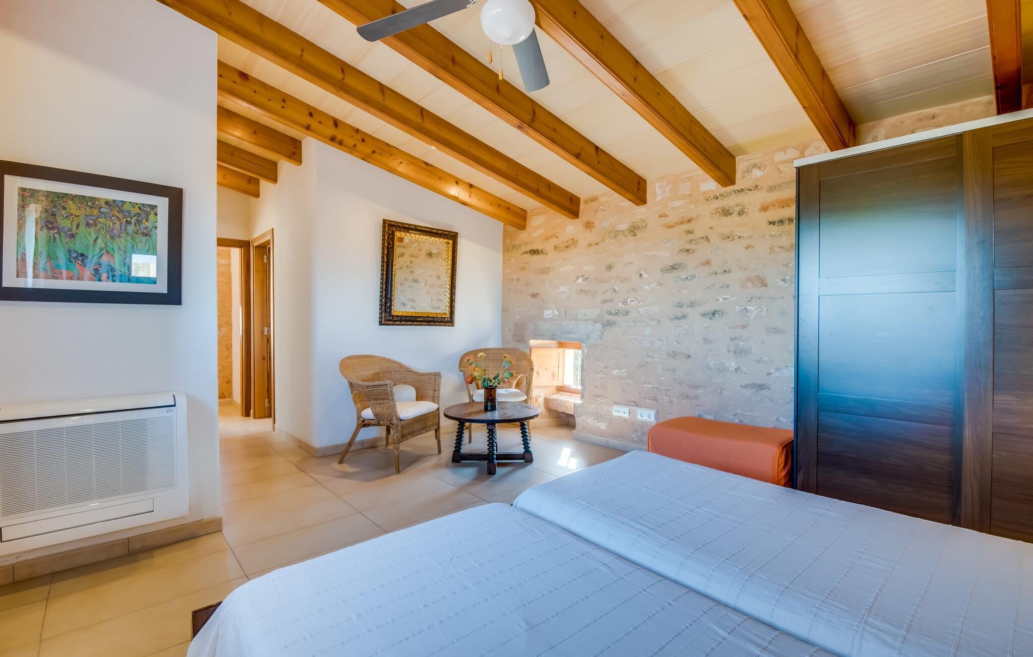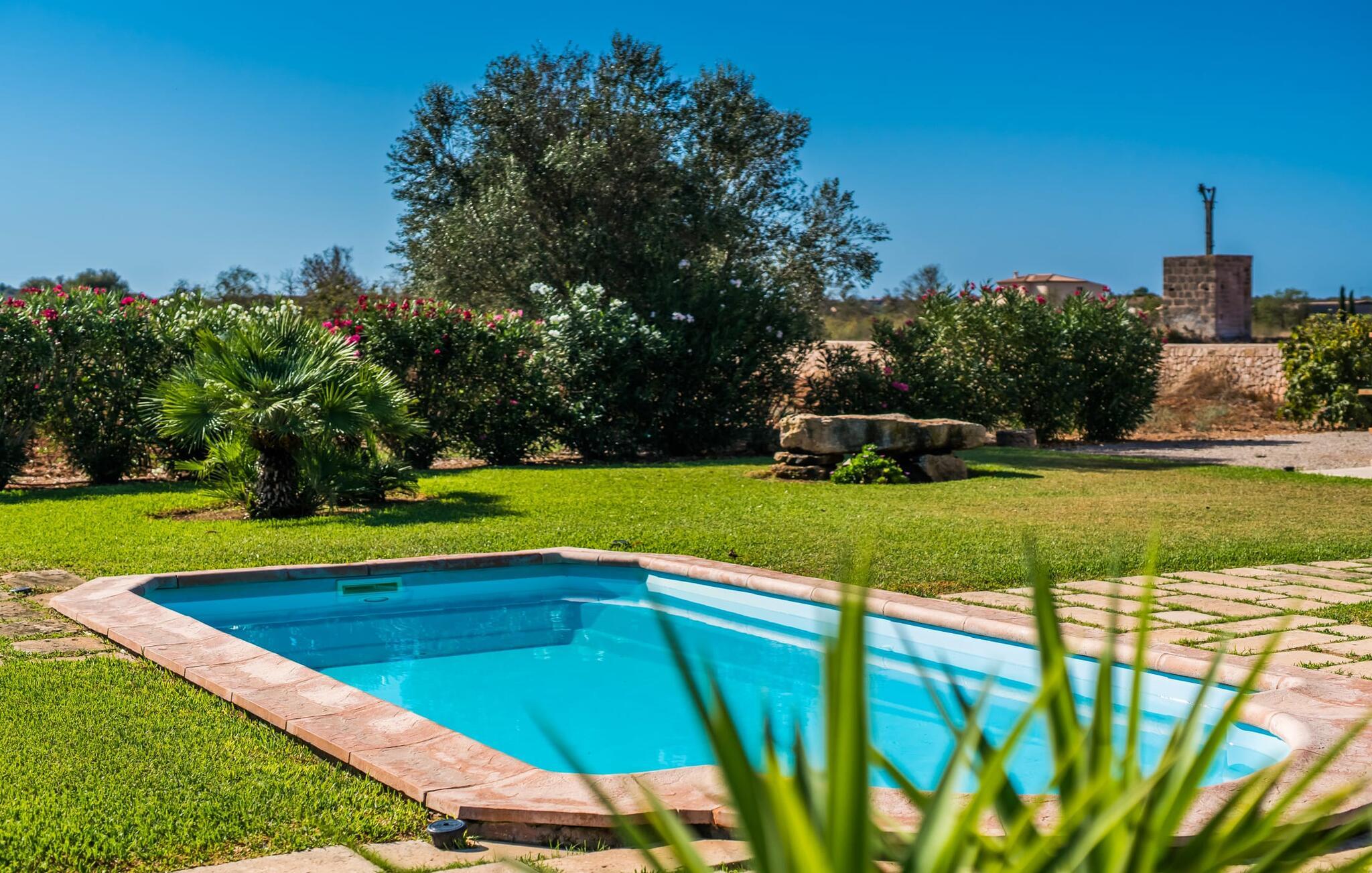 På en ugeneret ejendom med en betagende, uforstyrret udsigt over den sydlige del af øen ligger den smukke villa "Son Coves Petit", omgivet af en smukt anlagt have, hvis omfattende græsplæne er afskærmet fra omverdenen af en række oleandere. Den lille, men dejlige pool er forbundet med terrassen foran det sydvendte hus via en asfalteret sti. Der er i alt seks liggestole, som I kan stille op hvor som helst på plænen - perfekt til at nyde middelhavsklimaet og den varmende sol efter en kort, forfriskende svømmetur i havebruseren. Der er to skønne terrasser at vælge imellem. På siden ud mod poolen er den overdækkede terrasse, hvor der er en spisegruppe bestående af højkvalitets aluminiumsstole og et bord med glasplade. På siden af huset er der en muret grill til afslappet madlavning om aftenen. Det andet opholdsområde er placeret på et lige så attraktivt sted på terrassen foran husets indgang. Hvilket bedre sted at sidde om morgenen, planlægge jeres dag og nyde dette landlige paradis end her under det ærværdige gamle figentræ? Halvdelen af denne markante villa består af en restaureret stald, så indenfor finder I mange charmerende detaljer som trekantede vinduer, murstensnicher og fritlagte murværker, der giver et kærligt og smagfuldt designet interiør. Kombineret med usædvanligt smarte, moderne møbler, opfylder denne villa alle ønsker fra en lille moderne familie eller to par, der holder ferie sammen. Opholds- og spiseafdelingen fører ind i køkkenet. De store, sandstensfarvede gulvfliser sikrer kontinuitet i de enkelte områder. Den delikate brændeovn ved siden af de mørke lædersofaer i stuen komplementerer det sarte klassiske metalværk i spisestuesættet i art deco-stil. Det enorme køkken med indbygget belysning er visuelt adskilt fra de øvrige områder af et fritstående skab. Bag den, gemt, finder I træskabe og et fuldt udstyret køkken med Senseo kaffemaskine, mikroovn, brødrister, opvaskemaskine og meget mere. De to soveværelser er fordelt på de to etager. To smarte bruserum indrettet i nostalgisk stil sikrer, at I ikke skal stå i kø til badeværelset om morgenen. Soveværelserne er udstyret med en 1,60 m bred dobbeltseng eller to enkeltsenge ved siden af hinanden. En ekstra børnefoldeseng på 1,77 mx 0,78 m og en sovesofa med en bredde på 1,4 m fås også. Det øverste soveværelse har en-suite badeværelse og udgang til en solrig tagterrasse. Den yderst gennemtænkte, rummelige planløsning giver så mange muligheder for en lille gruppe, at vi uforbeholdent kan anbefale denne charmerende og rustikke villa. Ejendommen "Son Coves Petit" er beliggende i en populær landlig beliggenhed mellem den lille landsby Ses Salines og det velkendte Campos. Villaen ligger tæt på vejen mellem Ses Salines og Campos (afhængig af vindretningen kan der være trafikstøj) og er derfor et godt udgangspunkt for diverse ø-udflugter. Ses Salines er en typisk mallorcansk lille by, hvor I finder butikker og et par gode restauranter. Landsbyen er berømt for sin saltproduktion, så det er ikke overraskende, at flere kendte producenter tilbyder smagninger, hvor I kan købe deres varer som en gave til venner eller som en souvenir til jer selv. På nordkysten omkring Colonia de Sant Jordi er der nogle smukke sandstrande, især den spektakulære Es Trenc strand. Dette er det ideelle sted for en afslappende gåtur mellem de naturlige klitter på den 5 km lange strandstrækning. Eller, hvis I foretrækker noget endnu mere naturnært, er der også en nudiststrandsektion. I slutningen af dagen vender I tilbage til roen i den smukke villa "Son Coves Petit". Ægtheden af denne ejendoms landbrugsfortid afspejles i det nærliggende mejeri - nogle dage kan man høre og lugte noget af det, men kun under visse vindforhold. Vi hos Fincallorca ønsker jer en afslappende ferie på landet i den indbydende villa "Son Coves Petit". Den restaurerede villa "Son Coves Petit" er beliggende i en idyllisk landlig beliggenhed nord for den smukke landsby Ses Salines. Der er butikker i landsbyen, og om torsdagen er der et livligt ugentligt marked med friske råvarer. Campos ligger også kun 10 minutter væk i bil. Den nærmeste badeby er den naturlige strand Es Trenc, som ofte omtales som det Baleariske Caribien på grund af sit turkise vand og fine sand – selvom man her kan finde utallige fyrretræer i stedet for palmer.