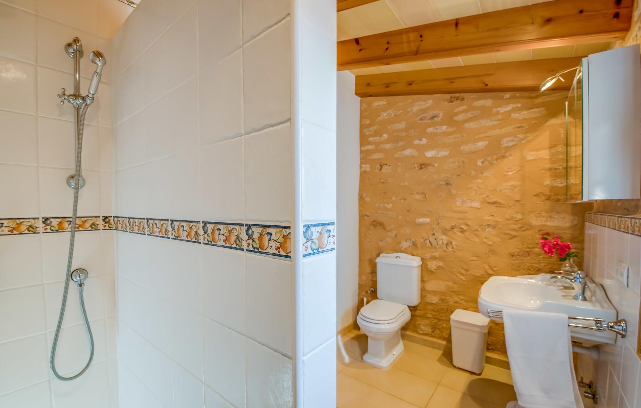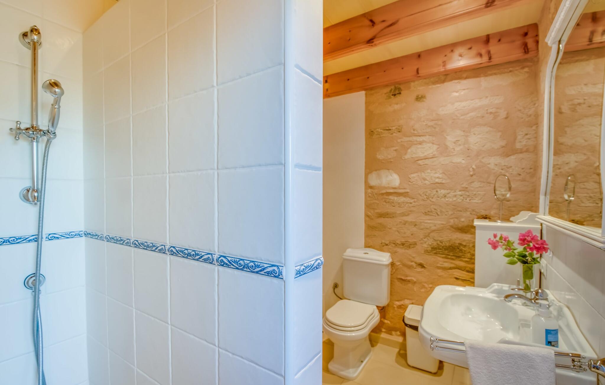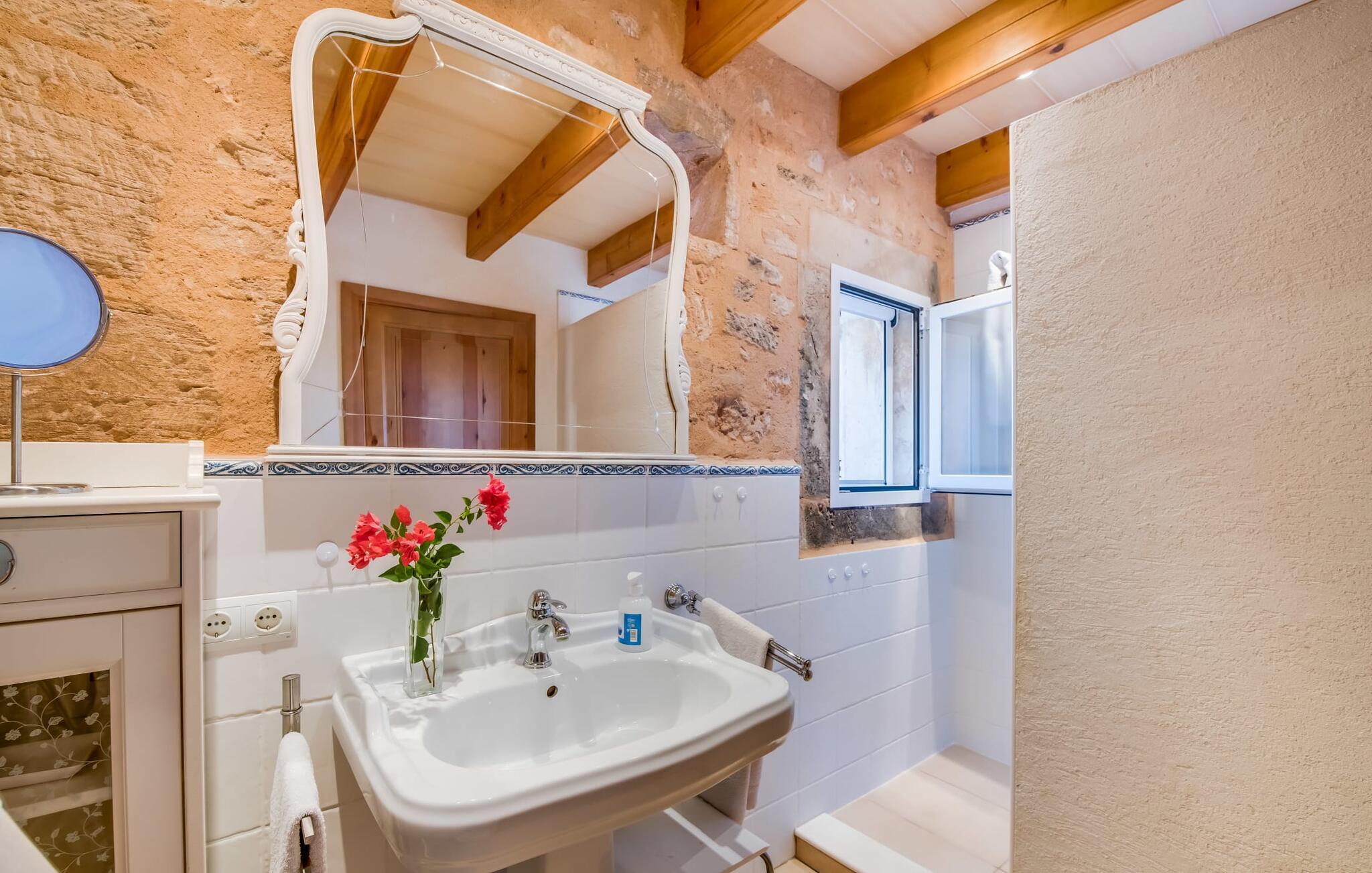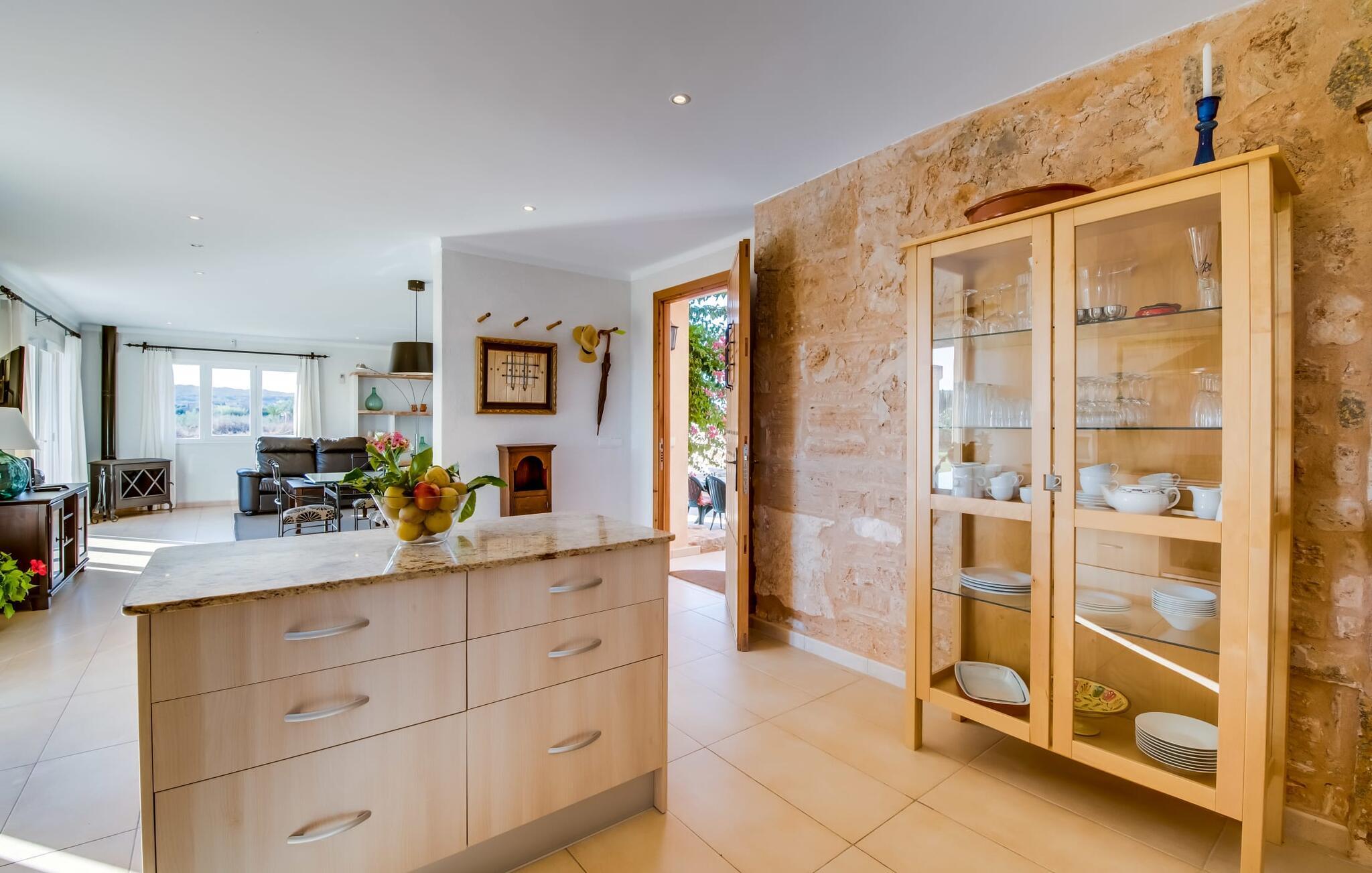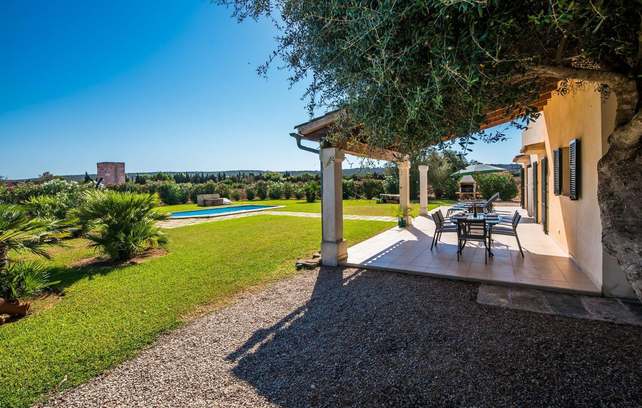 På en ugeneret ejendom med en betagende, uforstyrret udsigt over den sydlige del af øen ligger den smukke villa "Son Coves Petit", omgivet af en smukt anlagt have, hvis omfattende græsplæne er afskærmet fra omverdenen af en række oleandere. Den lille, men dejlige pool er forbundet med terrassen foran det sydvendte hus via en asfalteret sti. Der er i alt seks liggestole, som I kan stille op hvor som helst på plænen - perfekt til at nyde middelhavsklimaet og den varmende sol efter en kort, forfriskende svømmetur i havebruseren. Der er to skønne terrasser at vælge imellem. På siden ud mod poolen er den overdækkede terrasse, hvor der er en spisegruppe bestående af højkvalitets aluminiumsstole og et bord med glasplade. På siden af huset er der en muret grill til afslappet madlavning om aftenen. Det andet opholdsområde er placeret på et lige så attraktivt sted på terrassen foran husets indgang. Hvilket bedre sted at sidde om morgenen, planlægge jeres dag og nyde dette landlige paradis end her under det ærværdige gamle figentræ? Halvdelen af denne markante villa består af en restaureret stald, så indenfor finder I mange charmerende detaljer som trekantede vinduer, murstensnicher og fritlagte murværker, der giver et kærligt og smagfuldt designet interiør. Kombineret med usædvanligt smarte, moderne møbler, opfylder denne villa alle ønsker fra en lille moderne familie eller to par, der holder ferie sammen. Opholds- og spiseafdelingen fører ind i køkkenet. De store, sandstensfarvede gulvfliser sikrer kontinuitet i de enkelte områder. Den delikate brændeovn ved siden af de mørke lædersofaer i stuen komplementerer det sarte klassiske metalværk i spisestuesættet i art deco-stil. Det enorme køkken med indbygget belysning er visuelt adskilt fra de øvrige områder af et fritstående skab. Bag den, gemt, finder I træskabe og et fuldt udstyret køkken med Senseo kaffemaskine, mikroovn, brødrister, opvaskemaskine og meget mere. De to soveværelser er fordelt på de to etager. To smarte bruserum indrettet i nostalgisk stil sikrer, at I ikke skal stå i kø til badeværelset om morgenen. Soveværelserne er udstyret med en 1,60 m bred dobbeltseng eller to enkeltsenge ved siden af hinanden. En ekstra børnefoldeseng på 1,77 mx 0,78 m og en sovesofa med en bredde på 1,4 m fås også. Det øverste soveværelse har en-suite badeværelse og udgang til en solrig tagterrasse. Den yderst gennemtænkte, rummelige planløsning giver så mange muligheder for en lille gruppe, at vi uforbeholdent kan anbefale denne charmerende og rustikke villa. Ejendommen "Son Coves Petit" er beliggende i en populær landlig beliggenhed mellem den lille landsby Ses Salines og det velkendte Campos. Villaen ligger tæt på vejen mellem Ses Salines og Campos (afhængig af vindretningen kan der være trafikstøj) og er derfor et godt udgangspunkt for diverse ø-udflugter. Ses Salines er en typisk mallorcansk lille by, hvor I finder butikker og et par gode restauranter. Landsbyen er berømt for sin saltproduktion, så det er ikke overraskende, at flere kendte producenter tilbyder smagninger, hvor I kan købe deres varer som en gave til venner eller som en souvenir til jer selv. På nordkysten omkring Colonia de Sant Jordi er der nogle smukke sandstrande, især den spektakulære Es Trenc strand. Dette er det ideelle sted for en afslappende gåtur mellem de naturlige klitter på den 5 km lange strandstrækning. Eller, hvis I foretrækker noget endnu mere naturnært, er der også en nudiststrandsektion. I slutningen af dagen vender I tilbage til roen i den smukke villa "Son Coves Petit". Ægtheden af denne ejendoms landbrugsfortid afspejles i det nærliggende mejeri - nogle dage kan man høre og lugte noget af det, men kun under visse vindforhold. Vi hos Fincallorca ønsker jer en afslappende ferie på landet i den indbydende villa "Son Coves Petit". Den restaurerede villa "Son Coves Petit" er beliggende i en idyllisk landlig beliggenhed nord for den smukke landsby Ses Salines. Der er butikker i landsbyen, og om torsdagen er der et livligt ugentligt marked med friske råvarer. Campos ligger også kun 10 minutter væk i bil. Den nærmeste badeby er den naturlige strand Es Trenc, som ofte omtales som det Baleariske Caribien på grund af sit turkise vand og fine sand – selvom man her kan finde utallige fyrretræer i stedet for palmer.