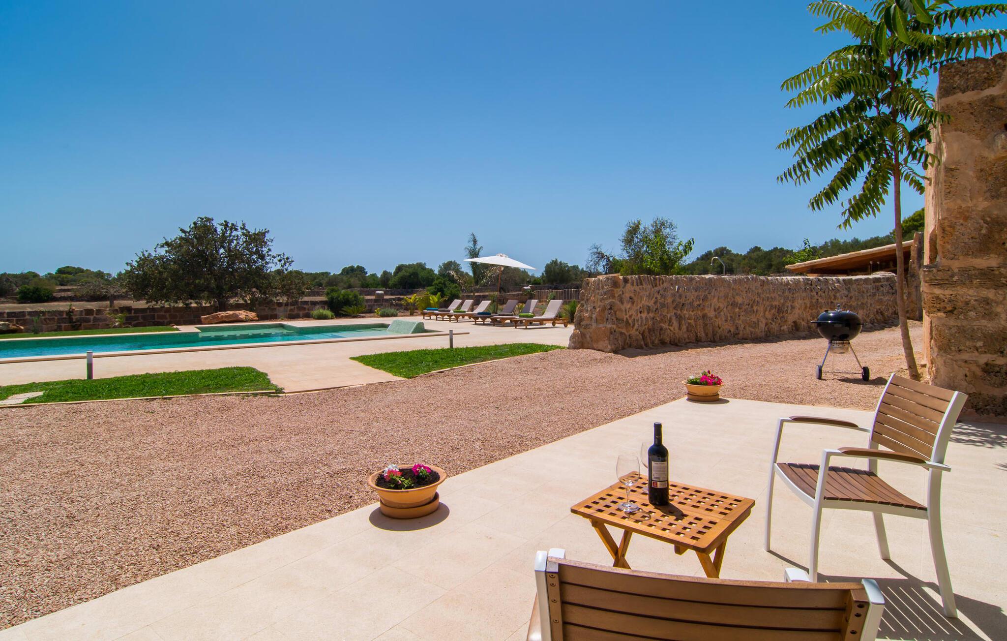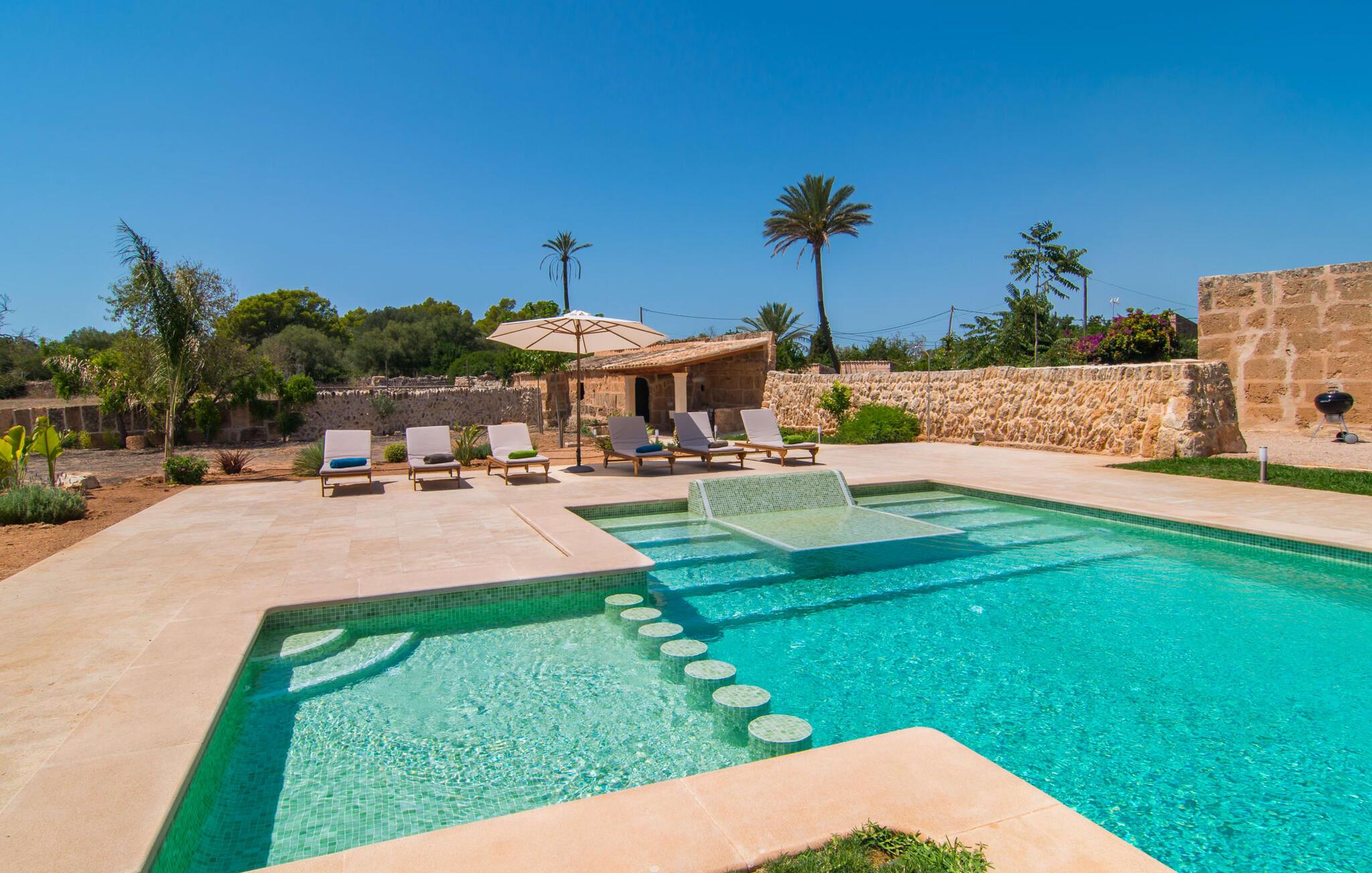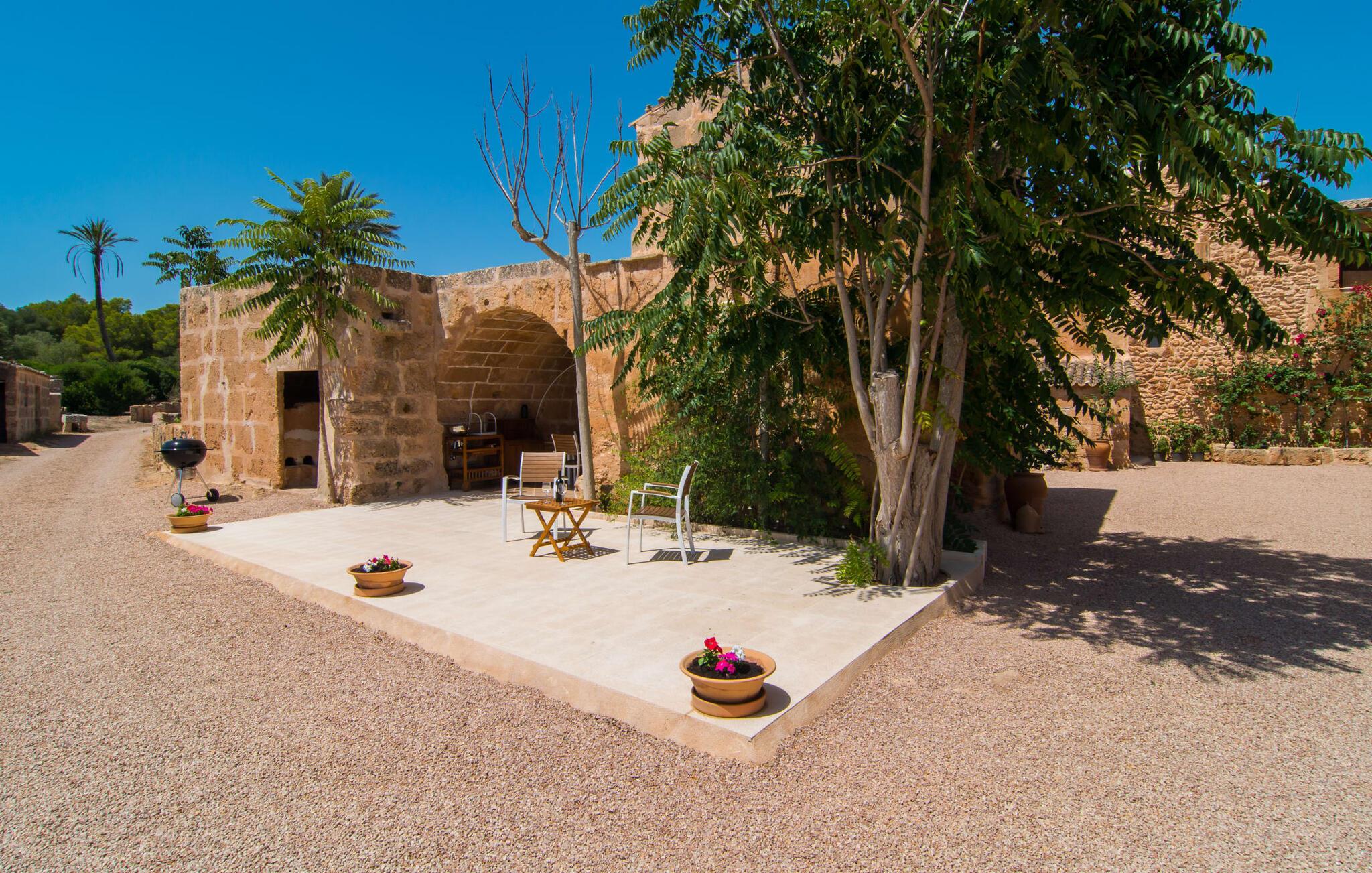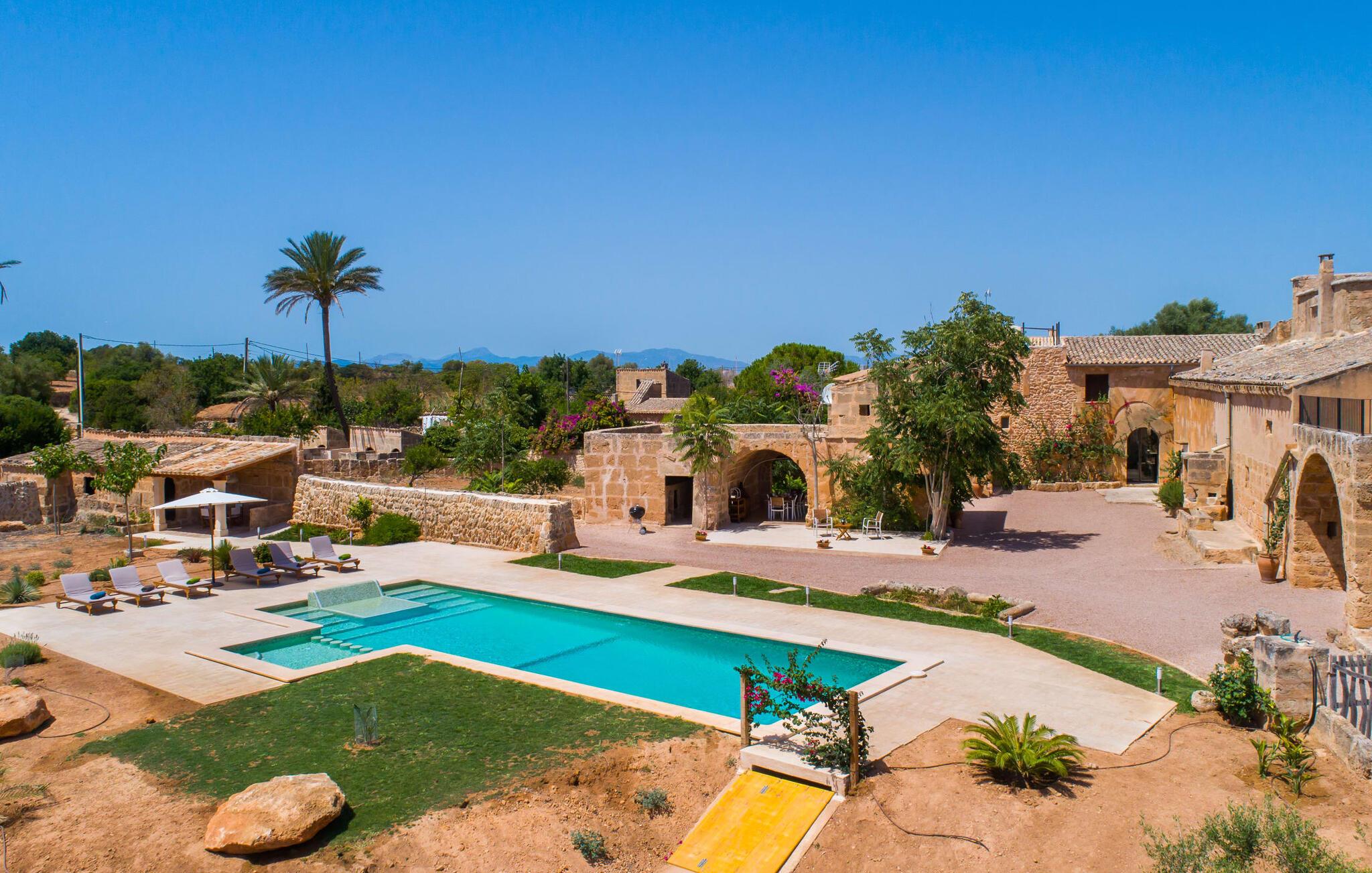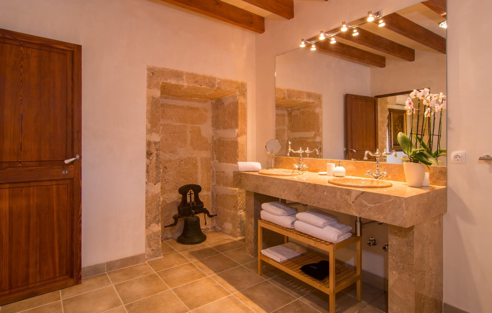 Der er villaer, der giver jer følelsen af, at halvdelen af Mallorca ligger for jeres fødder. Dette er tilfældet med villaen "Son Delabau Gran". Så snart I når den vidtstrakte ejendom efter en kort køretur fra den mallorcanske lufthavn, sætter følelsen af tidløs luksus uundgåeligt ind. På trods af den attraktive nærhed til spændende byer som Palma eller Llucmajor, emmer udsigten over det omkringliggende landskab af ren landlig idyl. Og måske vil den buede terrasse minde jer om de store tider i jeres barndom, hvor I havde en særlig forkærlighed for slotte, der lignede noget ud af et eventyr. Smalle trin, der giver indtryk af et gammelt vartegn, fører til en smuk tagterrasse, hvor I kan nyde øens solskinn. Poolvandet glitrer forførende i solen, noget I måske ikke kan modstå længe. Og hvorfor skulle I det? En af de gavnlige effekter ved vand er, at maden smager meget bedre bagefter. Især når det blev tilberedt i sådan et hyggeligt udekøkken, perfekt udstyret til en stor BBQ. Når I ligger på en af liggestolene og ser solnedgangen eller bruger et af siddeområderne - som pergolaen eller chill-out loungen - til at smage et glas ø-vin, vil I vide: I gjorde alt rigtigt, en mere billedskønt Der er ingen idyl. Vildt romantiske roser kravler op ad stenmursfronten i indgangspartiet. Når I kommer ind, befinder I jer i et hus af særlig kvalitet. I finder ikke noget overflødigt her, den minimalistiske og hyggelige stil minder om skandinavisk æstetik, samtidig med at den "finca-agtige" landlige charme stadig er til stede i næsten alle hjørner. Et hyggeligt opholdsområde med en stenbænk badet i varmt lys, ideel til lange nætter med historie, kan blive et af jeres yndlingssteder i huset. Det kunne den grønne sofa, hvorfra I kan se ud i jeres drømmehave, sige noget om det. Der er to spisepladser. En af dem ligger lige ved siden af det allerede nævnte opholdsområde og springvandet, det andet spisebord står i et større rum. Vinduerne, der varierer i størrelse og form, bidrager til originaliteten af den magiske stemning. Et af værelserne ligner endda et kapel med sit farverige glasvindue i loftet. Her kan I for eksempel meditere om morgenen for at starte dagen afbalanceret og i godt humør. Indretningen af værelserne er meget rustik de to soveværelser nås gennem snoede gange. Hver af dem har sit eget badeværelse, og det lille tredje soveværelse er det perfekte sted for børnene. Naturstensvægelementerne i huset skaber en hjemlig slotsstemning, som også formidler modernitet gennem de hvide farver og det venlige lyskoncept. Så I vil føle jer frisk, når I forlader ejendommen om morgenen. Vejen er let at nå, hvilket kan forårsage hørbar trafikstøj afhængigt af vindretningen. I er ikke meget mere end 10 minutter fra Llucmajor, hvor det livlige Placa d'Espana byder på en farverig blanding af caféer, restauranter og barer. Der er et marked her to gange om ugen, hvor I kan forsyne jer med friske grøntsager, især om fredagen. Til en shoppingtur anbefaler vi også de 20 minutters kørsel til den pulserende ø-hovedstad Palma, som imponerer med sit mangfoldige kulturelle tilbud. Golfentusiaster vil få noget for pengene på Son Antem golfbane, 1 km væk. Efter en halv times kørsel vil I befinde jer foran den paradisiske naturlige sandstrand Es Trenc. Rejsen til Tramuntana-bjergene, som er ideel til vandreture, tager omtrent samme tid. Den fantastiske villa "Son Delabau Gran" har masser af plads og ligger mellem drømmestranden S'Arenal og Llucmajor, 11 km væk. I kan tage ind til byen og nyde den livlige atmosfære på Placa d'Espana. Da I kun er 20 minutters kørsel fra hovedstaden Palma, finder I masser af variation i byens centrum. Efter shopping kan I slappe af på sydkystens strande, herunder Calo de San Antoni.