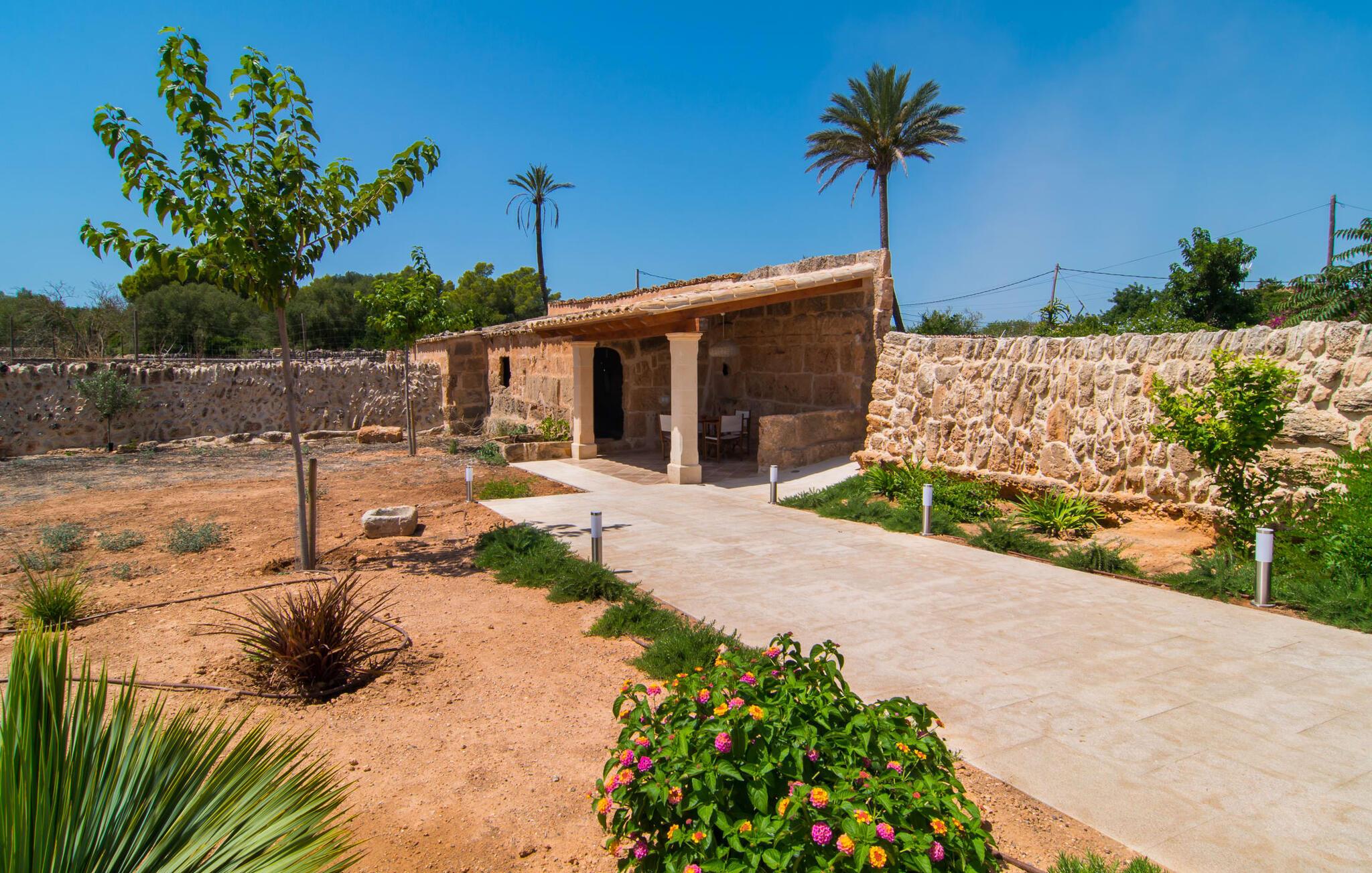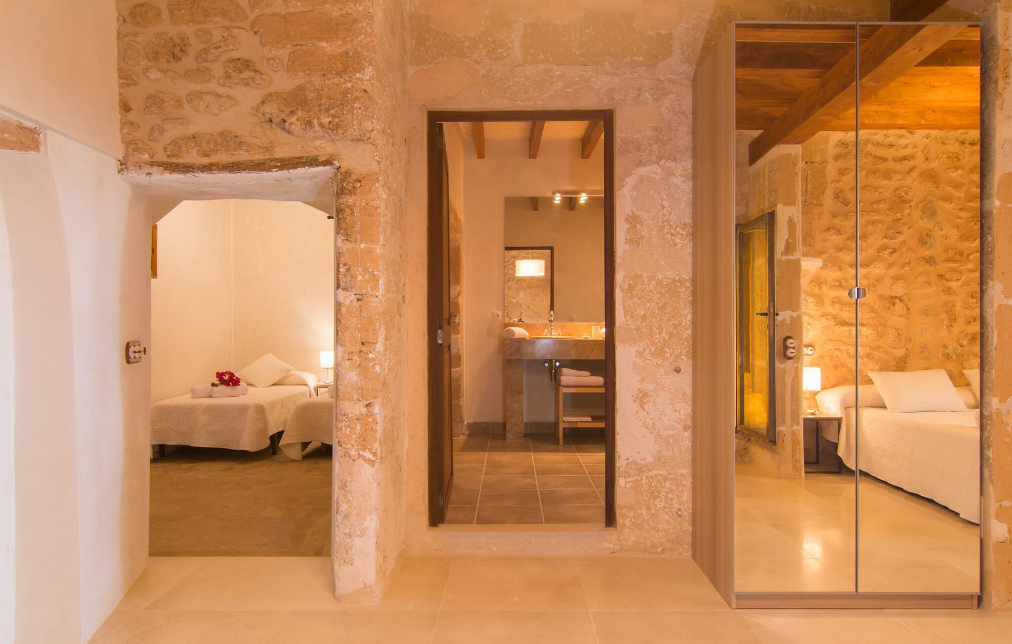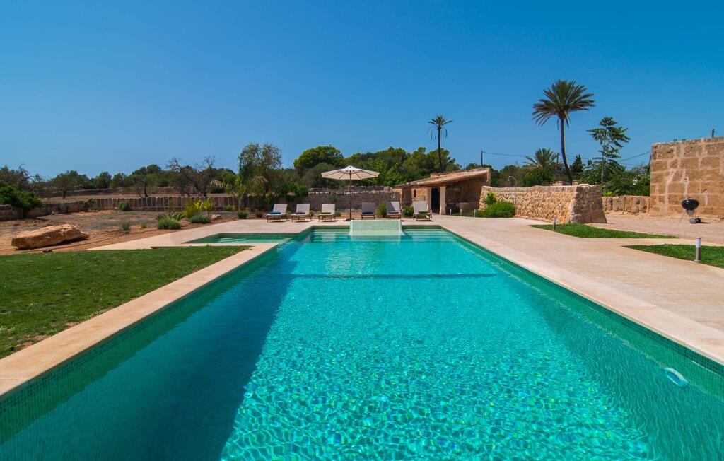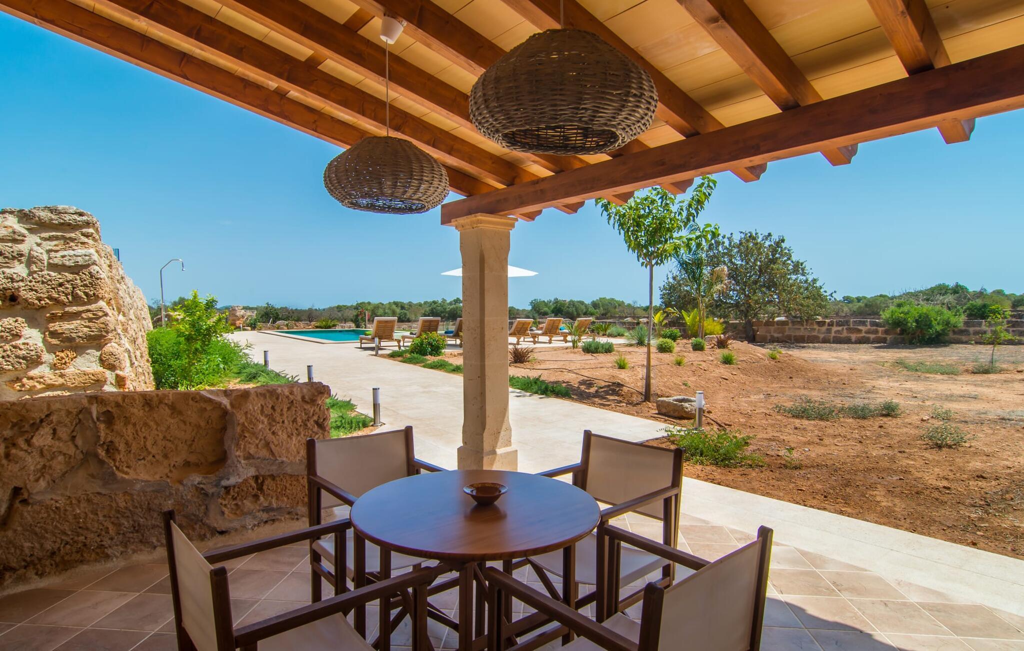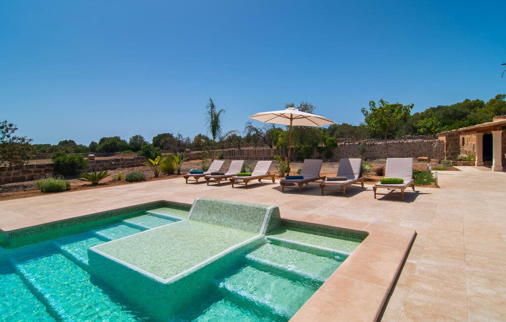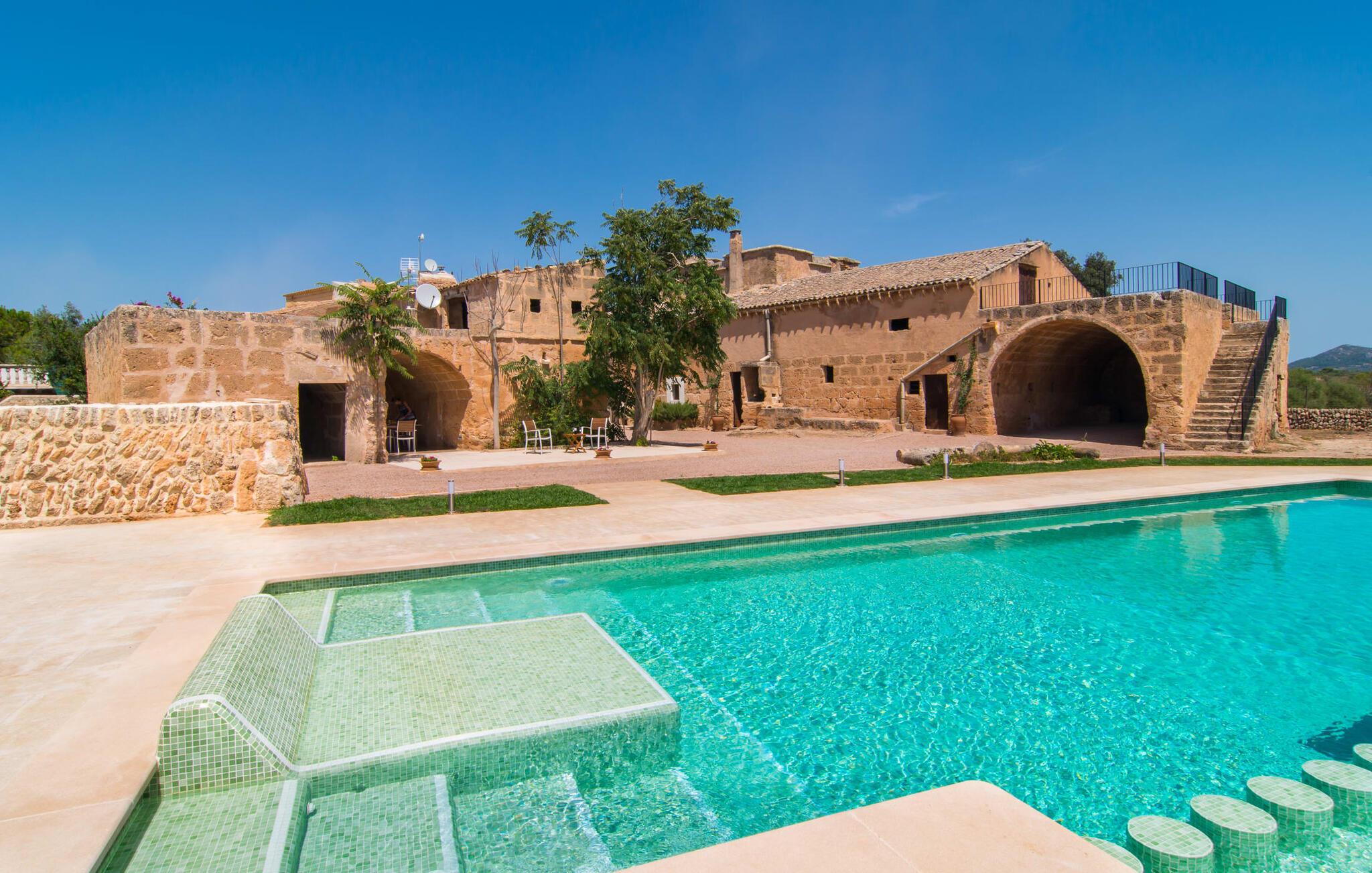 Der er villaer, der giver jer følelsen af, at halvdelen af Mallorca ligger for jeres fødder. Dette er tilfældet med villaen "Son Delabau Gran". Så snart I når den vidtstrakte ejendom efter en kort køretur fra den mallorcanske lufthavn, sætter følelsen af tidløs luksus uundgåeligt ind. På trods af den attraktive nærhed til spændende byer som Palma eller Llucmajor, emmer udsigten over det omkringliggende landskab af ren landlig idyl. Og måske vil den buede terrasse minde jer om de store tider i jeres barndom, hvor I havde en særlig forkærlighed for slotte, der lignede noget ud af et eventyr. Smalle trin, der giver indtryk af et gammelt vartegn, fører til en smuk tagterrasse, hvor I kan nyde øens solskinn. Poolvandet glitrer forførende i solen, noget I måske ikke kan modstå længe. Og hvorfor skulle I det? En af de gavnlige effekter ved vand er, at maden smager meget bedre bagefter. Især når det blev tilberedt i sådan et hyggeligt udekøkken, perfekt udstyret til en stor BBQ. Når I ligger på en af liggestolene og ser solnedgangen eller bruger et af siddeområderne - som pergolaen eller chill-out loungen - til at smage et glas ø-vin, vil I vide: I gjorde alt rigtigt, en mere billedskønt Der er ingen idyl. Vildt romantiske roser kravler op ad stenmursfronten i indgangspartiet. Når I kommer ind, befinder I jer i et hus af særlig kvalitet. I finder ikke noget overflødigt her, den minimalistiske og hyggelige stil minder om skandinavisk æstetik, samtidig med at den "finca-agtige" landlige charme stadig er til stede i næsten alle hjørner. Et hyggeligt opholdsområde med en stenbænk badet i varmt lys, ideel til lange nætter med historie, kan blive et af jeres yndlingssteder i huset. Det kunne den grønne sofa, hvorfra I kan se ud i jeres drømmehave, sige noget om det. Der er to spisepladser. En af dem ligger lige ved siden af det allerede nævnte opholdsområde og springvandet, det andet spisebord står i et større rum. Vinduerne, der varierer i størrelse og form, bidrager til originaliteten af den magiske stemning. Et af værelserne ligner endda et kapel med sit farverige glasvindue i loftet. Her kan I for eksempel meditere om morgenen for at starte dagen afbalanceret og i godt humør. Indretningen af værelserne er meget rustik de to soveværelser nås gennem snoede gange. Hver af dem har sit eget badeværelse, og det lille tredje soveværelse er det perfekte sted for børnene. Naturstensvægelementerne i huset skaber en hjemlig slotsstemning, som også formidler modernitet gennem de hvide farver og det venlige lyskoncept. Så I vil føle jer frisk, når I forlader ejendommen om morgenen. Vejen er let at nå, hvilket kan forårsage hørbar trafikstøj afhængigt af vindretningen. I er ikke meget mere end 10 minutter fra Llucmajor, hvor det livlige Placa d'Espana byder på en farverig blanding af caféer, restauranter og barer. Der er et marked her to gange om ugen, hvor I kan forsyne jer med friske grøntsager, især om fredagen. Til en shoppingtur anbefaler vi også de 20 minutters kørsel til den pulserende ø-hovedstad Palma, som imponerer med sit mangfoldige kulturelle tilbud. Golfentusiaster vil få noget for pengene på Son Antem golfbane, 1 km væk. Efter en halv times kørsel vil I befinde jer foran den paradisiske naturlige sandstrand Es Trenc. Rejsen til Tramuntana-bjergene, som er ideel til vandreture, tager omtrent samme tid. Den fantastiske villa "Son Delabau Gran" har masser af plads og ligger mellem drømmestranden S'Arenal og Llucmajor, 11 km væk. I kan tage ind til byen og nyde den livlige atmosfære på Placa d'Espana. Da I kun er 20 minutters kørsel fra hovedstaden Palma, finder I masser af variation i byens centrum. Efter shopping kan I slappe af på sydkystens strande, herunder Calo de San Antoni.