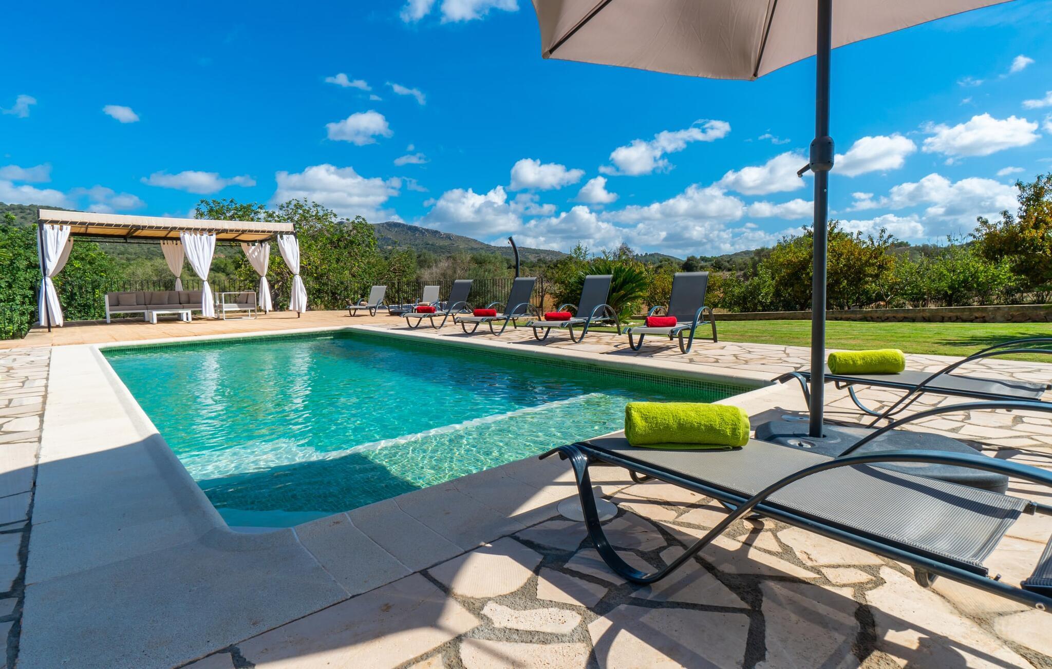 Det charmerende feriehus "Son Duri" nær Manacor er beliggende i rolige landlige omgivelser, omgivet af fladt landskab. Det næsten trinløse, rummelige udendørsareal har en rummelig græsplæne, der indbyder til leg og afslapning. Skyggefulde legeområder byder de små gæster varmt velkommen. Poolen har nem adgangstrin og et bredt siddeområde og kan sikkert indhegnes, hvis det ønskes. Solterrassen, foret med en stor pavillon og komfortable havemøbler, inviterer jer til at slappe af. En overdækket terrasse giver et hyggeligt sted til udendørs spisning, så I kan nyde måltider fra murstensgrillen, mens I holder øje med poolen. Den omfattende ejendom tilbyder en betagende udsigt over landskabet nord for Manacor og sikrer masser af privatliv. Det rummelige interiør er ideelt til en afslappende ferie med hele familien. I stueetagen finder I en lys opholds- og spisestue med siddepladser og pejs. Det moderne, veludstyrede køkken er halvåbent til spisepladsen. Der er direkte udgang til den overdækkede terrasse fra både køkken og spiseplads. Den brede bruser og døre i stueetagen gør denne del af fincaen let tilgængelig for alle. På øverste etage er der yderligere tre soveværelser med dobbeltsenge og to badeværelser. De hyggelige soveværelser byder på en smuk udsigt over det omkringliggende landskab og vinduerne kan let mørklægges med skodder. Dette dejlige feriehus nær Manacor tilbyder også pålidelig mobiltelefonmodtagelse, god WiFi og et skrivebord. Den moderne villa "Son Duri" ligger på en kæmpe ejendom på den østlige del af øen, omkring 60 km fra lufthavnen. Det er centralt beliggende, små byer og strande er i nærheden.