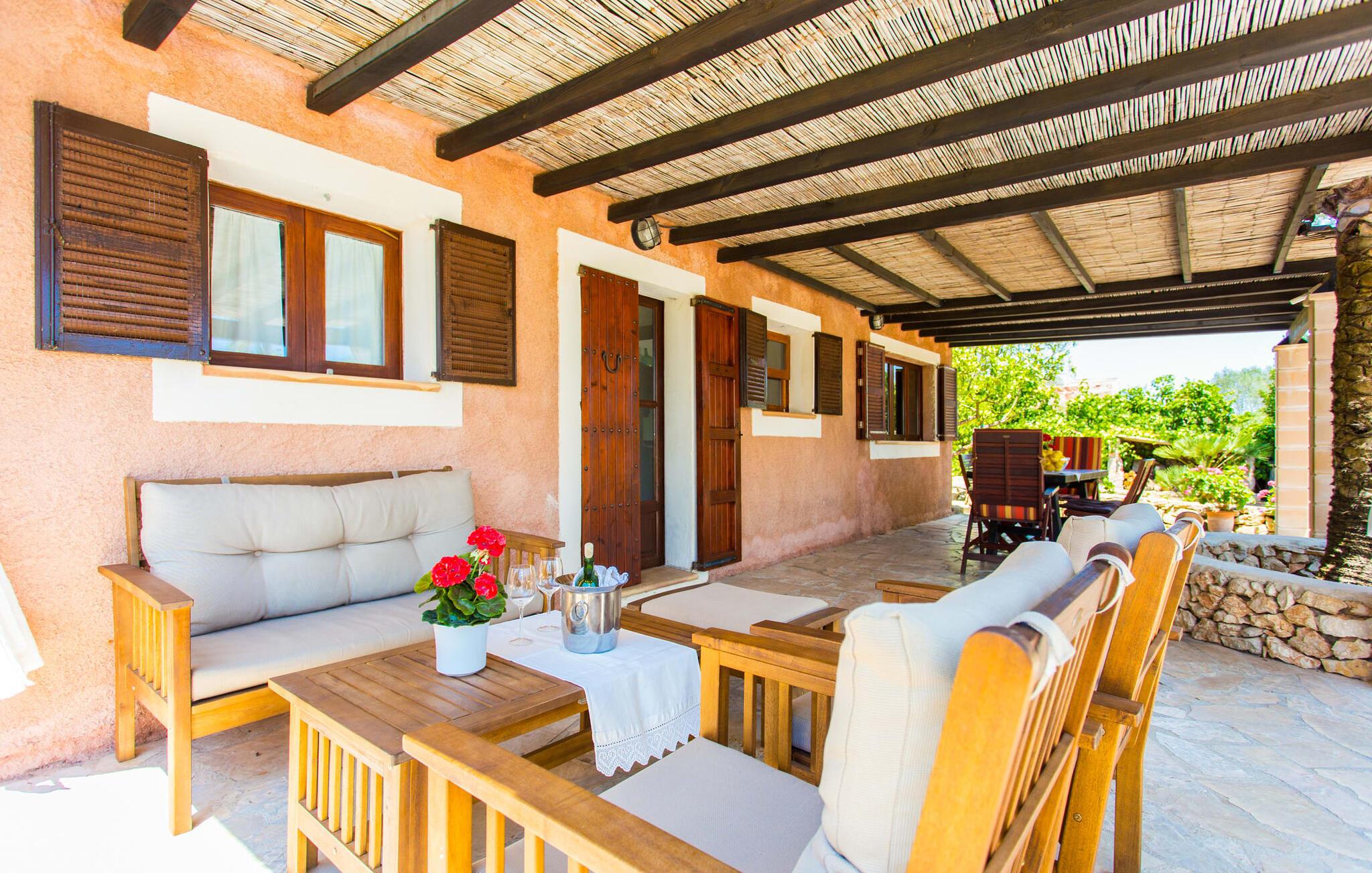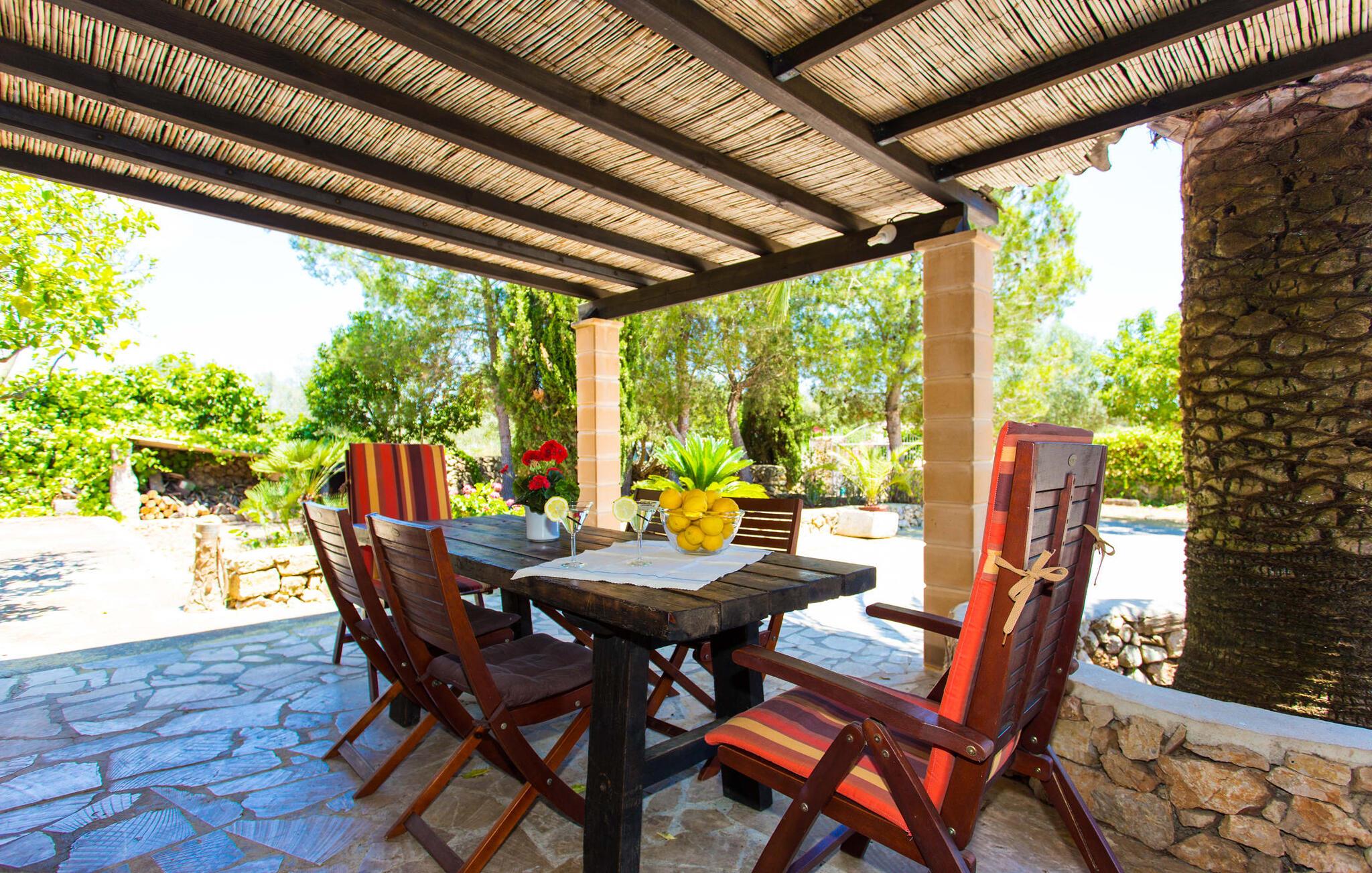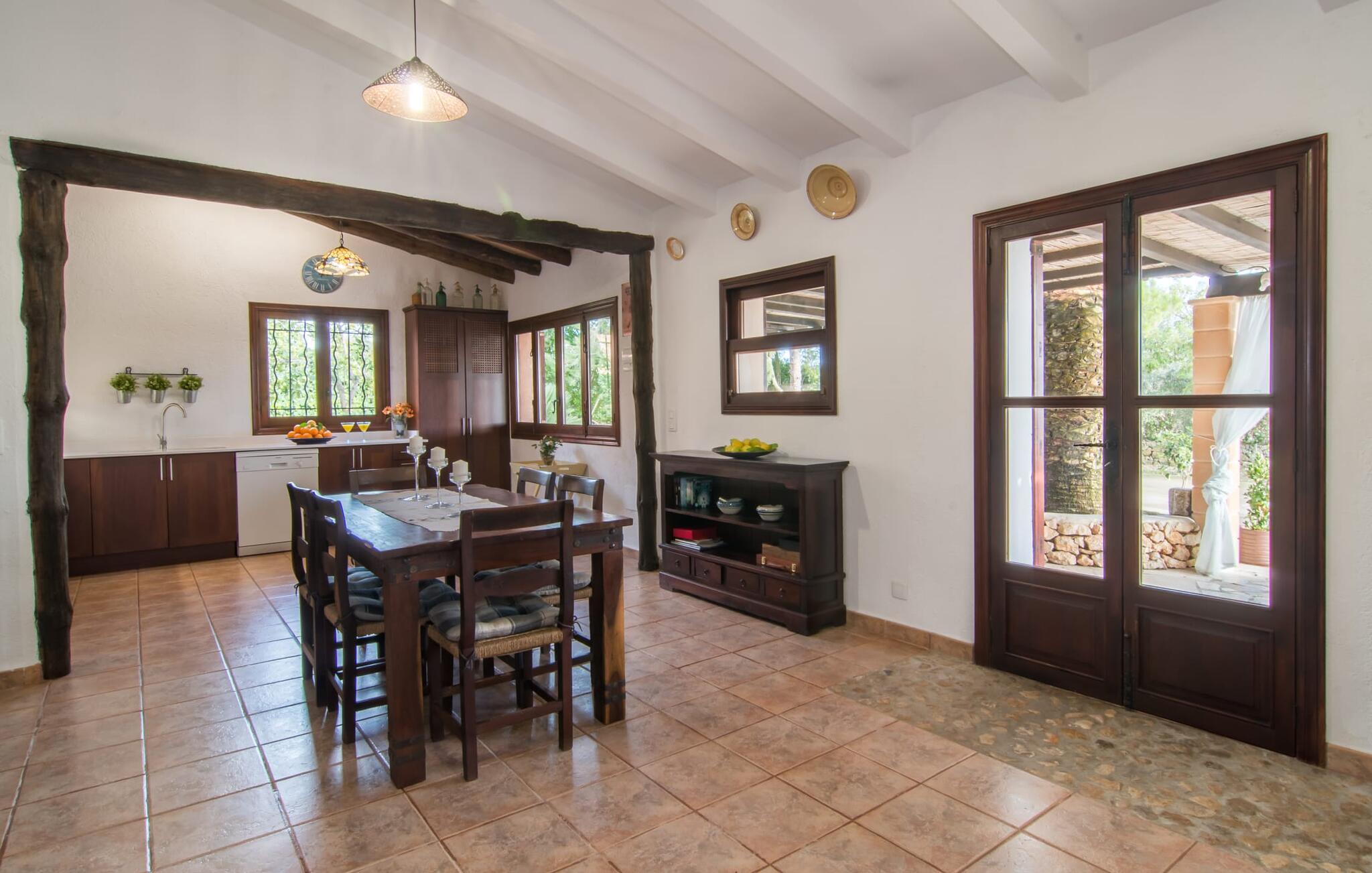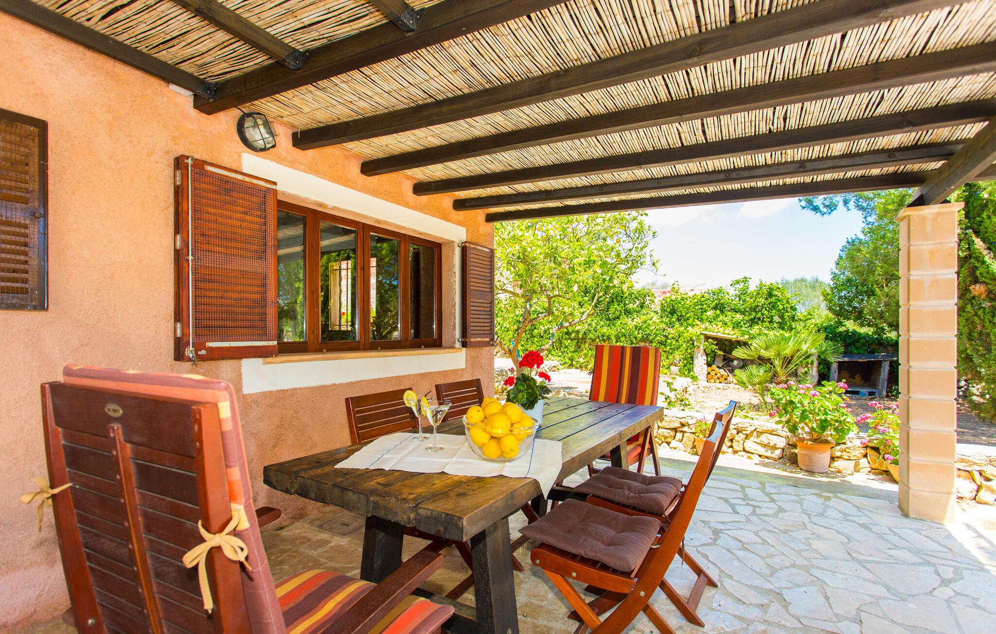 Den traditionelle villa "So Fangos" i en perfekt landlig beliggenhed lige syd for Manacor er perfekt til børn og familier. Dette kan allerede ses udefra, for eksempel ved den let hævede pool bag huset lige ved siden af et smukt, skyggefuldt skovområde med solterrasse og en lille græsplæne. Da poolområdet er indhegnet og aflåst med låge, er det sikret, at børn ikke kan lege på dette område uden opsyn. Ved poolen er der i alt seks liggestole til solbadning og to parasoller til skygge. Selve villaen er omgivet af et natursten terrasseområde omgivet af middelhavsgrønne planter. Et højt palmetræ grænser direkte op til den overdækkede terrasse langs huset. I dette område finder I et enkelt træbord med seks komfortable træstole - en fantastisk udendørs spiseplads kun få meter fra husets indgang og køkken. På den anden side af verandaen er der et loungeområde - perfekt om aftenen, når børnene er i seng, og man bare vil nyde græshoppernes kvidren og det milde klima med en sidste drink. På bagsiden af huset er der endnu en lille overdækket terrasse med siddeplads til vores folk. Det fine ved denne terrasse er, at den er direkte tilgængelig fra to af de tre soveværelser. Terrassen er desuden omgivet af en træport og kan lukkes med en dør. Der er en basketballbane til rådighed for gæsterne. Bagefter kan I tage en forfriskende svømmetur i den private pool. Den familievenlige karakter og design bekræftes også inde i villaen. Vi kan især godt lide, at villaen efter restaureringen har et stort spise-/opholds- og køkkenområde, som kombinerer alle de funktioner, som en familie bruger sammen (bortset fra de private områder i soveværelset, naturligvis) til et fælles opholdsrum. Træbordet med træstole står midt i rummet. Her er plads nok, hvilket giver rummet en rummelig følelse. Væggene er dekoreret med landbrugsredskaber, der illustrerer den oprindelige landbrugsmæssige anvendelse af denne ejendom. Til højre for spisepladsen er det åbne køkkenområde, hvor loftsbjælkerne af egetræ er synlige. Det smarte, mørke trækøkken behøver ikke at gemme sig i et lukket rum. Det fulde tekniske udstyr gør selvforplejning til jeres individuelle ferie let. Til venstre for spisepladsen, adskilt af en egetræsbue, er der en hyggelig opholdsstue malet i solgul. Sorte lædermøbler som et hyggeligt opholdsområde foran en støbejernspejs og foran det moderne LCD-tv inviterer til en hyggelig aften. Fra stuen når man master soveværelset med en 1,60 m bred dobbeltseng og en-suite badeværelse. De to andre soveværelser er i gangen, der fører væk fra spisepladsen. De to soveværelser deler badeværelse, hvor begge badeværelser er udstyret med moderne walk-in brusere. Det ene af de to soveværelser er udstyret med en 1,60 m bred dobbeltseng, det tredje soveværelse er et klassisk børneværelse med en dobbelt køjeseng, mens den nederste seng har en queen-size seng på 1,40 m. Fra disse to soveværelser er der også udgang til den lille børnesikre indhegnede terrasse. I kan starte dagen med en kop kaffe i morgensolen, inden I begynder at planlægge jeres dag og tænke over, hvor I gerne vil hen på jeres næste tur. Den fordelagtige beliggenhed i den frugtbare slette i centrum af øen, den såkaldte "Pla de Mallorca", giver den fordel, at I herfra kan opdage Mallorcas forskellige attraktioner. På grund af nærheden til vejen (som kan høres afhængig af vinden) kan I hurtigt nå Manacor på 3,5 km, hvor I ikke kun kan gøre jeres daglige indkøb, men også shoppe og slentre i en af øens største byer . Og I kan nemt nå kystbyerne som Porto Cristo, hvor I kan slentre langs promenaden og få en snack på en af caféerne og restauranterne. Et besøg i drypstenshulerne nær Artà, "Coves des Dracs", er ikke kun interessant for børn. For en dag ved havet kan I vælge mellem østkystens smukke strande, kendt som "Calas de Mallorca". Her finder I fantastiske, næsten uberørte naturstrande som Cala Varques. Sidst på dagen venter den autentiske villa "Son Fangos" sine gæster, og I kan slappe af med en svømmetur i poolen eller en grillaften og nyde samværet med jeres familie eller som par, for villaen kan lejes på et nedsat pris for to personer. Den typiske mallorcanske villa "Son Fangos" ligger lidt væk fra byen Manacor på vej til Felanitx. Gør jeres daglige indkøb hurtigt og nemt i nærliggende Manacor, hvor der også er et smukt bondemarked hver mandag. De smukke strande, herunder den ensomme og næsten uberørte naturlige bugt "Cala Varques", kan nemt nås med lejebil.