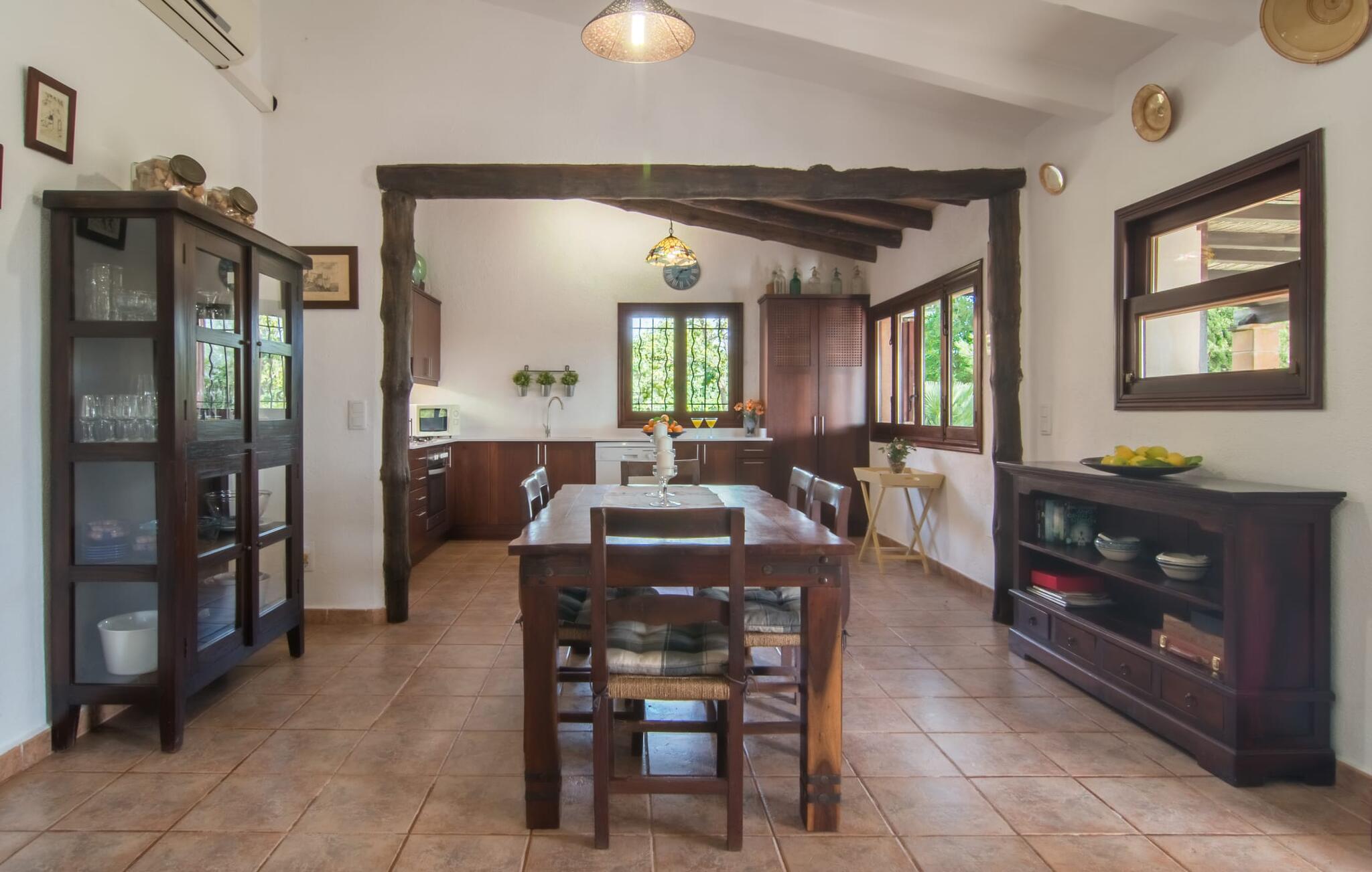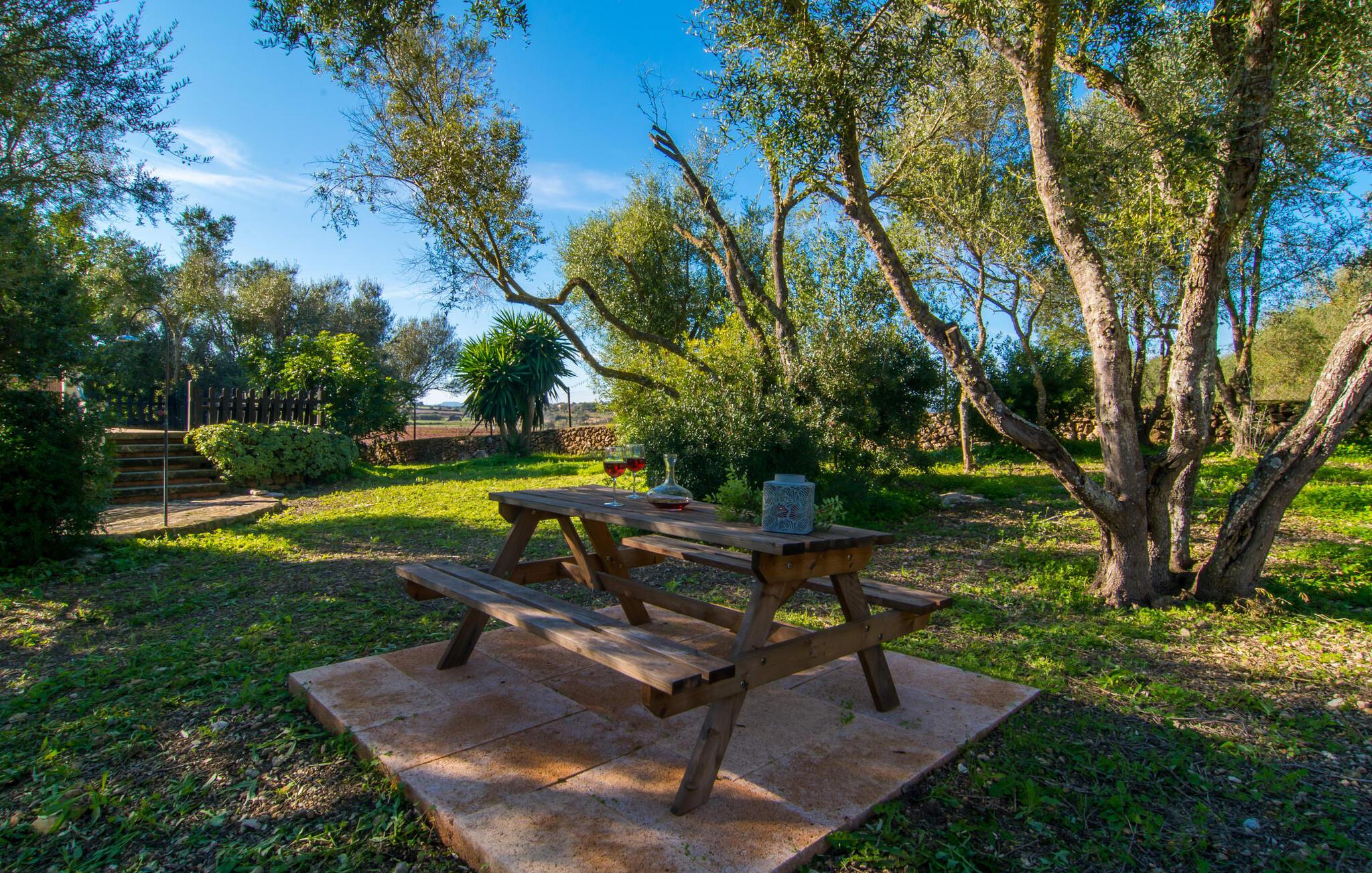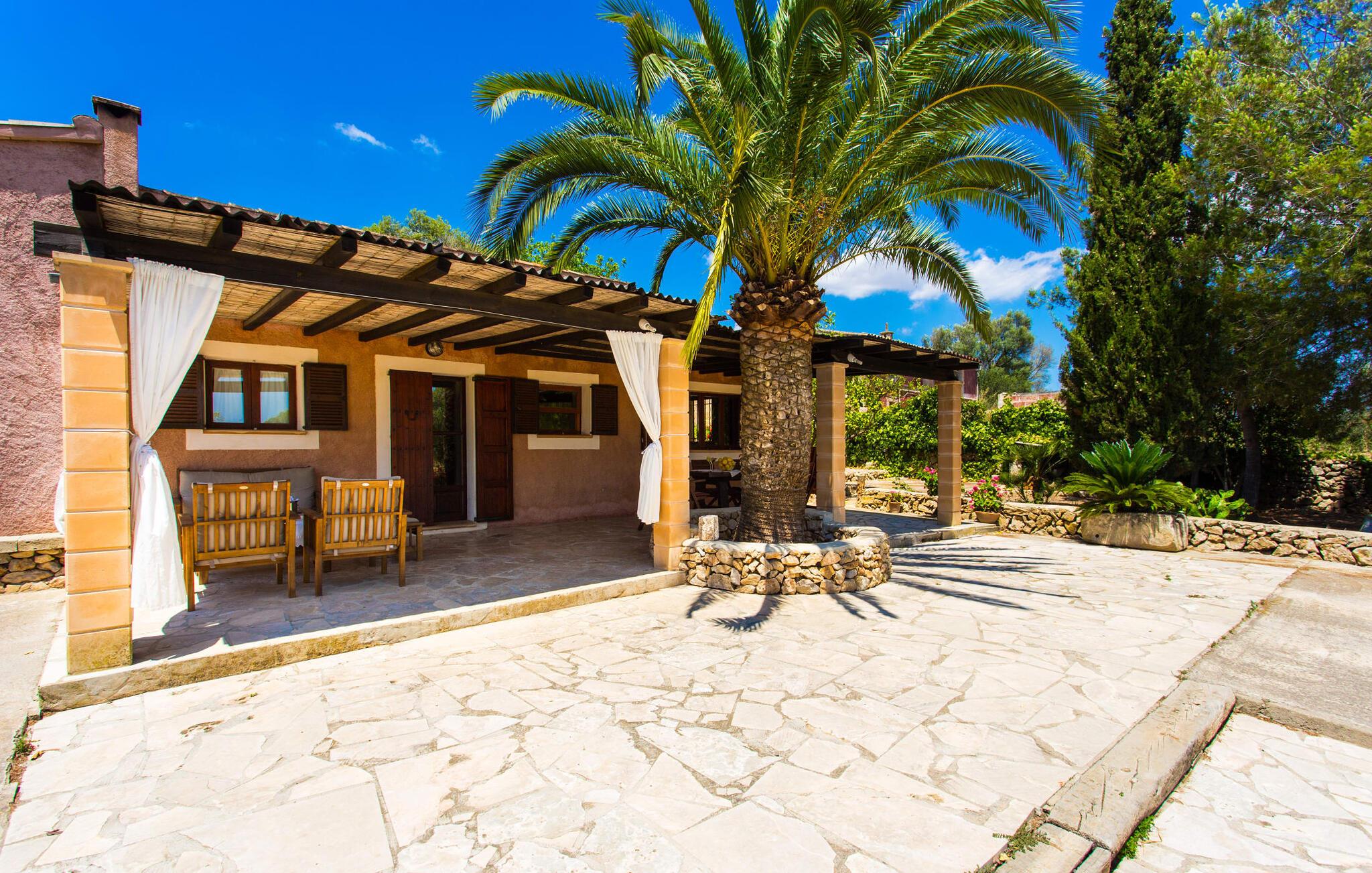 Den traditionelle villa "So Fangos" i en perfekt landlig beliggenhed lige syd for Manacor er perfekt til børn og familier. Dette kan allerede ses udefra, for eksempel ved den let hævede pool bag huset lige ved siden af et smukt, skyggefuldt skovområde med solterrasse og en lille græsplæne. Da poolområdet er indhegnet og aflåst med låge, er det sikret, at børn ikke kan lege på dette område uden opsyn. Ved poolen er der i alt seks liggestole til solbadning og to parasoller til skygge. Selve villaen er omgivet af et natursten terrasseområde omgivet af middelhavsgrønne planter. Et højt palmetræ grænser direkte op til den overdækkede terrasse langs huset. I dette område finder I et enkelt træbord med seks komfortable træstole - en fantastisk udendørs spiseplads kun få meter fra husets indgang og køkken. På den anden side af verandaen er der et loungeområde - perfekt om aftenen, når børnene er i seng, og man bare vil nyde græshoppernes kvidren og det milde klima med en sidste drink. På bagsiden af huset er der endnu en lille overdækket terrasse med siddeplads til vores folk. Det fine ved denne terrasse er, at den er direkte tilgængelig fra to af de tre soveværelser. Terrassen er desuden omgivet af en træport og kan lukkes med en dør. Der er en basketballbane til rådighed for gæsterne. Bagefter kan I tage en forfriskende svømmetur i den private pool. Den familievenlige karakter og design bekræftes også inde i villaen. Vi kan især godt lide, at villaen efter restaureringen har et stort spise-/opholds- og køkkenområde, som kombinerer alle de funktioner, som en familie bruger sammen (bortset fra de private områder i soveværelset, naturligvis) til et fælles opholdsrum. Træbordet med træstole står midt i rummet. Her er plads nok, hvilket giver rummet en rummelig følelse. Væggene er dekoreret med landbrugsredskaber, der illustrerer den oprindelige landbrugsmæssige anvendelse af denne ejendom. Til højre for spisepladsen er det åbne køkkenområde, hvor loftsbjælkerne af egetræ er synlige. Det smarte, mørke trækøkken behøver ikke at gemme sig i et lukket rum. Det fulde tekniske udstyr gør selvforplejning til jeres individuelle ferie let. Til venstre for spisepladsen, adskilt af en egetræsbue, er der en hyggelig opholdsstue malet i solgul. Sorte lædermøbler som et hyggeligt opholdsområde foran en støbejernspejs og foran det moderne LCD-tv inviterer til en hyggelig aften. Fra stuen når man master soveværelset med en 1,60 m bred dobbeltseng og en-suite badeværelse. De to andre soveværelser er i gangen, der fører væk fra spisepladsen. De to soveværelser deler badeværelse, hvor begge badeværelser er udstyret med moderne walk-in brusere. Det ene af de to soveværelser er udstyret med en 1,60 m bred dobbeltseng, det tredje soveværelse er et klassisk børneværelse med en dobbelt køjeseng, mens den nederste seng har en queen-size seng på 1,40 m. Fra disse to soveværelser er der også udgang til den lille børnesikre indhegnede terrasse. I kan starte dagen med en kop kaffe i morgensolen, inden I begynder at planlægge jeres dag og tænke over, hvor I gerne vil hen på jeres næste tur. Den fordelagtige beliggenhed i den frugtbare slette i centrum af øen, den såkaldte "Pla de Mallorca", giver den fordel, at I herfra kan opdage Mallorcas forskellige attraktioner. På grund af nærheden til vejen (som kan høres afhængig af vinden) kan I hurtigt nå Manacor på 3,5 km, hvor I ikke kun kan gøre jeres daglige indkøb, men også shoppe og slentre i en af øens største byer . Og I kan nemt nå kystbyerne som Porto Cristo, hvor I kan slentre langs promenaden og få en snack på en af caféerne og restauranterne. Et besøg i drypstenshulerne nær Artà, "Coves des Dracs", er ikke kun interessant for børn. For en dag ved havet kan I vælge mellem østkystens smukke strande, kendt som "Calas de Mallorca". Her finder I fantastiske, næsten uberørte naturstrande som Cala Varques. Sidst på dagen venter den autentiske villa "Son Fangos" sine gæster, og I kan slappe af med en svømmetur i poolen eller en grillaften og nyde samværet med jeres familie eller som par, for villaen kan lejes på et nedsat pris for to personer. Den typiske mallorcanske villa "Son Fangos" ligger lidt væk fra byen Manacor på vej til Felanitx. Gør jeres daglige indkøb hurtigt og nemt i nærliggende Manacor, hvor der også er et smukt bondemarked hver mandag. De smukke strande, herunder den ensomme og næsten uberørte naturlige bugt "Cala Varques", kan nemt nås med lejebil.