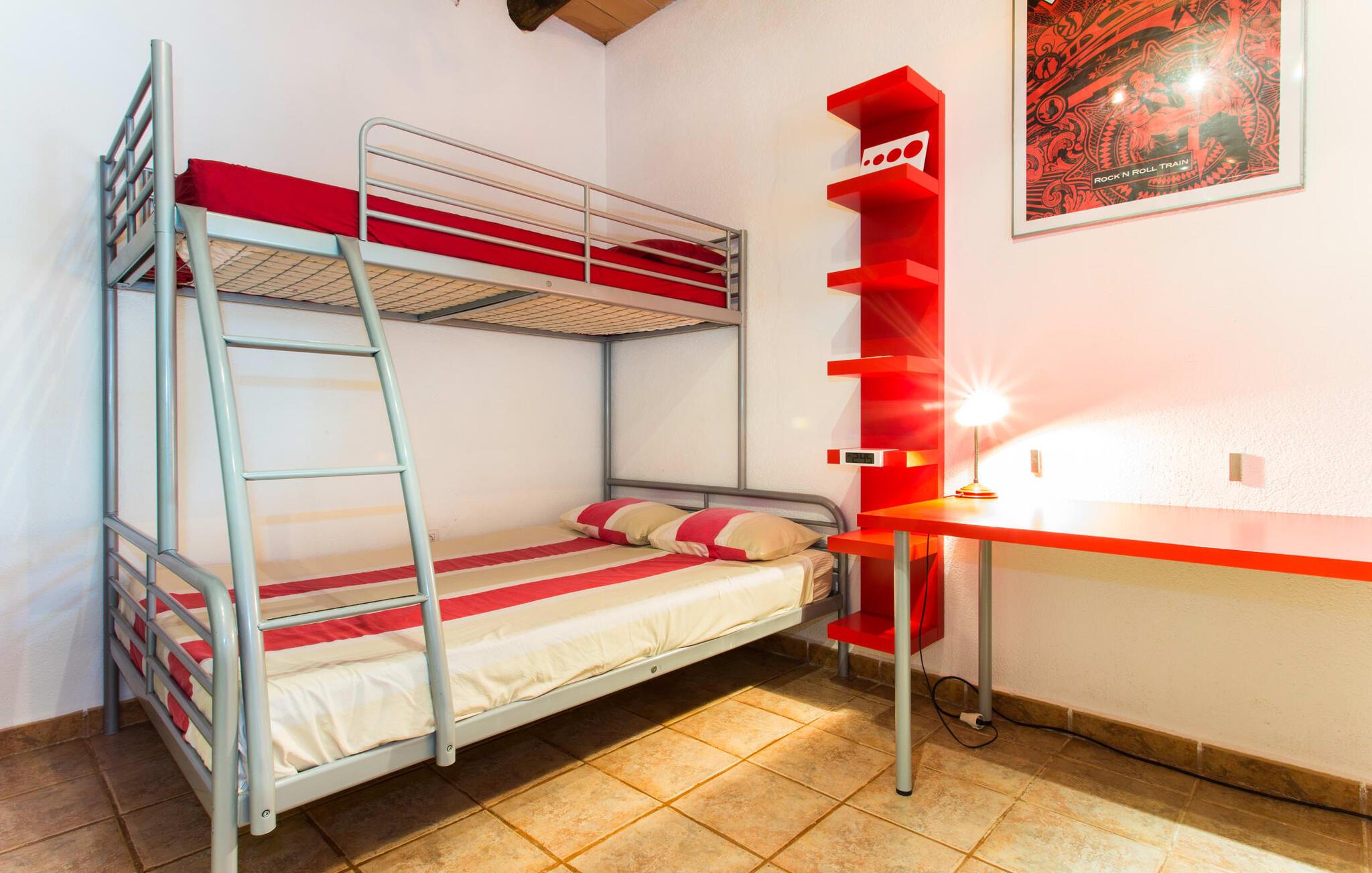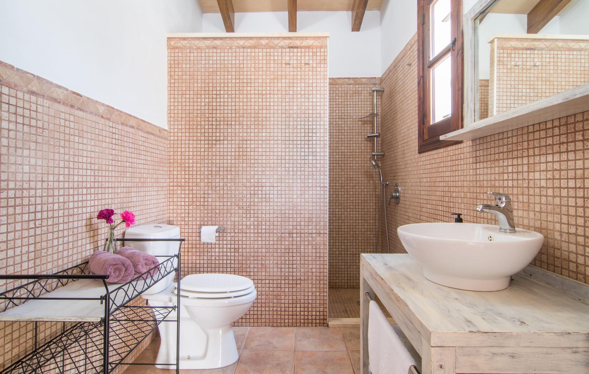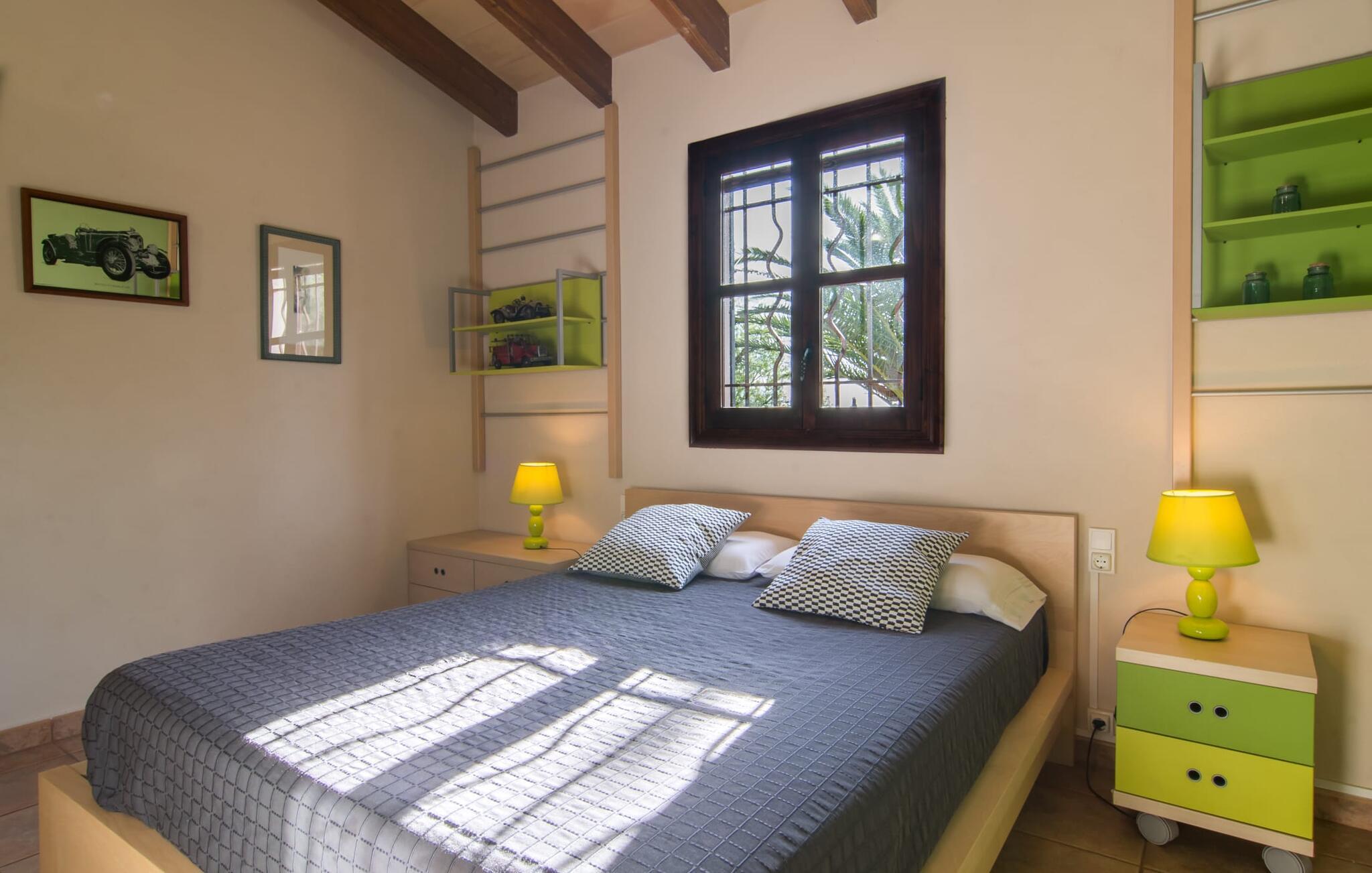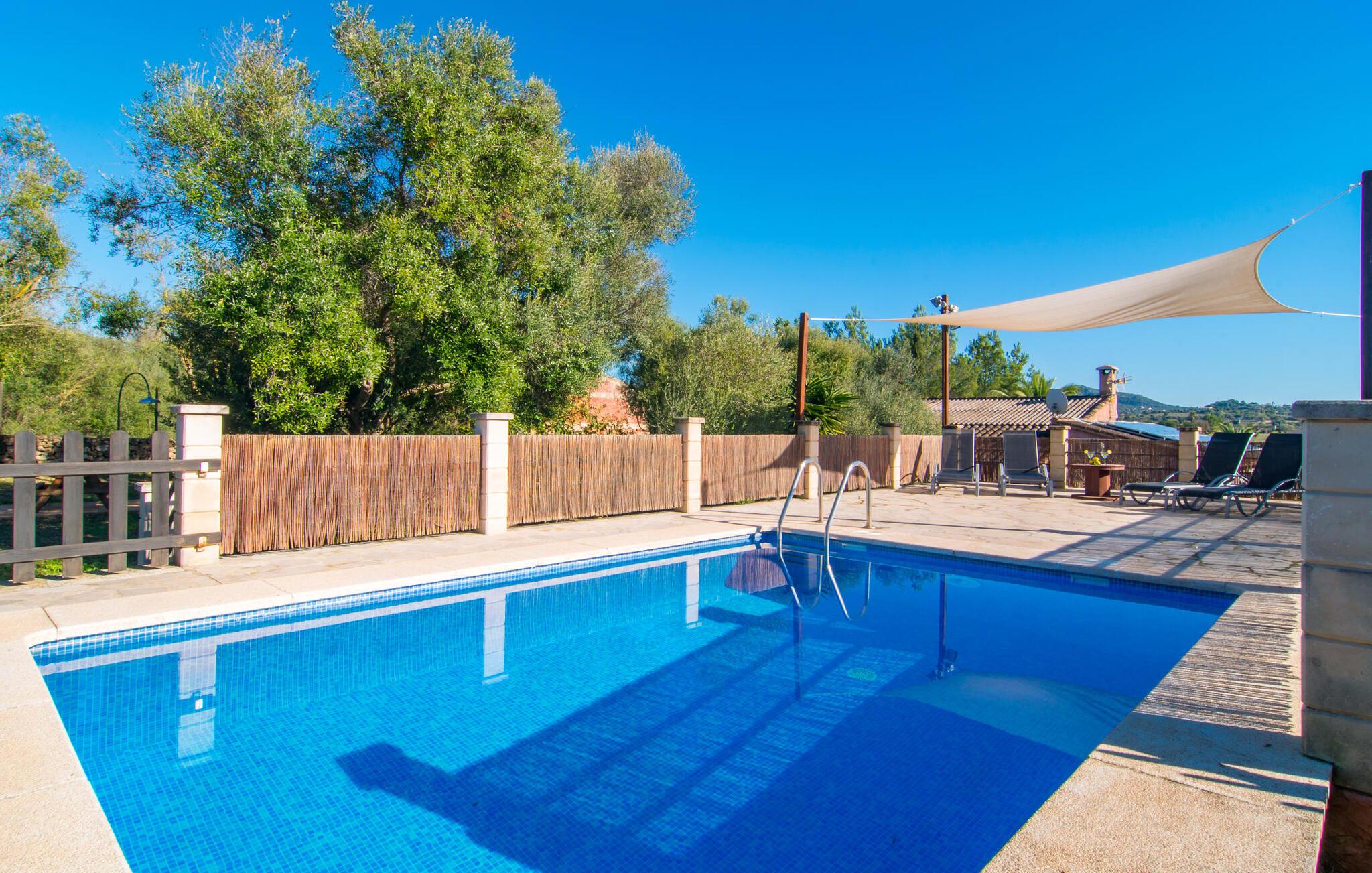 Den traditionelle villa "So Fangos" i en perfekt landlig beliggenhed lige syd for Manacor er perfekt til børn og familier. Dette kan allerede ses udefra, for eksempel ved den let hævede pool bag huset lige ved siden af et smukt, skyggefuldt skovområde med solterrasse og en lille græsplæne. Da poolområdet er indhegnet og aflåst med låge, er det sikret, at børn ikke kan lege på dette område uden opsyn. Ved poolen er der i alt seks liggestole til solbadning og to parasoller til skygge. Selve villaen er omgivet af et natursten terrasseområde omgivet af middelhavsgrønne planter. Et højt palmetræ grænser direkte op til den overdækkede terrasse langs huset. I dette område finder I et enkelt træbord med seks komfortable træstole - en fantastisk udendørs spiseplads kun få meter fra husets indgang og køkken. På den anden side af verandaen er der et loungeområde - perfekt om aftenen, når børnene er i seng, og man bare vil nyde græshoppernes kvidren og det milde klima med en sidste drink. På bagsiden af huset er der endnu en lille overdækket terrasse med siddeplads til vores folk. Det fine ved denne terrasse er, at den er direkte tilgængelig fra to af de tre soveværelser. Terrassen er desuden omgivet af en træport og kan lukkes med en dør. Der er en basketballbane til rådighed for gæsterne. Bagefter kan I tage en forfriskende svømmetur i den private pool. Den familievenlige karakter og design bekræftes også inde i villaen. Vi kan især godt lide, at villaen efter restaureringen har et stort spise-/opholds- og køkkenområde, som kombinerer alle de funktioner, som en familie bruger sammen (bortset fra de private områder i soveværelset, naturligvis) til et fælles opholdsrum. Træbordet med træstole står midt i rummet. Her er plads nok, hvilket giver rummet en rummelig følelse. Væggene er dekoreret med landbrugsredskaber, der illustrerer den oprindelige landbrugsmæssige anvendelse af denne ejendom. Til højre for spisepladsen er det åbne køkkenområde, hvor loftsbjælkerne af egetræ er synlige. Det smarte, mørke trækøkken behøver ikke at gemme sig i et lukket rum. Det fulde tekniske udstyr gør selvforplejning til jeres individuelle ferie let. Til venstre for spisepladsen, adskilt af en egetræsbue, er der en hyggelig opholdsstue malet i solgul. Sorte lædermøbler som et hyggeligt opholdsområde foran en støbejernspejs og foran det moderne LCD-tv inviterer til en hyggelig aften. Fra stuen når man master soveværelset med en 1,60 m bred dobbeltseng og en-suite badeværelse. De to andre soveværelser er i gangen, der fører væk fra spisepladsen. De to soveværelser deler badeværelse, hvor begge badeværelser er udstyret med moderne walk-in brusere. Det ene af de to soveværelser er udstyret med en 1,60 m bred dobbeltseng, det tredje soveværelse er et klassisk børneværelse med en dobbelt køjeseng, mens den nederste seng har en queen-size seng på 1,40 m. Fra disse to soveværelser er der også udgang til den lille børnesikre indhegnede terrasse. I kan starte dagen med en kop kaffe i morgensolen, inden I begynder at planlægge jeres dag og tænke over, hvor I gerne vil hen på jeres næste tur. Den fordelagtige beliggenhed i den frugtbare slette i centrum af øen, den såkaldte "Pla de Mallorca", giver den fordel, at I herfra kan opdage Mallorcas forskellige attraktioner. På grund af nærheden til vejen (som kan høres afhængig af vinden) kan I hurtigt nå Manacor på 3,5 km, hvor I ikke kun kan gøre jeres daglige indkøb, men også shoppe og slentre i en af øens største byer . Og I kan nemt nå kystbyerne som Porto Cristo, hvor I kan slentre langs promenaden og få en snack på en af caféerne og restauranterne. Et besøg i drypstenshulerne nær Artà, "Coves des Dracs", er ikke kun interessant for børn. For en dag ved havet kan I vælge mellem østkystens smukke strande, kendt som "Calas de Mallorca". Her finder I fantastiske, næsten uberørte naturstrande som Cala Varques. Sidst på dagen venter den autentiske villa "Son Fangos" sine gæster, og I kan slappe af med en svømmetur i poolen eller en grillaften og nyde samværet med jeres familie eller som par, for villaen kan lejes på et nedsat pris for to personer. Den typiske mallorcanske villa "Son Fangos" ligger lidt væk fra byen Manacor på vej til Felanitx. Gør jeres daglige indkøb hurtigt og nemt i nærliggende Manacor, hvor der også er et smukt bondemarked hver mandag. De smukke strande, herunder den ensomme og næsten uberørte naturlige bugt "Cala Varques", kan nemt nås med lejebil.