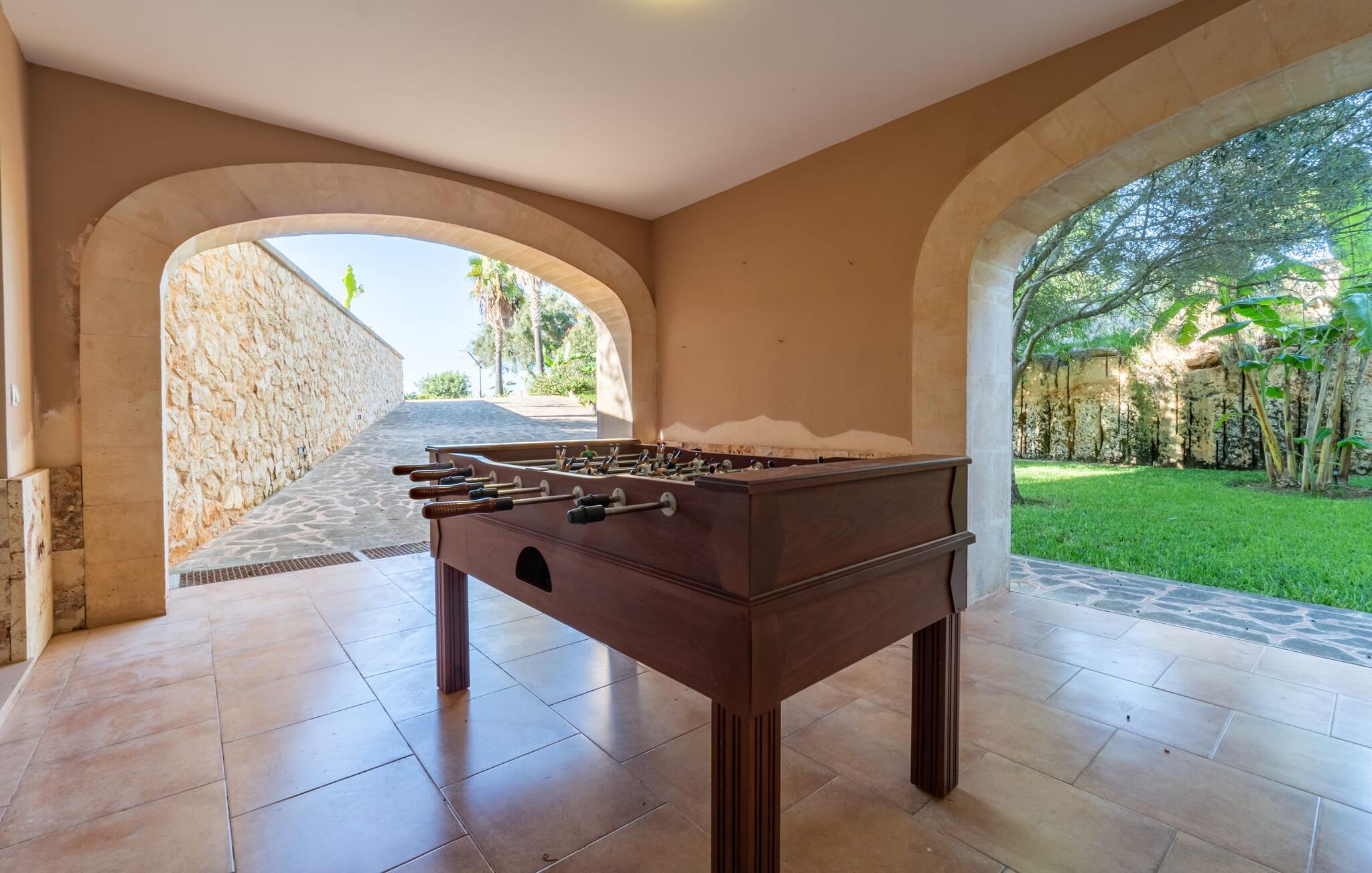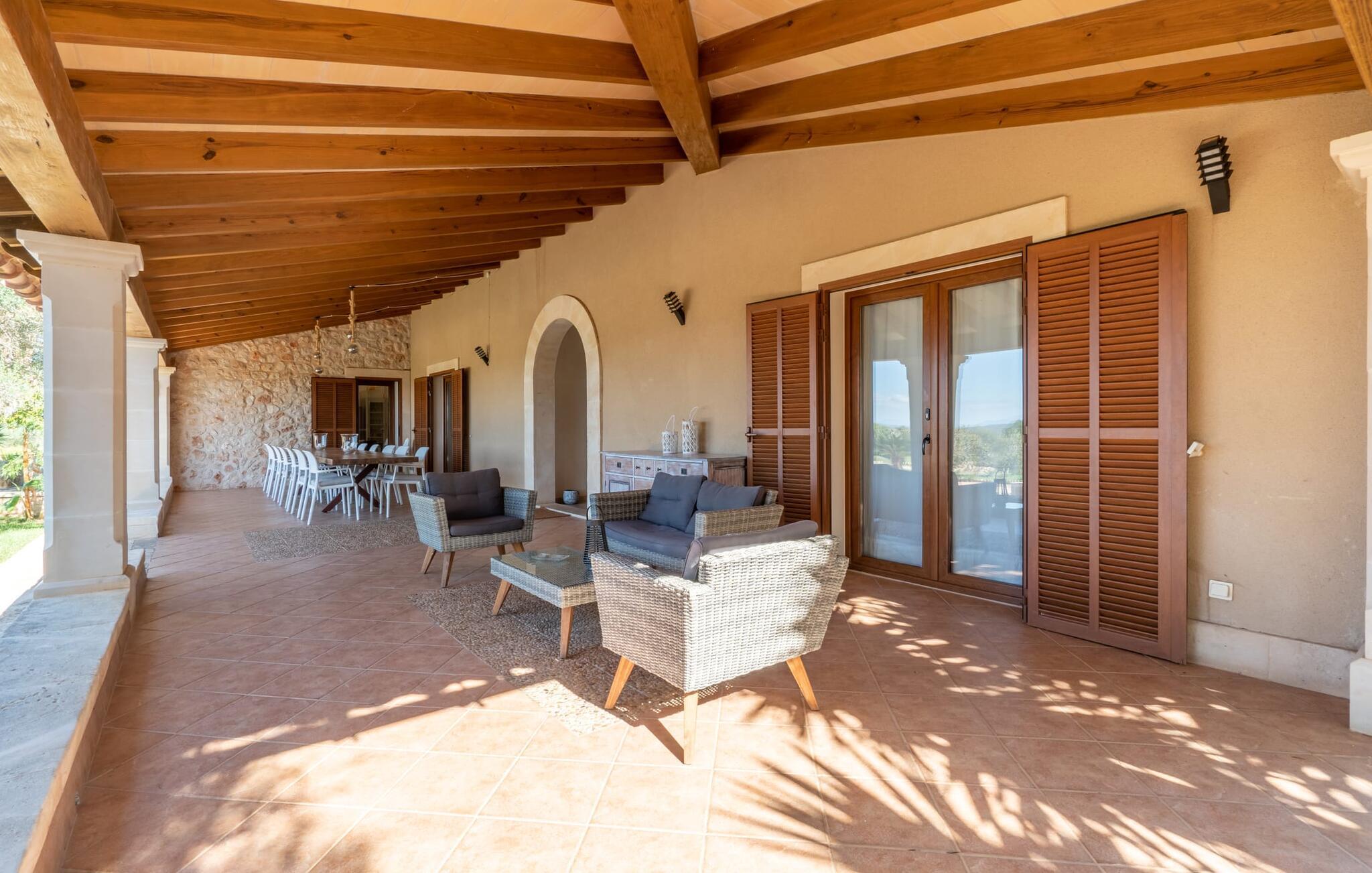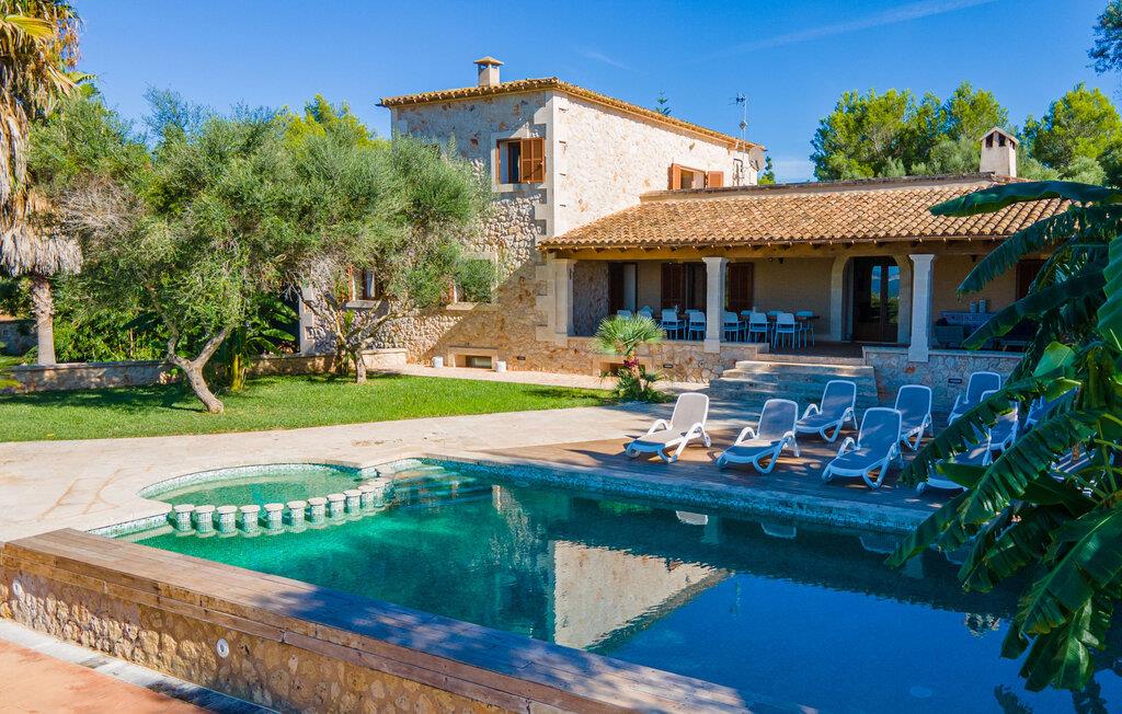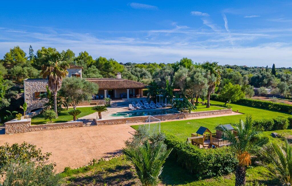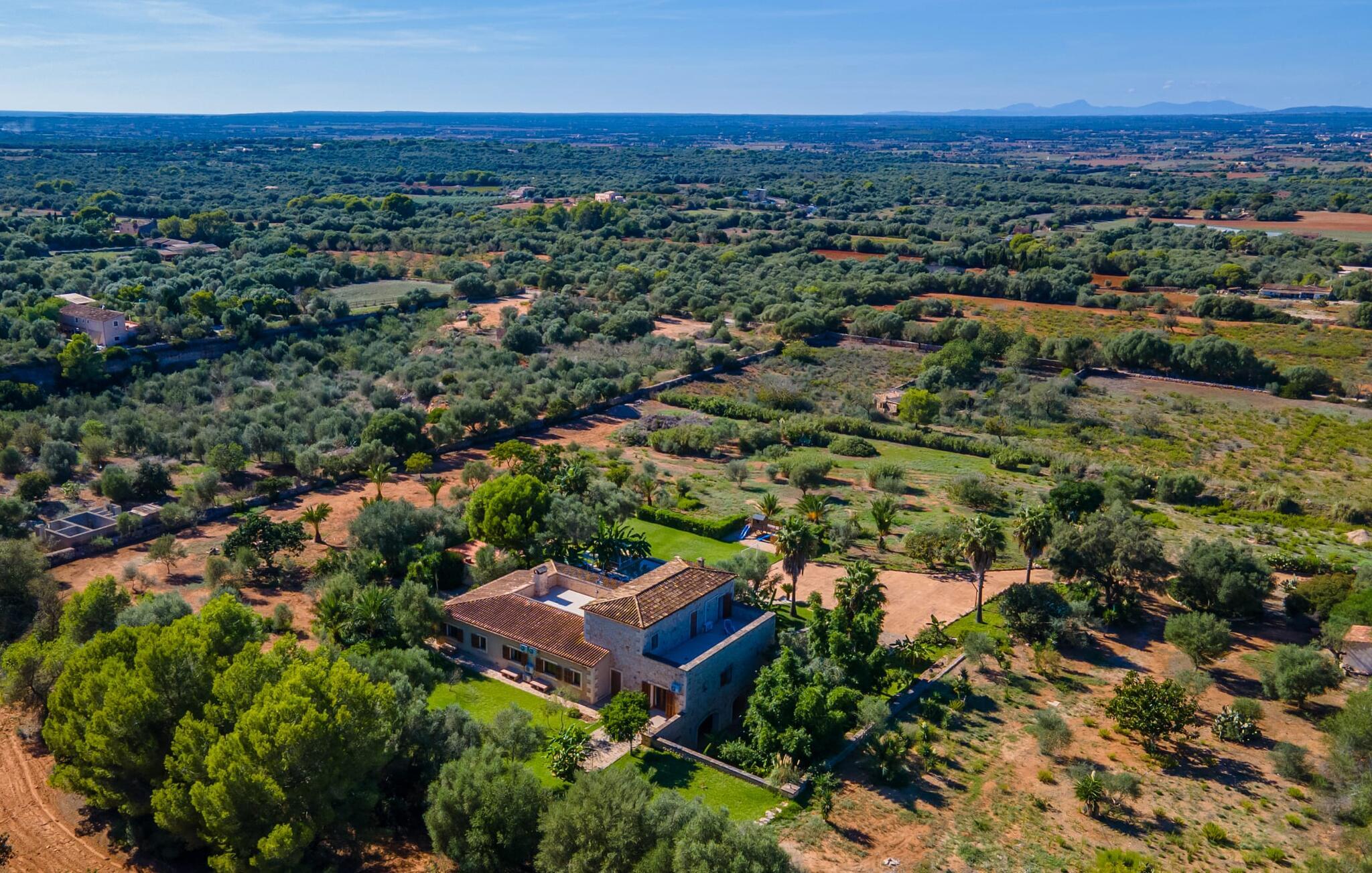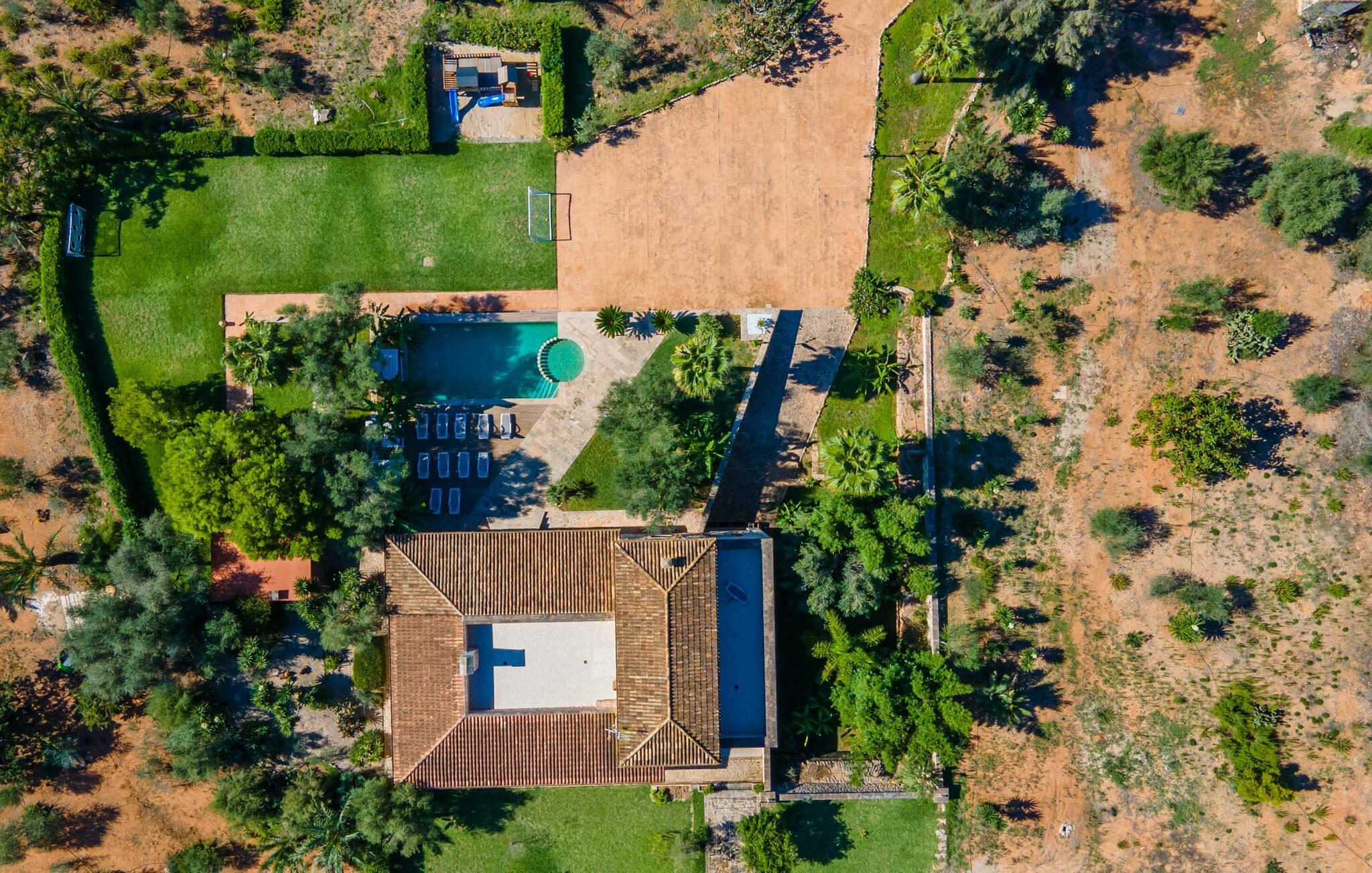 Villaen "Son Figo" har moderne møbler og en utrolig afsondret beliggenhed på en 20.000 m² stor grund med en smukt anlagt have og et fantastisk panorama over den flade del af sydøstkysten og over Plà de Mallorca til øen Tramuntana-bjergene. Naturstenshuset er designet i typisk mallorcansk stil og har flere terrasser, hvoraf nogle er overdækkede. Den største overdækkede veranda ligger foran huset og har et stort spisebord på den ene side og komfortable loungemøbler på den anden. Herfra kan I nyde den vidunderlige udsigt over ejendommen, poolen og den landlige vidde helt ud til horisonten. Pool, spabad og udendørs bruser er integreret i en terrasse lavet af natursten og træ. Der er nok parasoller og liggestole til rådighed for alle gæster. Den mere lavvandede børnepool er lidt adskilt fra resten af poolen, så børn kan svømme og plaske rundt sikkert. For at forblive aktiv er der et lille legeområde for børnene; I kan nemt holde øje med dem fra terrassen. Der er også en permanent grill til jeres rådighed for at tilberede vidunderlige friske delikatesser. Det visuelt tiltalende naturstenshus med sine 335 m² byder på plads til en stor gruppe på op til 12 personer. Opholds- og spiseområdet er lyst og åbent og har komfortable sofaer, pejs og to spiseborde. Køkkenet i træ og rustfrit stål har alle de nødvendige faciliteter. En kaffemaskine, et stort køleskab, ovn og mikroovn i behagelig højde samt opvaskemaskine - det er blot nogle få af de mange funktioner. Gennem et af de mange gulv-til-loft trævinduer er der adgang til den overdækkede terrasse for at nyde en solid morgenmad ved langbordet. Fem af soveværelserne har dobbeltsenge, mens det andet er et dobbeltværelse. Der er fem badeværelser til rådighed for i alt seks soveværelser. Hvert værelse i hele huset har individuelt klimaanlæg og kan opvarmes selv uden for sommersæsonen. Hvis I vil nyde den utrolige udsigt over landskabet fra oven, så træde ind på den store terrasse på øverste etage med udsigt over den endeløse flade af Mallorca-sletten. Hvis I leder efter en fantastisk badeferieoplevelse, så er Villa "Son Figo" det rigtige sted for jer. De smukkeste strande langs den sydøstlige kyst er kun en kort køretur væk. I kan nå strande som Cala Llombards eller Cala Santanyi med lejebil på omkring 15 minutter via den tydeligt hørbare landevej nær villaen. Det samme gør sig gældende for de kilometervis af vidunderligt sand ved Es Trenc, som er særdeles velegnet til familier på grund af dens lave stigning. Denne brede sandstrand og dens krystalklare vand sammenlignes ofte med de billedskønne strande i Caribien. Campos har alt hvad I behøver til daglig indkøb og ligger kun 10 minutters kørsel fra villaen. På et af øens smukkeste ugentlige markeder, som finder sted hver onsdag i Santanyí, omkring 7 km fra "Son Figo", finder I ikke kun frugt og grøntsager, men også håndlavede souvenirs og typiske mallorcanske delikatesser. Den familievenlige villa "Son Figo" er et storslået landsted i typisk mallorcansk stil med moderne indretning og en stor grund. Talrige strande langs Mallorcas sydkyst er nemme og hurtige at nå. De nærliggende supermarkeder i Campos tilbyder alt til jeres daglige behov. Bemærk venligst, at denne ejendom ikke accepterer ungdomsgrupper eller polterabender. En ungdomsgruppe på denne ejendom består af personer på 25 år eller derunder. Book ikke denne ejendom, hvis I er en ungdomsgruppe eller en polterabendgruppe, da jeres reservation vil blive afvist, når den er booket, hvilket også kan være tilfældet ved ankomst til ejendommen eller under jeres ophold, og I vil ikke modtage en refusion.