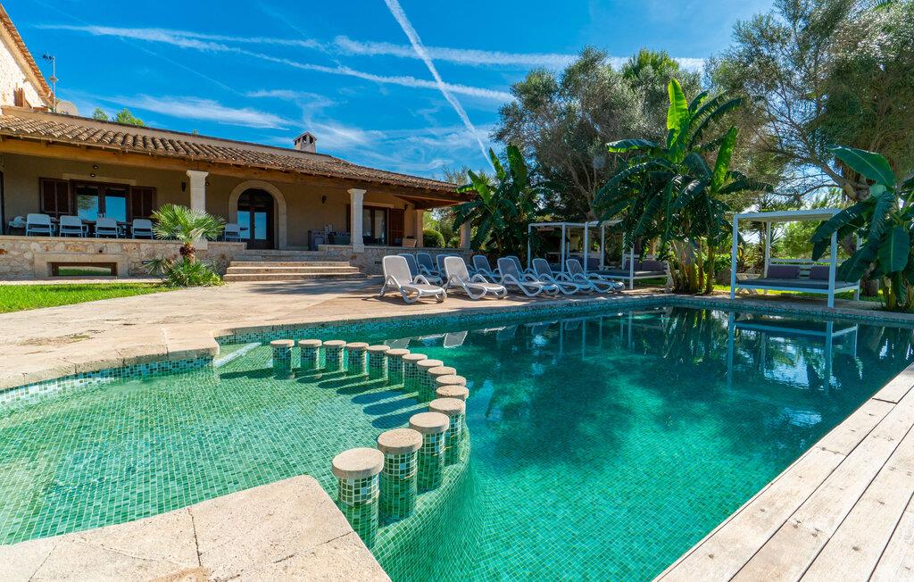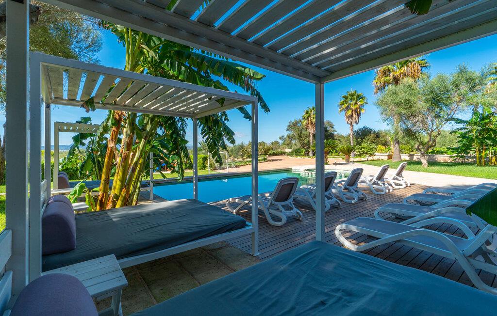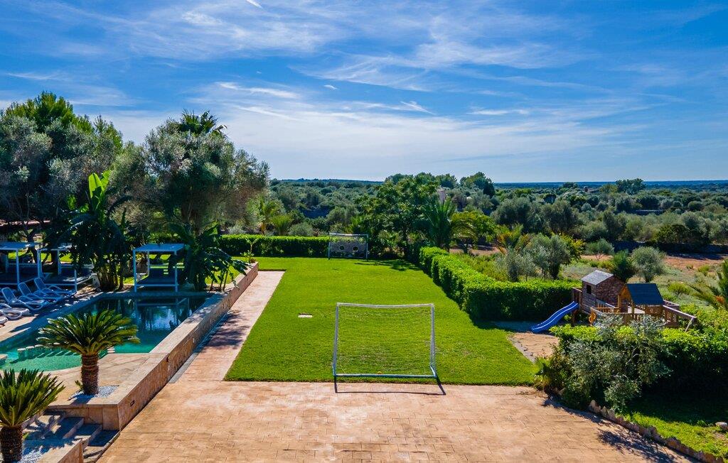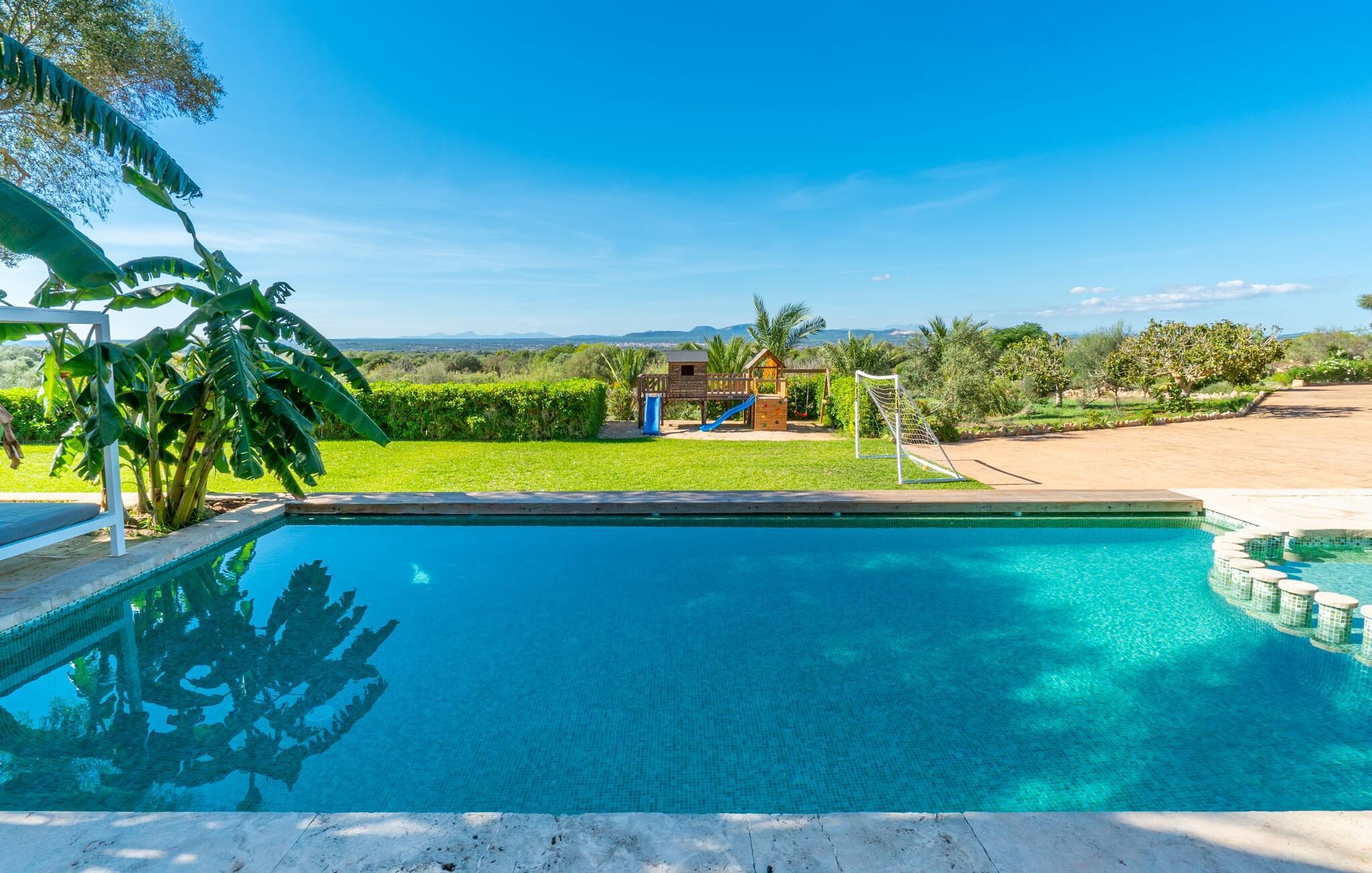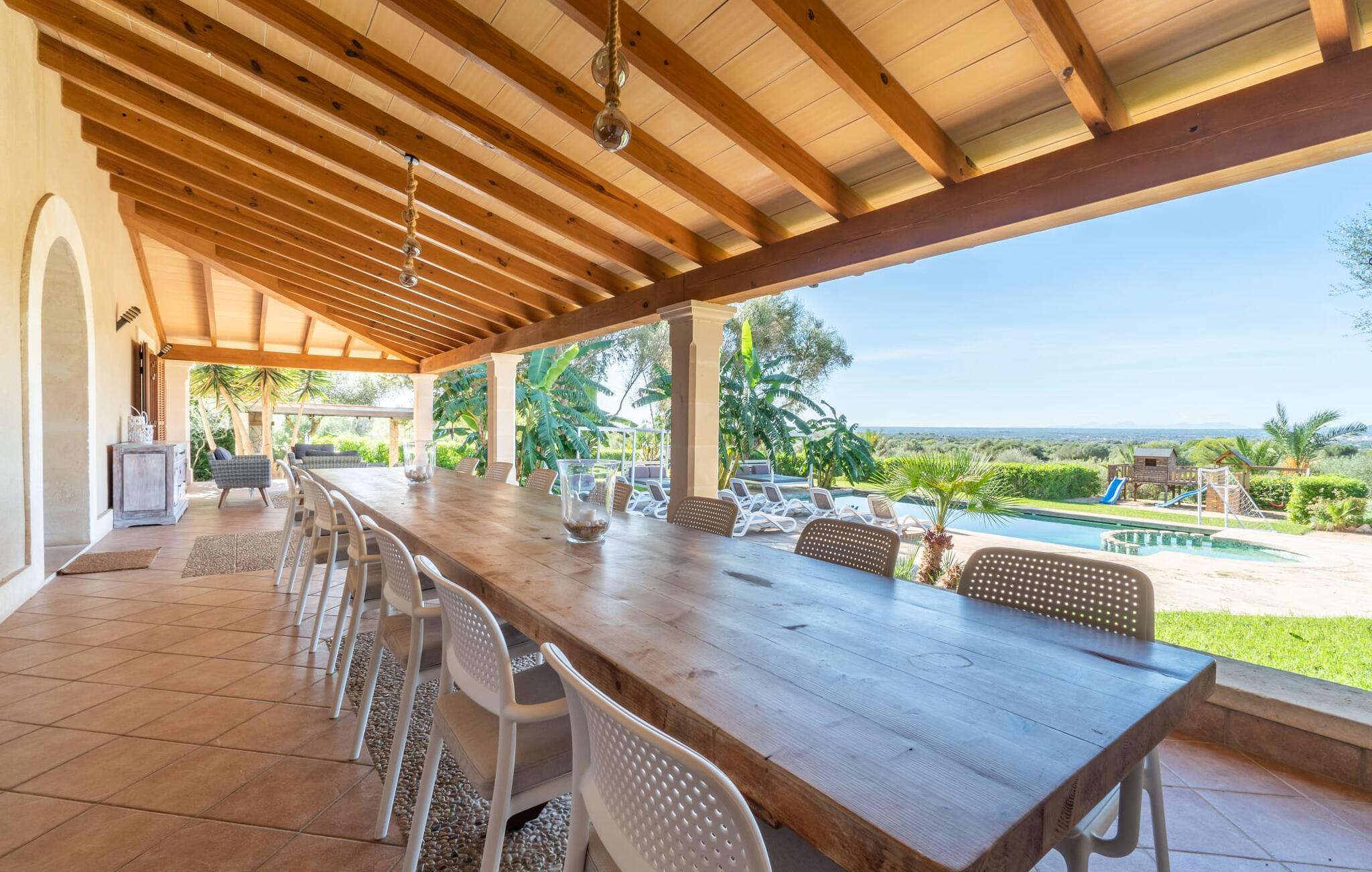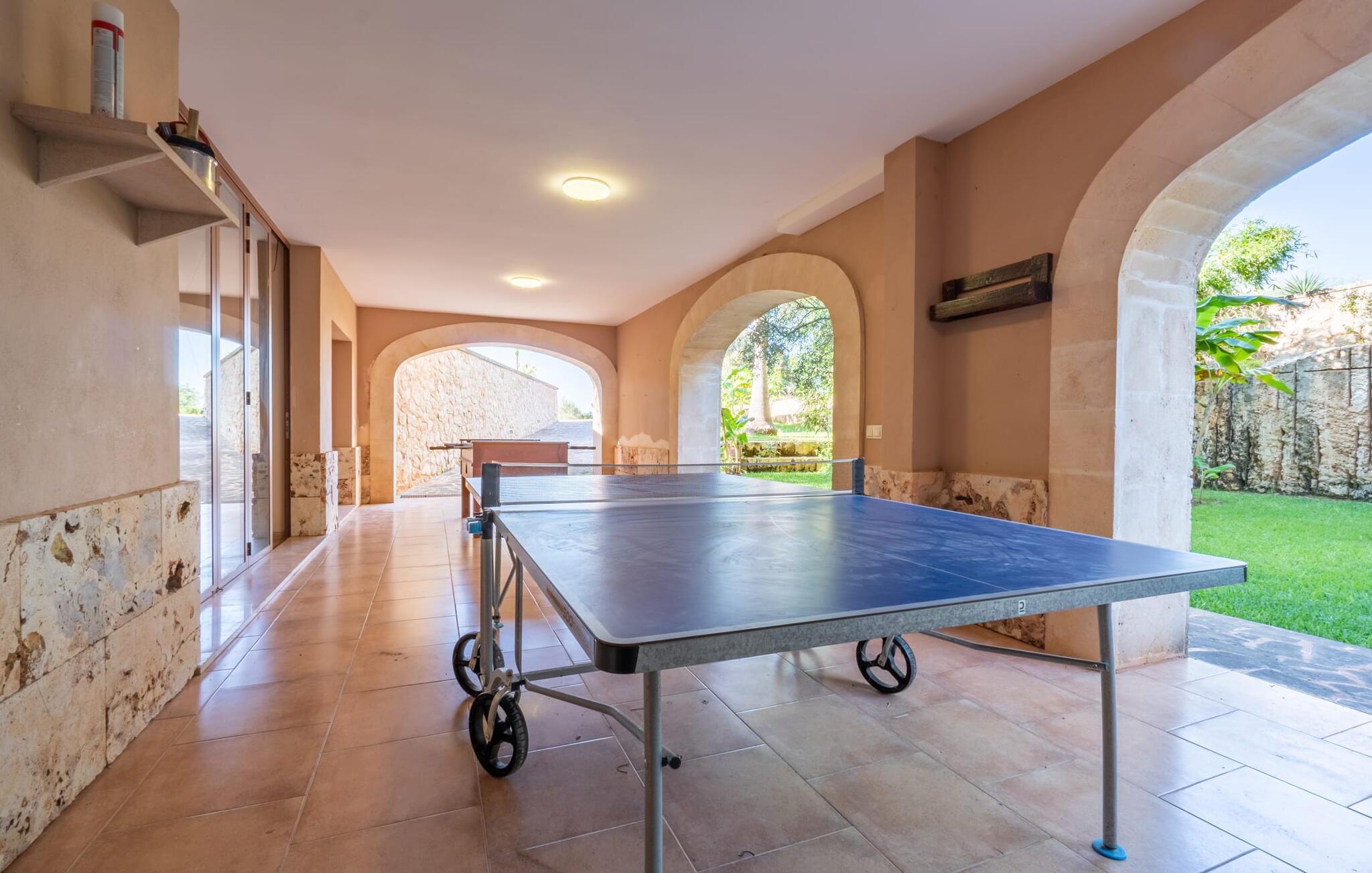 Villaen "Son Figo" har moderne møbler og en utrolig afsondret beliggenhed på en 20.000 m² stor grund med en smukt anlagt have og et fantastisk panorama over den flade del af sydøstkysten og over Plà de Mallorca til øen Tramuntana-bjergene. Naturstenshuset er designet i typisk mallorcansk stil og har flere terrasser, hvoraf nogle er overdækkede. Den største overdækkede veranda ligger foran huset og har et stort spisebord på den ene side og komfortable loungemøbler på den anden. Herfra kan I nyde den vidunderlige udsigt over ejendommen, poolen og den landlige vidde helt ud til horisonten. Pool, spabad og udendørs bruser er integreret i en terrasse lavet af natursten og træ. Der er nok parasoller og liggestole til rådighed for alle gæster. Den mere lavvandede børnepool er lidt adskilt fra resten af poolen, så børn kan svømme og plaske rundt sikkert. For at forblive aktiv er der et lille legeområde for børnene; I kan nemt holde øje med dem fra terrassen. Der er også en permanent grill til jeres rådighed for at tilberede vidunderlige friske delikatesser. Det visuelt tiltalende naturstenshus med sine 335 m² byder på plads til en stor gruppe på op til 12 personer. Opholds- og spiseområdet er lyst og åbent og har komfortable sofaer, pejs og to spiseborde. Køkkenet i træ og rustfrit stål har alle de nødvendige faciliteter. En kaffemaskine, et stort køleskab, ovn og mikroovn i behagelig højde samt opvaskemaskine - det er blot nogle få af de mange funktioner. Gennem et af de mange gulv-til-loft trævinduer er der adgang til den overdækkede terrasse for at nyde en solid morgenmad ved langbordet. Fem af soveværelserne har dobbeltsenge, mens det andet er et dobbeltværelse. Der er fem badeværelser til rådighed for i alt seks soveværelser. Hvert værelse i hele huset har individuelt klimaanlæg og kan opvarmes selv uden for sommersæsonen. Hvis I vil nyde den utrolige udsigt over landskabet fra oven, så træde ind på den store terrasse på øverste etage med udsigt over den endeløse flade af Mallorca-sletten. Hvis I leder efter en fantastisk badeferieoplevelse, så er Villa "Son Figo" det rigtige sted for jer. De smukkeste strande langs den sydøstlige kyst er kun en kort køretur væk. I kan nå strande som Cala Llombards eller Cala Santanyi med lejebil på omkring 15 minutter via den tydeligt hørbare landevej nær villaen. Det samme gør sig gældende for de kilometervis af vidunderligt sand ved Es Trenc, som er særdeles velegnet til familier på grund af dens lave stigning. Denne brede sandstrand og dens krystalklare vand sammenlignes ofte med de billedskønne strande i Caribien. Campos har alt hvad I behøver til daglig indkøb og ligger kun 10 minutters kørsel fra villaen. På et af øens smukkeste ugentlige markeder, som finder sted hver onsdag i Santanyí, omkring 7 km fra "Son Figo", finder I ikke kun frugt og grøntsager, men også håndlavede souvenirs og typiske mallorcanske delikatesser. Den familievenlige villa "Son Figo" er et storslået landsted i typisk mallorcansk stil med moderne indretning og en stor grund. Talrige strande langs Mallorcas sydkyst er nemme og hurtige at nå. De nærliggende supermarkeder i Campos tilbyder alt til jeres daglige behov. Bemærk venligst, at denne ejendom ikke accepterer ungdomsgrupper eller polterabender. En ungdomsgruppe på denne ejendom består af personer på 25 år eller derunder. Book ikke denne ejendom, hvis I er en ungdomsgruppe eller en polterabendgruppe, da jeres reservation vil blive afvist, når den er booket, hvilket også kan være tilfældet ved ankomst til ejendommen eller under jeres ophold, og I vil ikke modtage en refusion.