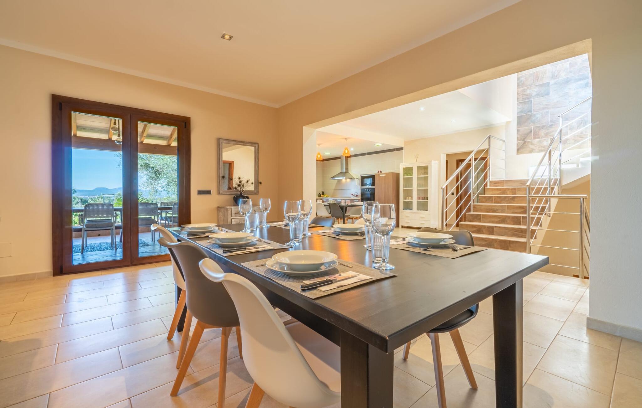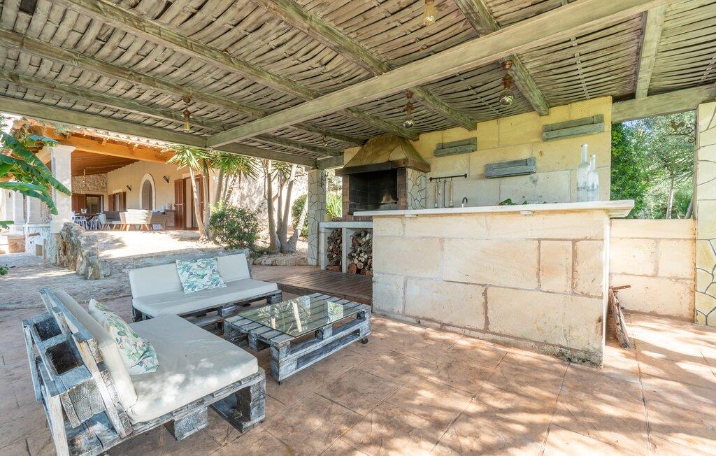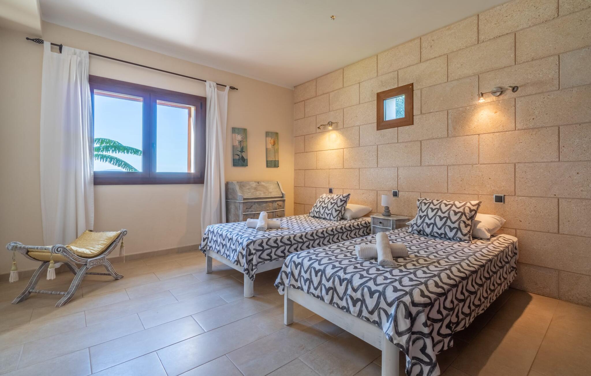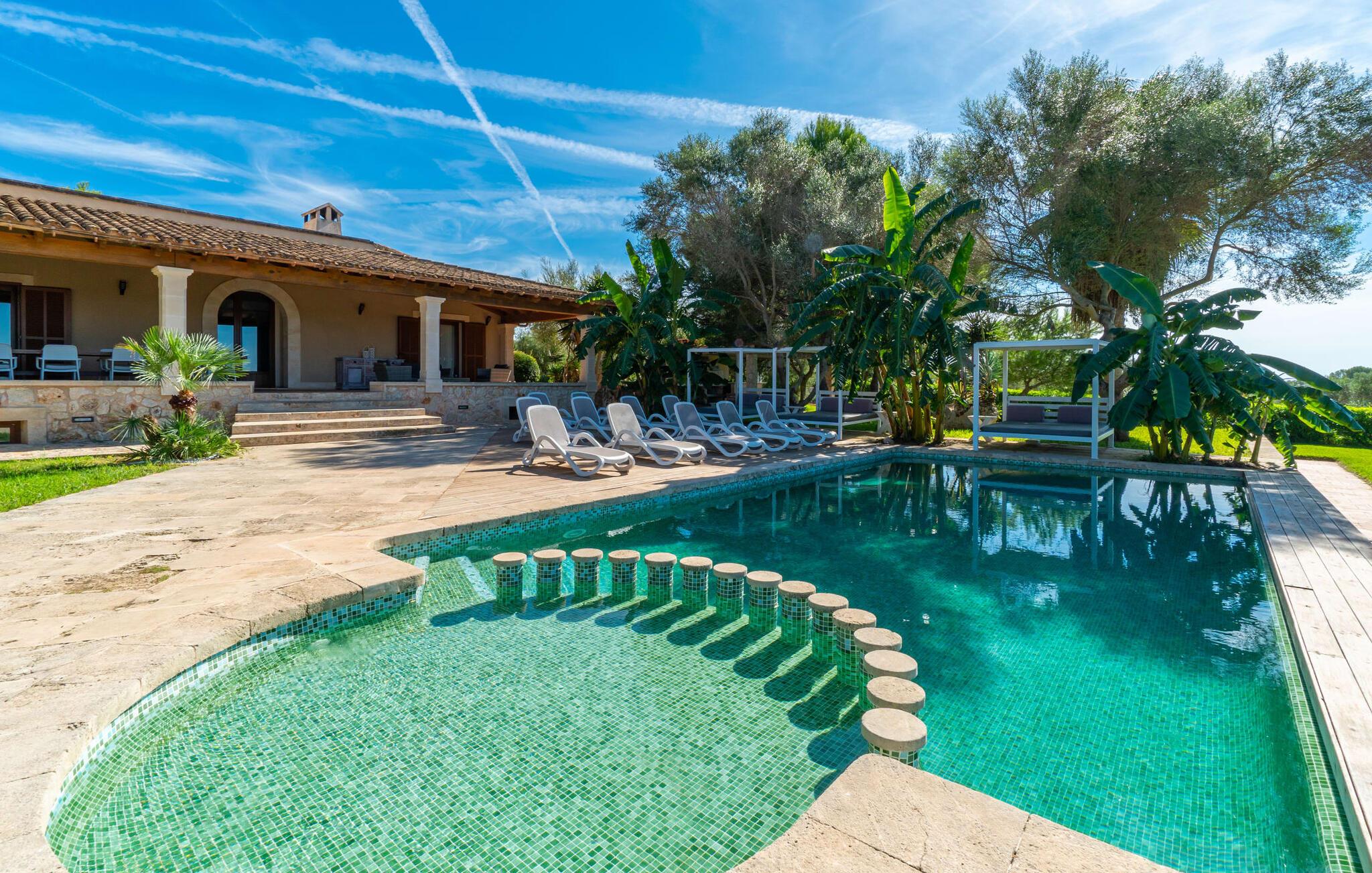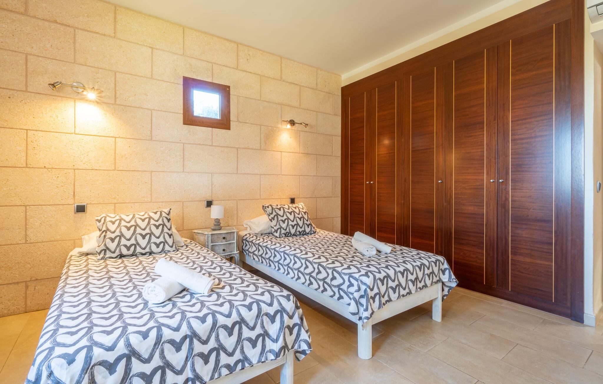 Villaen "Son Figo" har moderne møbler og en utrolig afsondret beliggenhed på en 20.000 m² stor grund med en smukt anlagt have og et fantastisk panorama over den flade del af sydøstkysten og over Plà de Mallorca til øen Tramuntana-bjergene. Naturstenshuset er designet i typisk mallorcansk stil og har flere terrasser, hvoraf nogle er overdækkede. Den største overdækkede veranda ligger foran huset og har et stort spisebord på den ene side og komfortable loungemøbler på den anden. Herfra kan I nyde den vidunderlige udsigt over ejendommen, poolen og den landlige vidde helt ud til horisonten. Pool, spabad og udendørs bruser er integreret i en terrasse lavet af natursten og træ. Der er nok parasoller og liggestole til rådighed for alle gæster. Den mere lavvandede børnepool er lidt adskilt fra resten af poolen, så børn kan svømme og plaske rundt sikkert. For at forblive aktiv er der et lille legeområde for børnene; I kan nemt holde øje med dem fra terrassen. Der er også en permanent grill til jeres rådighed for at tilberede vidunderlige friske delikatesser. Det visuelt tiltalende naturstenshus med sine 335 m² byder på plads til en stor gruppe på op til 12 personer. Opholds- og spiseområdet er lyst og åbent og har komfortable sofaer, pejs og to spiseborde. Køkkenet i træ og rustfrit stål har alle de nødvendige faciliteter. En kaffemaskine, et stort køleskab, ovn og mikroovn i behagelig højde samt opvaskemaskine - det er blot nogle få af de mange funktioner. Gennem et af de mange gulv-til-loft trævinduer er der adgang til den overdækkede terrasse for at nyde en solid morgenmad ved langbordet. Fem af soveværelserne har dobbeltsenge, mens det andet er et dobbeltværelse. Der er fem badeværelser til rådighed for i alt seks soveværelser. Hvert værelse i hele huset har individuelt klimaanlæg og kan opvarmes selv uden for sommersæsonen. Hvis I vil nyde den utrolige udsigt over landskabet fra oven, så træde ind på den store terrasse på øverste etage med udsigt over den endeløse flade af Mallorca-sletten. Hvis I leder efter en fantastisk badeferieoplevelse, så er Villa "Son Figo" det rigtige sted for jer. De smukkeste strande langs den sydøstlige kyst er kun en kort køretur væk. I kan nå strande som Cala Llombards eller Cala Santanyi med lejebil på omkring 15 minutter via den tydeligt hørbare landevej nær villaen. Det samme gør sig gældende for de kilometervis af vidunderligt sand ved Es Trenc, som er særdeles velegnet til familier på grund af dens lave stigning. Denne brede sandstrand og dens krystalklare vand sammenlignes ofte med de billedskønne strande i Caribien. Campos har alt hvad I behøver til daglig indkøb og ligger kun 10 minutters kørsel fra villaen. På et af øens smukkeste ugentlige markeder, som finder sted hver onsdag i Santanyí, omkring 7 km fra "Son Figo", finder I ikke kun frugt og grøntsager, men også håndlavede souvenirs og typiske mallorcanske delikatesser. Den familievenlige villa "Son Figo" er et storslået landsted i typisk mallorcansk stil med moderne indretning og en stor grund. Talrige strande langs Mallorcas sydkyst er nemme og hurtige at nå. De nærliggende supermarkeder i Campos tilbyder alt til jeres daglige behov. Bemærk venligst, at denne ejendom ikke accepterer ungdomsgrupper eller polterabender. En ungdomsgruppe på denne ejendom består af personer på 25 år eller derunder. Book ikke denne ejendom, hvis I er en ungdomsgruppe eller en polterabendgruppe, da jeres reservation vil blive afvist, når den er booket, hvilket også kan være tilfældet ved ankomst til ejendommen eller under jeres ophold, og I vil ikke modtage en refusion.