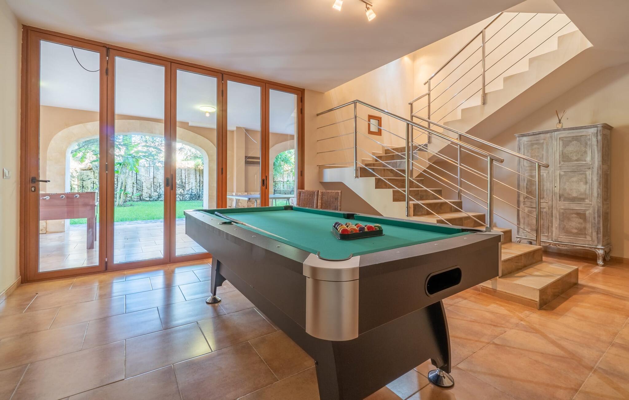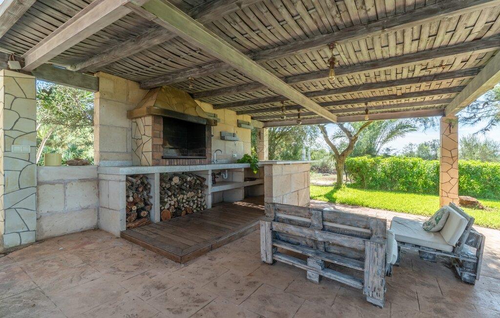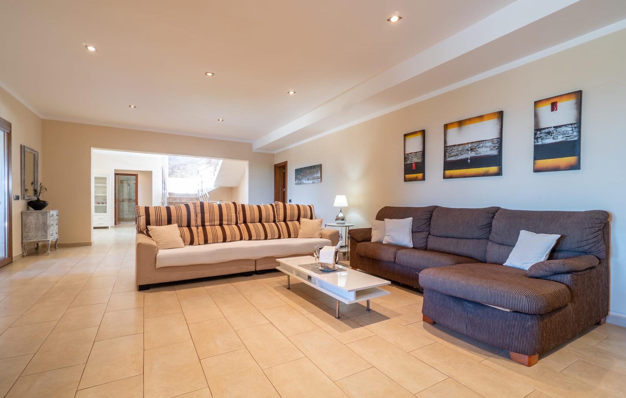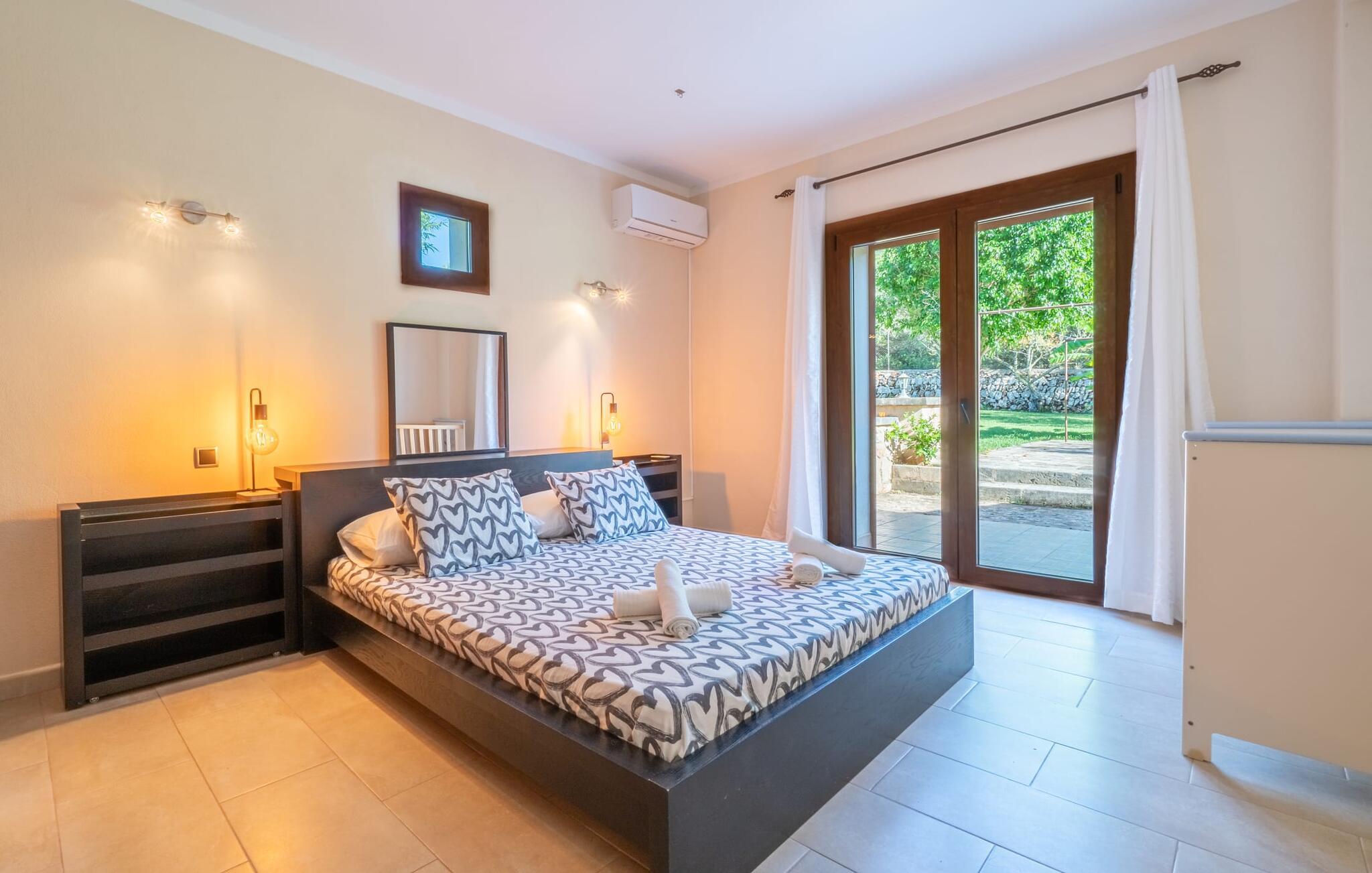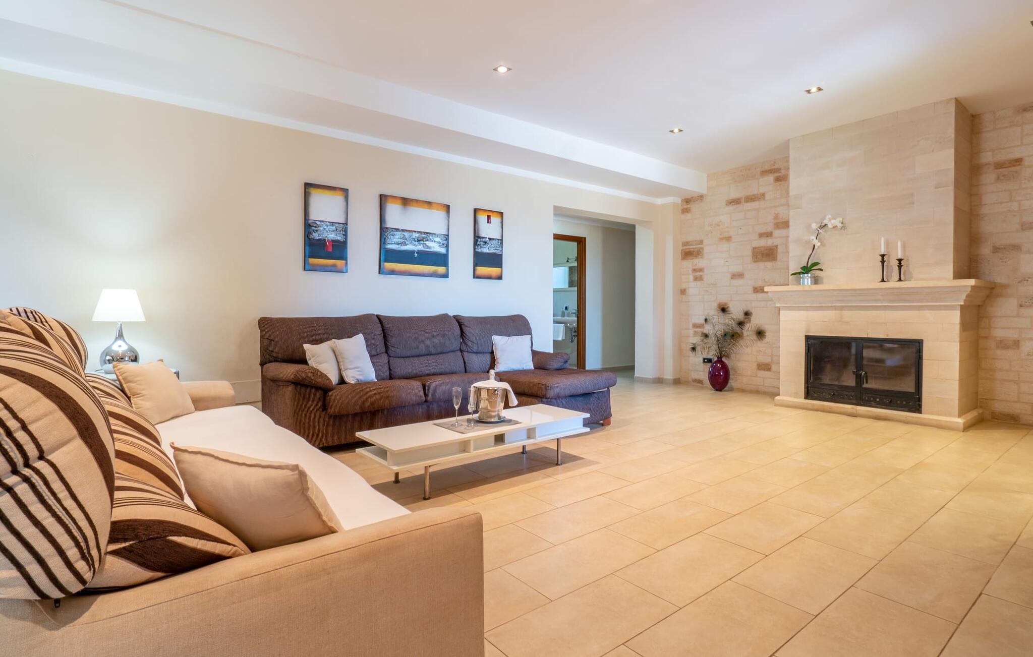Villaen "Son Figo" har moderne møbler og en utrolig afsondret beliggenhed på en 20.000 m² stor grund med en smukt anlagt have og et fantastisk panorama over den flade del af sydøstkysten og over Plà de Mallorca til øen Tramuntana-bjergene. Naturstenshuset er designet i typisk mallorcansk stil og har flere terrasser, hvoraf nogle er overdækkede. Den største overdækkede veranda ligger foran huset og har et stort spisebord på den ene side og komfortable loungemøbler på den anden. Herfra kan I nyde den vidunderlige udsigt over ejendommen, poolen og den landlige vidde helt ud til horisonten. Pool, spabad og udendørs bruser er integreret i en terrasse lavet af natursten og træ. Der er nok parasoller og liggestole til rådighed for alle gæster. Den mere lavvandede børnepool er lidt adskilt fra resten af poolen, så børn kan svømme og plaske rundt sikkert. For at forblive aktiv er der et lille legeområde for børnene; I kan nemt holde øje med dem fra terrassen. Der er også en permanent grill til jeres rådighed for at tilberede vidunderlige friske delikatesser. Det visuelt tiltalende naturstenshus med sine 335 m² byder på plads til en stor gruppe på op til 12 personer. Opholds- og spiseområdet er lyst og åbent og har komfortable sofaer, pejs og to spiseborde. Køkkenet i træ og rustfrit stål har alle de nødvendige faciliteter. En kaffemaskine, et stort køleskab, ovn og mikroovn i behagelig højde samt opvaskemaskine - det er blot nogle få af de mange funktioner. Gennem et af de mange gulv-til-loft trævinduer er der adgang til den overdækkede terrasse for at nyde en solid morgenmad ved langbordet. Fem af soveværelserne har dobbeltsenge, mens det andet er et dobbeltværelse. Der er fem badeværelser til rådighed for i alt seks soveværelser. Hvert værelse i hele huset har individuelt klimaanlæg og kan opvarmes selv uden for sommersæsonen. Hvis I vil nyde den utrolige udsigt over landskabet fra oven, så træde ind på den store terrasse på øverste etage med udsigt over den endeløse flade af Mallorca-sletten. Hvis I leder efter en fantastisk badeferieoplevelse, så er Villa "Son Figo" det rigtige sted for jer. De smukkeste strande langs den sydøstlige kyst er kun en kort køretur væk. I kan nå strande som Cala Llombards eller Cala Santanyi med lejebil på omkring 15 minutter via den tydeligt hørbare landevej nær villaen. Det samme gør sig gældende for de kilometervis af vidunderligt sand ved Es Trenc, som er særdeles velegnet til familier på grund af dens lave stigning. Denne brede sandstrand og dens krystalklare vand sammenlignes ofte med de billedskønne strande i Caribien. Campos har alt hvad I behøver til daglig indkøb og ligger kun 10 minutters kørsel fra villaen. På et af øens smukkeste ugentlige markeder, som finder sted hver onsdag i Santanyí, omkring 7 km fra "Son Figo", finder I ikke kun frugt og grøntsager, men også håndlavede souvenirs og typiske mallorcanske delikatesser. Den familievenlige villa "Son Figo" er et storslået landsted i typisk mallorcansk stil med moderne indretning og en stor grund. Talrige strande langs Mallorcas sydkyst er nemme og hurtige at nå. De nærliggende supermarkeder i Campos tilbyder alt til jeres daglige behov. Bemærk venligst, at denne ejendom ikke accepterer ungdomsgrupper eller polterabender. En ungdomsgruppe på denne ejendom består af personer på 25 år eller derunder. Book ikke denne ejendom, hvis I er en ungdomsgruppe eller en polterabendgruppe, da jeres reservation vil blive afvist, når den er booket, hvilket også kan være tilfældet ved ankomst til ejendommen eller under jeres ophold, og I vil ikke modtage en refusion.