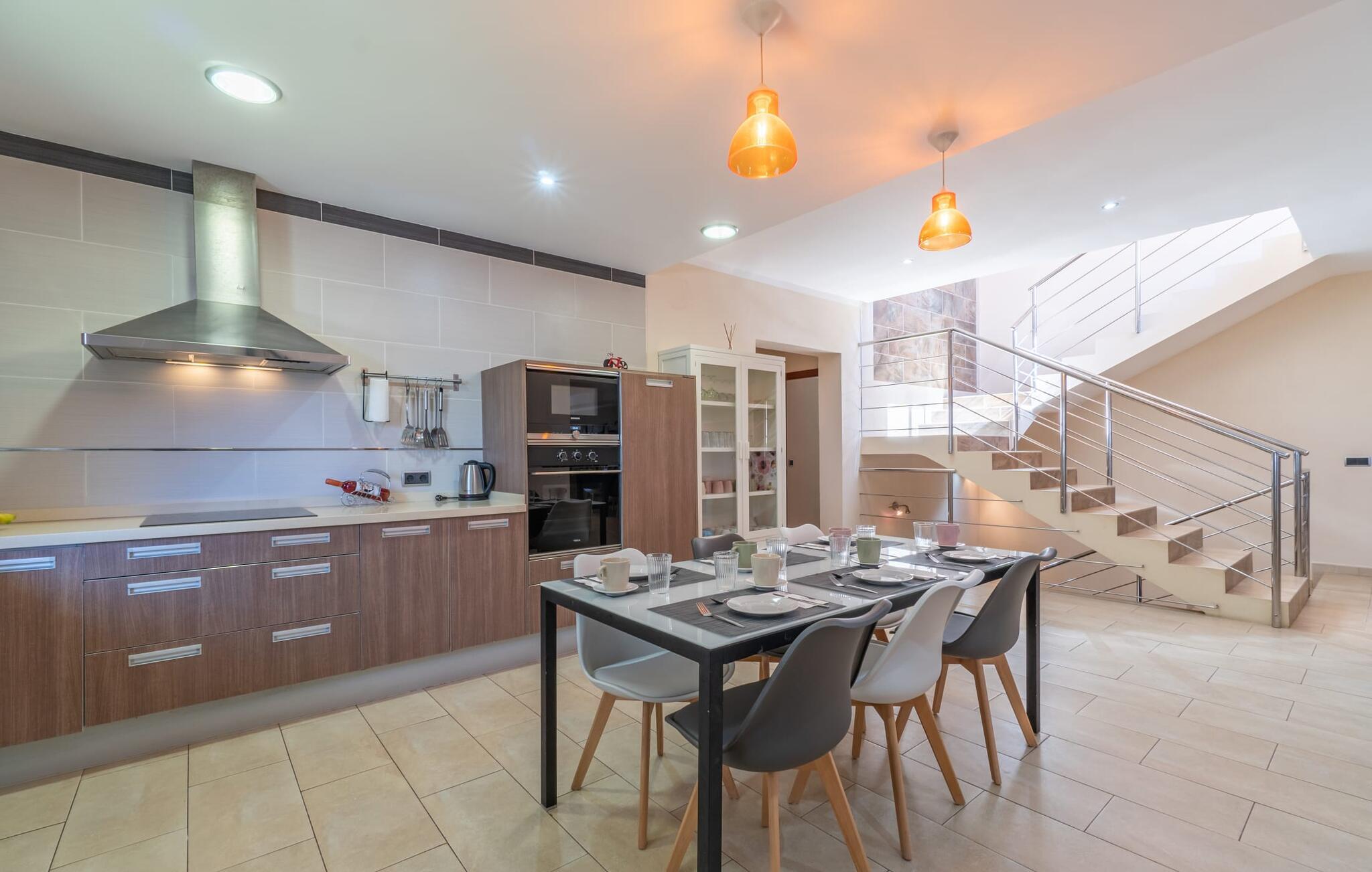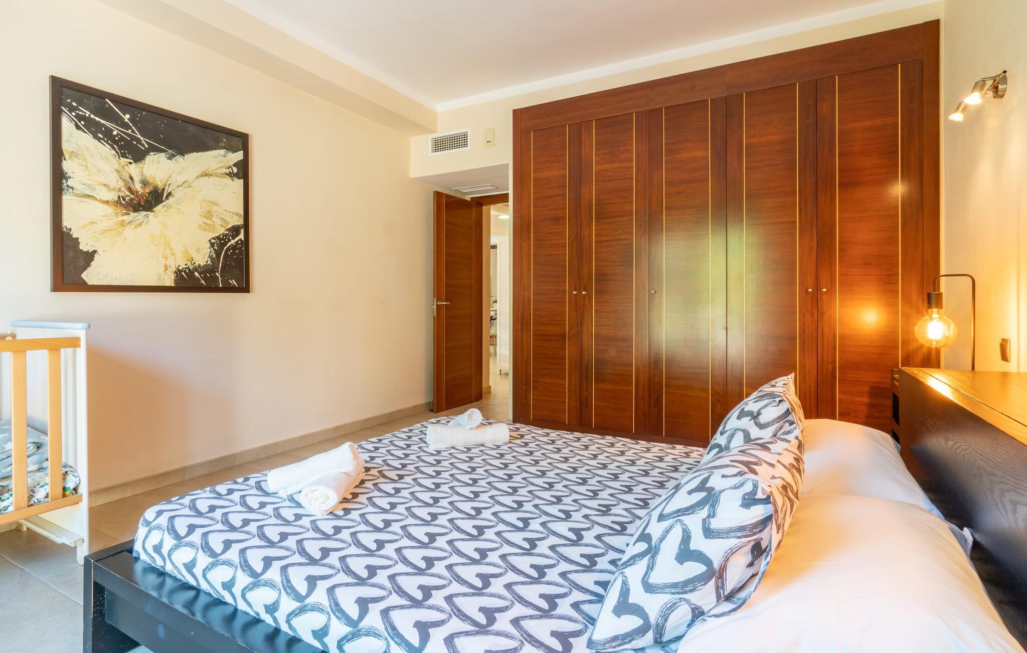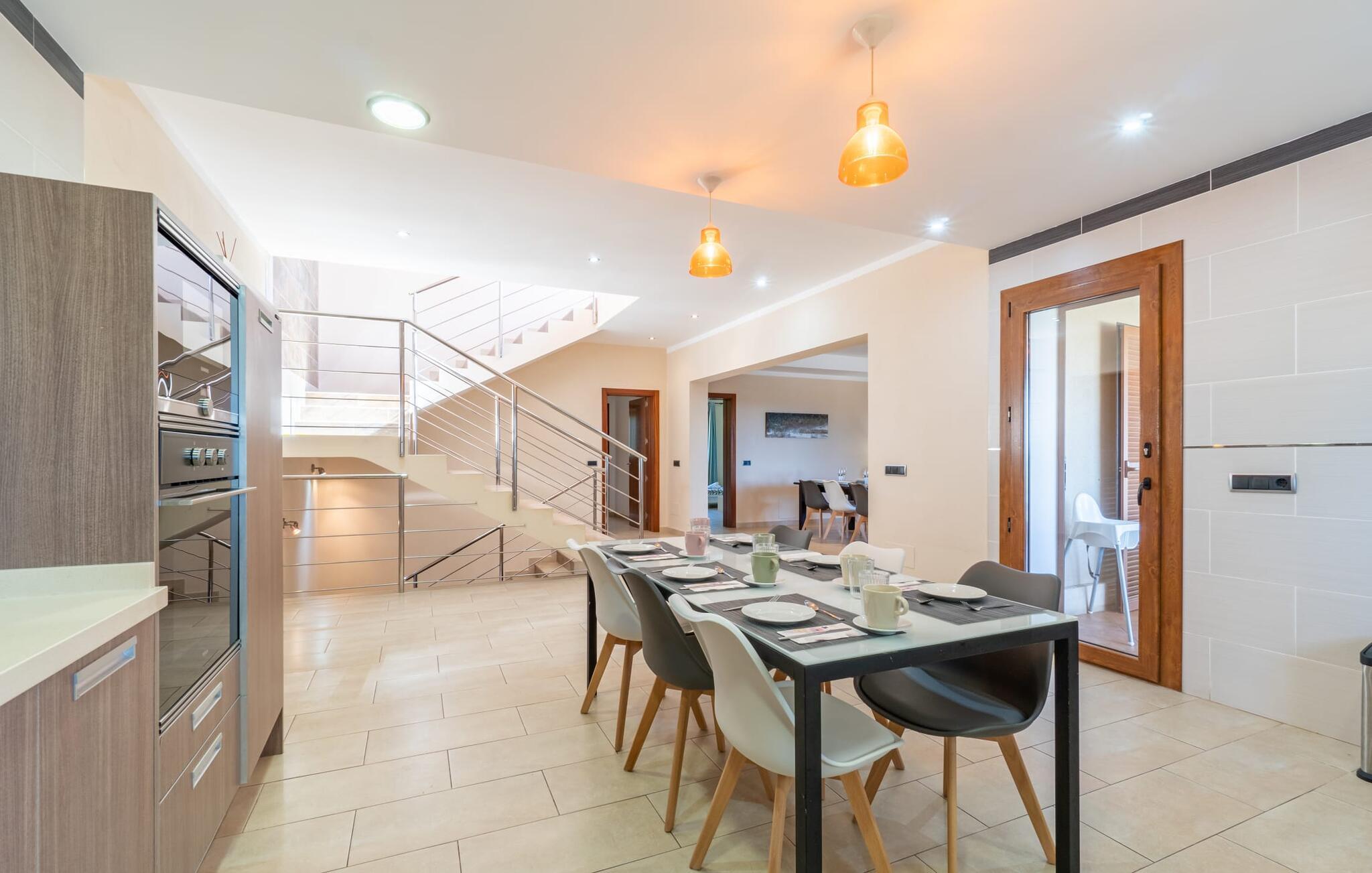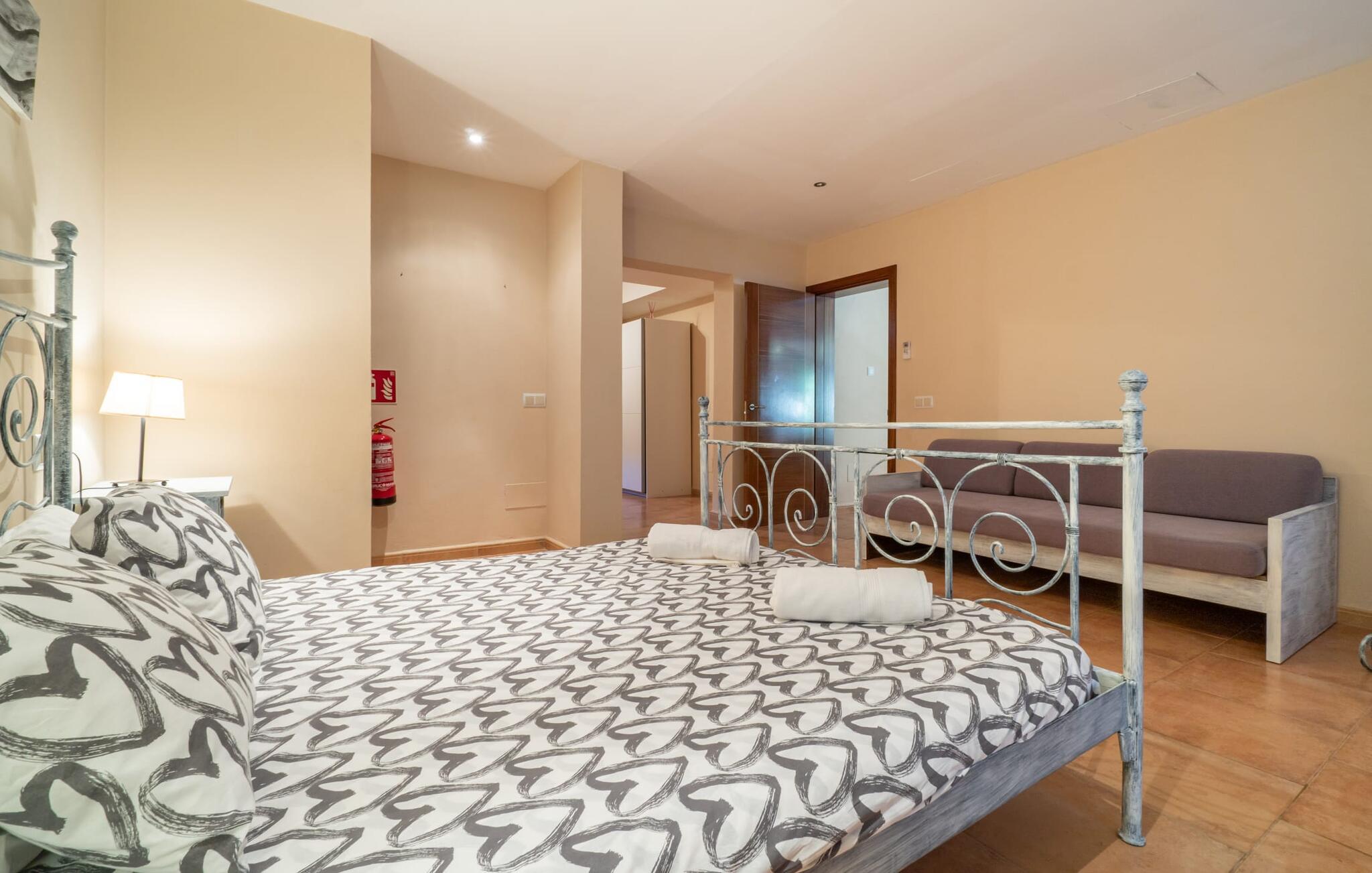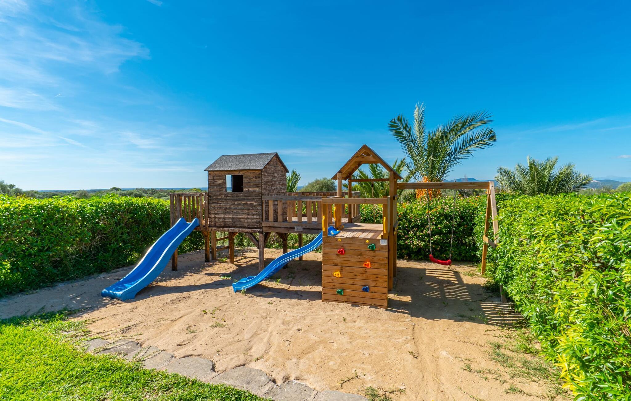 Villaen "Son Figo" har moderne møbler og en utrolig afsondret beliggenhed på en 20.000 m² stor grund med en smukt anlagt have og et fantastisk panorama over den flade del af sydøstkysten og over Plà de Mallorca til øen Tramuntana-bjergene. Naturstenshuset er designet i typisk mallorcansk stil og har flere terrasser, hvoraf nogle er overdækkede. Den største overdækkede veranda ligger foran huset og har et stort spisebord på den ene side og komfortable loungemøbler på den anden. Herfra kan I nyde den vidunderlige udsigt over ejendommen, poolen og den landlige vidde helt ud til horisonten. Pool, spabad og udendørs bruser er integreret i en terrasse lavet af natursten og træ. Der er nok parasoller og liggestole til rådighed for alle gæster. Den mere lavvandede børnepool er lidt adskilt fra resten af poolen, så børn kan svømme og plaske rundt sikkert. For at forblive aktiv er der et lille legeområde for børnene; I kan nemt holde øje med dem fra terrassen. Der er også en permanent grill til jeres rådighed for at tilberede vidunderlige friske delikatesser. Det visuelt tiltalende naturstenshus med sine 335 m² byder på plads til en stor gruppe på op til 12 personer. Opholds- og spiseområdet er lyst og åbent og har komfortable sofaer, pejs og to spiseborde. Køkkenet i træ og rustfrit stål har alle de nødvendige faciliteter. En kaffemaskine, et stort køleskab, ovn og mikroovn i behagelig højde samt opvaskemaskine - det er blot nogle få af de mange funktioner. Gennem et af de mange gulv-til-loft trævinduer er der adgang til den overdækkede terrasse for at nyde en solid morgenmad ved langbordet. Fem af soveværelserne har dobbeltsenge, mens det andet er et dobbeltværelse. Der er fem badeværelser til rådighed for i alt seks soveværelser. Hvert værelse i hele huset har individuelt klimaanlæg og kan opvarmes selv uden for sommersæsonen. Hvis I vil nyde den utrolige udsigt over landskabet fra oven, så træde ind på den store terrasse på øverste etage med udsigt over den endeløse flade af Mallorca-sletten. Hvis I leder efter en fantastisk badeferieoplevelse, så er Villa "Son Figo" det rigtige sted for jer. De smukkeste strande langs den sydøstlige kyst er kun en kort køretur væk. I kan nå strande som Cala Llombards eller Cala Santanyi med lejebil på omkring 15 minutter via den tydeligt hørbare landevej nær villaen. Det samme gør sig gældende for de kilometervis af vidunderligt sand ved Es Trenc, som er særdeles velegnet til familier på grund af dens lave stigning. Denne brede sandstrand og dens krystalklare vand sammenlignes ofte med de billedskønne strande i Caribien. Campos har alt hvad I behøver til daglig indkøb og ligger kun 10 minutters kørsel fra villaen. På et af øens smukkeste ugentlige markeder, som finder sted hver onsdag i Santanyí, omkring 7 km fra "Son Figo", finder I ikke kun frugt og grøntsager, men også håndlavede souvenirs og typiske mallorcanske delikatesser. Den familievenlige villa "Son Figo" er et storslået landsted i typisk mallorcansk stil med moderne indretning og en stor grund. Talrige strande langs Mallorcas sydkyst er nemme og hurtige at nå. De nærliggende supermarkeder i Campos tilbyder alt til jeres daglige behov. Bemærk venligst, at denne ejendom ikke accepterer ungdomsgrupper eller polterabender. En ungdomsgruppe på denne ejendom består af personer på 25 år eller derunder. Book ikke denne ejendom, hvis I er en ungdomsgruppe eller en polterabendgruppe, da jeres reservation vil blive afvist, når den er booket, hvilket også kan være tilfældet ved ankomst til ejendommen eller under jeres ophold, og I vil ikke modtage en refusion.