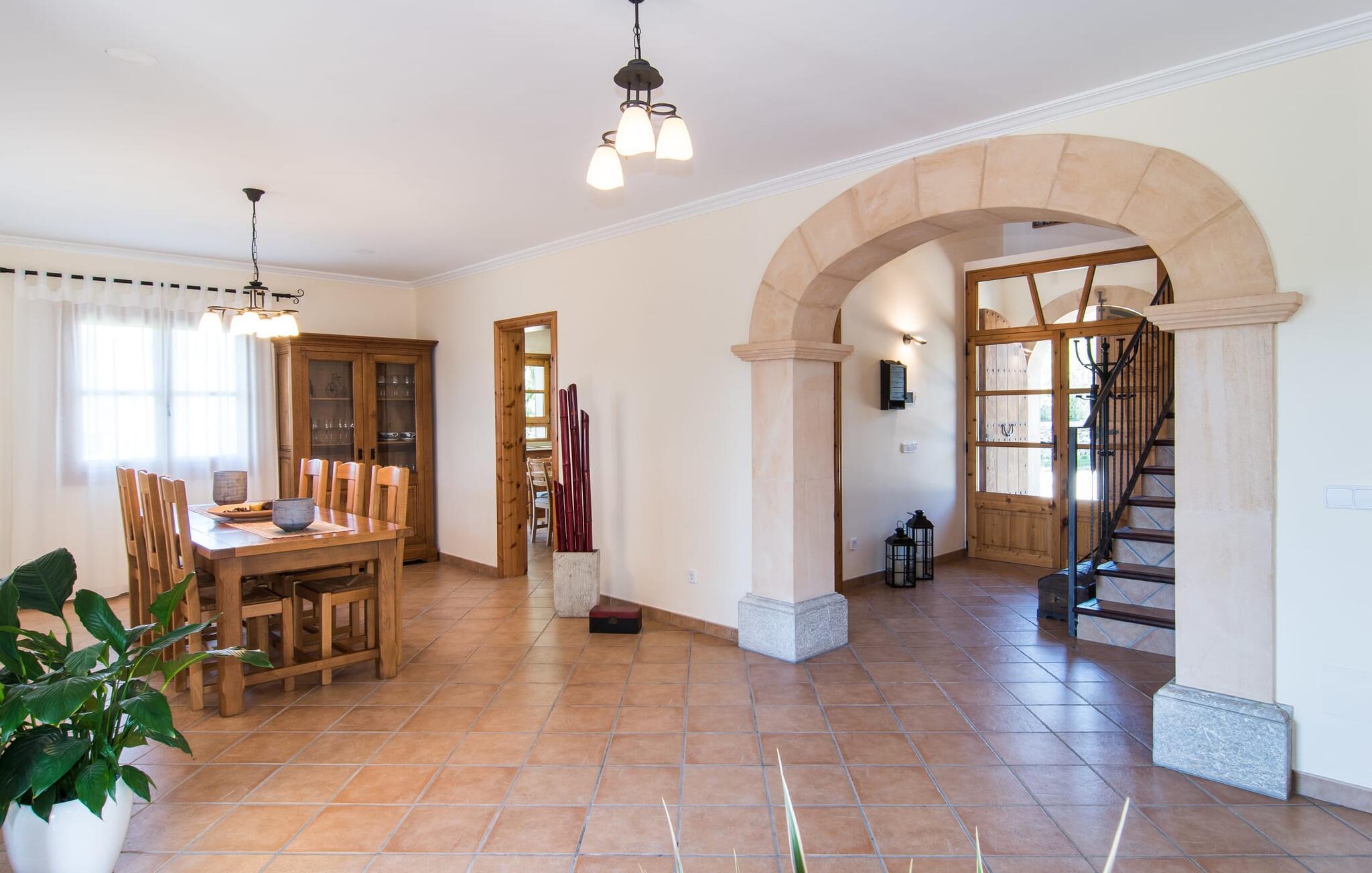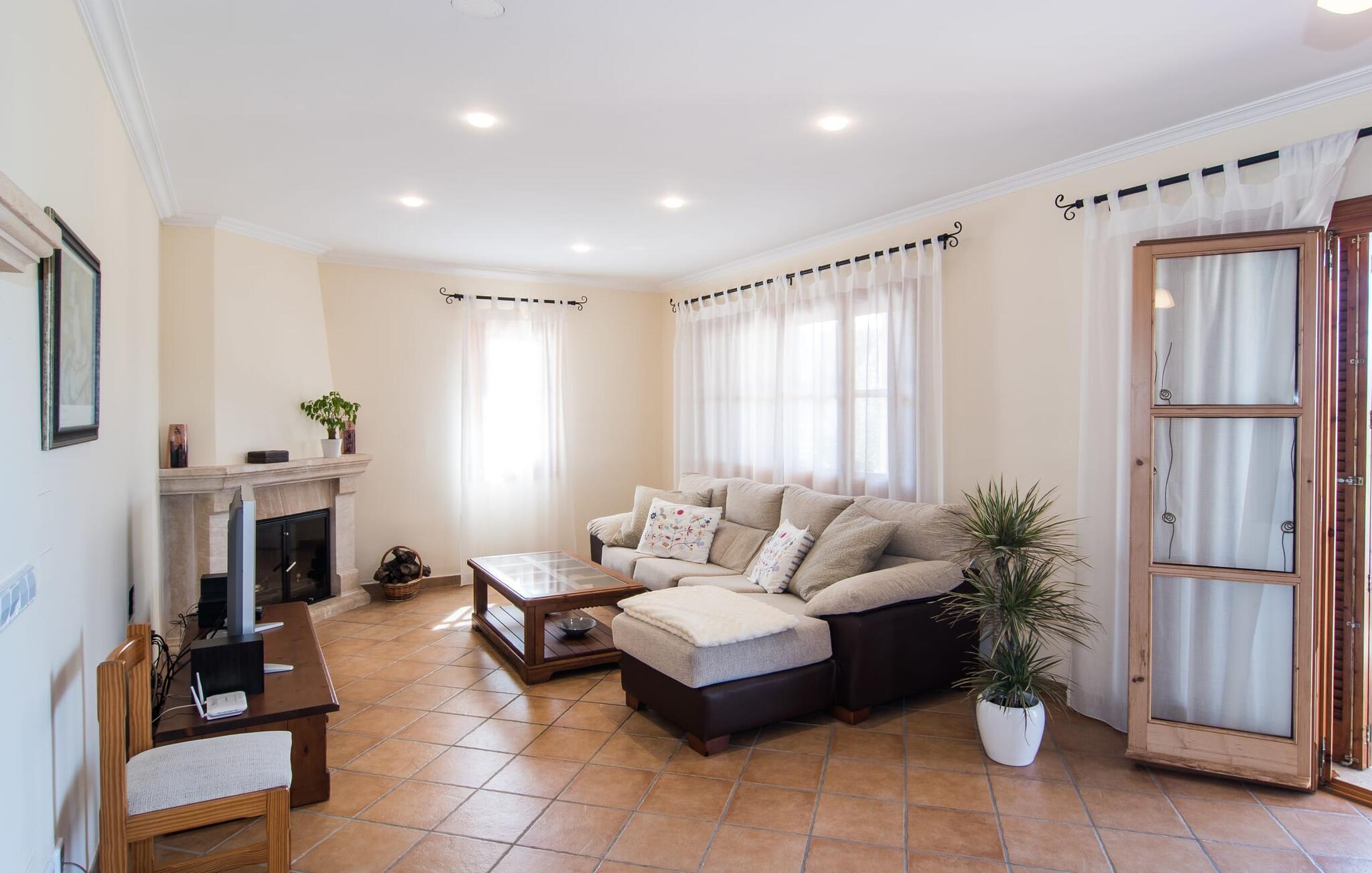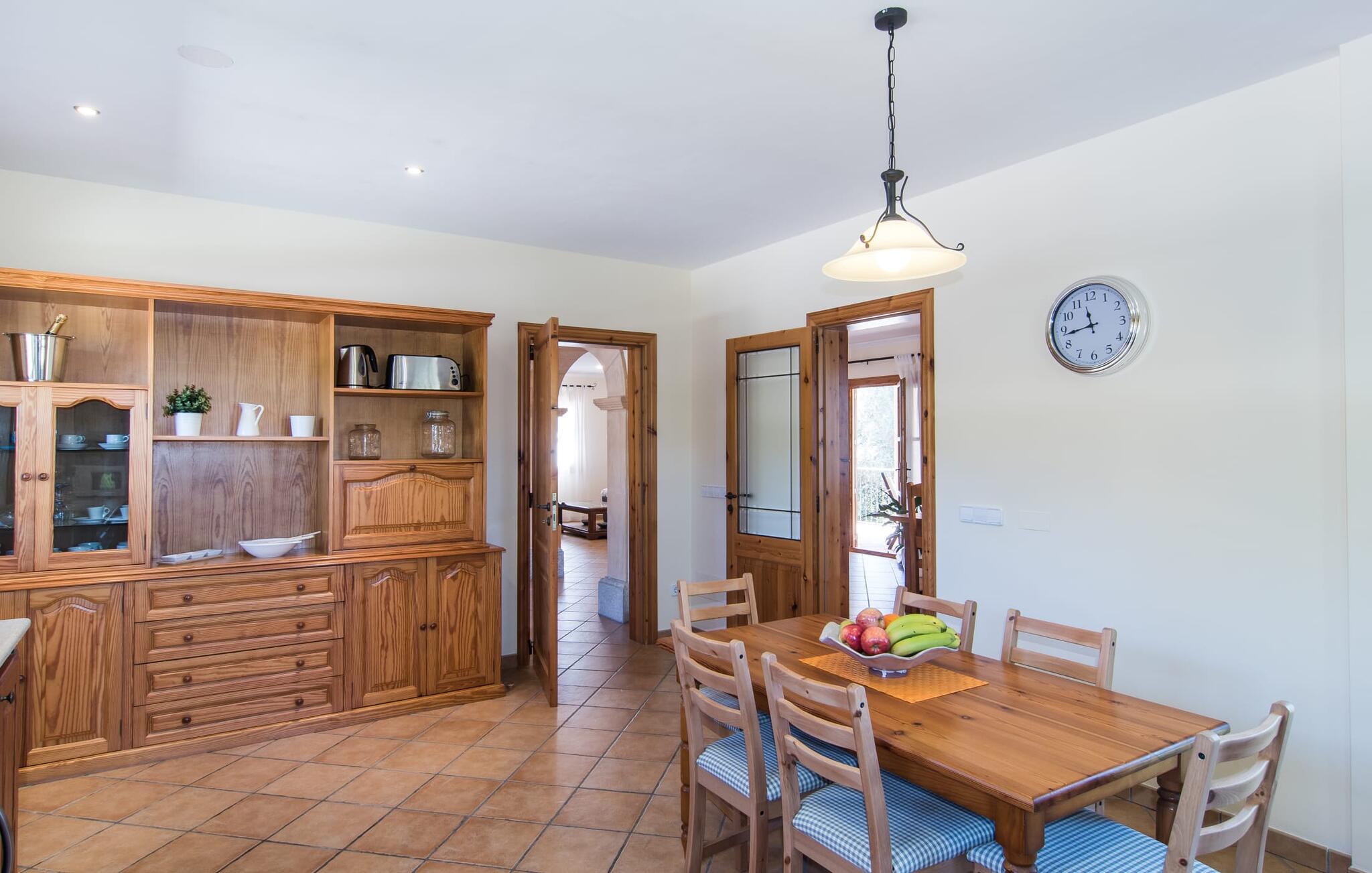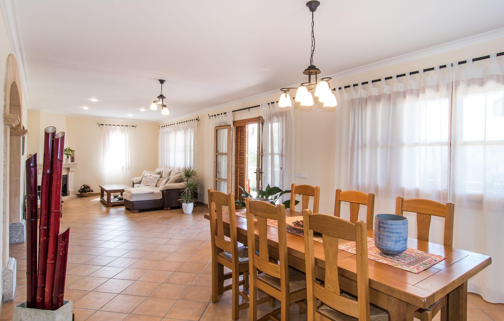 Leder I efter et sted, hvor I kan nyde fred og privatliv? Så kig nærmere, for måske er denne lille perle lige det, I leder efter. Villaens idylliske beliggenhed giver jer mulighed for at gå lange ture gennem naturen og blot koble af og koble af med krop og sjæl. Det, der bestemt er værd at fremhæve, er den statelige terrasse - når I først har sat jer derned, vil I ikke tage afsted, udsigten er så betagende. Under jeres ophold kan I føle, som om I er blevet transporteret til et fantastisk filmsæt. Der er flere siddepladser på terrassen, så intet står i vejen for et afslappet måltid udendørs med udsigt til det grønne. På den forudsatte grill kan I tilberede den friske fisk, I har købt hver tirsdag på det ugentlige marked i Artà. Det er bedst at bruge en hjemmelavet marinade lavet af krydderurter, hvidløg og olivenolie, som giver den en udsøgt smag. Og parret med et fremragende glas vin fra en mallorcansk vingård kan livet være så smukt... Selve villaen imponerer med sine stærkt oplyste rum og interiørets naturlige karisma, hvor der ikke er stilistiske modsætninger. De flotte gulvfliser kan findes i alle rum og på terrassen. Møblerne er for det meste indrettet i varme trætoner, der blander sig harmonisk med de cremefarvede vægge. Der er en hyggelig atmosfære, som forstærkes af lysindfaldet gennem villaens store vinduespartier. Soveværelserne ovenpå er designet til komfort og lover afslappende nætter eller en afslappende eftermiddagssiesta. To af værelserne har dobbeltseng, det tredje har to enkeltsenge og er derfor ideelt som børneværelse. Det ene af de to badeværelser byder endda på et hjørnebadekar til et behageligt aftenbad. I stueetagen har den åbne stue et hyggeligt loungehjørne og en pejs - så bare rolig, hvis vejret ikke samarbejder, for I kunne ikke undvære den hyggelige varme og den knitrende ild. Fra stuen er der direkte adgang til trækøkkenet, som byder på alt, hvad et selvforplejningshjerte begærer med ovn, keramisk kogeplade, stort køleskab, opvaskemaskine, mikroovn, kaffemaskine, elkedel og drikkevarekøleskab. På grund af sin afsondrede landlige beliggenhed er villaen "Son Norte Fou" særligt velegnet til folk, der søger fred og afslapning. Leder I efter underholdning, kan I besøge grottesystemet Coves de Artà, et attraktivt udflugtsmål, der også er fascinerende for børn. En tur til den naturlige strand i Cala Torta, som er omkring tredive minutter væk, anbefales også. Når I først krydser den noget ujævne vej til parkeringspladsen, kan I nyde den fascinerende skønhed ved denne sandstrand omgivet af bølgende grønne bakker. Denne landlige og afsondrede villa ligger i de grønne bakker mellem Colònia de Sant Pere og den maleriske lille kunstnerby Artà, kun 2,9 km væk. Der vil I også finde talrige indkøbsmuligheder til at dække jeres daglige behov samt mange seværdigheder. På cirka 20 minutter kan I nå smukke sandstrande som Canyamel og Platja de Son Moll. Bemærk venligst, at denne ejendom ikke accepterer ungdomsgrupper eller polterabender. En ungdomsgruppe på denne ejendom består af personer under 30 år. Book ikke denne ejendom, hvis I er en ungdomsgruppe eller en polterabendgruppe, da jeres reservation vil blive afvist, når den er booket, hvilket også kan være tilfældet ved ankomst til ejendommen eller under jeres ophold, og I vil ikke modtage en refusion.