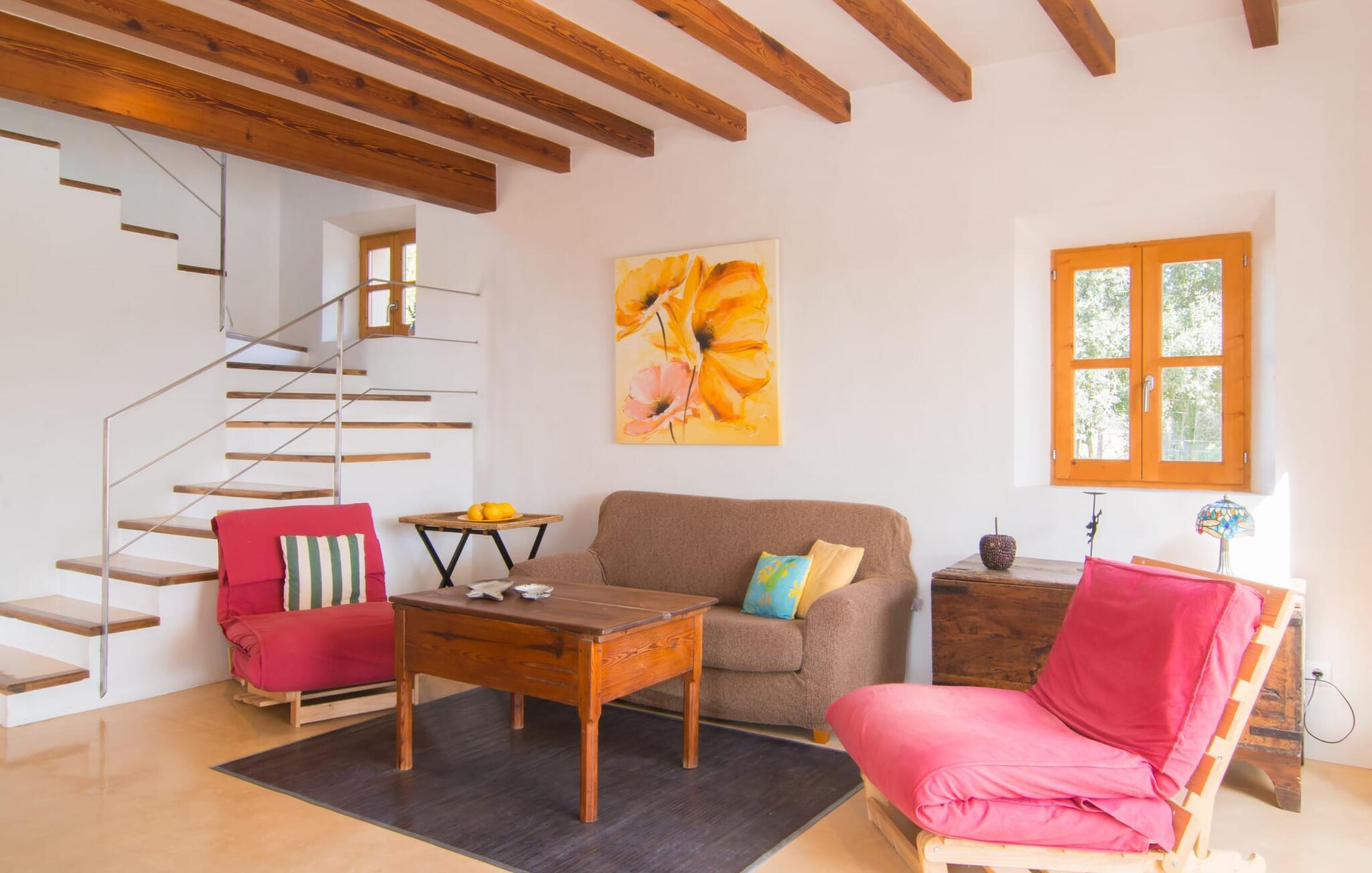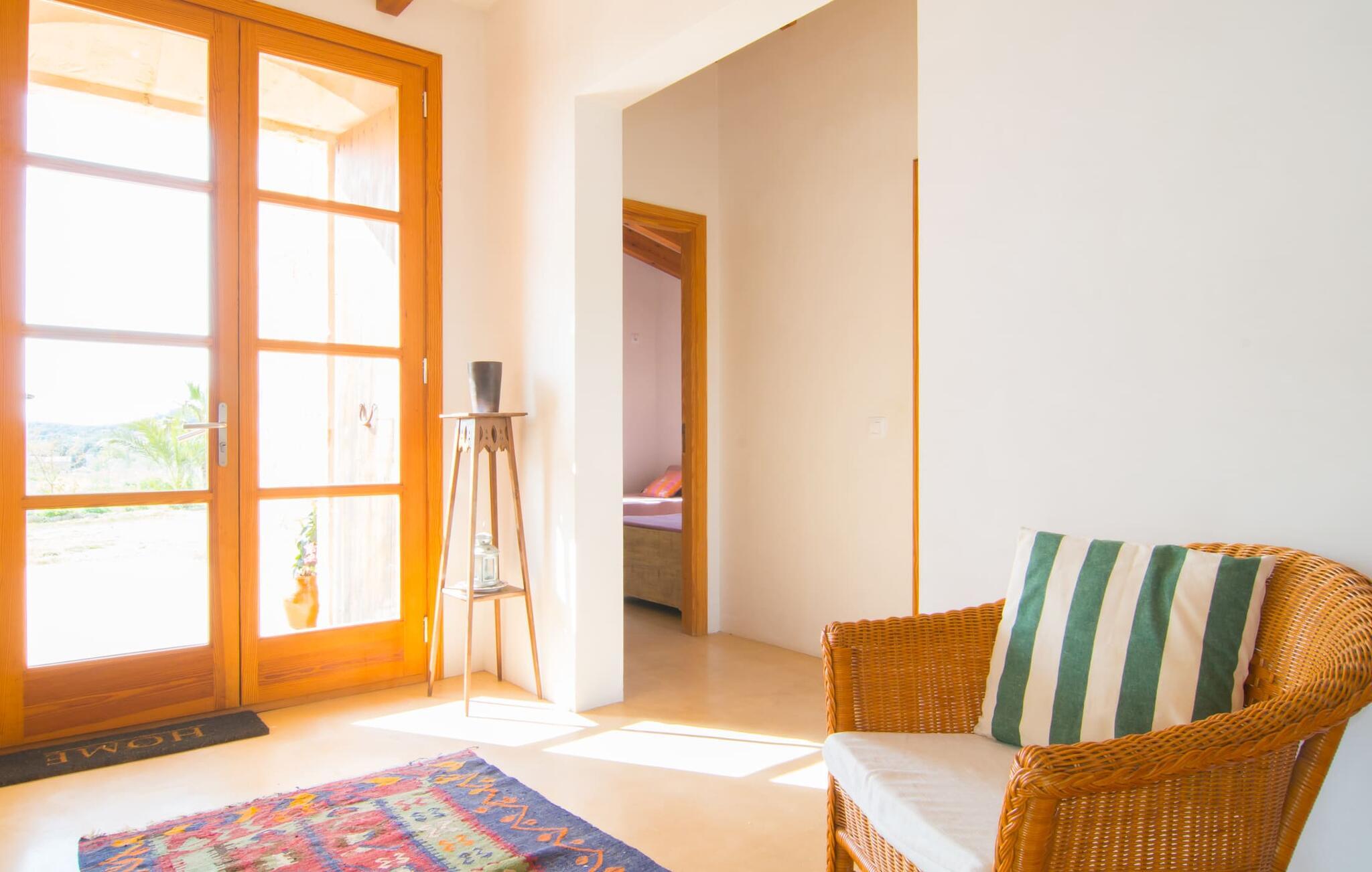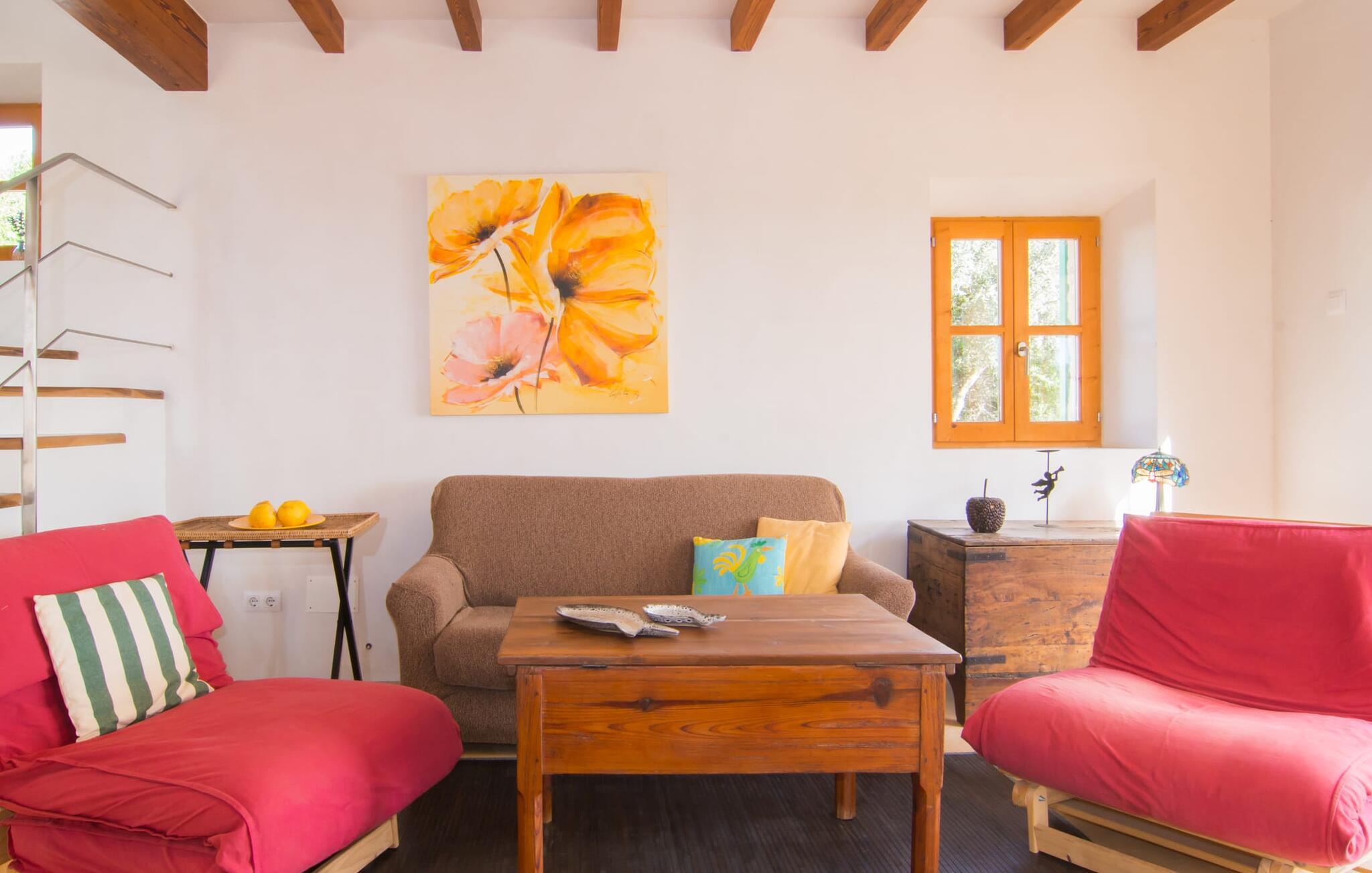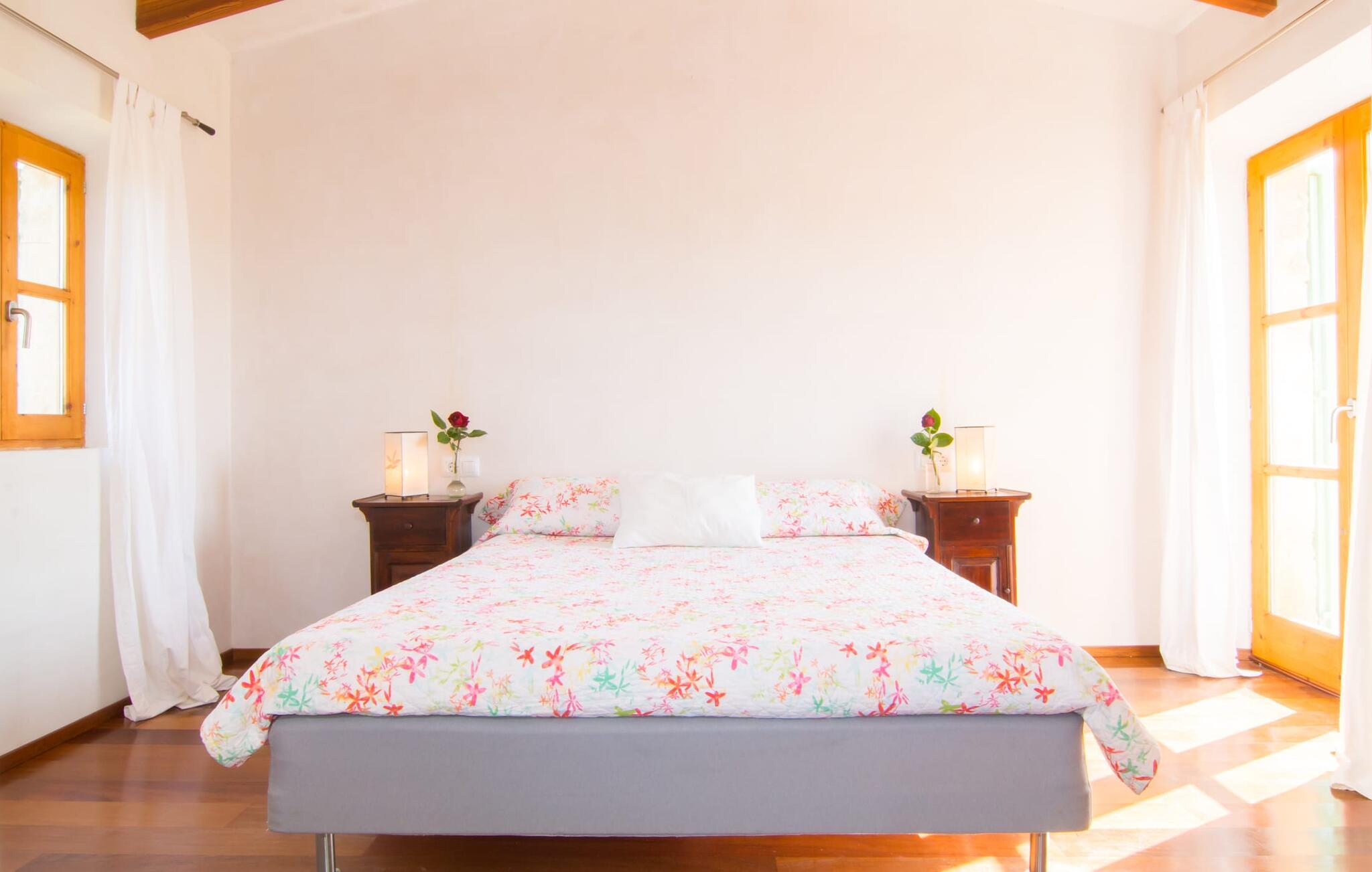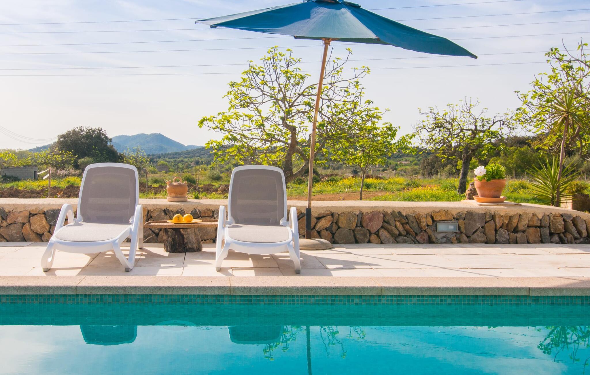 Beliggende i de frodige bakker omkring Artà tilbyder den charmerende villa "Son Frare" fuldstændig privatliv og en betagende udsigt. Dette fuldstændigt restaurerede stenbrudshus har mintgrønne skodder og en vidunderlig solterrasse med privat pool. Poolområdet med liggestole og parasoller flyder ud i en skyggefuld terrasse med et behageligt opholdsområde og bærbar grill - perfekt til afslappende aftener. Indenfor kombineres moderne komfort med rustik charme. Den åbne plan stue, spiseplads og køkken byder på en indbydende atmosfære med masser af naturligt lys, der kommer gennem store vinduespartier. Køkkenet er udstyret med alt hvad I behøver, og spisebordet har plads til seks personer. Der er to soveværelser: et soveværelse med 2 enkeltsenge i stueetagen og et soveværelse i åbent plan med en queensize seng (1,6 m) og ensuite badeværelse ovenpå. Det store soveværelse fører til en privat terrasse med en betagende udsigt, hvilket gør det til et ideelt tilflugtssted for par eller små grupper. Villaen ligger i fantastiske landlige omgivelser nær den lille middelalderby Artà. Kun 2 km væk finder I butikker til jeres daglige behov, et hyggeligt ugentligt marked om tirsdagen og gode caféer og restauranter. Cala Ratjada med sine mange attraktive barer langs promenaden er også et besøg værd. Villaen ligger kun få kilometer fra populære sandstrande som Sa Marjal eller Cala Bono. Nyd at cykle eller vandre langs Via Verde, da den 30 km lange rute fra Manacor til Artà generelt er meget flad og byder på en vidunderlig udsigt over det omkringliggende landskab.