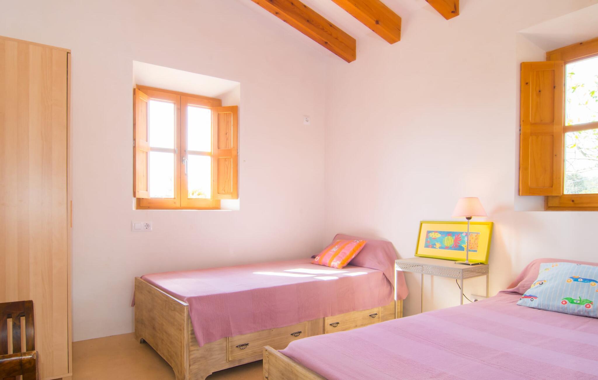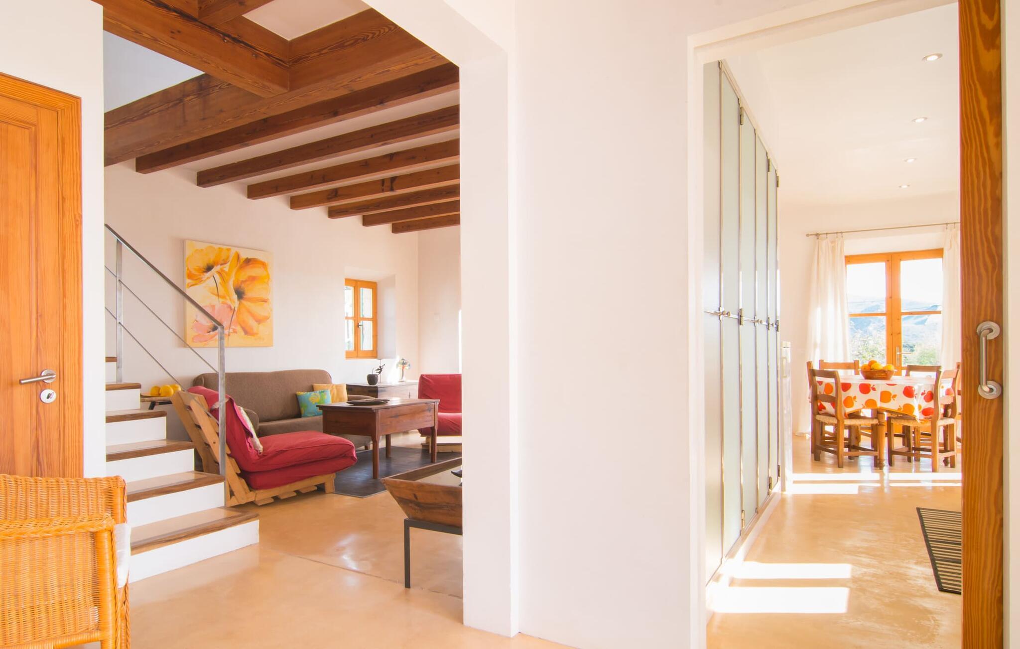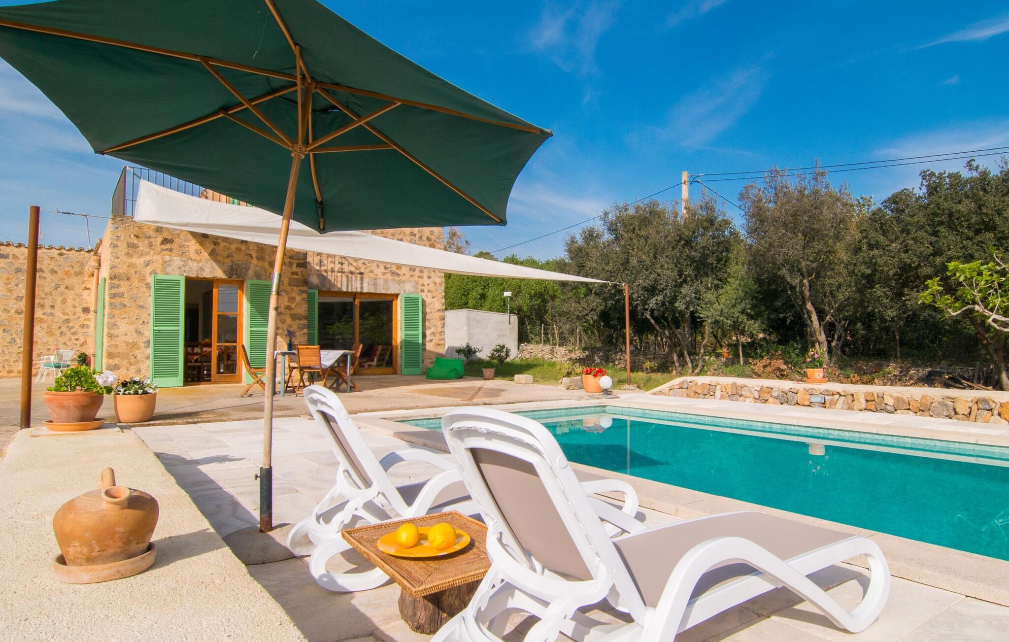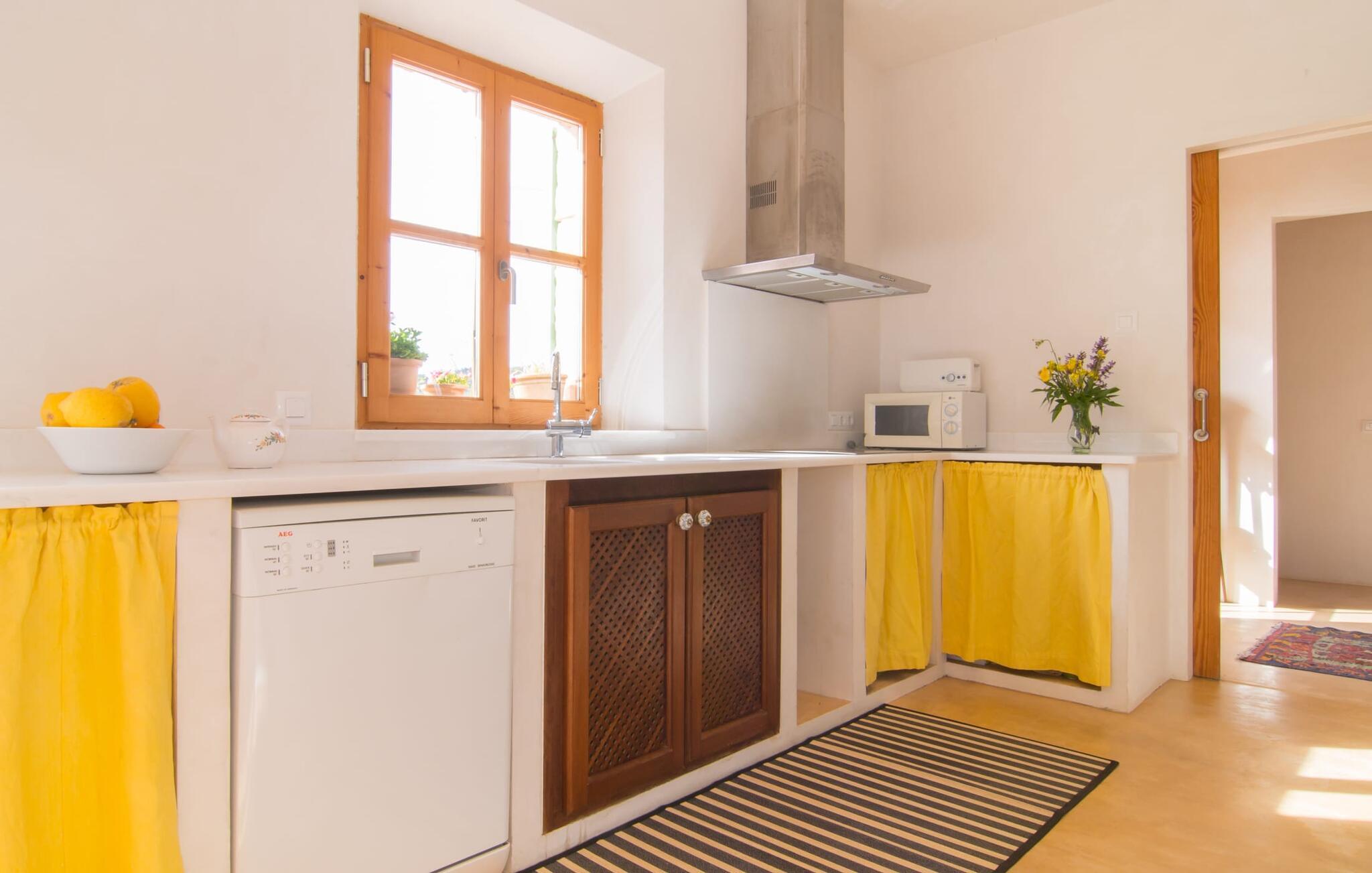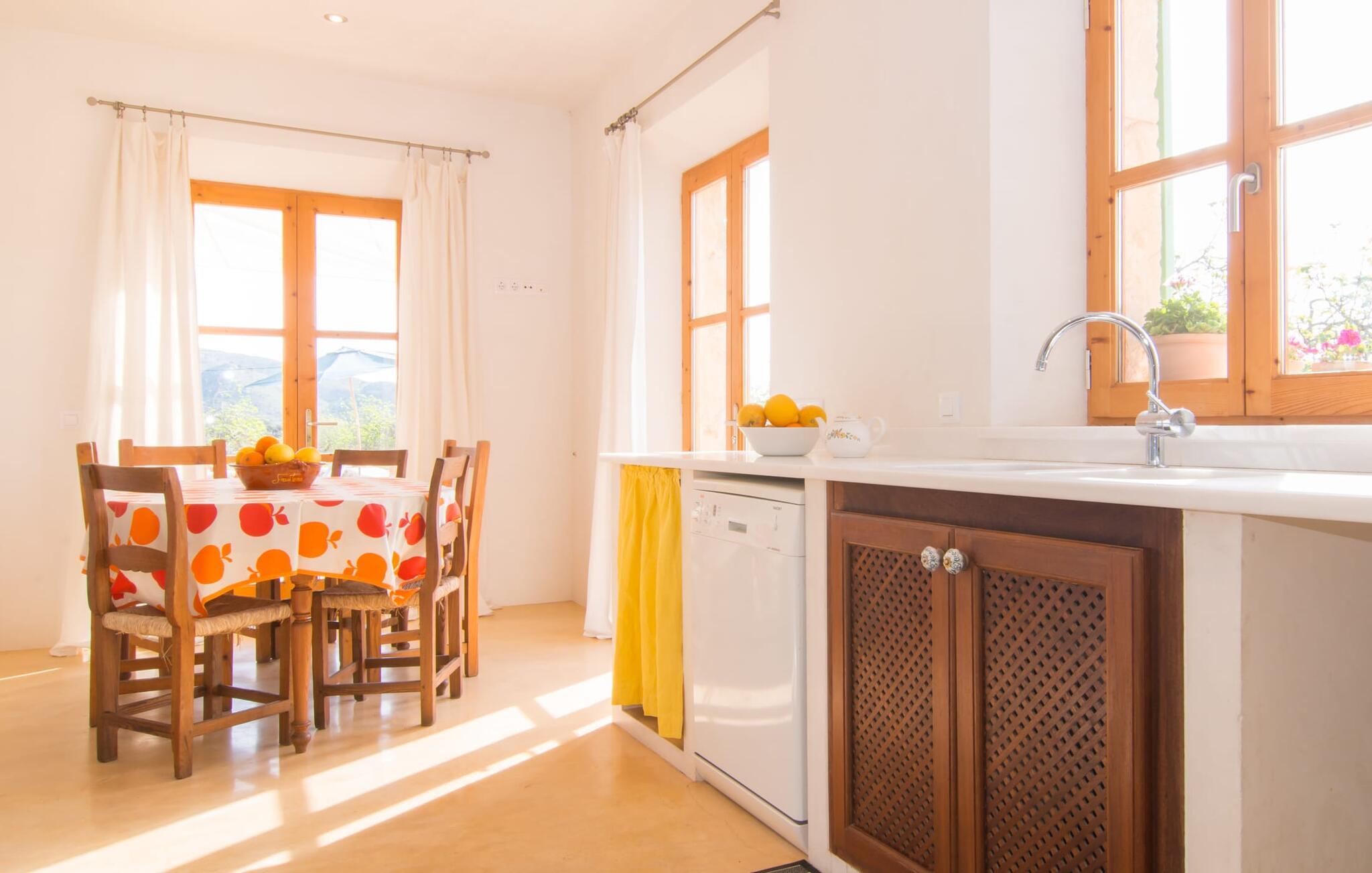 Beliggende i de frodige bakker omkring Artà tilbyder den charmerende villa "Son Frare" fuldstændig privatliv og en betagende udsigt. Dette fuldstændigt restaurerede stenbrudshus har mintgrønne skodder og en vidunderlig solterrasse med privat pool. Poolområdet med liggestole og parasoller flyder ud i en skyggefuld terrasse med et behageligt opholdsområde og bærbar grill - perfekt til afslappende aftener. Indenfor kombineres moderne komfort med rustik charme. Den åbne plan stue, spiseplads og køkken byder på en indbydende atmosfære med masser af naturligt lys, der kommer gennem store vinduespartier. Køkkenet er udstyret med alt hvad I behøver, og spisebordet har plads til seks personer. Der er to soveværelser: et soveværelse med 2 enkeltsenge i stueetagen og et soveværelse i åbent plan med en queensize seng (1,6 m) og ensuite badeværelse ovenpå. Det store soveværelse fører til en privat terrasse med en betagende udsigt, hvilket gør det til et ideelt tilflugtssted for par eller små grupper. Villaen ligger i fantastiske landlige omgivelser nær den lille middelalderby Artà. Kun 2 km væk finder I butikker til jeres daglige behov, et hyggeligt ugentligt marked om tirsdagen og gode caféer og restauranter. Cala Ratjada med sine mange attraktive barer langs promenaden er også et besøg værd. Villaen ligger kun få kilometer fra populære sandstrande som Sa Marjal eller Cala Bono. Nyd at cykle eller vandre langs Via Verde, da den 30 km lange rute fra Manacor til Artà generelt er meget flad og byder på en vidunderlig udsigt over det omkringliggende landskab.