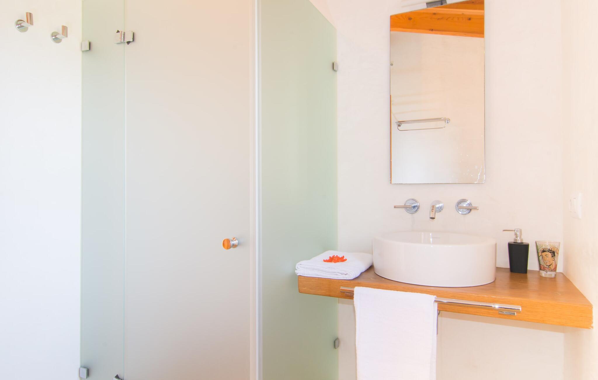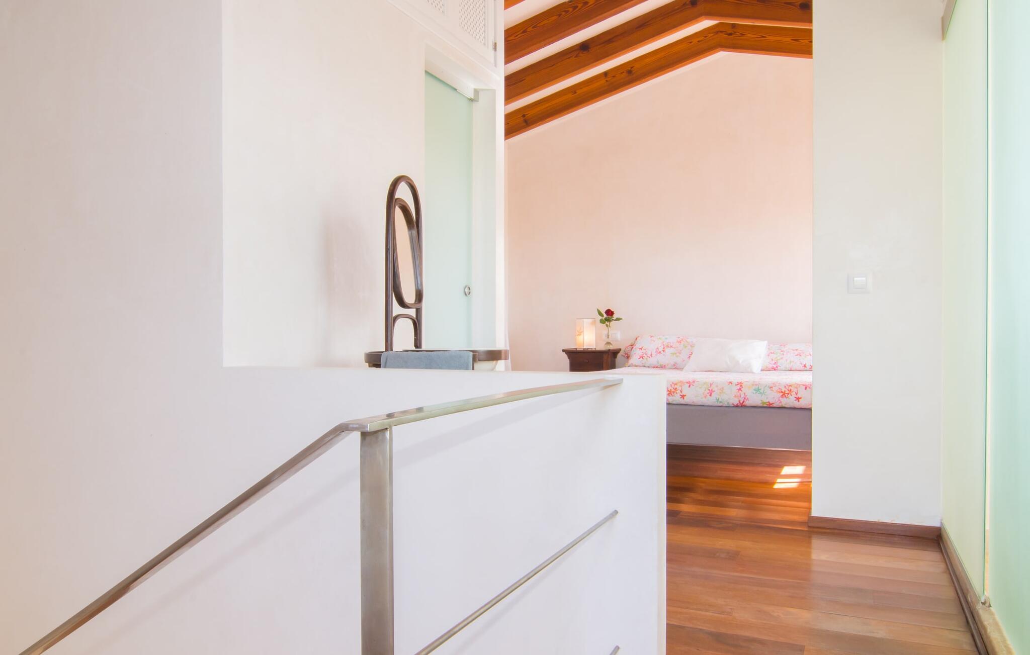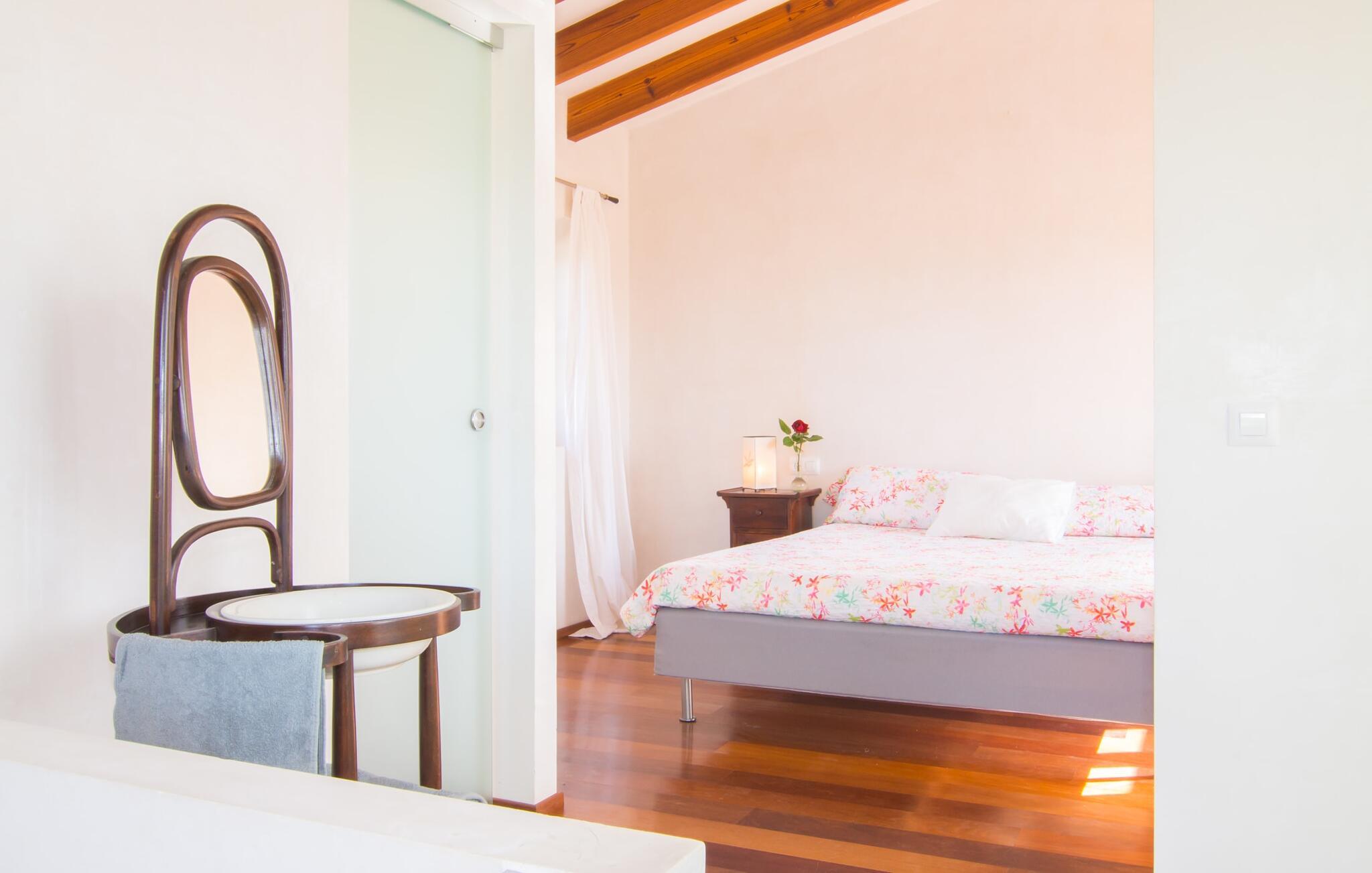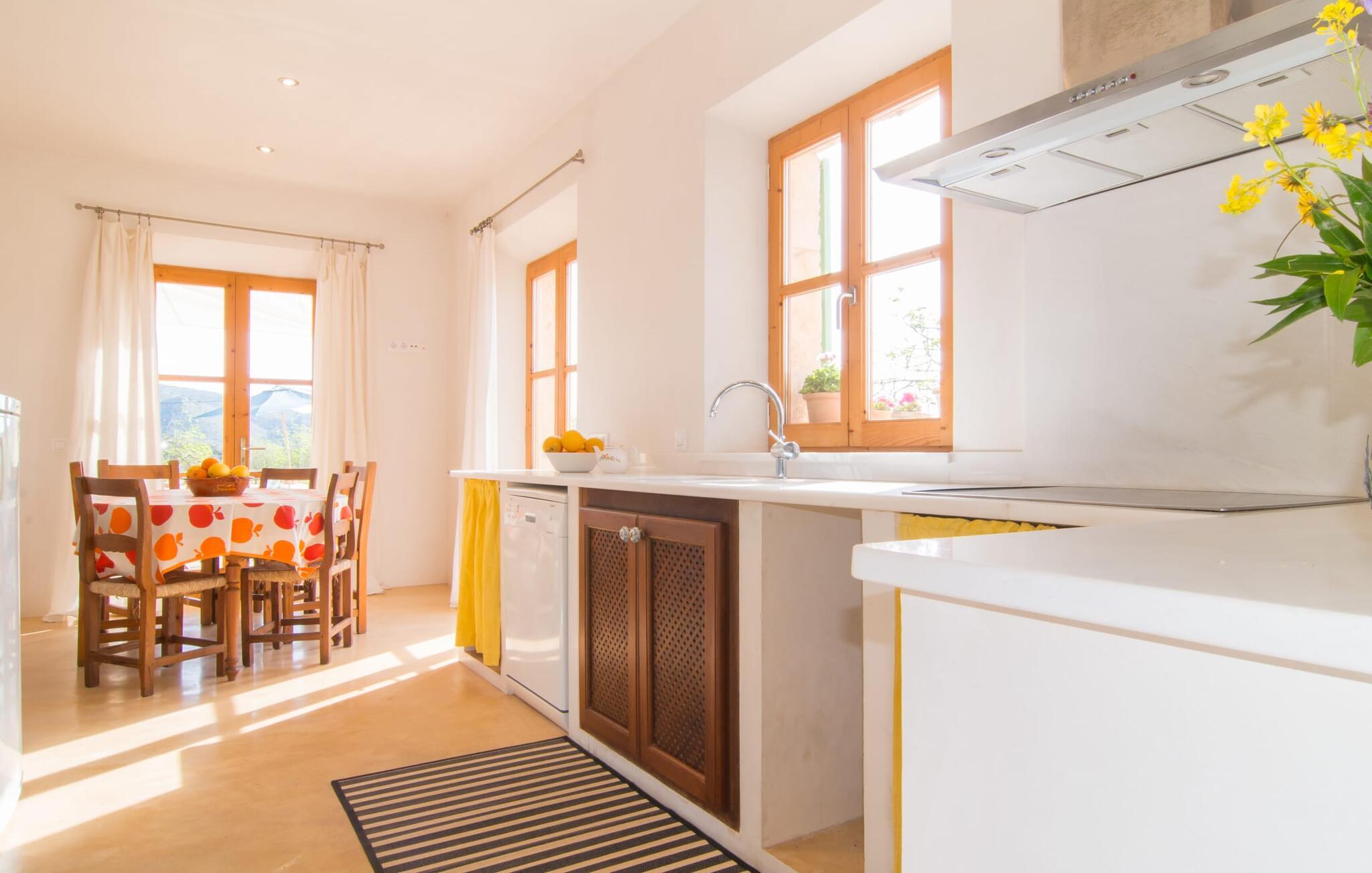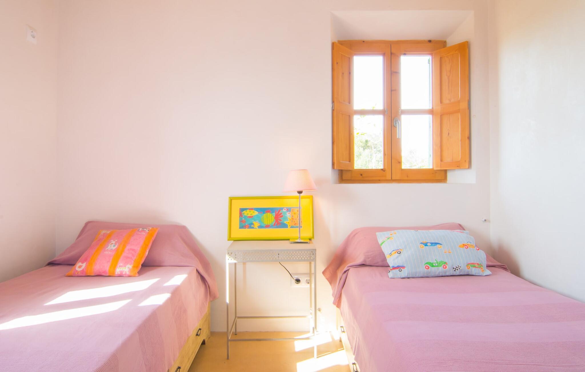 Beliggende i de frodige bakker omkring Artà tilbyder den charmerende villa "Son Frare" fuldstændig privatliv og en betagende udsigt. Dette fuldstændigt restaurerede stenbrudshus har mintgrønne skodder og en vidunderlig solterrasse med privat pool. Poolområdet med liggestole og parasoller flyder ud i en skyggefuld terrasse med et behageligt opholdsområde og bærbar grill - perfekt til afslappende aftener. Indenfor kombineres moderne komfort med rustik charme. Den åbne plan stue, spiseplads og køkken byder på en indbydende atmosfære med masser af naturligt lys, der kommer gennem store vinduespartier. Køkkenet er udstyret med alt hvad I behøver, og spisebordet har plads til seks personer. Der er to soveværelser: et soveværelse med 2 enkeltsenge i stueetagen og et soveværelse i åbent plan med en queensize seng (1,6 m) og ensuite badeværelse ovenpå. Det store soveværelse fører til en privat terrasse med en betagende udsigt, hvilket gør det til et ideelt tilflugtssted for par eller små grupper. Villaen ligger i fantastiske landlige omgivelser nær den lille middelalderby Artà. Kun 2 km væk finder I butikker til jeres daglige behov, et hyggeligt ugentligt marked om tirsdagen og gode caféer og restauranter. Cala Ratjada med sine mange attraktive barer langs promenaden er også et besøg værd. Villaen ligger kun få kilometer fra populære sandstrande som Sa Marjal eller Cala Bono. Nyd at cykle eller vandre langs Via Verde, da den 30 km lange rute fra Manacor til Artà generelt er meget flad og byder på en vidunderlig udsigt over det omkringliggende landskab.