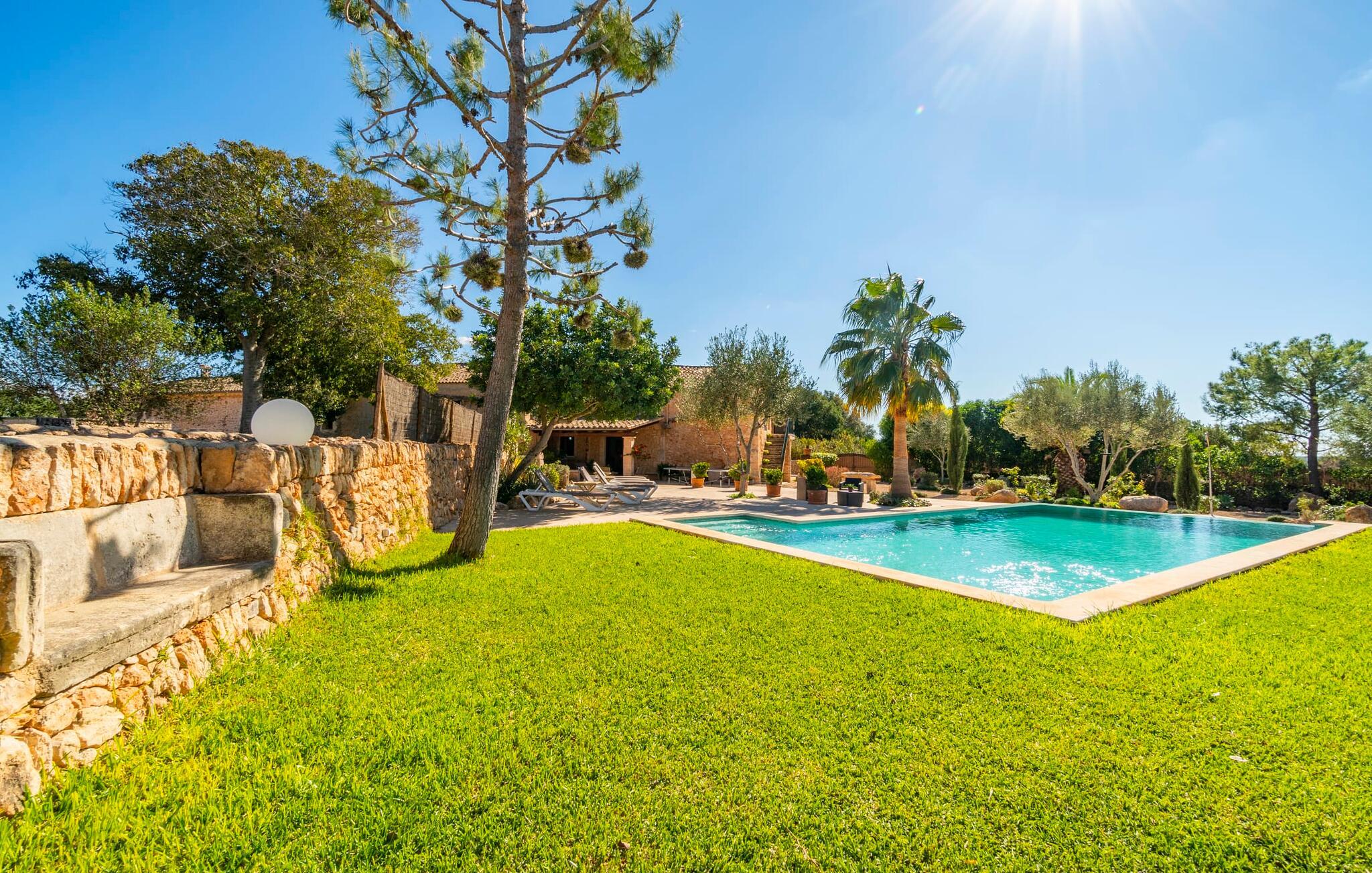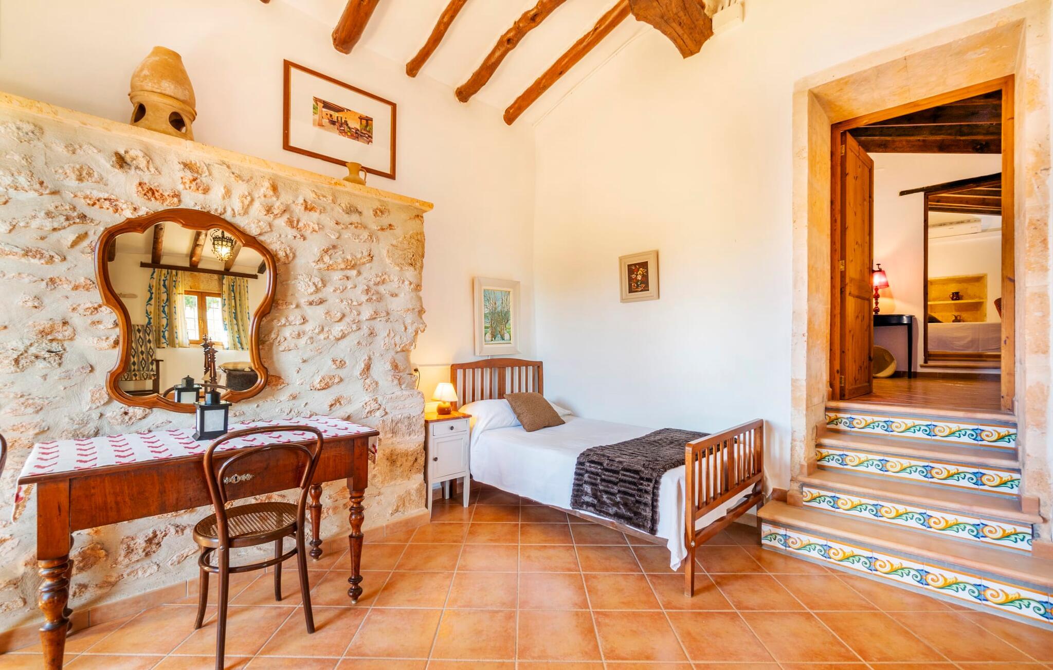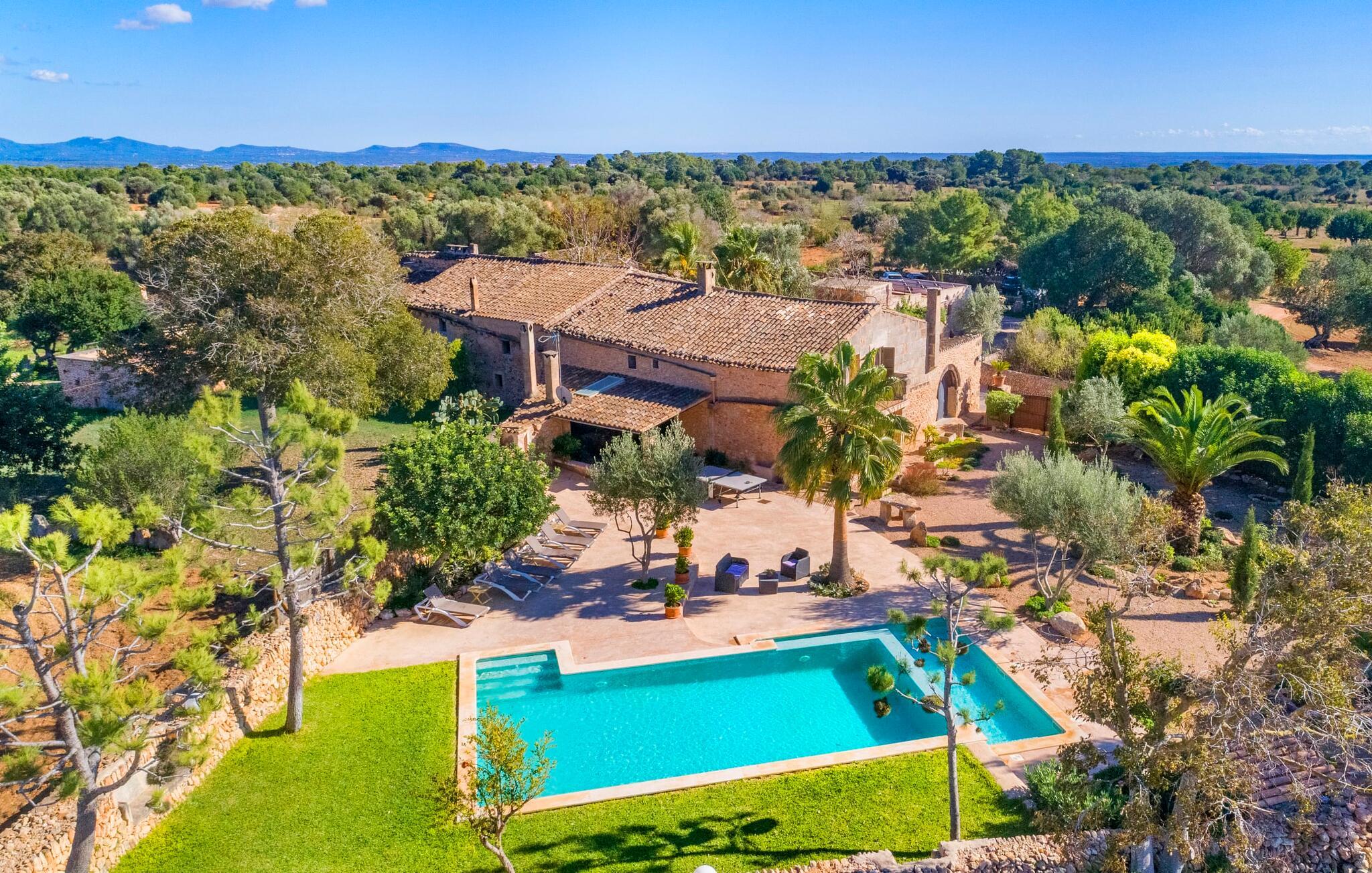 Den godt gemte villa “Son Gabriela” byder sine gæster velkommen i en helt landlig atmosfære og med en utrolig ro, der omgiver ejendommen. I den rummelige have, der stort set er dækket af let sandstensgrus, vil selv tilflyttere straks føle sig hjemme og få lyst til at blive. En lille græsplæne ved siden af poolen skaber et interessant og varieret overordnet udseende og tilbyder et malerisk legeområde for alle børn, der rejser med jer. Der er terrasser mellem huset og poolen, hver med adskillige dejlige siddepladser, hvor I kan slappe af i det fri. Siddepladserne, som blev bygget direkte ind i de små naturstensvægge, er særdeles elegante og indbydende. Dette er et fantastisk sted at fordrive tiden og lade jeres blik vandre over haven. Lige ved siden af huset ligger den overdækkede terrasse, som giver de perfekte rammer til at spise sammen takket være sit store spisebord. Her er også bekvemt installeret en indbygget grill, så I frisk kan tilberede og nyde regionens lækkerier. En stilfuld dobbeltpool, dekoreret med turkise mosaikfliser, er et rigtigt blikfang for store og små. Her kan I køle ned og finde en behagelig forfriskning på varme dage. Den store pool er let tilgængelig via en bred trappe og har en maksimal dybde på 1,90 m. Der er så meget privat jord omkring selve ejendommen, at enhver, der lejer denne ejendom, praktisk talt kan gå en tur uden at skulle vove sig ud af sin egen lille. areal. Med denne ejendom bor I så at sige i et dobbelthus. Den anden del af huset er dog ubeboet, så I kan nyde jeres ferie i fuldstændig privatlivets fred. Huset har egen parkeringsplads, som ligger ca. 20 m fra ejendommen. Selve huset er opdelt som følger: I stueplan er der en fantastisk entré, et rummeligt køkken med spisebord, en tv-stue og et badeværelse. Der er også en trappe, der fører til kælderen. De fire soveværelser og to badeværelser er placeret på øverste etage. En af dem er tilgængelig udefra, så man kan få adgang til badeværelset fra soveværelset via altanen. Det indre af villaen "Son Gabriela" er designet i den typiske mallorcanske stil, hvilket giver ejendommen en særlig rustik atmosfære. I hele ejendommen vil I støde på en overflod af smukke, ægte antikke møbler, som harmonerer perfekt med de farverige vægge, synlige bjælker og terracotta fliser. Her og der ses dekorative naturstenselementer. En række forskellige opholdsområder gør det nemt for jer at sprede jer efter hjertens lyst og finde mindst et af de mange indbydende steder, der inviterer jer til at slappe af. Det hyggelige køkken er veludstyret til jeres daglige behov og byder på alt fra en kedel til en filterkaffemaskine. Til kølige aftener er der endda en pejs, hvor I kan sidde sammen ved spisebordet og nyde et måltid. I spektakulært smukke soveværelser kan alle finde et sted at hvile, der passer præcis til deres behov. Også her finder vi antik flair og et absolut charmerende arrangement. Badeværelserne er indrettet i en moderne og meget smagfuld stil. Det er ikke nødvendigt at medbringe eget strygejern og hårtørrer, da disse allerede er tilgængelige på stedet og kan benyttes gratis under jeres ferie. I kan bekvemt opbevare jeres mad køligt i kælderen. Har I lyst til at tage ud og gå på opdagelse, kan I bruge en dag på en af de populære strande i området. Disse omfatter blandt andre Platja de sa Rapita og Es Freu de Ses Covetes. Det flade, landlige landskab omkring Llucmajor har også et veludviklet netværk af cykelstier, som enhver sportsentusiast vil nyde. Der er et landmandsmarked i Llucmajor tre dage om ugen: søndage, onsdage og fredage. Efter at have handlet efter det, I har brug for på markedet, kan I besøge en af de smukke caféer på Plaça Espanya og fortsætte med at se travlheden omkring jer, før I tager hjem til jeres tilflugtssted "Son Gabriela" og selv ser jer omkring. Tilbring dagen i måden I vælger. Villaen "Son Gabriela" er et charmerende tilflugtssted i den sydlige del af øen, omkring 7 km sydøst for Llucmajor. De lokale strande er nemme at nå. Ø-metropolen Palma de Mallorca ligger omkring 30 minutter væk i bil.