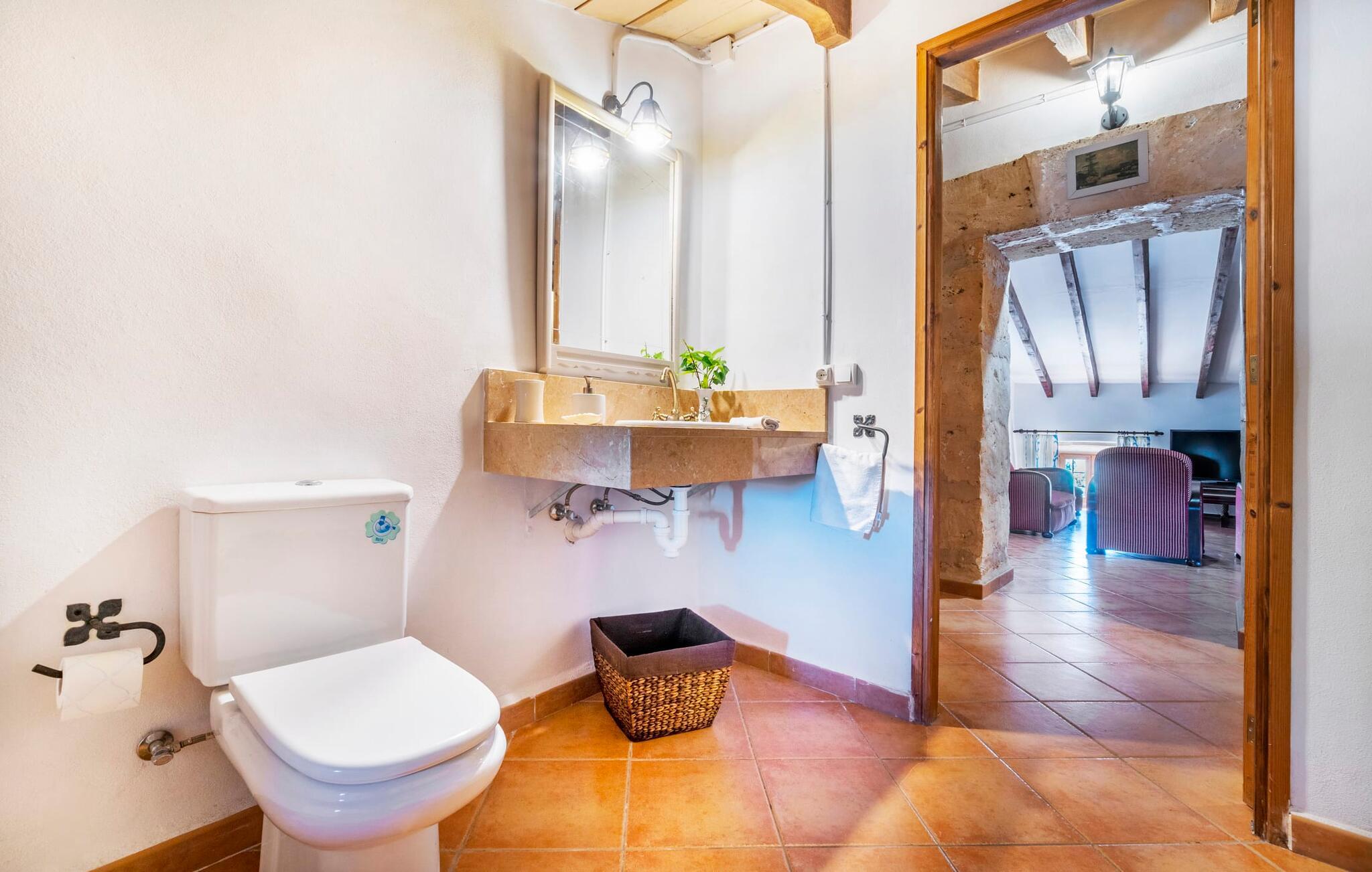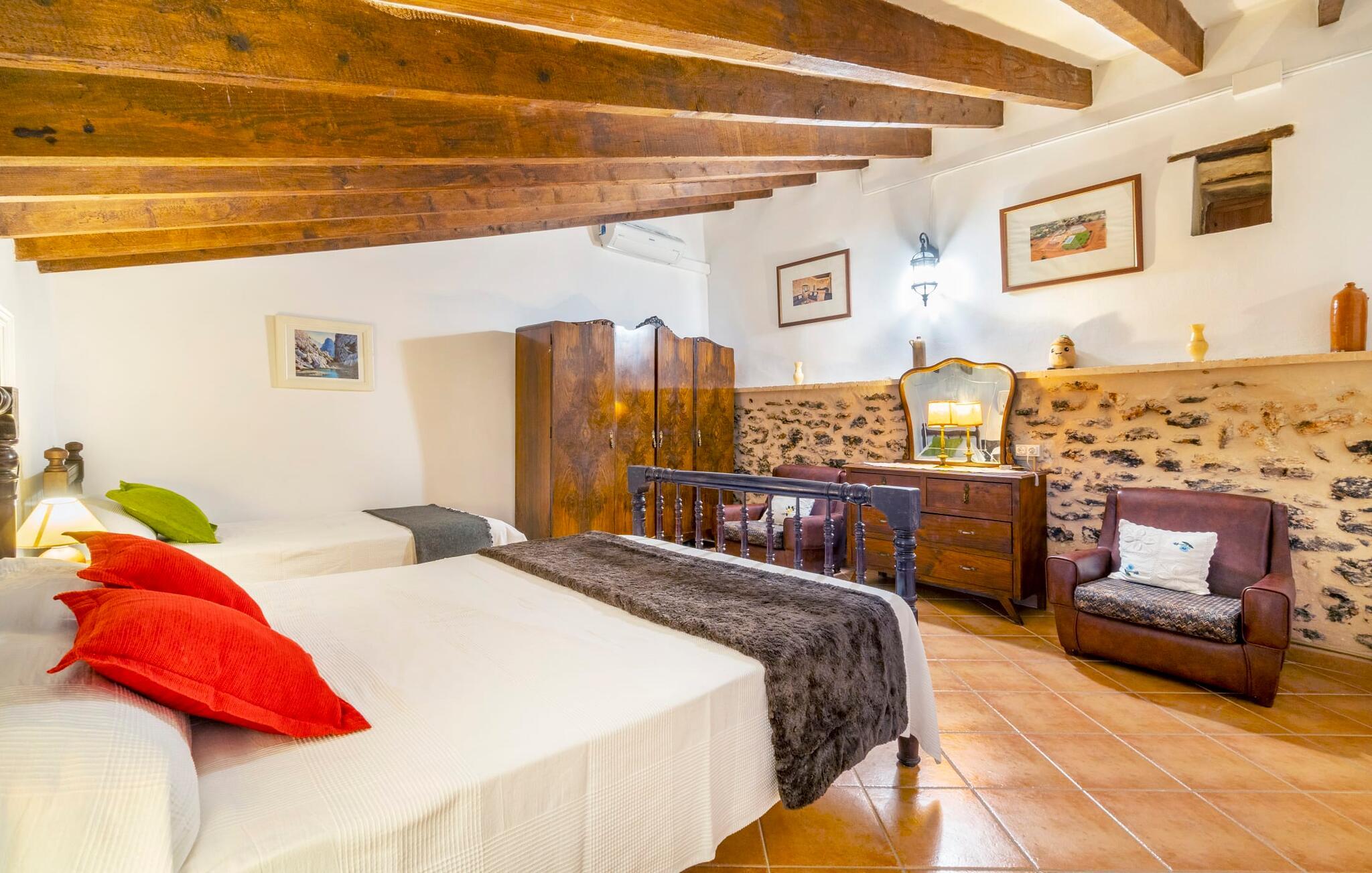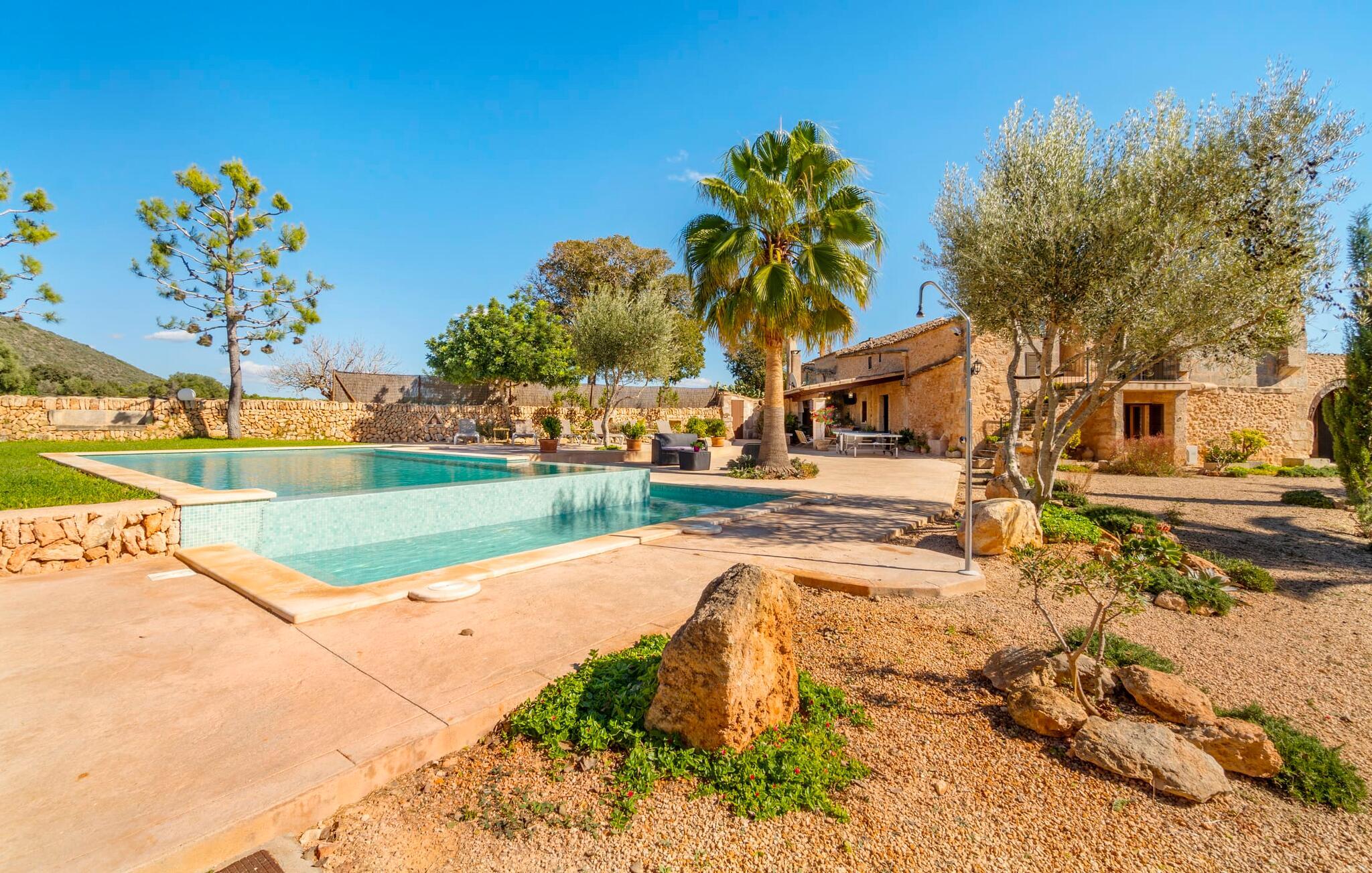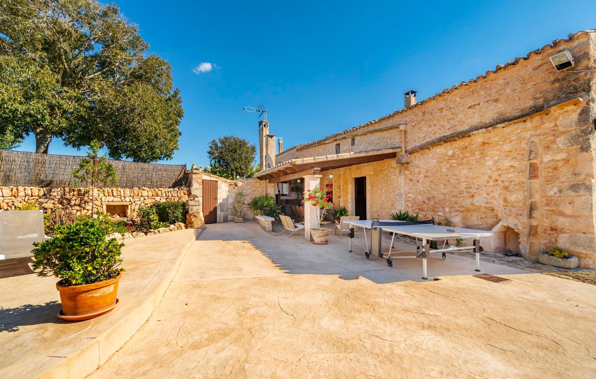 Den godt gemte villa “Son Gabriela” byder sine gæster velkommen i en helt landlig atmosfære og med en utrolig ro, der omgiver ejendommen. I den rummelige have, der stort set er dækket af let sandstensgrus, vil selv tilflyttere straks føle sig hjemme og få lyst til at blive. En lille græsplæne ved siden af poolen skaber et interessant og varieret overordnet udseende og tilbyder et malerisk legeområde for alle børn, der rejser med jer. Der er terrasser mellem huset og poolen, hver med adskillige dejlige siddepladser, hvor I kan slappe af i det fri. Siddepladserne, som blev bygget direkte ind i de små naturstensvægge, er særdeles elegante og indbydende. Dette er et fantastisk sted at fordrive tiden og lade jeres blik vandre over haven. Lige ved siden af huset ligger den overdækkede terrasse, som giver de perfekte rammer til at spise sammen takket være sit store spisebord. Her er også bekvemt installeret en indbygget grill, så I frisk kan tilberede og nyde regionens lækkerier. En stilfuld dobbeltpool, dekoreret med turkise mosaikfliser, er et rigtigt blikfang for store og små. Her kan I køle ned og finde en behagelig forfriskning på varme dage. Den store pool er let tilgængelig via en bred trappe og har en maksimal dybde på 1,90 m. Der er så meget privat jord omkring selve ejendommen, at enhver, der lejer denne ejendom, praktisk talt kan gå en tur uden at skulle vove sig ud af sin egen lille. areal. Med denne ejendom bor I så at sige i et dobbelthus. Den anden del af huset er dog ubeboet, så I kan nyde jeres ferie i fuldstændig privatlivets fred. Huset har egen parkeringsplads, som ligger ca. 20 m fra ejendommen. Selve huset er opdelt som følger: I stueplan er der en fantastisk entré, et rummeligt køkken med spisebord, en tv-stue og et badeværelse. Der er også en trappe, der fører til kælderen. De fire soveværelser og to badeværelser er placeret på øverste etage. En af dem er tilgængelig udefra, så man kan få adgang til badeværelset fra soveværelset via altanen. Det indre af villaen "Son Gabriela" er designet i den typiske mallorcanske stil, hvilket giver ejendommen en særlig rustik atmosfære. I hele ejendommen vil I støde på en overflod af smukke, ægte antikke møbler, som harmonerer perfekt med de farverige vægge, synlige bjælker og terracotta fliser. Her og der ses dekorative naturstenselementer. En række forskellige opholdsområder gør det nemt for jer at sprede jer efter hjertens lyst og finde mindst et af de mange indbydende steder, der inviterer jer til at slappe af. Det hyggelige køkken er veludstyret til jeres daglige behov og byder på alt fra en kedel til en filterkaffemaskine. Til kølige aftener er der endda en pejs, hvor I kan sidde sammen ved spisebordet og nyde et måltid. I spektakulært smukke soveværelser kan alle finde et sted at hvile, der passer præcis til deres behov. Også her finder vi antik flair og et absolut charmerende arrangement. Badeværelserne er indrettet i en moderne og meget smagfuld stil. Det er ikke nødvendigt at medbringe eget strygejern og hårtørrer, da disse allerede er tilgængelige på stedet og kan benyttes gratis under jeres ferie. I kan bekvemt opbevare jeres mad køligt i kælderen. Har I lyst til at tage ud og gå på opdagelse, kan I bruge en dag på en af de populære strande i området. Disse omfatter blandt andre Platja de sa Rapita og Es Freu de Ses Covetes. Det flade, landlige landskab omkring Llucmajor har også et veludviklet netværk af cykelstier, som enhver sportsentusiast vil nyde. Der er et landmandsmarked i Llucmajor tre dage om ugen: søndage, onsdage og fredage. Efter at have handlet efter det, I har brug for på markedet, kan I besøge en af de smukke caféer på Plaça Espanya og fortsætte med at se travlheden omkring jer, før I tager hjem til jeres tilflugtssted "Son Gabriela" og selv ser jer omkring. Tilbring dagen i måden I vælger. Villaen "Son Gabriela" er et charmerende tilflugtssted i den sydlige del af øen, omkring 7 km sydøst for Llucmajor. De lokale strande er nemme at nå. Ø-metropolen Palma de Mallorca ligger omkring 30 minutter væk i bil.