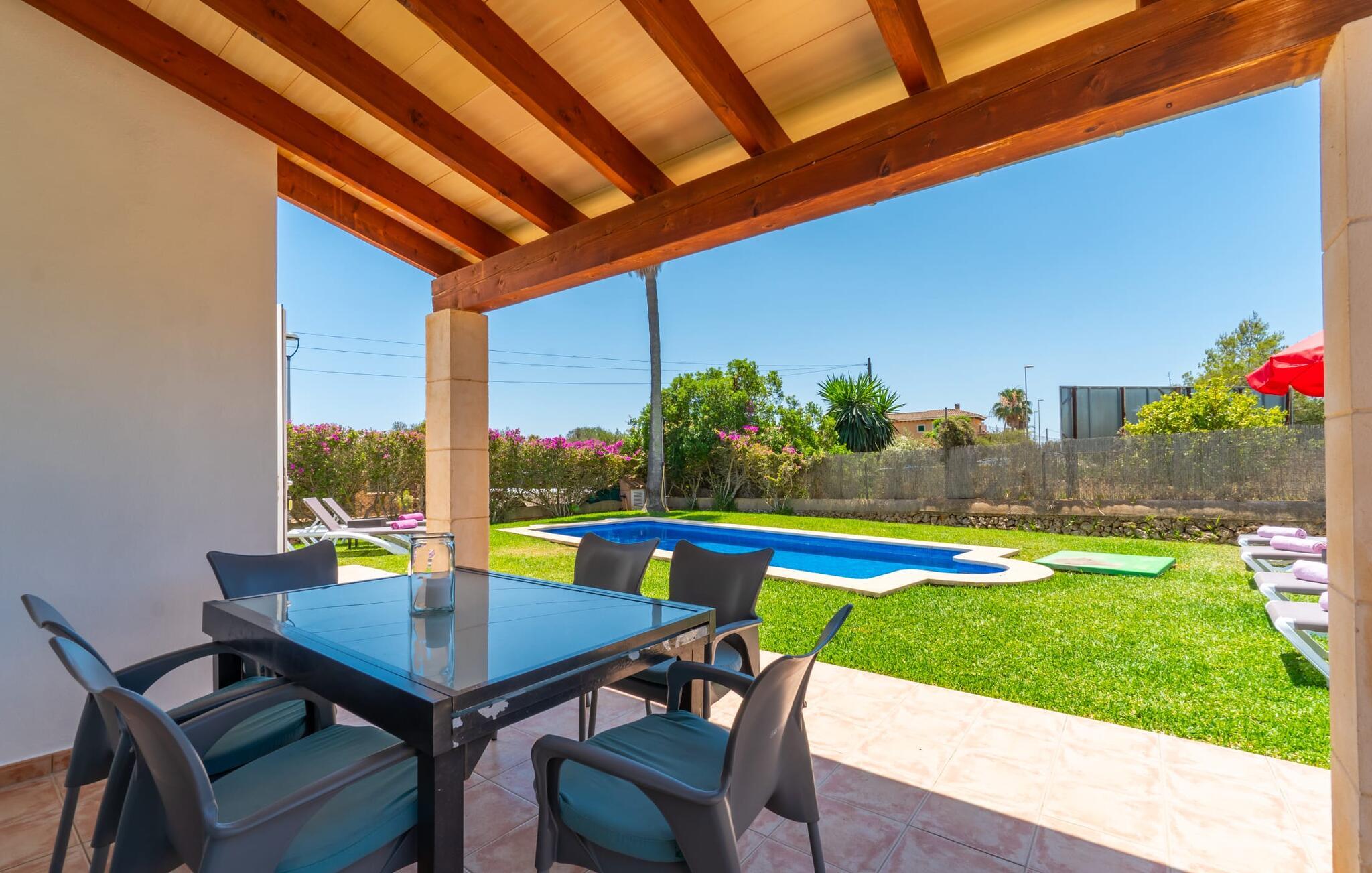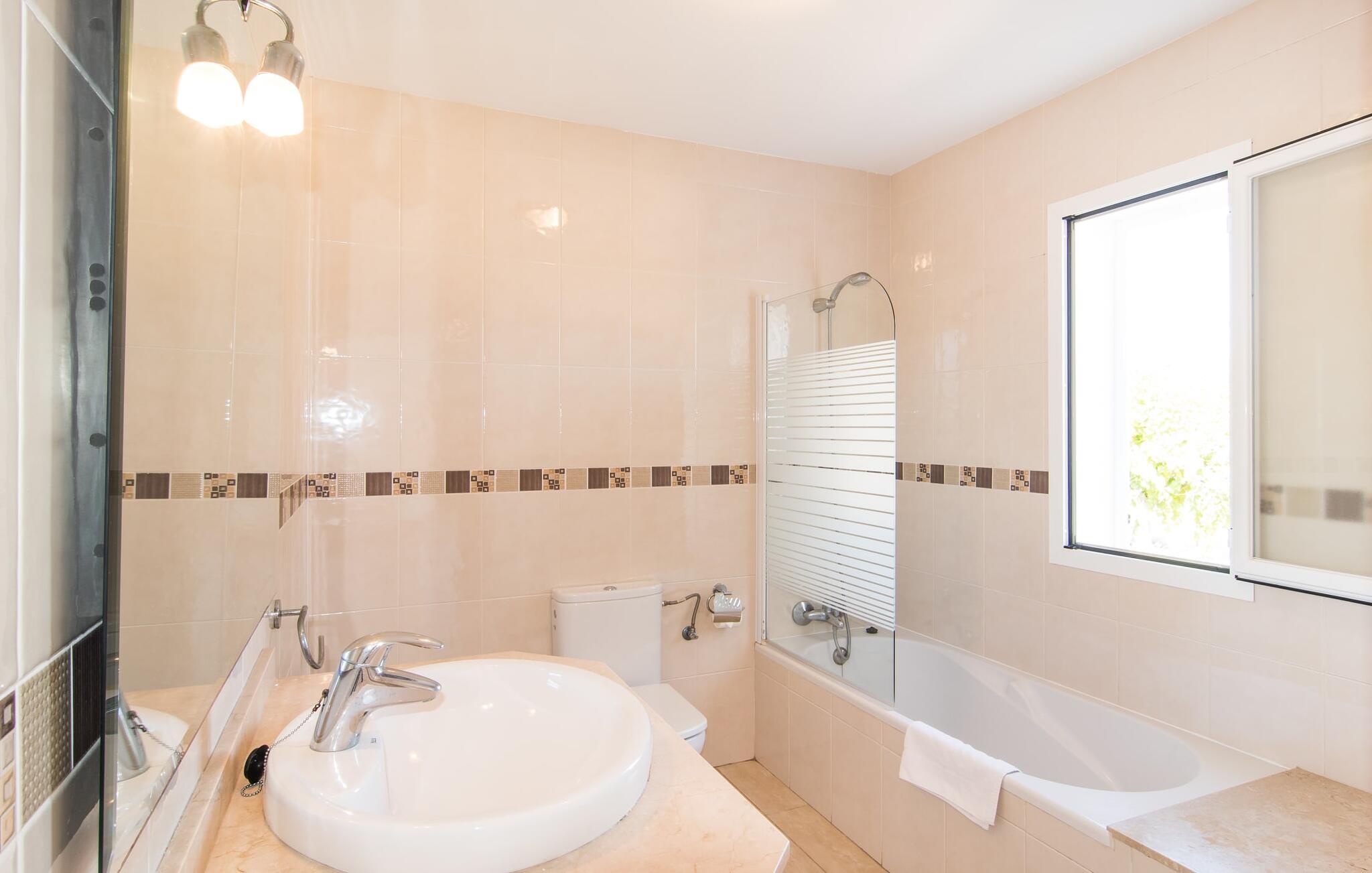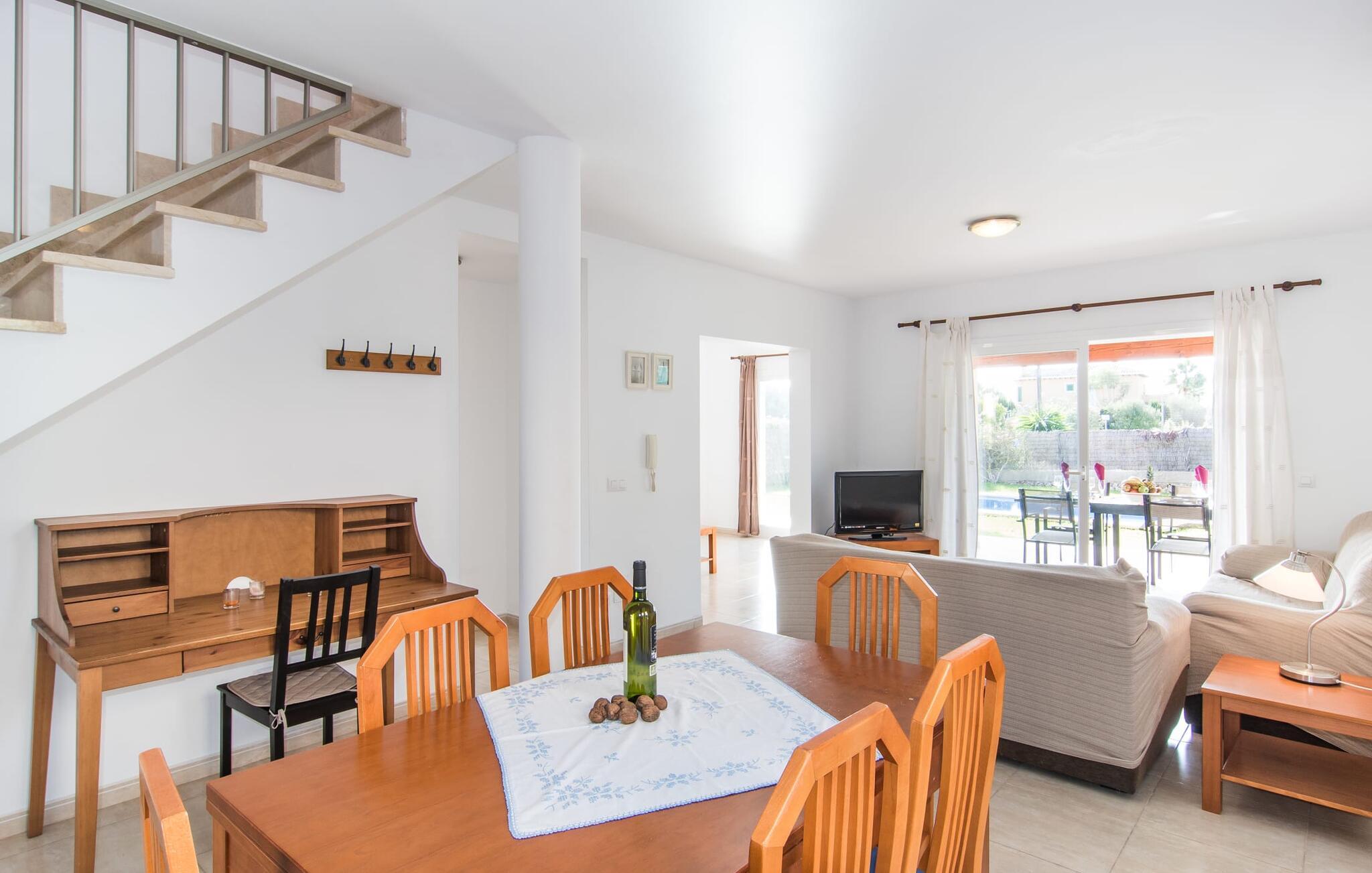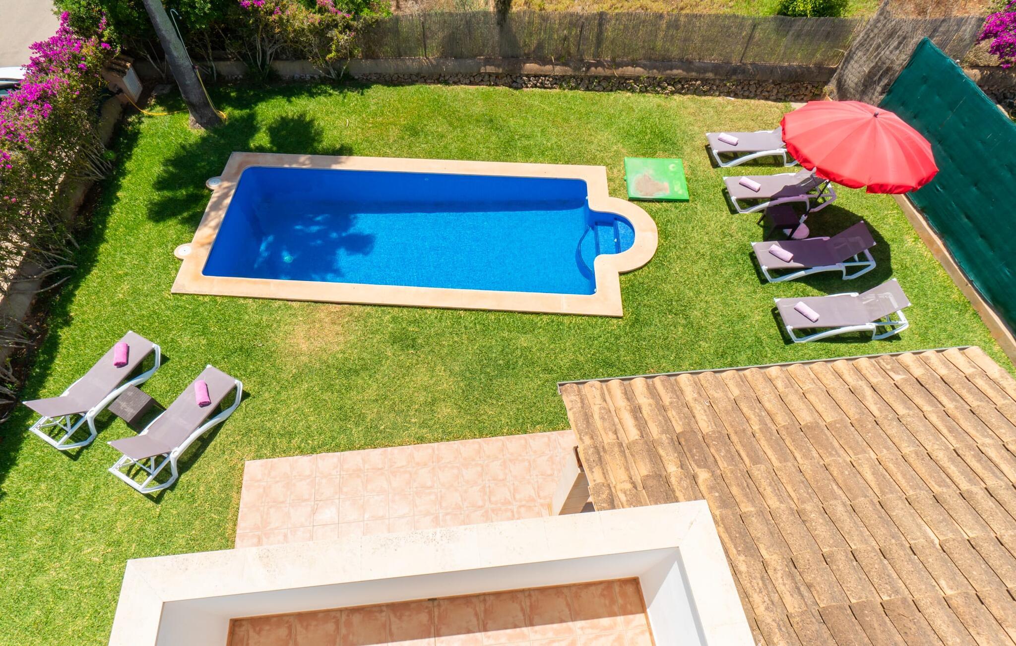 Din ferie begynder enkelt og nemt, så snart I ankommer: Kun en times kørsel, udelukkende på asfaltveje, tager jer fra lufthavnen til villaen, hvor I hurtigt kan slå jer ned og slappe af. Efter jeres ankomst vil I måske nyde en kølig drink på terrassen, som takket være sit tag tilbyder et behageligt sted at slappe af selv i varmt sommervejr. Hvis vejret er godt, kan det smukke bord blive rammen om alle måltider sammen de kommende dage. Selvom en lækker morgenmad i disse omgivelser bestemt er en særlig fornøjelse, vil den nærliggende indbyggede grill sandsynligvis også opmuntre jer til at nyde kulinariske lækkerier sammen om aftenen. Hvem bliver den første til at hoppe i poolens kølige vand? Med en dybde på mellem 0,80 og 2 m og en længde på 8 m er poolen dekoreret med blå mosaikfliser og små halvcirkelformede trin en fremragende base for varme solrige dage, hvor det store palmetræ giver ekstra skygge. Til solbadning kan I placere de komfortable liggestole i haven som ønsket. Vil I se verden fra oven, så tag til tagterrassen, som ligger på husets første sal og også har udsigt til haven. Terrassen i stueplan fører direkte ind i opholds- og spisestuen, som bekvemt er opdelt i to områder, så I kan slappe af indendørs uden at komme i vejen for hinanden. Sofaen er det perfekte sted at komfortabelt se tv; Flere borde inviterer jer til at læse eller skrive - hvad med at sende et godt gammeldags postkort til jeres familie og venner derhjemme? Spisebordet kan nemt rumme hele jeres gruppe til indendørs spisning, hvilket kan være særligt fristende på en doven dag, da turen til køkkenet er behagelig kort. I brun og sølv stil tilbyder det omfattende udstyret køkken et fremragende grundlag for selvforplejning, og det store køleskab/fryser holder feriebaren pålideligt kølig. Et soveværelse med to enkeltsenge og et badeværelse er også i stueetagen. En enkel trappe fører jer op og videre til de to ekstra soveværelser - begge med dobbeltsenge på 1,80 x 2,00 m, hvoraf det ene har eget badeværelse. Villaen har i alt tre brusere og et badekar på sine tre badeværelser. Villaernes særlige tiltrækningskraft på den sydøstlige del af øen er blandt andet deres nærhed til det såkaldte "Calas de Mallorca". Disse mange små, delvist ubebyggede sandbugter, med deres ofte fine sand og lavvandede indsejling i vandet, er ideelle for familier med små børn. Den lille vej nær huset fører jer hurtigt til talrige smukke udflugts- og bademål, herunder den velbeskyttede badebugt Cala Murada, hvor det blå flag for rent vand flyver i vinden, og hvor der er liggestole, toiletfaciliteter, osv. Strandbaren dækker en lang række behov. I bør bestemt planlægge et besøg på de smukke strande ved Son S'Arenal i Porto Colom (ca. 10 km) og Cala Sa Nau i S`Horta (ca. 14 km)! Regionen omkring Cales de Mallorca med dens rigdom af huler bringer historien til live, og en tur til det nærliggende kloster San Salvador lover en fantastisk udsigt. Nyd den urbane følelse, gå til stranden og ind i landsbyen med dens supermarkeder og barer - villaen "Son Ganxo Uno" gør det muligt! Med Cala d'Or, Portocolom og Porto Cristo inden for 20 km, sørger promenader, gode restauranter og lystbådehavne for fornøjelse og nydelse. Husets styrker: Terrasse med muret grill, privat græsplæne og pool udenfor, to skriveborde til hjemmekontorer i stueetagen.
