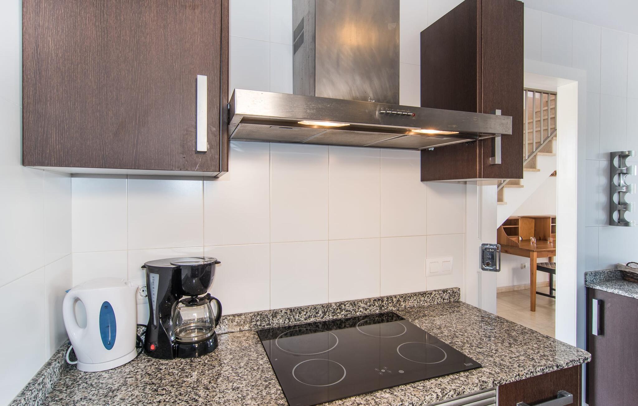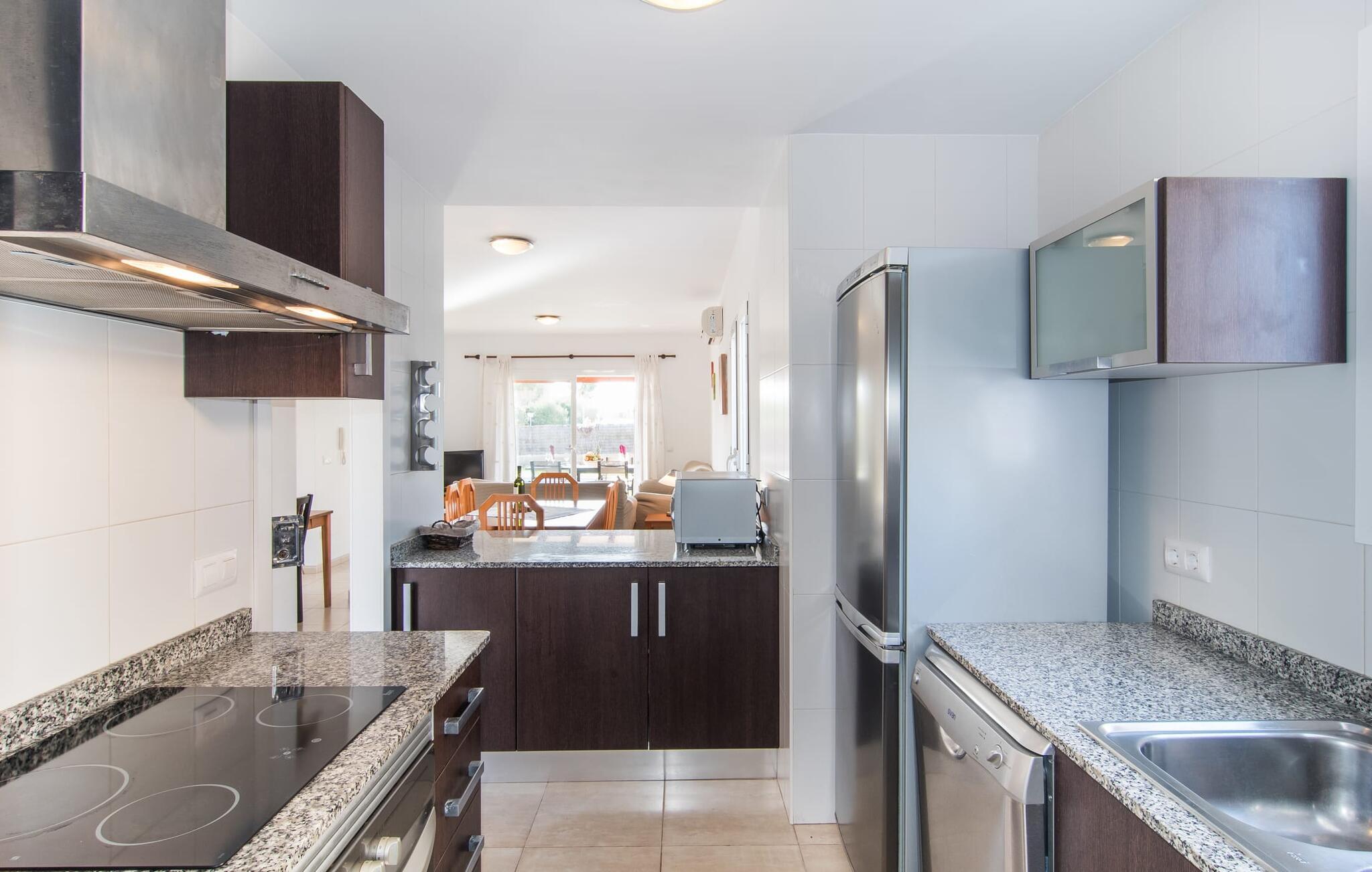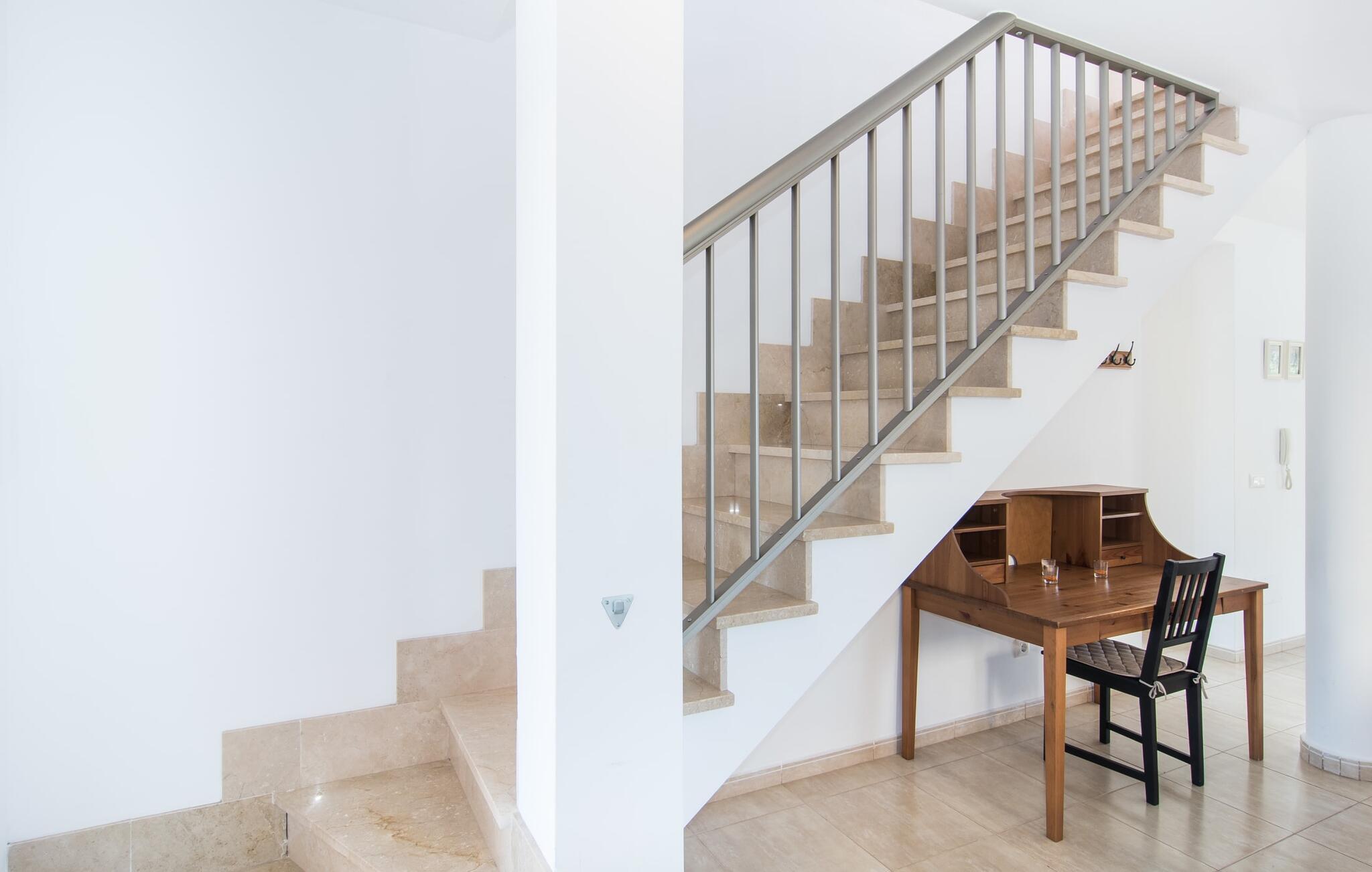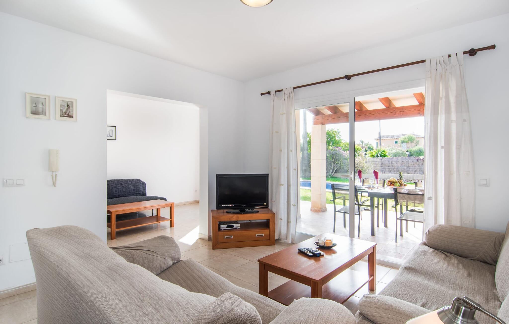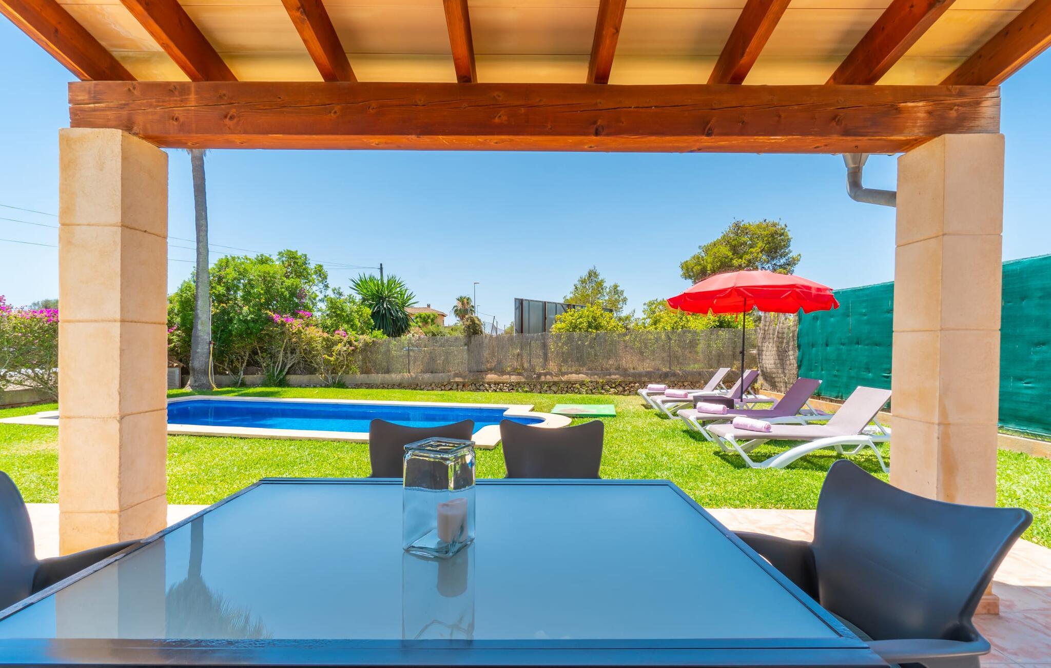 Din ferie begynder enkelt og nemt, så snart I ankommer: Kun en times kørsel, udelukkende på asfaltveje, tager jer fra lufthavnen til villaen, hvor I hurtigt kan slå jer ned og slappe af. Efter jeres ankomst vil I måske nyde en kølig drink på terrassen, som takket være sit tag tilbyder et behageligt sted at slappe af selv i varmt sommervejr. Hvis vejret er godt, kan det smukke bord blive rammen om alle måltider sammen de kommende dage. Selvom en lækker morgenmad i disse omgivelser bestemt er en særlig fornøjelse, vil den nærliggende indbyggede grill sandsynligvis også opmuntre jer til at nyde kulinariske lækkerier sammen om aftenen. Hvem bliver den første til at hoppe i poolens kølige vand? Med en dybde på mellem 0,80 og 2 m og en længde på 8 m er poolen dekoreret med blå mosaikfliser og små halvcirkelformede trin en fremragende base for varme solrige dage, hvor det store palmetræ giver ekstra skygge. Til solbadning kan I placere de komfortable liggestole i haven som ønsket. Vil I se verden fra oven, så tag til tagterrassen, som ligger på husets første sal og også har udsigt til haven. Terrassen i stueplan fører direkte ind i opholds- og spisestuen, som bekvemt er opdelt i to områder, så I kan slappe af indendørs uden at komme i vejen for hinanden. Sofaen er det perfekte sted at komfortabelt se tv; Flere borde inviterer jer til at læse eller skrive - hvad med at sende et godt gammeldags postkort til jeres familie og venner derhjemme? Spisebordet kan nemt rumme hele jeres gruppe til indendørs spisning, hvilket kan være særligt fristende på en doven dag, da turen til køkkenet er behagelig kort. I brun og sølv stil tilbyder det omfattende udstyret køkken et fremragende grundlag for selvforplejning, og det store køleskab/fryser holder feriebaren pålideligt kølig. Et soveværelse med to enkeltsenge og et badeværelse er også i stueetagen. En enkel trappe fører jer op og videre til de to ekstra soveværelser - begge med dobbeltsenge på 1,80 x 2,00 m, hvoraf det ene har eget badeværelse. Villaen har i alt tre brusere og et badekar på sine tre badeværelser. Villaernes særlige tiltrækningskraft på den sydøstlige del af øen er blandt andet deres nærhed til det såkaldte "Calas de Mallorca". Disse mange små, delvist ubebyggede sandbugter, med deres ofte fine sand og lavvandede indsejling i vandet, er ideelle for familier med små børn. Den lille vej nær huset fører jer hurtigt til talrige smukke udflugts- og bademål, herunder den velbeskyttede badebugt Cala Murada, hvor det blå flag for rent vand flyver i vinden, og hvor der er liggestole, toiletfaciliteter, osv. Strandbaren dækker en lang række behov. I bør bestemt planlægge et besøg på de smukke strande ved Son S'Arenal i Porto Colom (ca. 10 km) og Cala Sa Nau i S`Horta (ca. 14 km)! Regionen omkring Cales de Mallorca med dens rigdom af huler bringer historien til live, og en tur til det nærliggende kloster San Salvador lover en fantastisk udsigt. Nyd den urbane følelse, gå til stranden og ind i landsbyen med dens supermarkeder og barer - villaen "Son Ganxo Uno" gør det muligt! Med Cala d'Or, Portocolom og Porto Cristo inden for 20 km, sørger promenader, gode restauranter og lystbådehavne for fornøjelse og nydelse. Husets styrker: Terrasse med muret grill, privat græsplæne og pool udenfor, to skriveborde til hjemmekontorer i stueetagen.