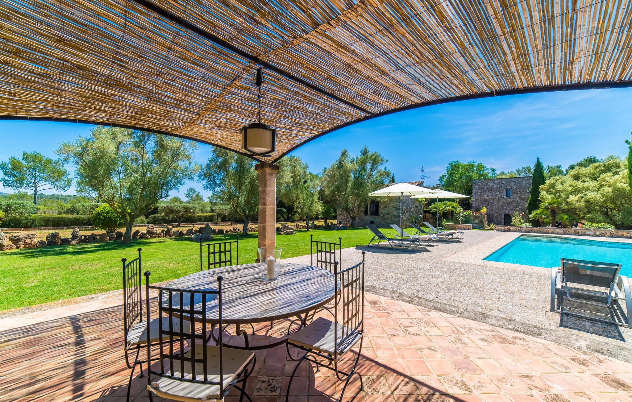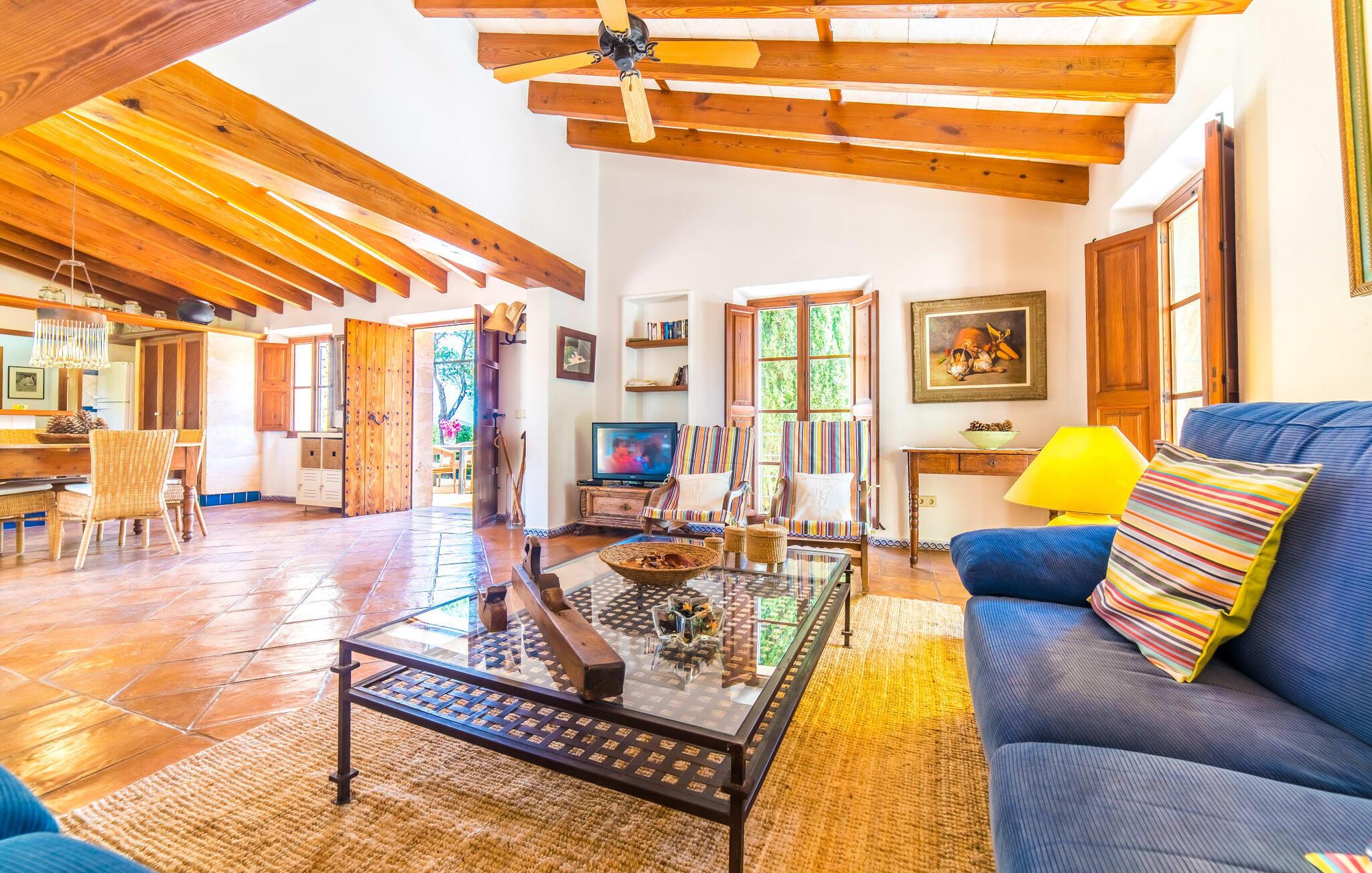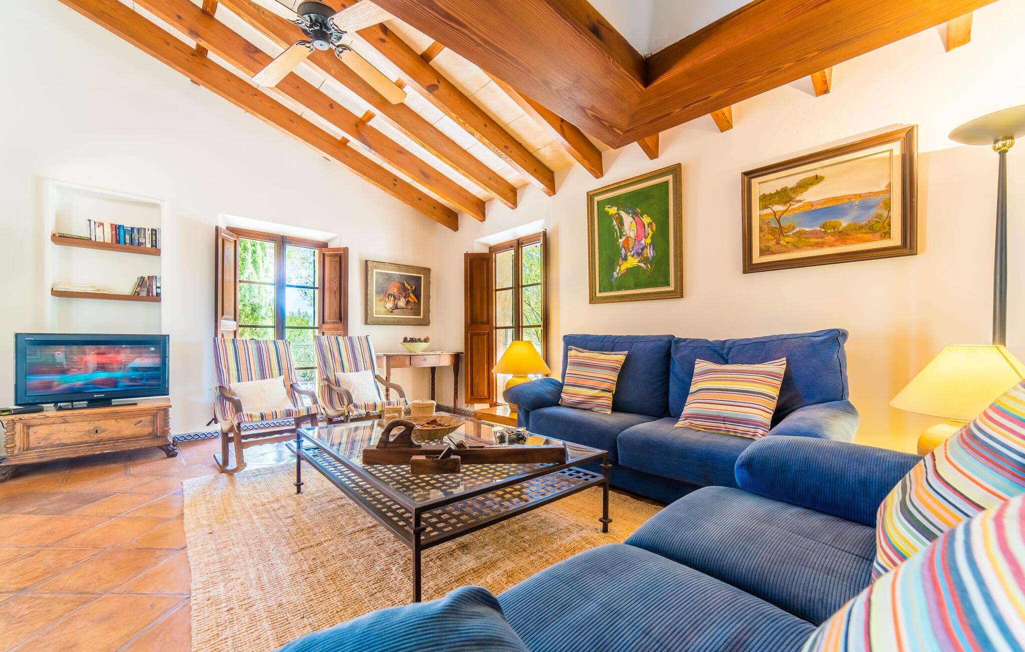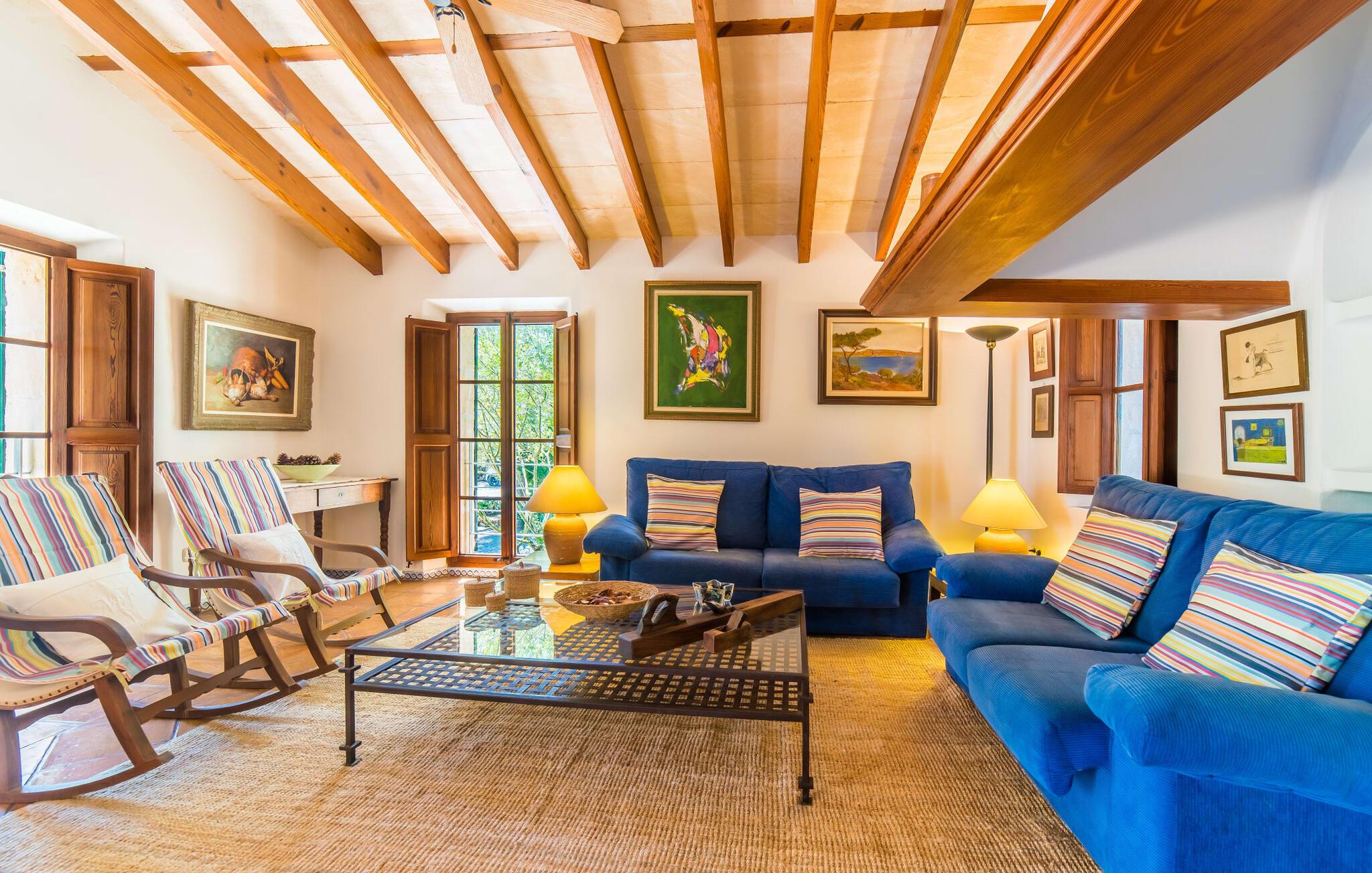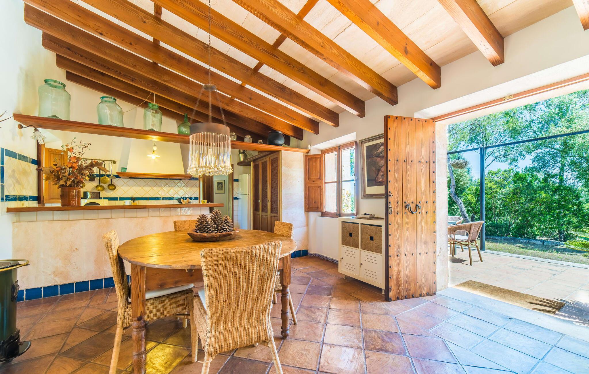 Naturstensvillaen "Son Guillotet" blev bygget på en meget smuk 120.000 kvadratmeter stor grund. Det er kendetegnet ved sin afsides beliggenhed midt i et uberørt naturlandskab med frodig vegetation lige ved siden af huset. En del af det huser en have og byder på adskillige områder til solbadning og skyggefulde træer. Her vokser hovedsageligt middelhavsplanter, herunder oliventræer og nogle få imponerende palmer. Den rolige atmosfære omkring huset er præget af naturens lyde og tilbyder de ideelle rammer for privat afslapning og rekreation. En stor 66 kvadratmeter infinity pool er integreret i det store havelandskab og sørger for, at I holder jer dejlig frisk på varme dage. Det har nem adgang og er omgivet af en omsluttende terrasse med adskillige komfortable liggestole. Er sollyset for kraftigt, kan I selvfølgelig bruge en parasol. Derudover inviterer et hyggeligt opholdsområde under et let bambustag til at slappe af og blive hængende. Herfra har I den bedste udsigt over pool og græsplæner og kan holde øje med børnene, der leger og svømmer, hvis det er nødvendigt. Her kan I sidde skønt og nyde idyllen når som helst på dagen eller natten. Stien fører fra poolterrassen, kun få meter væk, til villaen. En romantisk overdækket terrasse dækket med vinstokke venter gæsterne her. Alt efter jeres ønsker kan I sidde ved det smukke spisebord eller tage plads ved et af de vægmaleriagtige siddepladser. Andre designede hjørner og nicher omkring villaen inviterer til at finde nye yndlingssteder igen og igen og til at opleve dette smukke stykke jord intensivt. For sportsentusiaster er der et bordtennisbord under den luftige skygge. I vil måske også bruge grillen og nyde friske middelhavsdelikatesser ved en kulinarisk grill en aften. Den tiltalende atmosfære fortsætter inde i villaen. Der er en kombineret stue/alrum/køkken, som umiddelbart fremstår hyggeligt og stemningsfuldt med harmonisk afstemte materialer og farvekombinationer. Brugen af massive trælofter, vinduer og møbler samt lyse og muntre farver er her et smart valg. Den åbne pejs i hjørnet af stuen og den lille ovn i spisepladsen fremtryller yderligere hygge. Det runde spisebord, hvorfra man har en vidunderlig udsigt til terrassen og haven bagved, byder på plads til seks personer. Det integrerede, separate køkken er adskilt af en bordplade og er fuldt udstyret. Ud over en kedel og en Nespresso-kaffemaskine har den også et køleskab, en ovn, en keramisk kogeplade og en vaskemaskine. Soveværelserne er oplyste og har lyse farver, hyggelige loftsbjælker og sparsomt doserede farver, men har ikke påtrængende tilbehør. Komfortable 1,60 x 2,00 m senge sikrer en afslappende søvn. De tre badeværelser er rummelige og indrettet i moderne stil, med flotte væg- og gulvfliser og æstetisk tiltalende indretning. I kan nemt lade jeres hårtørrer og strygejern blive derhjemme. Ekstraordinær og meget smuk naturstensvilla på en smuk, rummelig ejendom nær Ariany på øens kyst. Petra tilbyder den perfekte mulighed for dagligvareindkøb. Der er et ugentligt marked her om onsdagen med et stort udvalg af friske spanske produkter. De nærmeste strande er for eksempel den smukke sandstrand Son Serra de Marina eller Cas Capellans. Bemærk venligst, at denne ejendom ikke accepterer ungdomsgrupper eller polterabender. En ungdomsgruppe på denne ejendom består af personer på 28 år eller derunder. Book ikke denne ejendom, hvis I er en ungdomsgruppe eller polterabend, da jeres reservation vil blive afvist, når den er booket, hvilket også kan være tilfældet ved ankomst til ejendommen eller under jeres ophold, og I vil ikke modtage en refusion