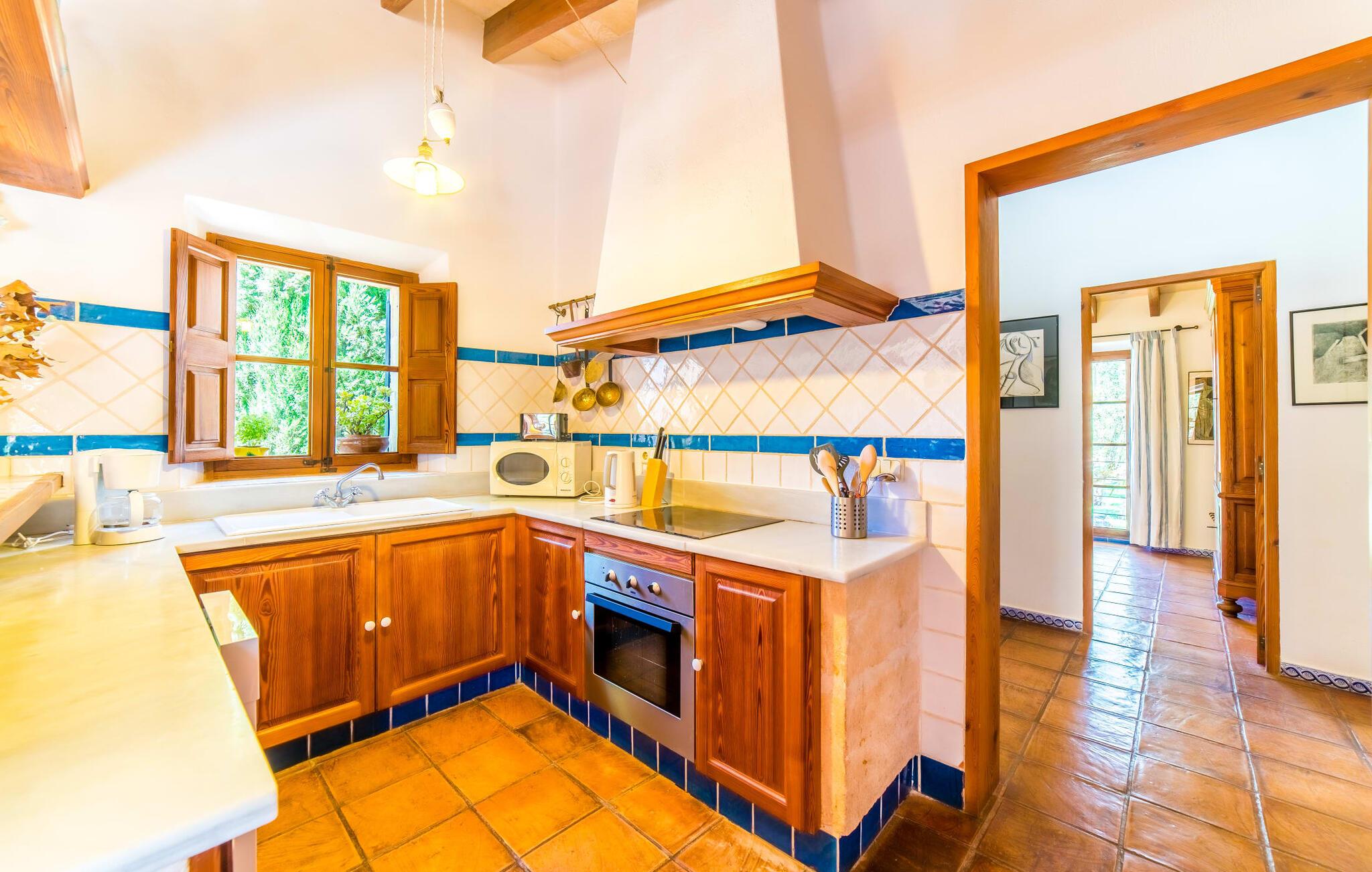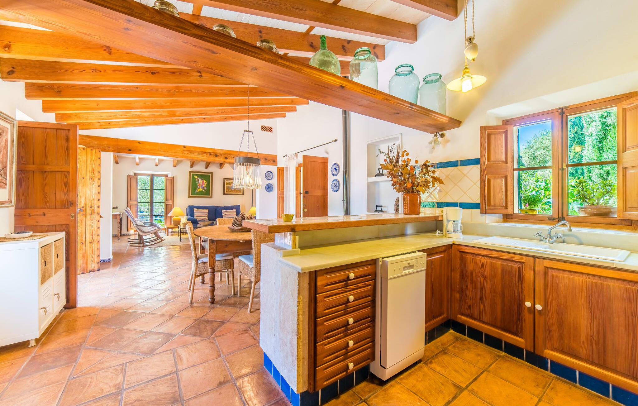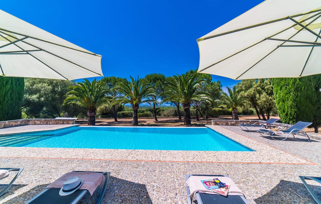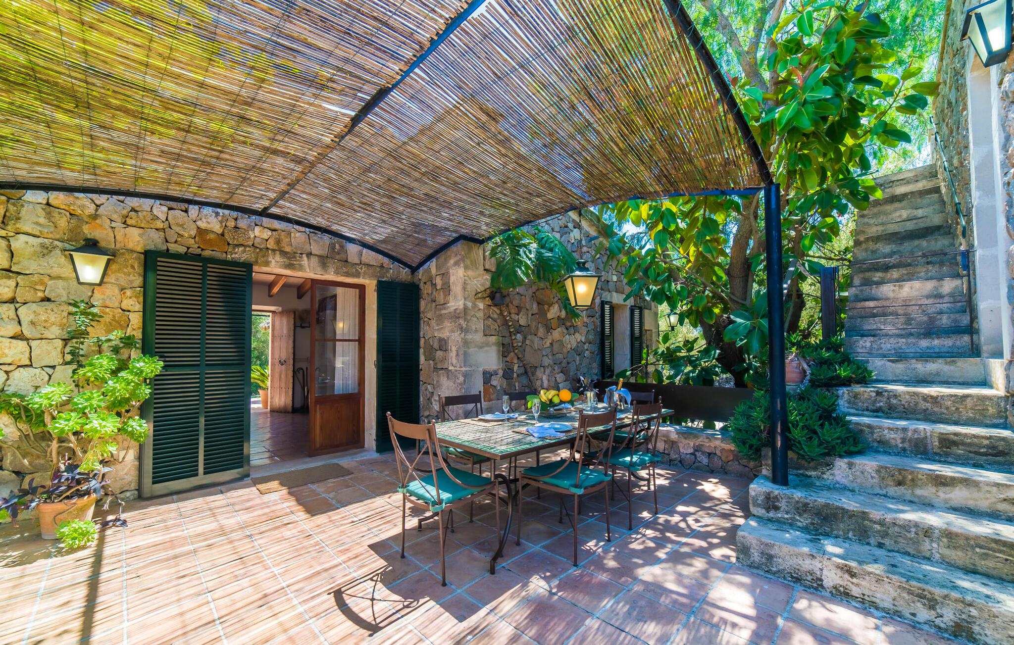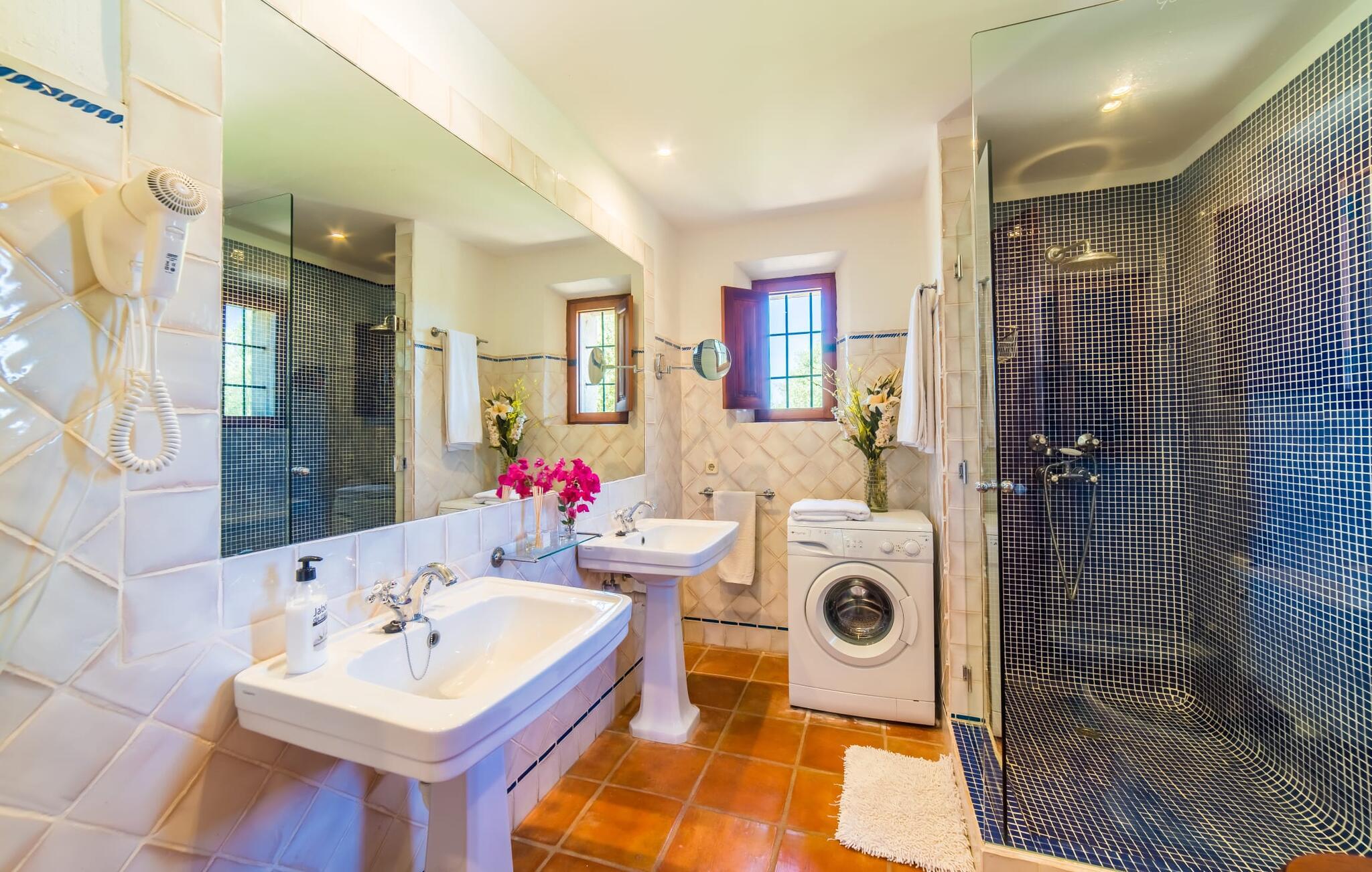 Naturstensvillaen "Son Guillotet" blev bygget på en meget smuk 120.000 kvadratmeter stor grund. Det er kendetegnet ved sin afsides beliggenhed midt i et uberørt naturlandskab med frodig vegetation lige ved siden af huset. En del af det huser en have og byder på adskillige områder til solbadning og skyggefulde træer. Her vokser hovedsageligt middelhavsplanter, herunder oliventræer og nogle få imponerende palmer. Den rolige atmosfære omkring huset er præget af naturens lyde og tilbyder de ideelle rammer for privat afslapning og rekreation. En stor 66 kvadratmeter infinity pool er integreret i det store havelandskab og sørger for, at I holder jer dejlig frisk på varme dage. Det har nem adgang og er omgivet af en omsluttende terrasse med adskillige komfortable liggestole. Er sollyset for kraftigt, kan I selvfølgelig bruge en parasol. Derudover inviterer et hyggeligt opholdsområde under et let bambustag til at slappe af og blive hængende. Herfra har I den bedste udsigt over pool og græsplæner og kan holde øje med børnene, der leger og svømmer, hvis det er nødvendigt. Her kan I sidde skønt og nyde idyllen når som helst på dagen eller natten. Stien fører fra poolterrassen, kun få meter væk, til villaen. En romantisk overdækket terrasse dækket med vinstokke venter gæsterne her. Alt efter jeres ønsker kan I sidde ved det smukke spisebord eller tage plads ved et af de vægmaleriagtige siddepladser. Andre designede hjørner og nicher omkring villaen inviterer til at finde nye yndlingssteder igen og igen og til at opleve dette smukke stykke jord intensivt. For sportsentusiaster er der et bordtennisbord under den luftige skygge. I vil måske også bruge grillen og nyde friske middelhavsdelikatesser ved en kulinarisk grill en aften. Den tiltalende atmosfære fortsætter inde i villaen. Der er en kombineret stue/alrum/køkken, som umiddelbart fremstår hyggeligt og stemningsfuldt med harmonisk afstemte materialer og farvekombinationer. Brugen af massive trælofter, vinduer og møbler samt lyse og muntre farver er her et smart valg. Den åbne pejs i hjørnet af stuen og den lille ovn i spisepladsen fremtryller yderligere hygge. Det runde spisebord, hvorfra man har en vidunderlig udsigt til terrassen og haven bagved, byder på plads til seks personer. Det integrerede, separate køkken er adskilt af en bordplade og er fuldt udstyret. Ud over en kedel og en Nespresso-kaffemaskine har den også et køleskab, en ovn, en keramisk kogeplade og en vaskemaskine. Soveværelserne er oplyste og har lyse farver, hyggelige loftsbjælker og sparsomt doserede farver, men har ikke påtrængende tilbehør. Komfortable 1,60 x 2,00 m senge sikrer en afslappende søvn. De tre badeværelser er rummelige og indrettet i moderne stil, med flotte væg- og gulvfliser og æstetisk tiltalende indretning. I kan nemt lade jeres hårtørrer og strygejern blive derhjemme. Ekstraordinær og meget smuk naturstensvilla på en smuk, rummelig ejendom nær Ariany på øens kyst. Petra tilbyder den perfekte mulighed for dagligvareindkøb. Der er et ugentligt marked her om onsdagen med et stort udvalg af friske spanske produkter. De nærmeste strande er for eksempel den smukke sandstrand Son Serra de Marina eller Cas Capellans. Bemærk venligst, at denne ejendom ikke accepterer ungdomsgrupper eller polterabender. En ungdomsgruppe på denne ejendom består af personer på 28 år eller derunder. Book ikke denne ejendom, hvis I er en ungdomsgruppe eller polterabend, da jeres reservation vil blive afvist, når den er booket, hvilket også kan være tilfældet ved ankomst til ejendommen eller under jeres ophold, og I vil ikke modtage en refusion