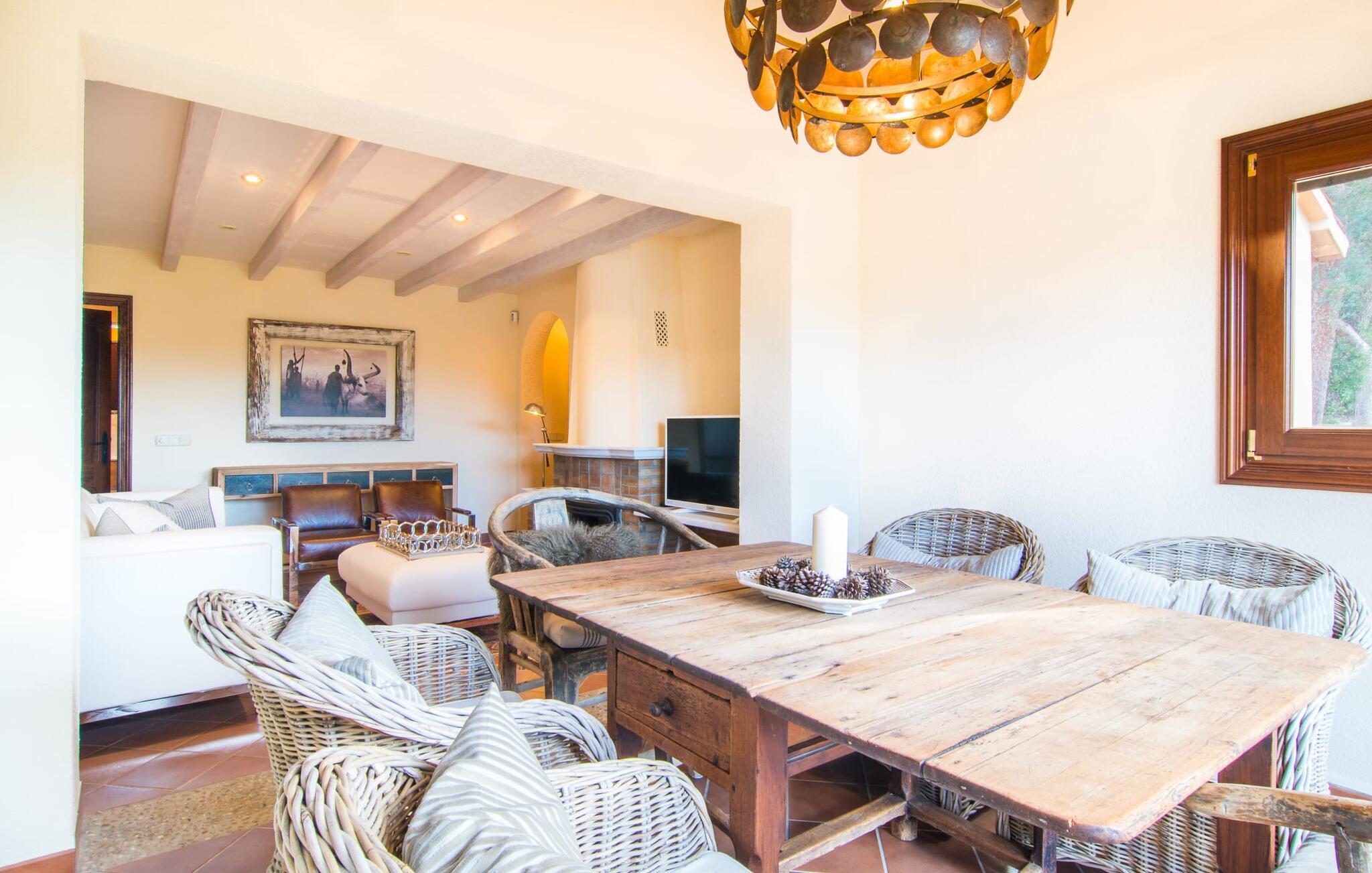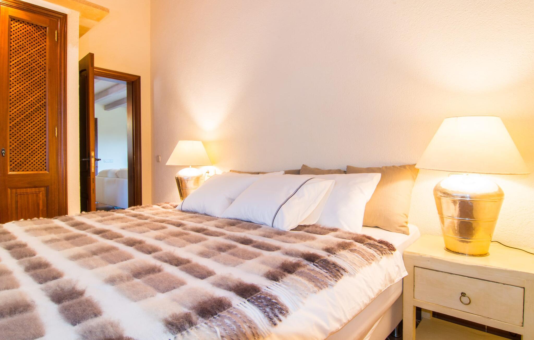 Denne kørestolsvenlige villa i bungalowstil til 4 personer ligger i skyggen af høje fyrretræer, som tilføjer et særligt touch til ejendommen og ikke blokerer for solens vej. Tidligere brugt som gæstehus i hovedhuset "Son Jaumell Gran", forbliver det grundlæggende tro mod sit formål og rummer nu feriegæster med egen forplejning med separat adgang og privatliv. En overdækket terrasse med udsigt - nogle gange kigger endda havet igennem -, poolen, en velholdt græsplæne, landskabsplanter og små palmer indrammer dekorativt det noget ældre hus, som ikke viser tegn på træthed. Hertil kommer den øverste beliggenhed, som vil være misundelig for mange: kun 5 minutter i bil til Cala Ratjada for at nyde fremragende fisk og kun 15 minutter til fods til Capdepera og den naturlige strand Cala Agulla. Man kan næsten sige, at man booker villaen “Son Jaumell” med havet og badebugten. Her er en lille gårdfølelse: en gang om året græsser køer på en afsidesliggende del af ejendommen. Derudover har nogle af de mennesker, der arbejder her, som livredderen og gartneren, hunde, som de af og til har med. De nuværende ejeres opholdsrum er nænsomt indrettet og klædt: møbler med rustik charme, komplet køkkenudstyr og højkvalitets, rygvenlige madrasser har givet huset et nyt look, som både store og små gæster kan finde sig selv i: tidløst - sådan vil I altid have det, især på ferie. Det åbne, hyggelige opholds- og spiseområde, som emmer af et strejf af en afrikansk lodge, omfatter også det lille køkken med bord og siddepladser, som smart fylder sin egen plads. Det er simpelthen guddommeligt, når I får serveret udsigt over landskabet under jeres morgenmorgenmad; Den store glasfront kan også skubbes til siden om nødvendigt. Et kæmpe fjernsyn i pejsehjørnet giver lyst til at sætte fødderne op og nyde en film- eller sportsaften ved det knitrende bål. Og to næsten identisk indrettede soveværelser med en bred dobbeltseng og hver sin brusebakke gør det nemt at vælge et sted – her har hvert par og hver tandbørste sit eget rige. Konklusion: Ikke for stor og ikke for lille, lige akkurat som "feriehus" til fire personer. Som en lille bonus til den hjemlige karakter har huset en pilleovn, der varmer huset op og sørger for, at det stadig er perfekt indbydende selv i de koldere måneder. Øens historie, strande, piratgrotter og det høje liv: I behøver ikke gå langt for at nyde det bedste af det hele. Der kan af og til høres trafikstøj på villaens ejendom. Dette er dog mere end det værd, da forbindelsen er så god, og andre feriesteder er nemme at komme til. For eksempel troner Castell de Capdepera fra erobringskrigenes tid på en bakke; Citadellet fungerer som museum for traditionel kurvefletning med palmeblade. Om tirsdagen kan I tage til Artàs farverige ugentlige marked og slentre gennem gallerier, butikker og kunstnercaféer. Nyd en sundowner i Stingray Bay, i det populære Cala Ratjada, hvor I finder andre historiske fiskerhytter og mange gode restauranter omkring den smukke havnepromenade. Eller brug hele dage på stranden: Bystranden Playa Son Moll, den lille kattebugt Cala Gat og den naturbeskyttede Playa Cala Agulla er blot et lille udvalg af muligheder mellem idyl og festzone. Har vi lovet jer for meget med "topplaceringen"? Den lille, men smukke villa "Son Jaumell" imponerer med en topplacering nær Capdepera (stille) og Cala Ratjada (livlig) - en af Mallorcas mest populære kystregioner. Fra lufthavnen tager I bare motorvejen mod Manacor og Artà, indtil I når enden. I er næsten fremme. På Capdeperas Plaza del Oriente finder I små restauranter, barer og det farverige marked på en onsdag. jeres husstrand er den beskyttede bugt i Cala Agulla med en sandstrand og turkisblåt vand. Og Capdepera Golf er med sin fantastiske udsigt et af de smukkeste steder på øen.