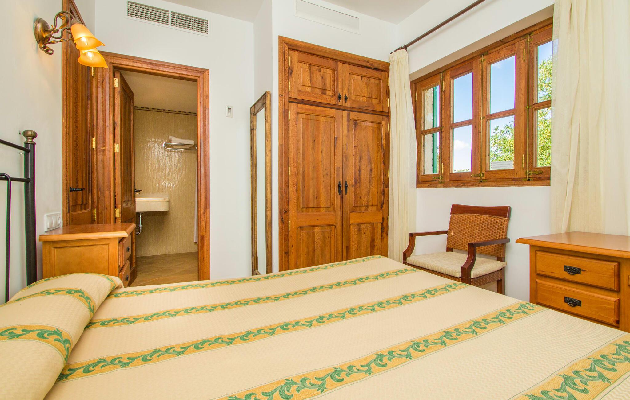 Denne luksusvilla ligger i den østlige del af Mallorca og tilbyder en sensationel udsigt over Puig de Bonany. Hvis I vil shoppe, skal I blot køre til nabobyen Petra, hvor I finder adskillige supermarkeder, barer og restauranter. De smukke strande Son Real og Son Serra er inden for rækkevidde.