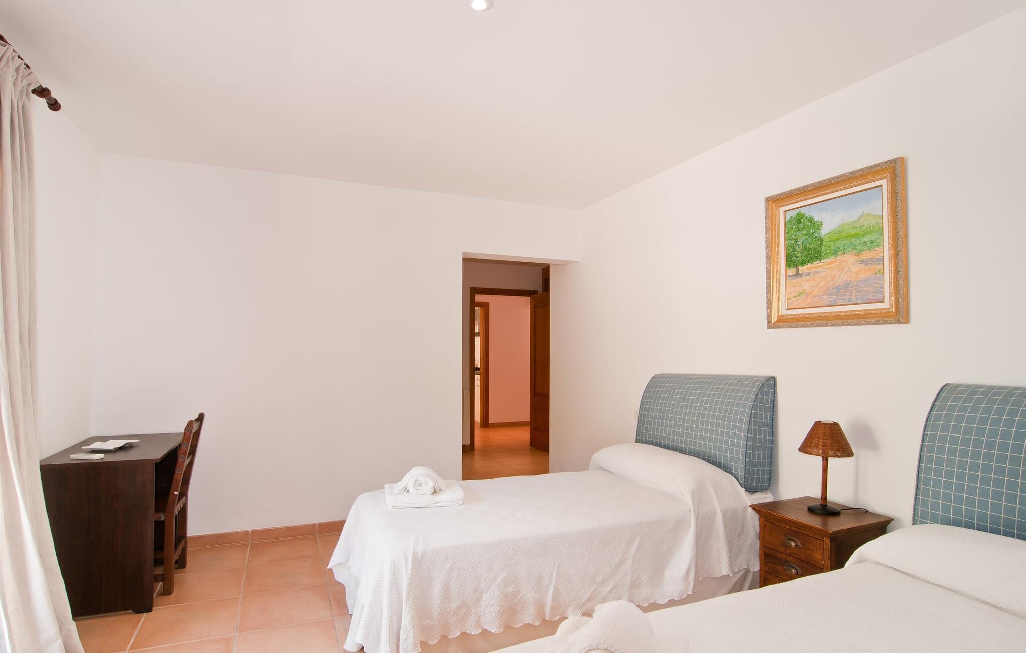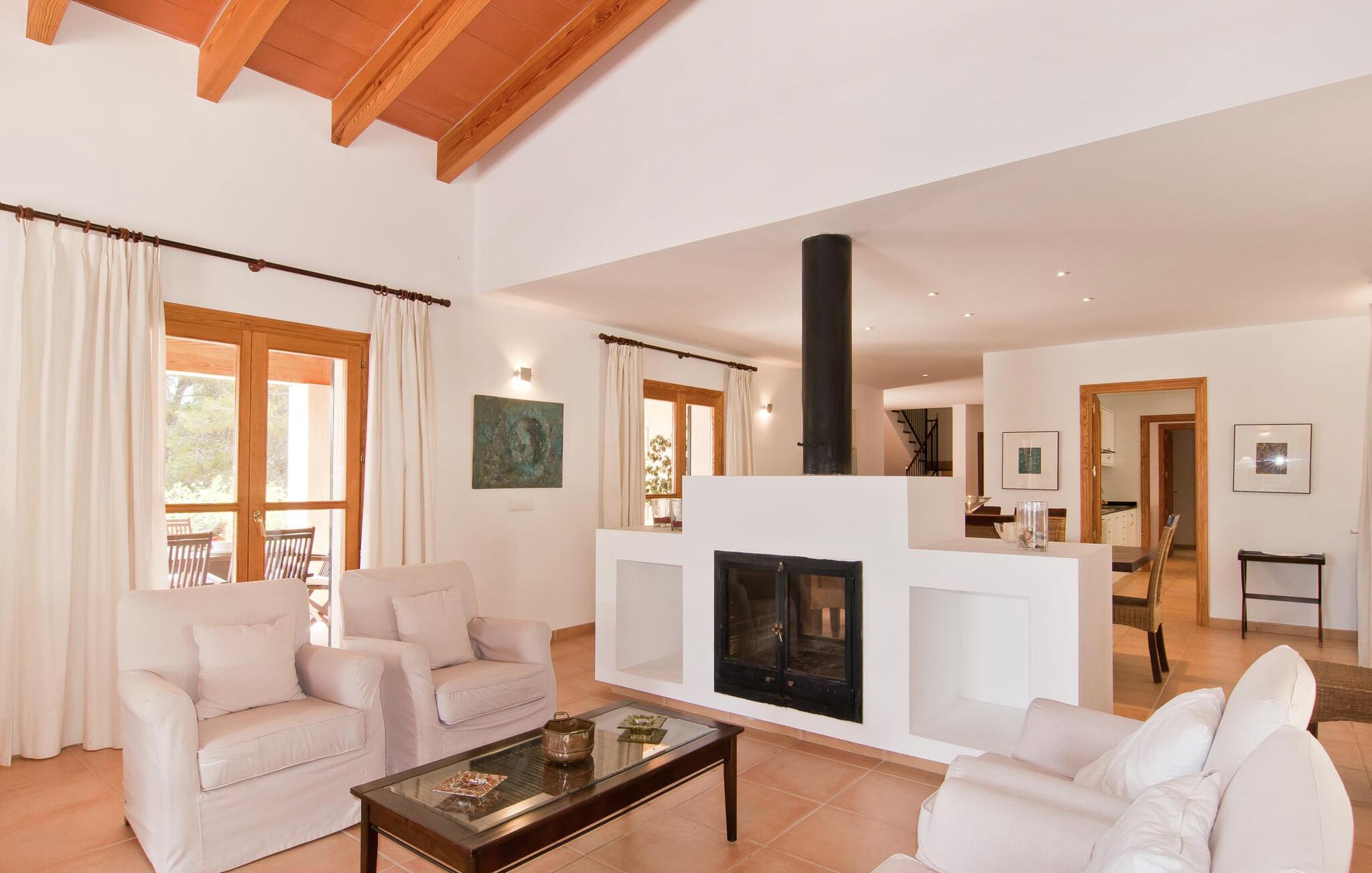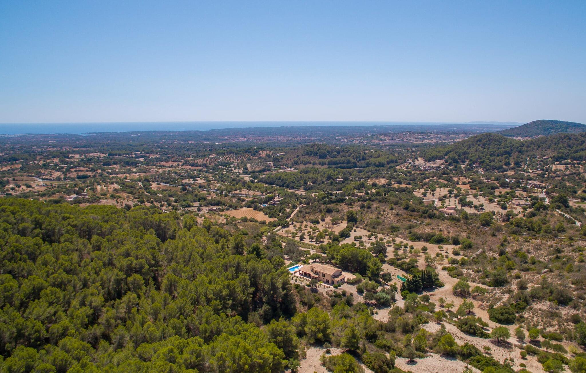 Den fantastiske villa "Son Mito" ligger på en stor 300.000 m² stor grund i en stille skov og tilbyder en betagende havudsigt og en perfekt afsondret ferie. Den sydvendte bolig ligger på en bakke og nyder solskin hele dagen og har to garagepladser. Haven og det indbydende poolområde er forbundet af en rummelig naturstenterrasse med liggestole og skyggefulde parasoller. To store overdækkede terrasser – for og bag – er ideelle til spisning, mens en indbygget grillstation er perfekt til hyggelige aftener. Indenfor har den rummelige stue højt til loftet, synlige bjælker og gulv-til-loft vinduer, der fører ud til terrassen. Det veludstyrede køkken rummer alle jeres behov for selvforplejning og suppleres af en robust spiseplads. Villaen rummer fem rummelige soveværelser (et med en dobbeltseng, der måler 200 cm x 150 cm og fire med enkeltsenge, der måler 90 cm x 200 cm) og fire badeværelser, hvilket sikrer komfort for større grupper. De rolige omgivelser lover afslappende nætter, mens nærliggende landsbyer som Cas Concos og Calonge byder på shopping- og spisemuligheder. Udforsk naturen i Mondragó Nationalpark eller slap af på smukke strande som Cala D'Or, kun 7 km væk. Nyd en uforglemmelig ferie i "Son Mito".