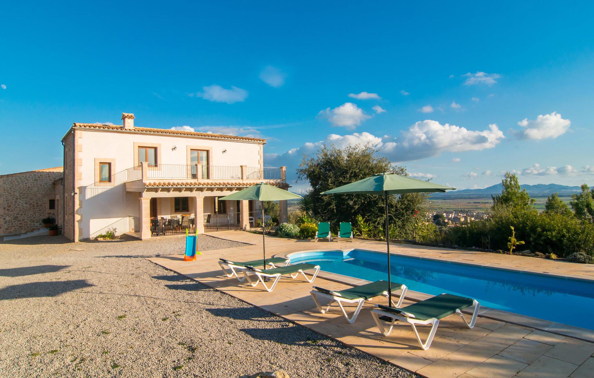 Den hyggelige villa "Son Morei" er beliggende i en vidunderlig bjergbeliggenhed over den smukke landsby Vilafranca de Bonany. Det sydvendte hus byder ikke kun på udsigt over landsbyen, men også en fænomenal udsigt over hele det centrale ø-niveau, "Plà de Mallora". Er der en bedre garanti for en afslappende ferie? Selve ejendommen er omgivet af en meget naturlig have fuld af frodig middelhavsvegetation, som flyder næsten problemfrit ud i bjergene. Direkte foran huset er der en rummelig pool, indlejret i en naturstenssolterrasse med plads til op til seks liggestole. En eller to parasoller giver skygge. Fra poolområdet går I direkte til huset med dens glatte overflade og sandstensindrammede facade. Når I forlader den forfriskende pool bag jer, kan I træde ind på verandaen med dens bærbare grill og ensemble af rattanmøbler - en vidunderlig udendørs spiseplads på ethvert tidspunkt af dagen. På højre side, med udsigt over landsbyen, blev der bygget en anden rummelig solterrasse - et spektakulært udendørs opholdsområde. Takket være en storslået altan direkte foran suiten, der fuldstændig fylder øverste etage, bliver udsigten fra denne højde endnu mere attraktiv for enhver besøgende, der elsker det brede blå derude. Terrasserne fører ind i denne fantastiske villa. Fra verandaen kommer man direkte ind i den lyse stue, hvis vægge er dekoreret med print fra gamle mestre. Dette rummelige værelse lover mange hyggelige timer med afslapning på bløde puder foran den imponerende åbne pejs ved siden af det vægmonterede LCD-tv. Selvom I finder en spiseplads her, tilbyder det solfyldte køkken også en alternativ spiseplads. Dette velproportionerede område med døre til terrassen med delvis udsigt over Vilafranca er fuldt udstyret og smagfuldt designet. Køkkenskabene er lavet af solide vægge og er koordineret med bordet, der adskiller koge- og spisepladserne. Dørene er udført i karamelfarvet træ og hele området er oplyst af loftspots. Sammen med de højglans sandstensfarvede vægfliser, som tilføjer et elegant touch til hele området. I stueetagen er der gæstetoilet, to af de tre soveværelser og et herligt smart badeværelse med bruseniche, alt flisebelagt i maritim blå og hvid. De to soveværelser - et dobbeltværelse og et med to enkeltsenge - er begge udstyret med indbyggede skabe, hvilket giver masser af opbevaringsplads til jeres feriegarderobe. Hele øverste etage er dedikeret til master bedroom, hvor et studie tilbyder ikke kun et stort soveværelse med den førnævnte balkon, men også et skrivebord, et privat fladskærms-tv og en ekstra sovesofa, hvilket gør denne villa til en misundelsesværdig beliggenhed og usædvanligt overkommelig pris, i lavsæsonen en attraktiv mulighed selv for kun to personer. Så hvis I gerne vil tilbringe jeres ferie på landet og stadig være i nærheden af den næste landsby, er "Son Morei" det rigtige sted for jer. Den frugtbare slette i midten af øen er kendt for sine duftende produkter, som ofte er tilgængelige ved siden af vejen eller, hvis I foretrækker det, på markedet på Placa Major i Vilafranca. Lækre vintomater, pimientos (grøn peber) samt abrikoser og de berømte honningmeloner er typiske for denne region, selvom landbruget har mistet noget af den betydning, det engang havde. Byen, som kun ligger to minutters kørsel derfra, er blevet skånet for masseturisme, så I kan komme i kontakt med mallorcanerne, mens I nyder jeres morgen "caffé con leche" og køber jeres morgenmadssandwich. Da huset ligger på en asfalteret vej over byen (selvom det er en blindgyde, vil der være en del trafikstøj afhængig af vindretning), er lokale forbindelsesveje nemme at nå. Hvis I vil have noget lidt mere urbant, skal I bare tage til Manacor for at shoppe. Vi hos Fincallorca ønsker jer en afslappende ferie - betagende udsigt alt inklusive - i den indbydende og hyggelige villa "Son Morei". Den hyggelige, nybyggede villa "Son Morei" med udsigt over den smukke by Vilafranca de Bonany ligger i en smuk bjergbeliggenhed i hjertet af øen. I finder butikker i byen, og der er et ugentligt marked på Placa Major om onsdagen. For mere omfattende shoppingmuligheder venter Petra eller Manacor. "Calas de Mallorca" på østkysten kan nås med bil for en dagstur til stranden; Den overvældende smukke naturlige bugt Cala Varques er ca. 25 km væk. Son Morei tilbyder jer et uforglemmeligt ophold med massage i hjemlige omgivelser.