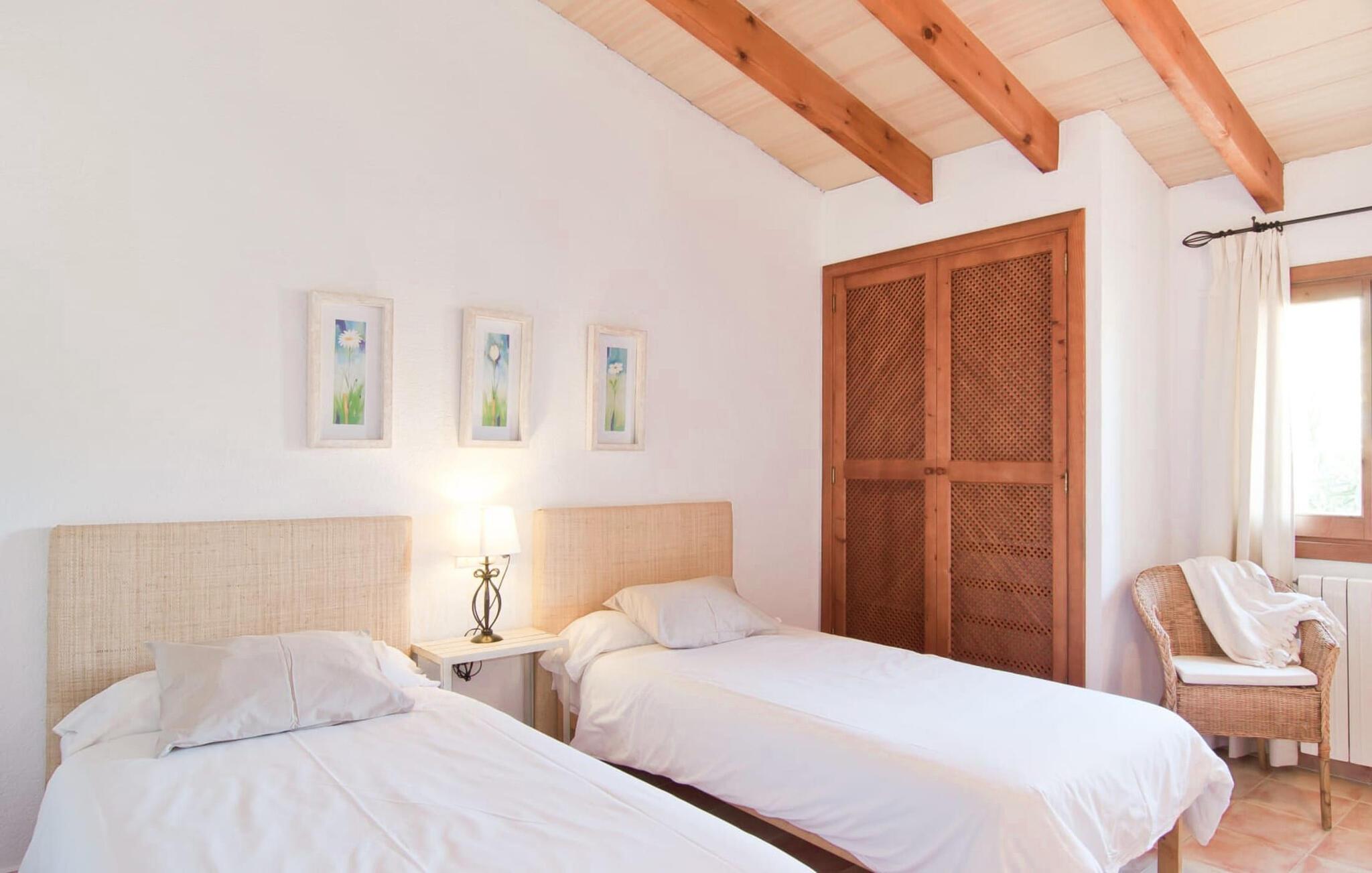 Ingen anden villa i vores portefølje er så malerisk indlejret i landskabet med mandel-, kakao- og oliventræer som villaen "Son Murto" på en af de bedste steder i det nordøstlige Mallorca. Huset ligger på en 7.000 m² stor grund mellem landsbyerne Artà og Son Servera. Den enorme grund, med en imponerende, lang privat indkørsel, er stort set stadig i sin naturlige tilstand, men jorden omkring huset er anlagt som en velplejet have, som I kan nyde fuldt ud under jeres ferie. Udearealets midtpunkt er en stor græsplæne med en pool i midten. Den storslåede blå flisebelagte pool har indgangstrin og en indbydende loungeterrasse til den ene side. Der er også en grillplads til aftengrill i det fri. Fra poolen fører en lille stensti op et par trin til endnu en hævet terrasse. Dette er overdækket og udgør villaens hovedterrasse. Det smukke spisebord er et glimrende sted at nyde måltider under åben himmel. Det egentlige højdepunkt er dog på siden af huset, hvor en balinesisk seng venter på kræsne smage, med udsigt til det fjerne og fred og ro til at flygte fra hverdagen. Udsigten over det omkringliggende landskab fra alle terrasseområder er simpelthen utrolig. For foden af villaen er der talrige små grønne bakker. Hvis appelsintræerne bærer frugt under jeres ophold i villaen, så sørg for at prøve dem! Selv uskåret udstråler de en vidunderlig intens duft - uforlignelig med noget, I kan købe i et britisk supermarked - og er lækre at nyde pæne eller som friskpresset juice. Når I træder ind i huset, er det første værelse den rummelige salon med opholds- og spiseplads, udstyret med pejs, stort fladskærms-tv, dvd-afspiller, musikanlæg og WiFi. Lyse farver, perfekt koordineret med hinanden, skaber en behagelig og absolut harmonisk atmosfære. De høje lofter og store vinduespartier skaber en lys og fri boligstemning, hvor I kan bevæge jer afslappet. Ved siden af opholdsområdet er det fuldt udstyret køkken med opvaskemaskine, komfur og ovn, mikroovn, brødrister, filterkaffe og espressomaskine og et stort fritstående køleskab med fryser. Mens I står her og tilbereder en frisk salat, kan I se gennem vinduet direkte ud i haven og videre. Et måltid tilberedt på denne måde smager garanteret endnu bedre! Køkkenet, opholds- og spiseafdelingen fylder hele den forreste del af huset. Den bagerste del af villaen er tilgængelig fra salonen. Soveafdelingen består af to enkelt og smagfuldt indrettede dobbeltværelser og et hyggeligt enkeltværelse. Der er også to badeværelser med bruser. En lille gang forbinder de tre soveværelser og to badeværelser. Inde i huset er der også et separat bryggers med vaskemaskine. De meget venlige ejere af huset har selv børn og tilbyder derfor også denne ferievilla til familier med børn. Der er en barneseng og en høj stol i huset. Større børn nyder at køle af i poolen og på de omkringliggende græsplæner hver dag. Villaen "Son Murto" ligger i en absolut rolig beliggenhed, indlejret i de grønne bakker i kystsamfundet Son Servera, hvor den smelter vidunderligt ind i det romantiske naturlandskab med utallige knudrede mandel- og oliventræer. Fra villaen kan I nyde en vidunderlig udsigt over det fjerne. I nærheden ligger nogle af de smukkeste sandstrande Mallorca har at byde på. For shopping gå til Son Servera, hvor I vil finde nogle supermarkeder, barer og restauranter.
