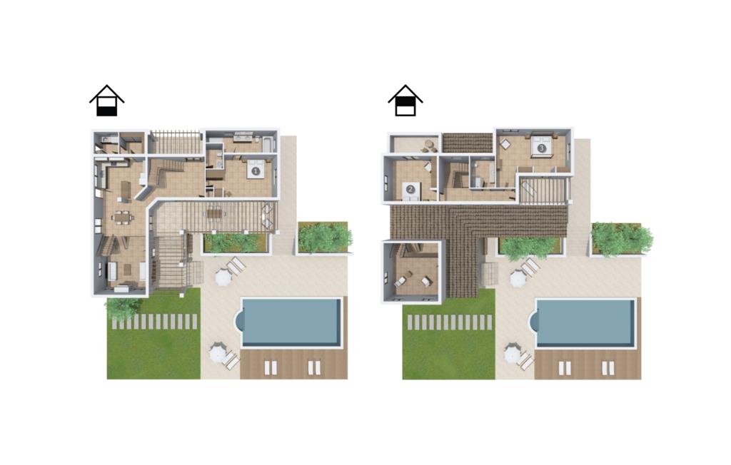 Den store grund har flere niveauer af åbne og overdækkede terrasser, ideel til afslapning. Nyd det smukt designede liggeområde af teaktræ ved siden af poolen, eller tag en afslappet tur gennem den flot anlagte have, som inviterer til at slappe af på de forskelligt udformede siddepladser. En stor, overdækket altan på første sal byder på en fantastisk panoramaudsigt over ejendommen og det omkringliggende landskab. Et skyggefuldt sted til jeres bil finder I i garagen.