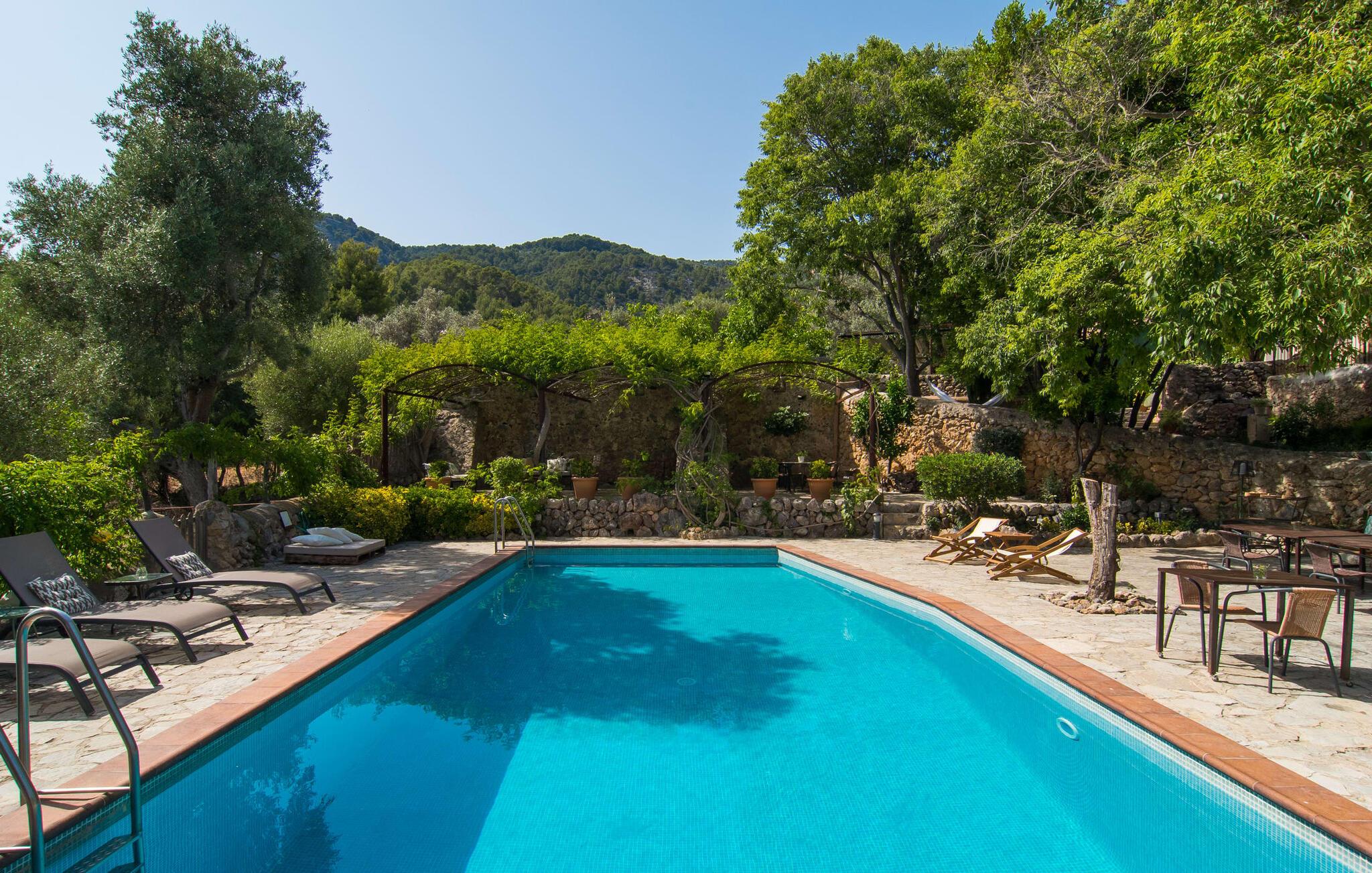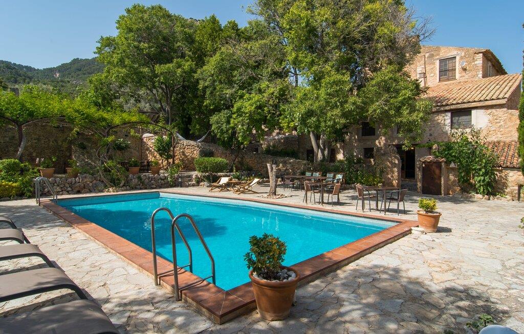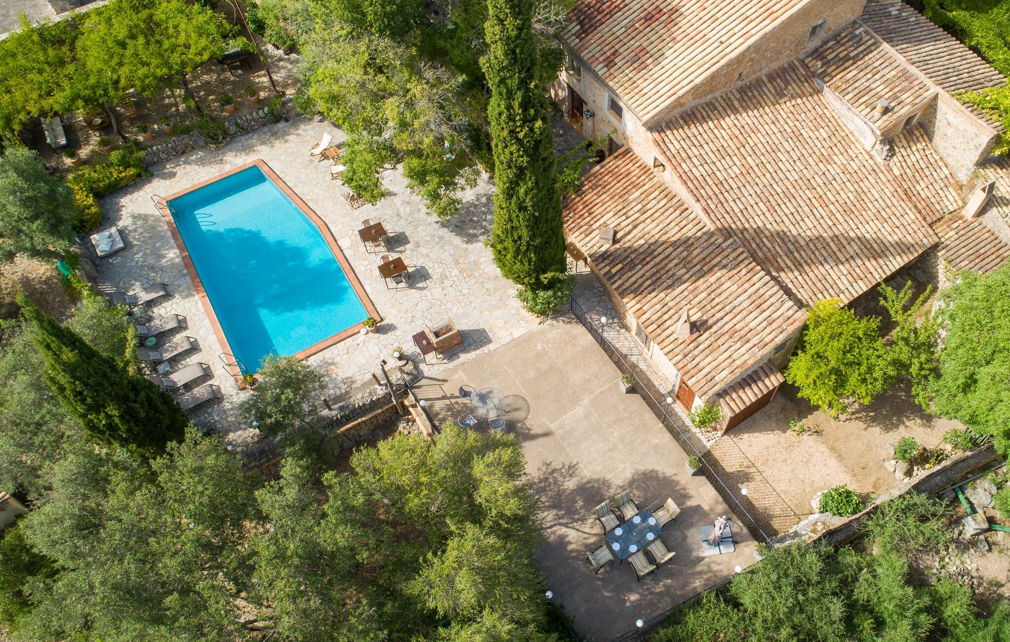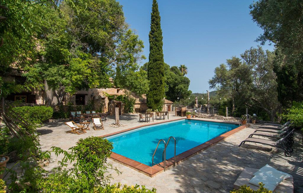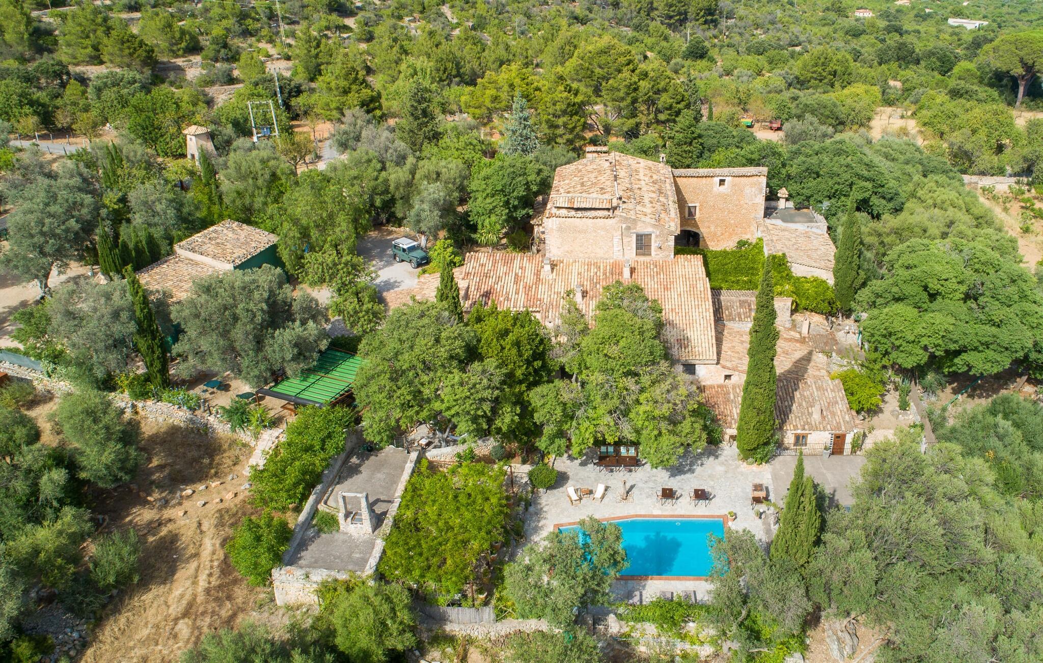 Den majestætiske ejendom "Son Penyaflor Agroturismo" med over 16 hektar jord i spektakulære landlige omgivelser ligger i det lidt bemærkede centrum af øen nær Alaró. Langt væk fra masseturismen kan I opleve naturens skønhed i ubekymret stilhed. Nyd den smukke have på den rummelige lejefinca fuld af oliventræer, cypresser, palmer og en frugthave, og tilbring en ubekymret ferie der. Her kan I være ét med naturen, vandre, meditere eller køle af i den forfriskende pool med omgivende solterrasse. Områder til solbadning og talrige smukt designede siddepladser, hvoraf nogle er overdækkede, giver jer komfortable muligheder for aktiv eller afslappet afslapning. Bortset fra naturens lyde vil intet distrahere jer fra jeres ferie. Her kan I nyde jeres morgenmad sammen og en hyggelig grillaften - måske med et godt glas mallorcansk vin fra den venlige driftsfamilie - i en idyllisk atmosfære. I denne fortryllende smukke leje finca vil I opdage et sandt paradis af enestående skønhed, der er uden sidestykke. Der er næppe bedre rammer for at sætte farten ned end dette bæredygtigt renoverede feriehus. Spor af Mallorcas historie kan også findes inde som en tidligere landejendom. De synlige stenmure og andre traditionelle detaljer er blevet dygtigt fremvist og overgået af moderne komfort. Resultatet er en næsten utraditionel planløsning med to hyggelige stuer med pejse og syv soveværelser, hver med en-suite badeværelser. Disse er i etager, et par trin fører jer fra soveværelset til badeværelset, og nogle har et opholdsområde med plads til en suite. Det er denne ekstra komfort, der gør huset ideelt til mange personlige konstellationer - det være sig en tur til familie- eller firmajubilæum eller en ferie med venner, der gerne vil tilbringe tid sammen, men stadig værdsætter et værdigt privatliv. Fællesarealerne som opholds- og spisestuerne er alle meget komfortable med komfortable sofaer eller et opholdsområde med klublokale-atmosfære. Det fuldt udstyrede køkken imponerer også med sin kombination af naturlige, muntre farver og materialer og bestemmer dermed kvaliteten af dette mallorcanske landhus i topklasse med spektakulære perspektiver, der kan ændre jeres syn. Med den imponerende ejendom "Son Penyaflor Agroturismo" fra 1200-tallet præsenterer vi jer et stateligt landsted med det mest moderne udstyr og en idyllisk pool og have. Den absolut rolige mallorcanske finca ligger på den maleriske baggrund af Tramuntana-bjergene og er derfor et godt udgangspunkt for vandreture. Den rolige landsby Alaró kan nås på 6 minutter med udlejningsbil. Der kan I shoppe eller besøge markedet. Strandene i hovedstaden Palma kan nås på 30 minutter.