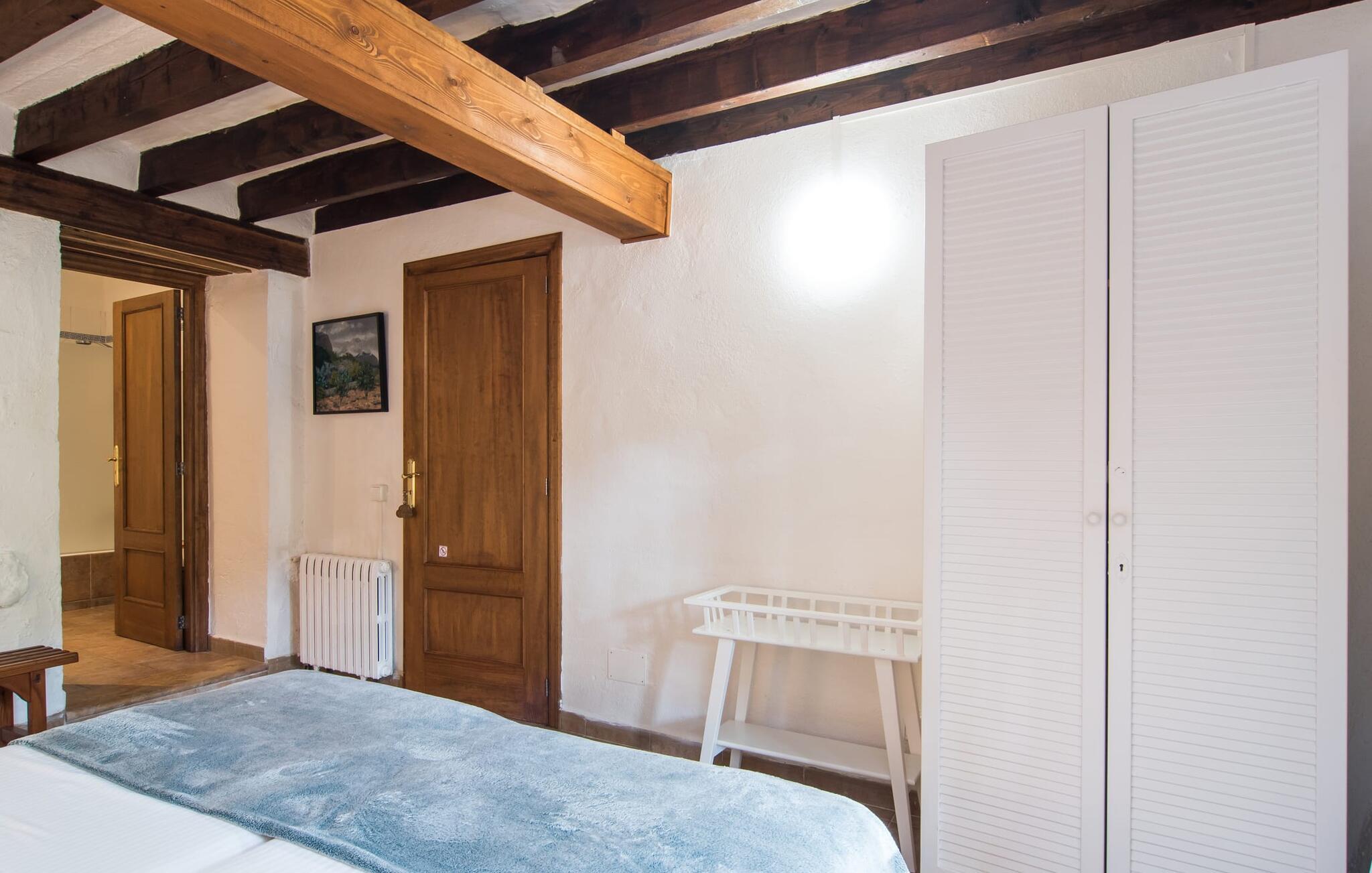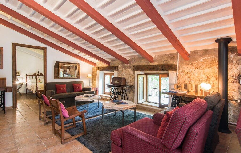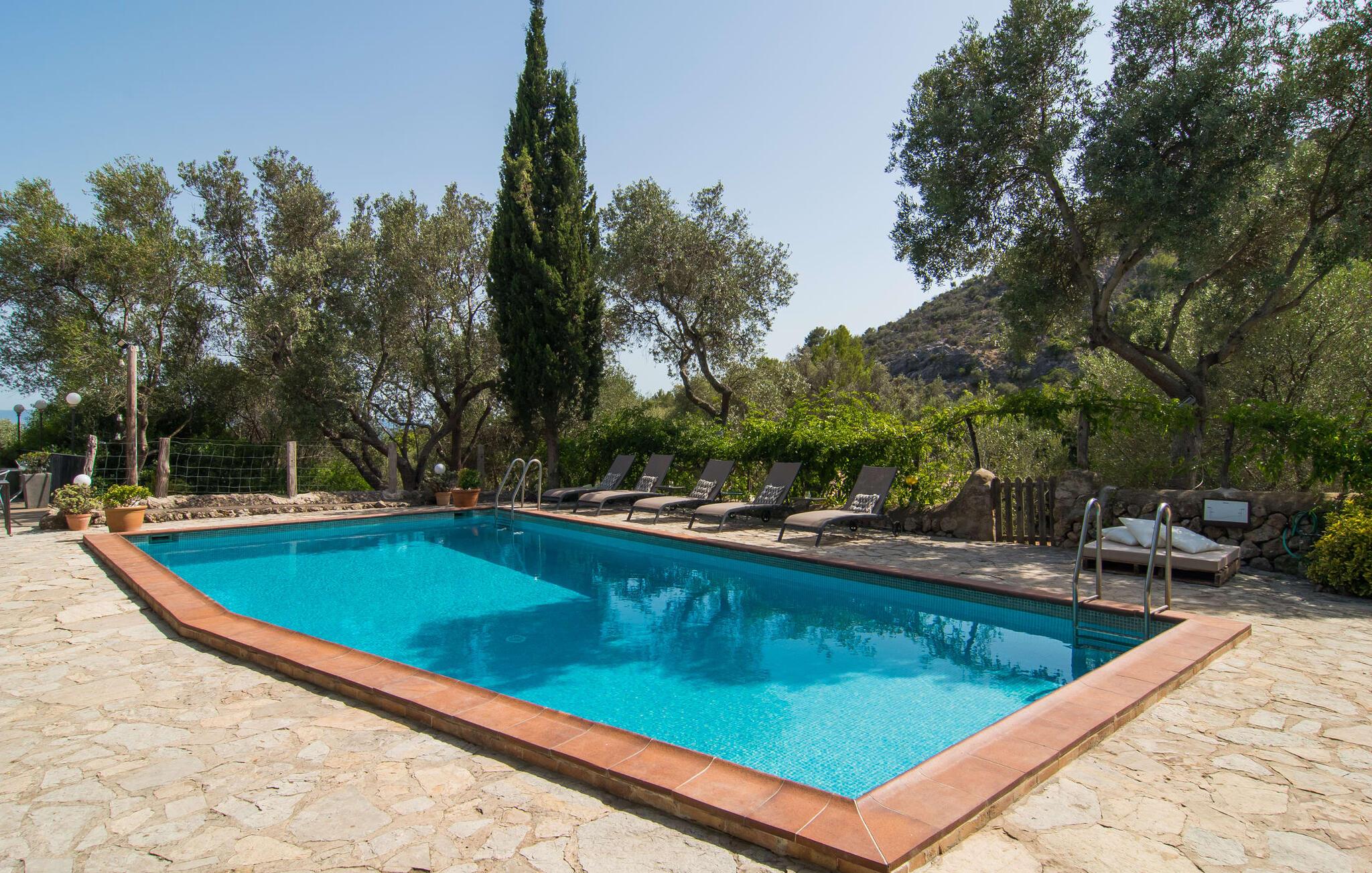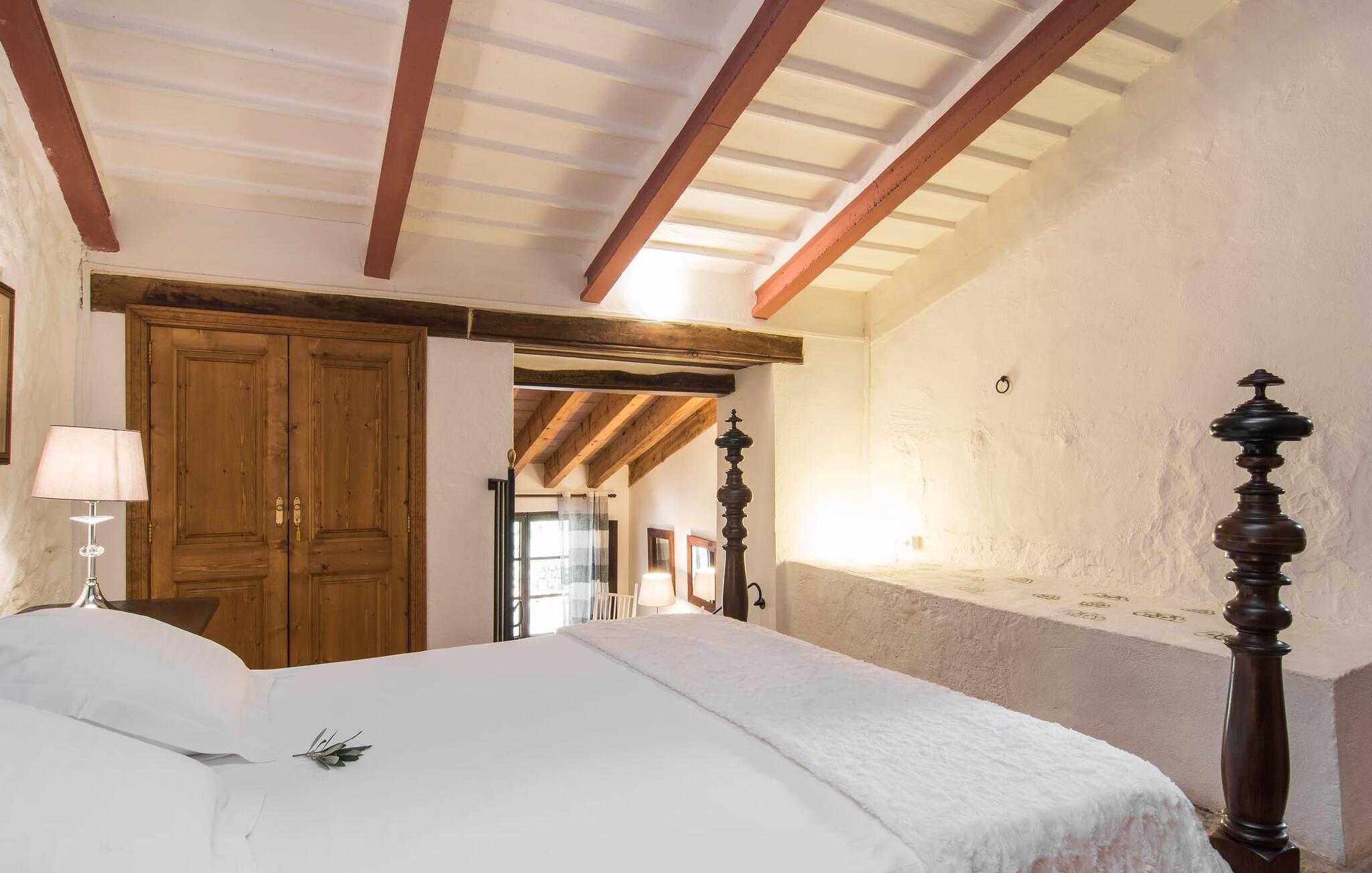Den majestætiske ejendom "Son Penyaflor Agroturismo" med over 16 hektar jord i spektakulære landlige omgivelser ligger i det lidt bemærkede centrum af øen nær Alaró. Langt væk fra masseturismen kan I opleve naturens skønhed i ubekymret stilhed. Nyd den smukke have på den rummelige lejefinca fuld af oliventræer, cypresser, palmer og en frugthave, og tilbring en ubekymret ferie der. Her kan I være ét med naturen, vandre, meditere eller køle af i den forfriskende pool med omgivende solterrasse. Områder til solbadning og talrige smukt designede siddepladser, hvoraf nogle er overdækkede, giver jer komfortable muligheder for aktiv eller afslappet afslapning. Bortset fra naturens lyde vil intet distrahere jer fra jeres ferie. Her kan I nyde jeres morgenmad sammen og en hyggelig grillaften - måske med et godt glas mallorcansk vin fra den venlige driftsfamilie - i en idyllisk atmosfære. I denne fortryllende smukke leje finca vil I opdage et sandt paradis af enestående skønhed, der er uden sidestykke. Der er næppe bedre rammer for at sætte farten ned end dette bæredygtigt renoverede feriehus. Spor af Mallorcas historie kan også findes inde som en tidligere landejendom. De synlige stenmure og andre traditionelle detaljer er blevet dygtigt fremvist og overgået af moderne komfort. Resultatet er en næsten utraditionel planløsning med to hyggelige stuer med pejse og syv soveværelser, hver med en-suite badeværelser. Disse er i etager, et par trin fører jer fra soveværelset til badeværelset, og nogle har et opholdsområde med plads til en suite. Det er denne ekstra komfort, der gør huset ideelt til mange personlige konstellationer - det være sig en tur til familie- eller firmajubilæum eller en ferie med venner, der gerne vil tilbringe tid sammen, men stadig værdsætter et værdigt privatliv. Fællesarealerne som opholds- og spisestuerne er alle meget komfortable med komfortable sofaer eller et opholdsområde med klublokale-atmosfære. Det fuldt udstyrede køkken imponerer også med sin kombination af naturlige, muntre farver og materialer og bestemmer dermed kvaliteten af dette mallorcanske landhus i topklasse med spektakulære perspektiver, der kan ændre jeres syn. Med den imponerende ejendom "Son Penyaflor Agroturismo" fra 1200-tallet præsenterer vi jer et stateligt landsted med det mest moderne udstyr og en idyllisk pool og have. Den absolut rolige mallorcanske finca ligger på den maleriske baggrund af Tramuntana-bjergene og er derfor et godt udgangspunkt for vandreture. Den rolige landsby Alaró kan nås på 6 minutter med udlejningsbil. Der kan I shoppe eller besøge markedet. Strandene i hovedstaden Palma kan nås på 30 minutter.