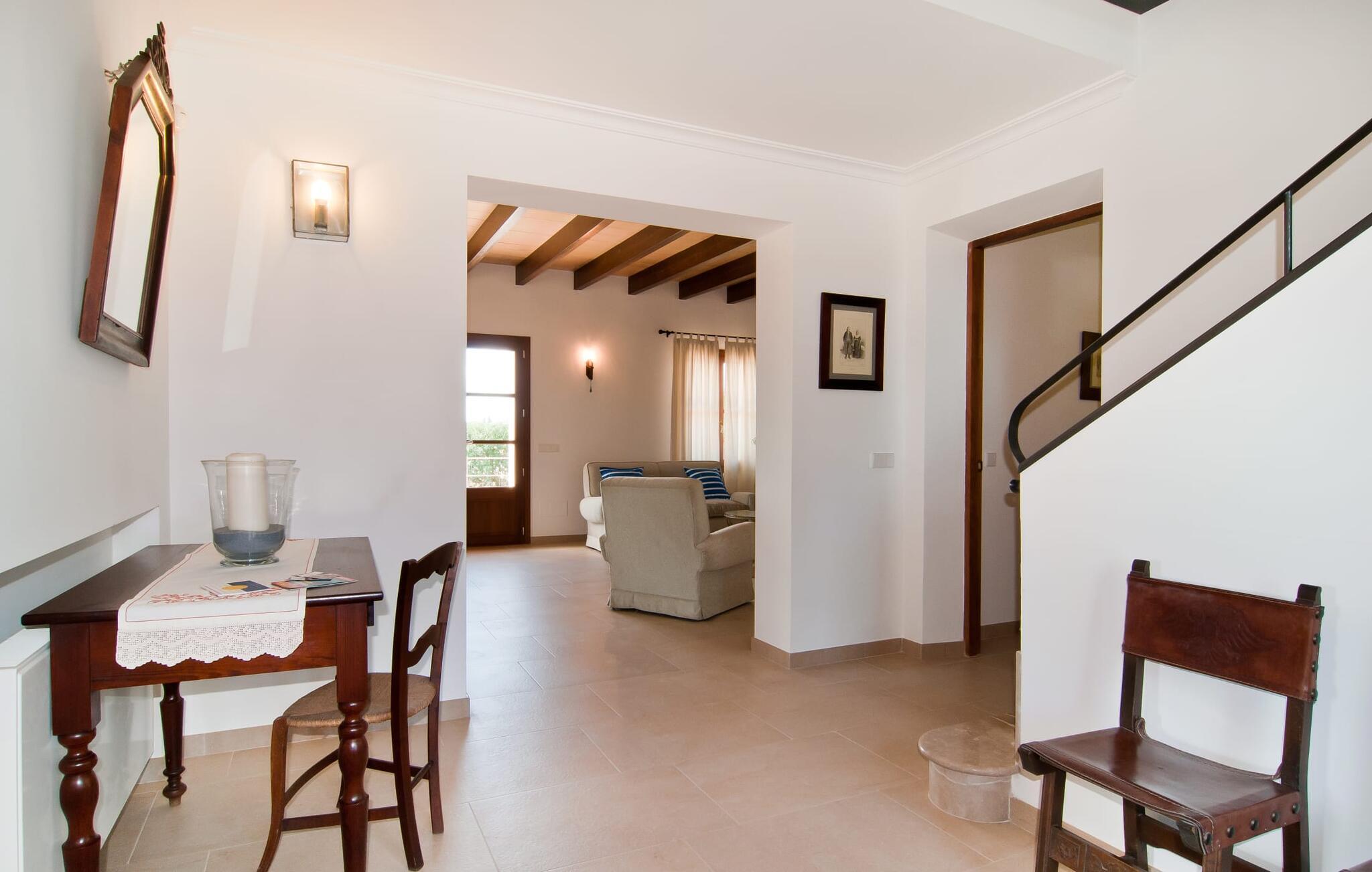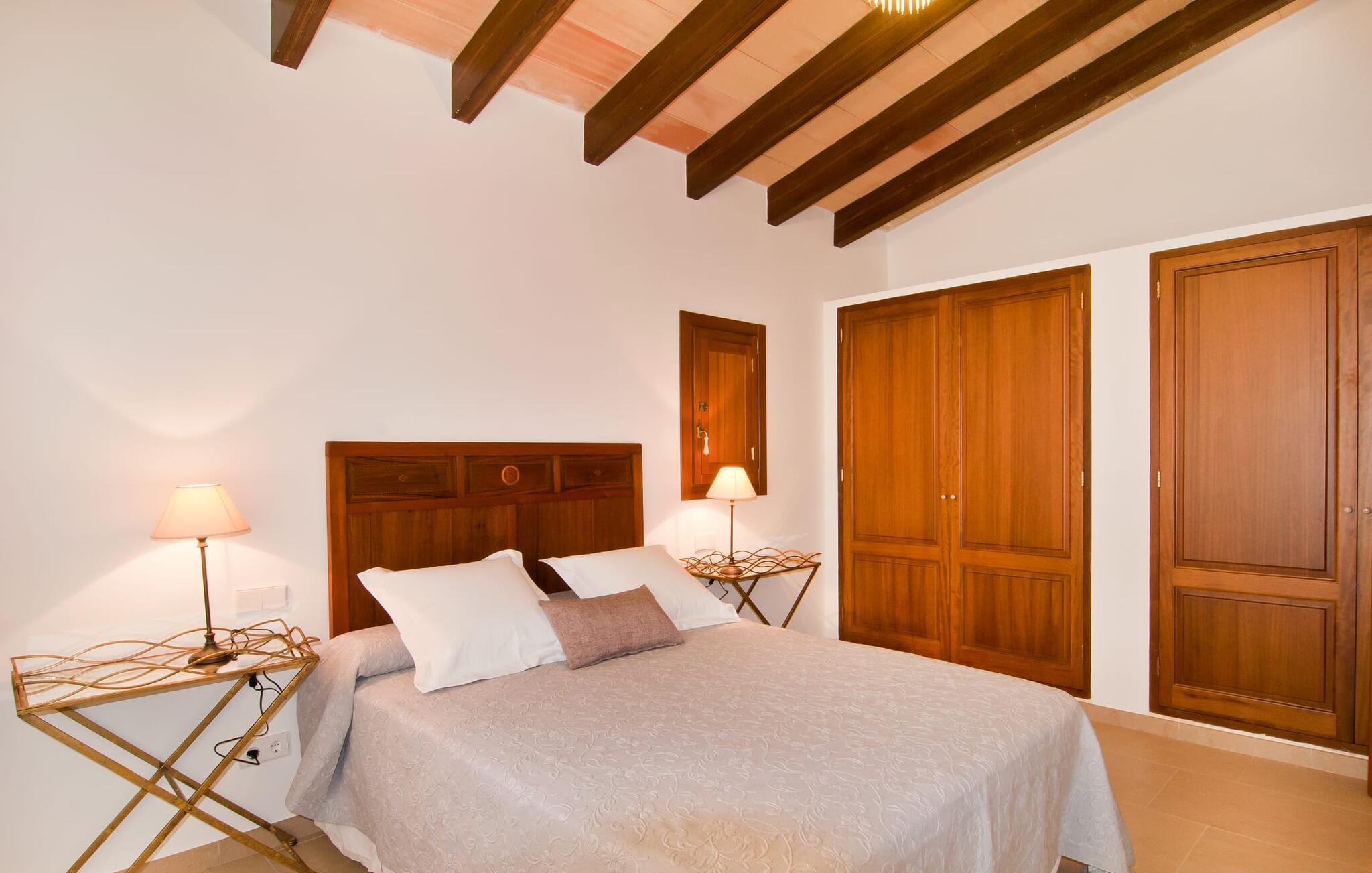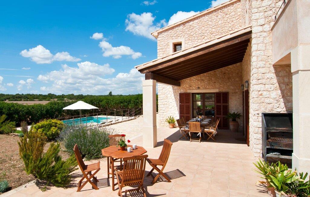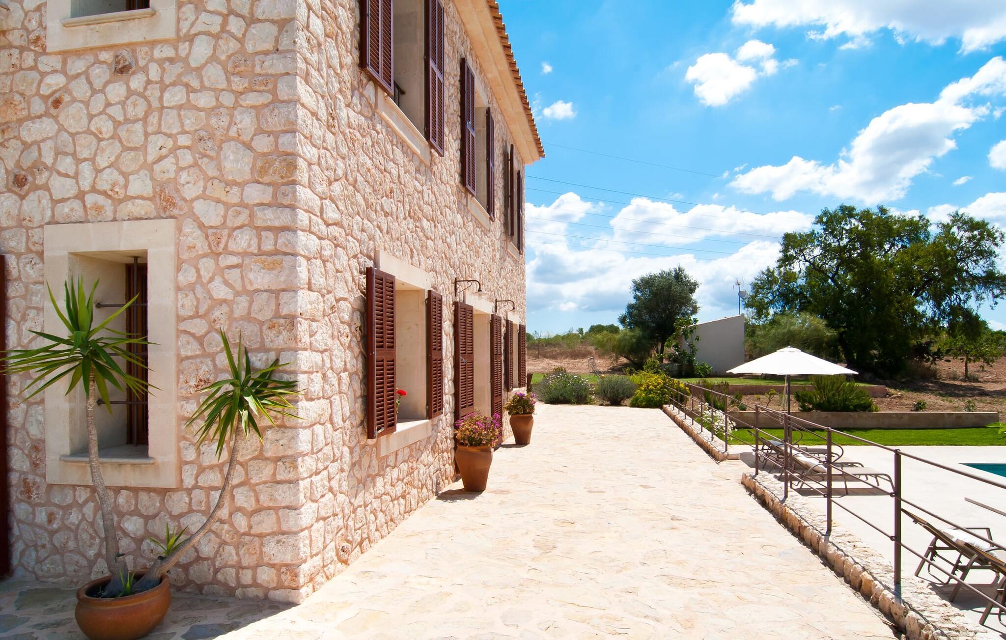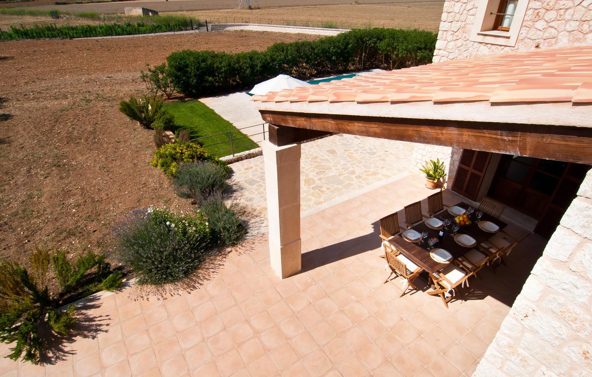 Selv på afstand kan I se, hvilket fortryllende feriehus villaen "Son Perot" er. Det to-etagers hus med en betagende smuk naturstensfacade samt trævinduer og skodder er beliggende på en 15.000 m² stor grund, der nyder godt af gode transportforbindelser mellem Manacor og Vilafranca og samtidig er i landlig beliggenhed de Bonany. Ejendommen tilbyder jer også alt, hvad I behøver for en fuldstændig tilfredsstillende ferie. En del af det smukt omgivne område er præget af terrasser og græsplæner samt forskellige dekorative middelhavsplanter i bede og krukker. I kan køle af på varme dage i den 9 m lange pool, som er placeret foran huset. Poolen kan nemt nås via en bred trappe og er omkranset af en indbydende solterrasse. Der er seks komfortable liggestole til rådighed for omfattende afslapning. Her kan I ligge og drømme under den dybblå middelhavshimmel og lægge hverdagen langt bag jer. En parasol er tilgængelig for yderligere beskyttelse mod UV-stråler. Terrassen direkte foran huset, som kan nås via få trin, giver også mulighed for at sidde i den luftige skygge og nyde de fantastiske omgivelser derfra. I kan sidde ved det massive spisebord i en fantastisk atmosfære, spise jeres måltider udendørs, som I ønsker, og lade blikket vandre i det fjerne. Udekøkkenet og grillen giver fremragende muligheder for at tilberede mad al fresco og giver mulighed for at tilberede lokale delikatesser ved hjælp af råvarer indsamlet fra markedet. Husets indretning er ikke kun hyggeligt, men også meget smagfuldt og skaber en fantastisk atmosfære at blive hængende i. Lyse materialer er omgivet af kontrasterende elementer, for det meste lavet af træ, som bidrager væsentligt til den harmoniske stemning. I kan finde jer tilpas i sofaområdet eller spise sammen i den afslappende stue/spisestue i åbent plan. Et fjernsyn og pejs fuldender komforten i dette værelse. I dette hus bliver dekoration brugt sparsomt og omhyggeligt, så der på intet tidspunkt opstår et overbelastet billede, men tværtimod præger følelsen af rummelighed behageligt rummene. Det gælder også det rummelige køkken, hvor typisk mallorcansk flair er blevet dygtigt kombineret med modernitet. Et godt sted for en fest med familie eller venner. Køkkenet byder på alt til jeres daglige behov. Filterkaffemaskinen giver jer mulighed for at lave frisk kaffe hver morgen. Fire soveværelser er individuelt indrettede og tilbyder det ideelle hvilested for enhver smag. Ejendommen er udstyret med seks senge i alt, hvoraf fire er 0,90x2,00m og to er 1,60x2,00m. Et andet soveværelse er smukt indrettet som børneværelse og har en enkeltseng og en køjeseng med en tredje udtræksseng. Madrasmålene er her 0,80x1,80m. Dette feriehus kan derfor højst rumme otte voksne og fire børn. De tre stilfulde badeværelser - et i stueetagen, de to andre på første sal - er udstyret med sofistikeret indretning, og deres design fortsætter på overbevisende vis husets æstetik. To hårtørrere og et strygejern er til rådighed i huset og skal ikke medbringes hjemmefra. Villaen ligger omkring en halv kilometer fra hovedvejen, der forbinder Manacor og Vilafranca. I Manacor finder I alt, hvad I har brug for til jeres daglige behov. Der er også et stort udvalg af restauranter med godt mallorcansk køkken. Sydøstkystens strande, som er nemme at nå fra feriehuset, er blandt de smukkeste bugter på øen. Den yderst charmerende villa "Son Perot" ligger kun 8 minutter vest for Manacor på den østlige del af øen. Vilafranca ligger i den anden retning, cirka samme afstand fra feriehuset. Det veludstyrede hus er ideelt til en familieferie. I Manacor finder I en solid infrastruktur og alt hvad I har brug for til jeres daglige behov. En af de nærmeste smukke strande er Cala Varques, som kun ligger 17 kilometer væk.