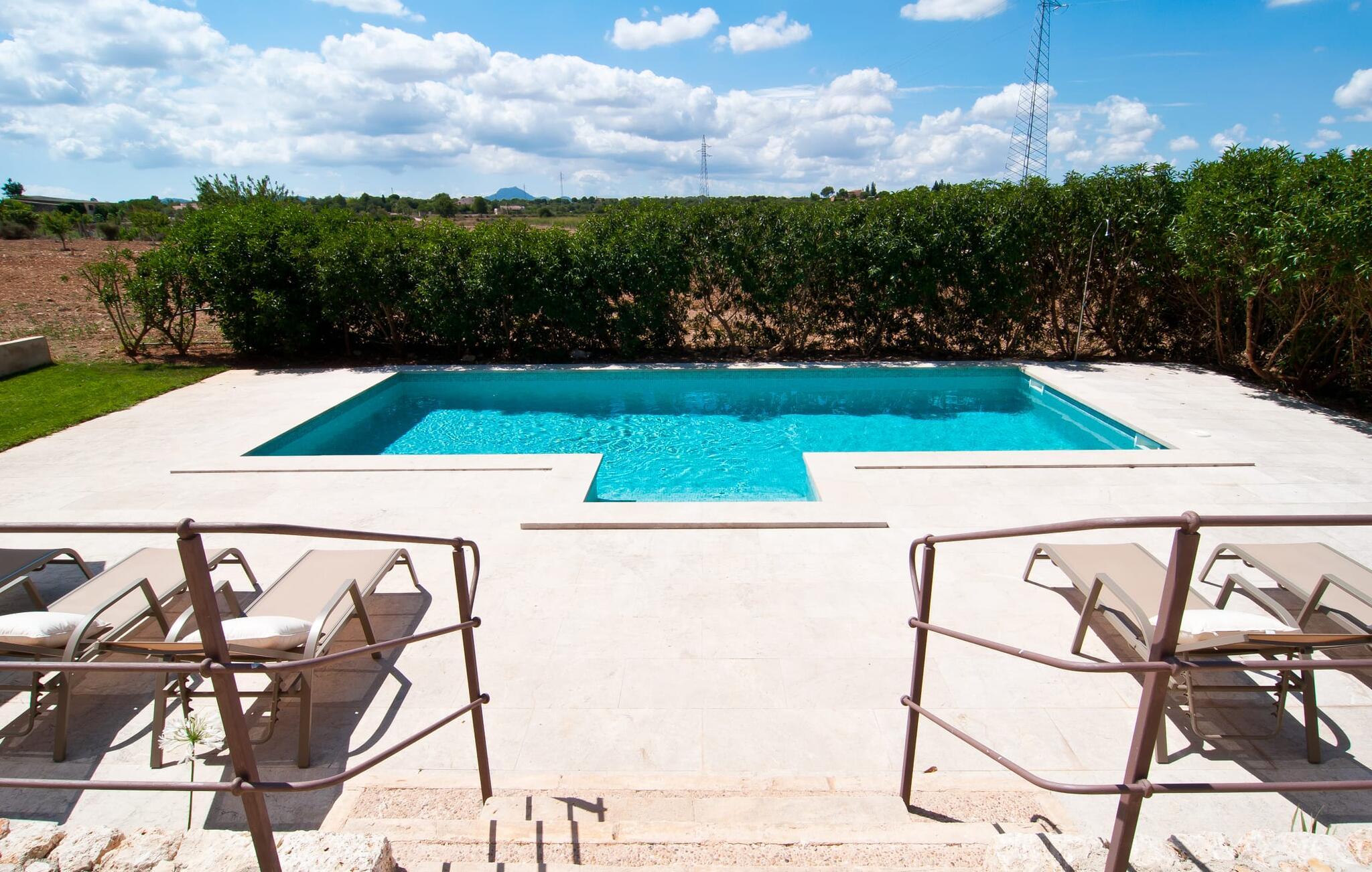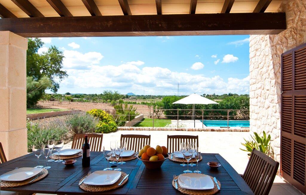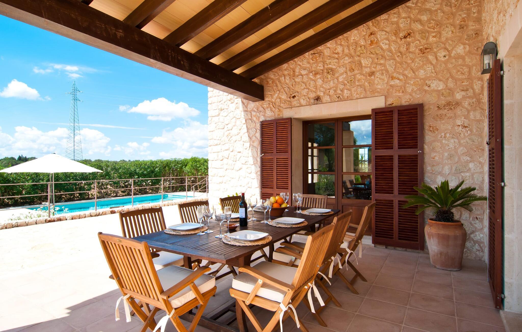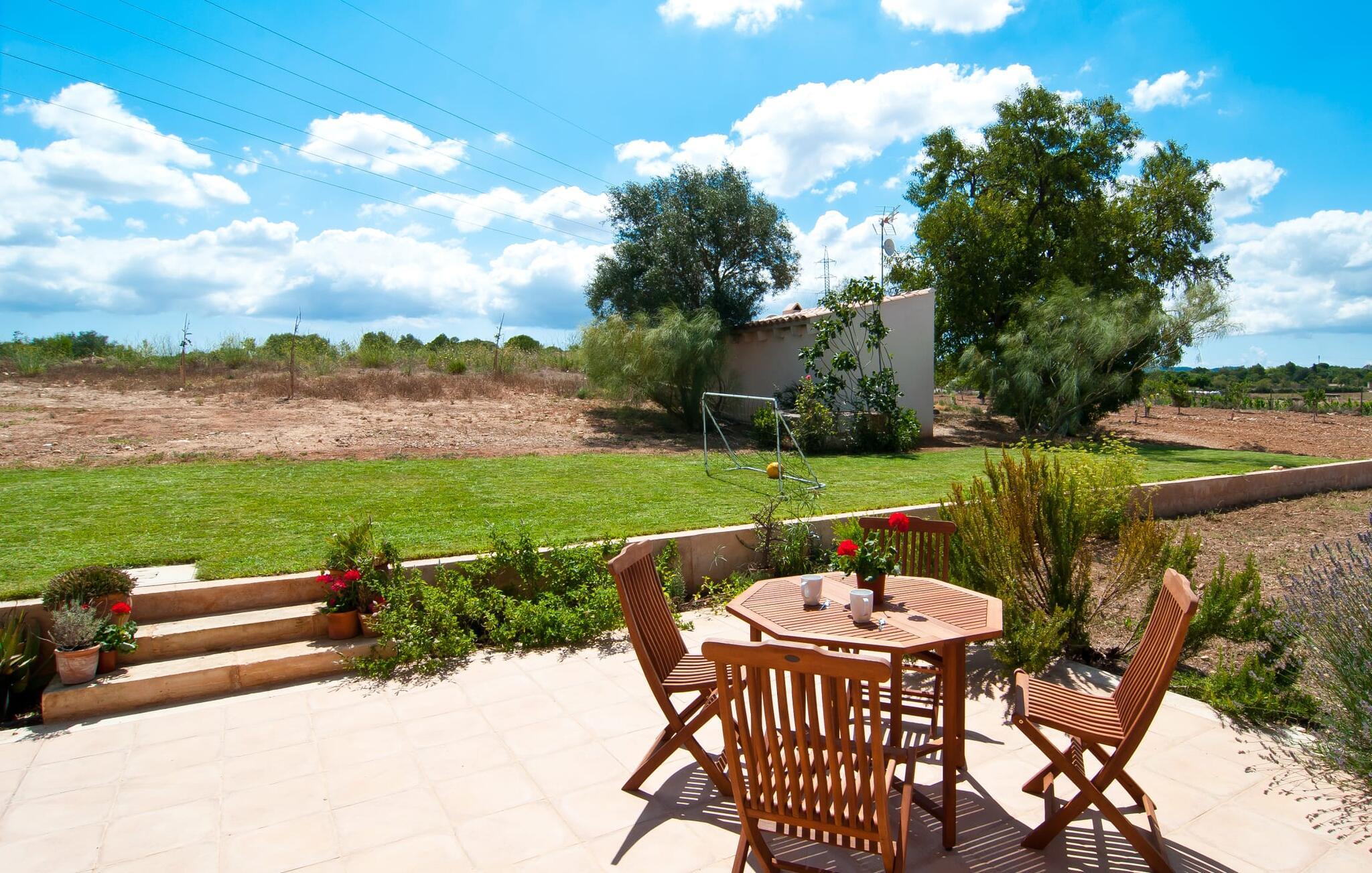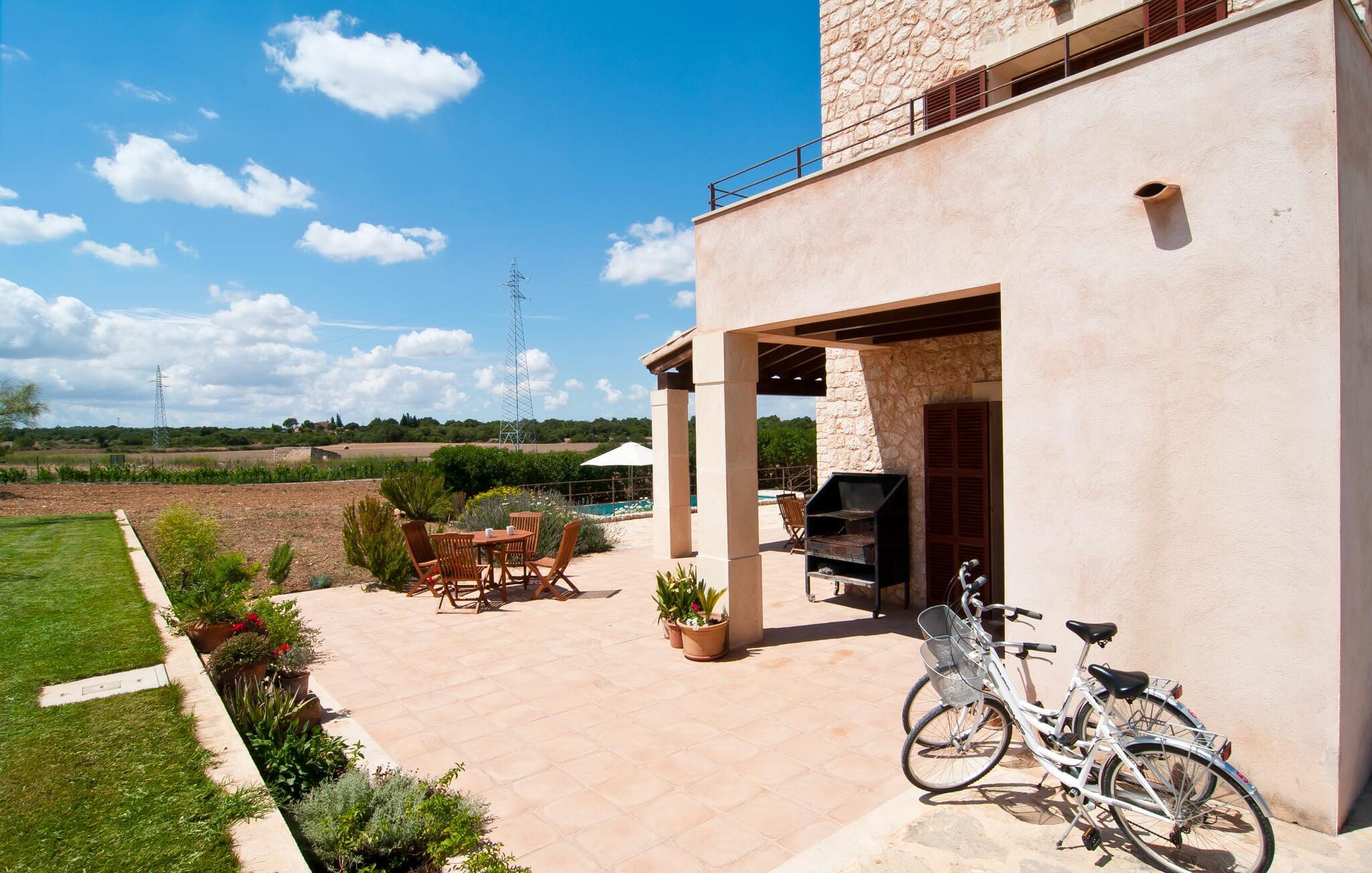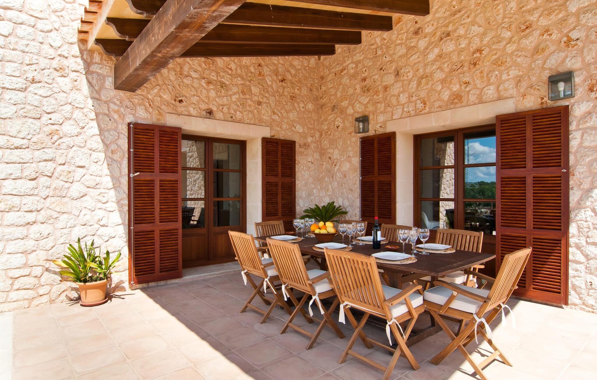 Selv på afstand kan I se, hvilket fortryllende feriehus villaen "Son Perot" er. Det to-etagers hus med en betagende smuk naturstensfacade samt trævinduer og skodder er beliggende på en 15.000 m² stor grund, der nyder godt af gode transportforbindelser mellem Manacor og Vilafranca og samtidig er i landlig beliggenhed de Bonany. Ejendommen tilbyder jer også alt, hvad I behøver for en fuldstændig tilfredsstillende ferie. En del af det smukt omgivne område er præget af terrasser og græsplæner samt forskellige dekorative middelhavsplanter i bede og krukker. I kan køle af på varme dage i den 9 m lange pool, som er placeret foran huset. Poolen kan nemt nås via en bred trappe og er omkranset af en indbydende solterrasse. Der er seks komfortable liggestole til rådighed for omfattende afslapning. Her kan I ligge og drømme under den dybblå middelhavshimmel og lægge hverdagen langt bag jer. En parasol er tilgængelig for yderligere beskyttelse mod UV-stråler. Terrassen direkte foran huset, som kan nås via få trin, giver også mulighed for at sidde i den luftige skygge og nyde de fantastiske omgivelser derfra. I kan sidde ved det massive spisebord i en fantastisk atmosfære, spise jeres måltider udendørs, som I ønsker, og lade blikket vandre i det fjerne. Udekøkkenet og grillen giver fremragende muligheder for at tilberede mad al fresco og giver mulighed for at tilberede lokale delikatesser ved hjælp af råvarer indsamlet fra markedet. Husets indretning er ikke kun hyggeligt, men også meget smagfuldt og skaber en fantastisk atmosfære at blive hængende i. Lyse materialer er omgivet af kontrasterende elementer, for det meste lavet af træ, som bidrager væsentligt til den harmoniske stemning. I kan finde jer tilpas i sofaområdet eller spise sammen i den afslappende stue/spisestue i åbent plan. Et fjernsyn og pejs fuldender komforten i dette værelse. I dette hus bliver dekoration brugt sparsomt og omhyggeligt, så der på intet tidspunkt opstår et overbelastet billede, men tværtimod præger følelsen af rummelighed behageligt rummene. Det gælder også det rummelige køkken, hvor typisk mallorcansk flair er blevet dygtigt kombineret med modernitet. Et godt sted for en fest med familie eller venner. Køkkenet byder på alt til jeres daglige behov. Filterkaffemaskinen giver jer mulighed for at lave frisk kaffe hver morgen. Fire soveværelser er individuelt indrettede og tilbyder det ideelle hvilested for enhver smag. Ejendommen er udstyret med seks senge i alt, hvoraf fire er 0,90x2,00m og to er 1,60x2,00m. Et andet soveværelse er smukt indrettet som børneværelse og har en enkeltseng og en køjeseng med en tredje udtræksseng. Madrasmålene er her 0,80x1,80m. Dette feriehus kan derfor højst rumme otte voksne og fire børn. De tre stilfulde badeværelser - et i stueetagen, de to andre på første sal - er udstyret med sofistikeret indretning, og deres design fortsætter på overbevisende vis husets æstetik. To hårtørrere og et strygejern er til rådighed i huset og skal ikke medbringes hjemmefra. Villaen ligger omkring en halv kilometer fra hovedvejen, der forbinder Manacor og Vilafranca. I Manacor finder I alt, hvad I har brug for til jeres daglige behov. Der er også et stort udvalg af restauranter med godt mallorcansk køkken. Sydøstkystens strande, som er nemme at nå fra feriehuset, er blandt de smukkeste bugter på øen. Den yderst charmerende villa "Son Perot" ligger kun 8 minutter vest for Manacor på den østlige del af øen. Vilafranca ligger i den anden retning, cirka samme afstand fra feriehuset. Det veludstyrede hus er ideelt til en familieferie. I Manacor finder I en solid infrastruktur og alt hvad I har brug for til jeres daglige behov. En af de nærmeste smukke strande er Cala Varques, som kun ligger 17 kilometer væk.