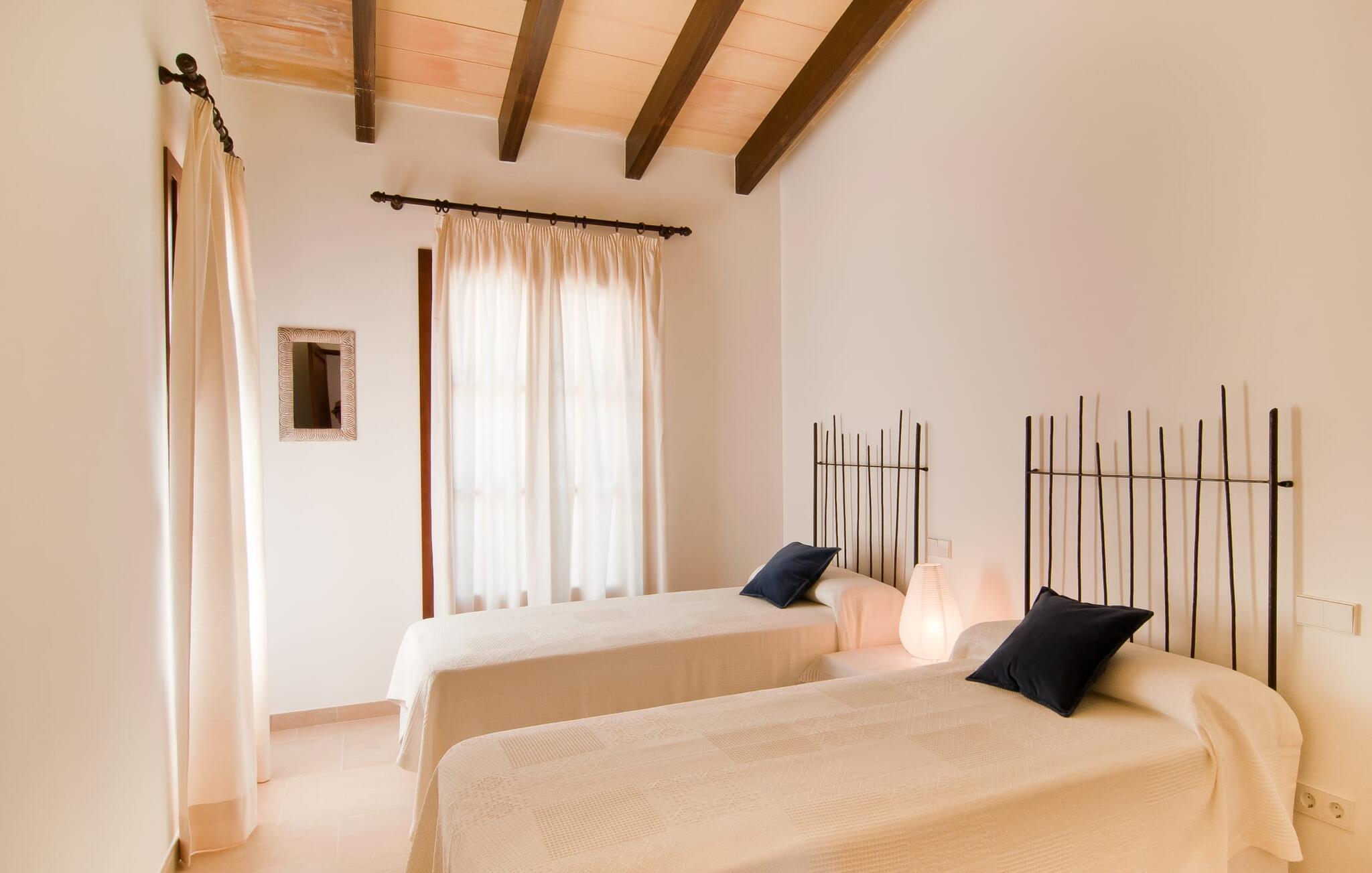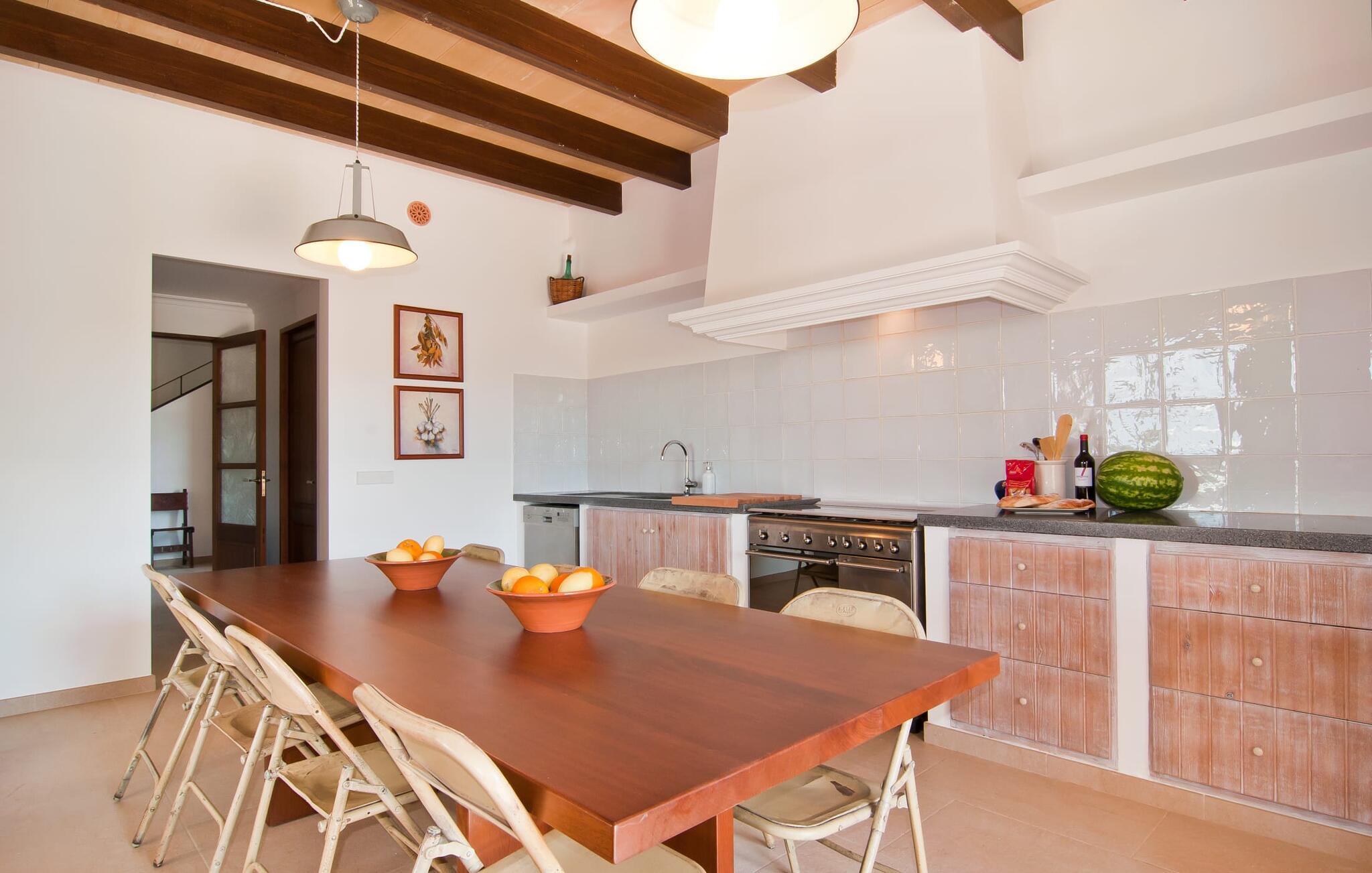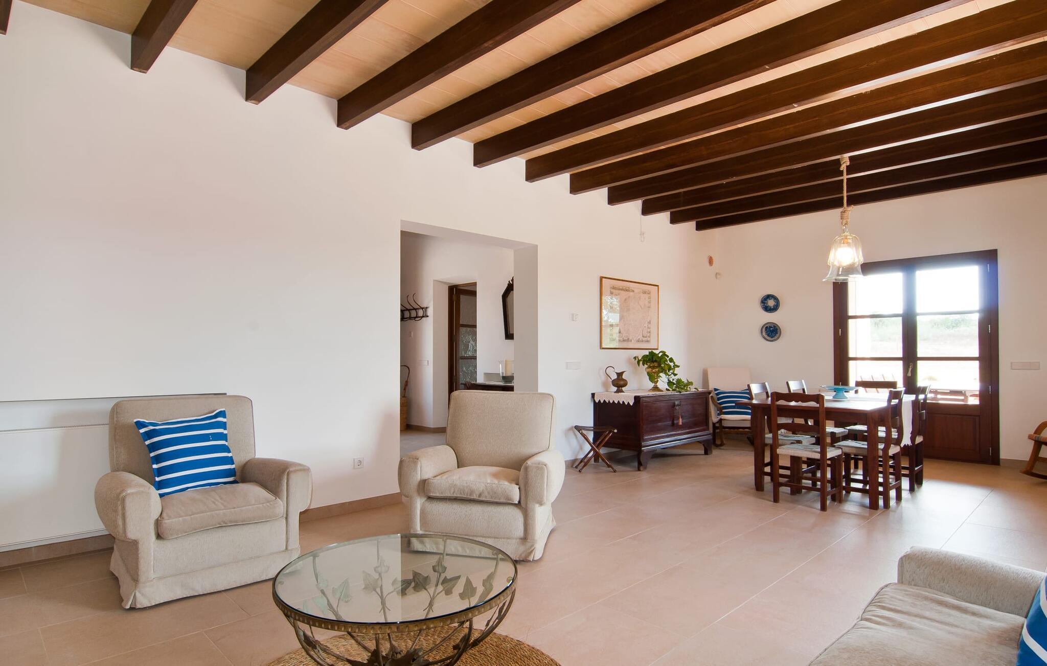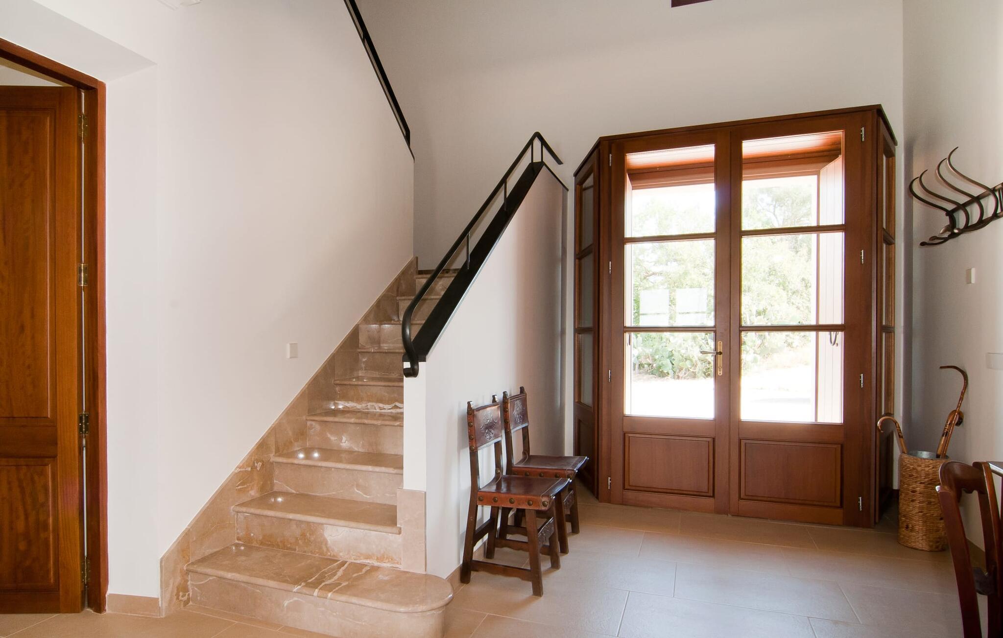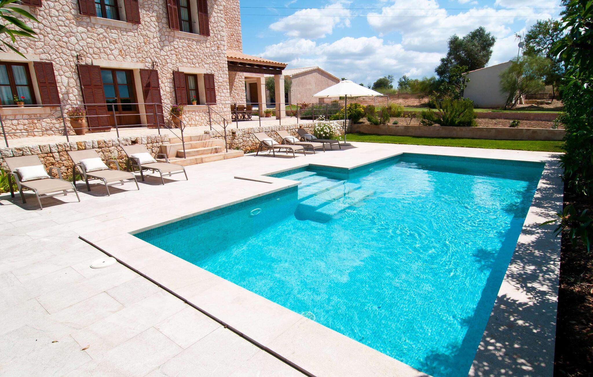 Selv på afstand kan I se, hvilket fortryllende feriehus villaen "Son Perot" er. Det to-etagers hus med en betagende smuk naturstensfacade samt trævinduer og skodder er beliggende på en 15.000 m² stor grund, der nyder godt af gode transportforbindelser mellem Manacor og Vilafranca og samtidig er i landlig beliggenhed de Bonany. Ejendommen tilbyder jer også alt, hvad I behøver for en fuldstændig tilfredsstillende ferie. En del af det smukt omgivne område er præget af terrasser og græsplæner samt forskellige dekorative middelhavsplanter i bede og krukker. I kan køle af på varme dage i den 9 m lange pool, som er placeret foran huset. Poolen kan nemt nås via en bred trappe og er omkranset af en indbydende solterrasse. Der er seks komfortable liggestole til rådighed for omfattende afslapning. Her kan I ligge og drømme under den dybblå middelhavshimmel og lægge hverdagen langt bag jer. En parasol er tilgængelig for yderligere beskyttelse mod UV-stråler. Terrassen direkte foran huset, som kan nås via få trin, giver også mulighed for at sidde i den luftige skygge og nyde de fantastiske omgivelser derfra. I kan sidde ved det massive spisebord i en fantastisk atmosfære, spise jeres måltider udendørs, som I ønsker, og lade blikket vandre i det fjerne. Udekøkkenet og grillen giver fremragende muligheder for at tilberede mad al fresco og giver mulighed for at tilberede lokale delikatesser ved hjælp af råvarer indsamlet fra markedet. Husets indretning er ikke kun hyggeligt, men også meget smagfuldt og skaber en fantastisk atmosfære at blive hængende i. Lyse materialer er omgivet af kontrasterende elementer, for det meste lavet af træ, som bidrager væsentligt til den harmoniske stemning. I kan finde jer tilpas i sofaområdet eller spise sammen i den afslappende stue/spisestue i åbent plan. Et fjernsyn og pejs fuldender komforten i dette værelse. I dette hus bliver dekoration brugt sparsomt og omhyggeligt, så der på intet tidspunkt opstår et overbelastet billede, men tværtimod præger følelsen af rummelighed behageligt rummene. Det gælder også det rummelige køkken, hvor typisk mallorcansk flair er blevet dygtigt kombineret med modernitet. Et godt sted for en fest med familie eller venner. Køkkenet byder på alt til jeres daglige behov. Filterkaffemaskinen giver jer mulighed for at lave frisk kaffe hver morgen. Fire soveværelser er individuelt indrettede og tilbyder det ideelle hvilested for enhver smag. Ejendommen er udstyret med seks senge i alt, hvoraf fire er 0,90x2,00m og to er 1,60x2,00m. Et andet soveværelse er smukt indrettet som børneværelse og har en enkeltseng og en køjeseng med en tredje udtræksseng. Madrasmålene er her 0,80x1,80m. Dette feriehus kan derfor højst rumme otte voksne og fire børn. De tre stilfulde badeværelser - et i stueetagen, de to andre på første sal - er udstyret med sofistikeret indretning, og deres design fortsætter på overbevisende vis husets æstetik. To hårtørrere og et strygejern er til rådighed i huset og skal ikke medbringes hjemmefra. Villaen ligger omkring en halv kilometer fra hovedvejen, der forbinder Manacor og Vilafranca. I Manacor finder I alt, hvad I har brug for til jeres daglige behov. Der er også et stort udvalg af restauranter med godt mallorcansk køkken. Sydøstkystens strande, som er nemme at nå fra feriehuset, er blandt de smukkeste bugter på øen. Den yderst charmerende villa "Son Perot" ligger kun 8 minutter vest for Manacor på den østlige del af øen. Vilafranca ligger i den anden retning, cirka samme afstand fra feriehuset. Det veludstyrede hus er ideelt til en familieferie. I Manacor finder I en solid infrastruktur og alt hvad I har brug for til jeres daglige behov. En af de nærmeste smukke strande er Cala Varques, som kun ligger 17 kilometer væk.