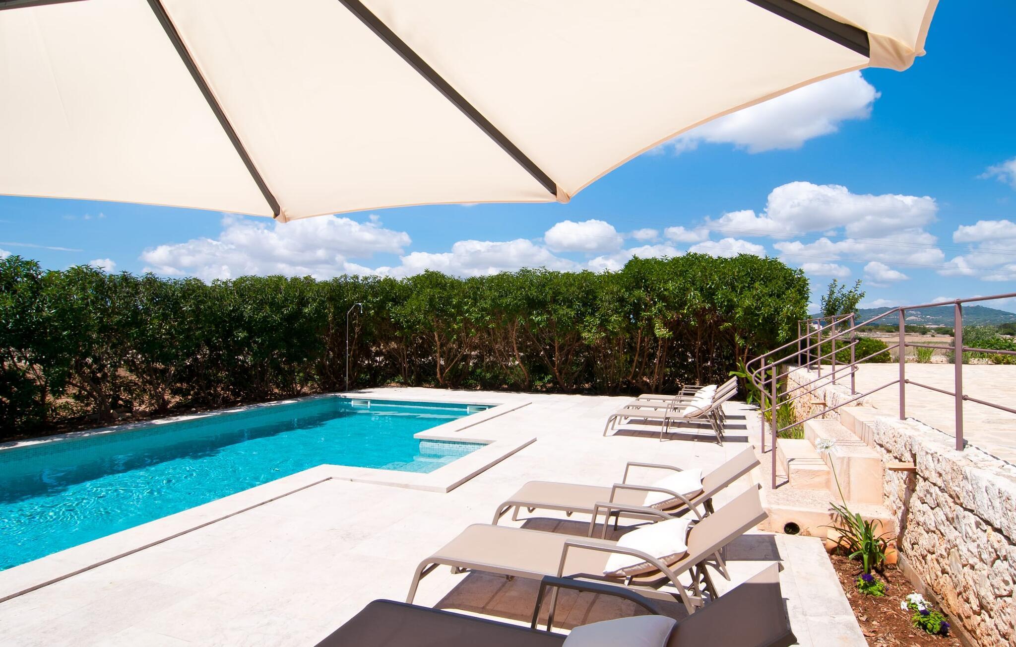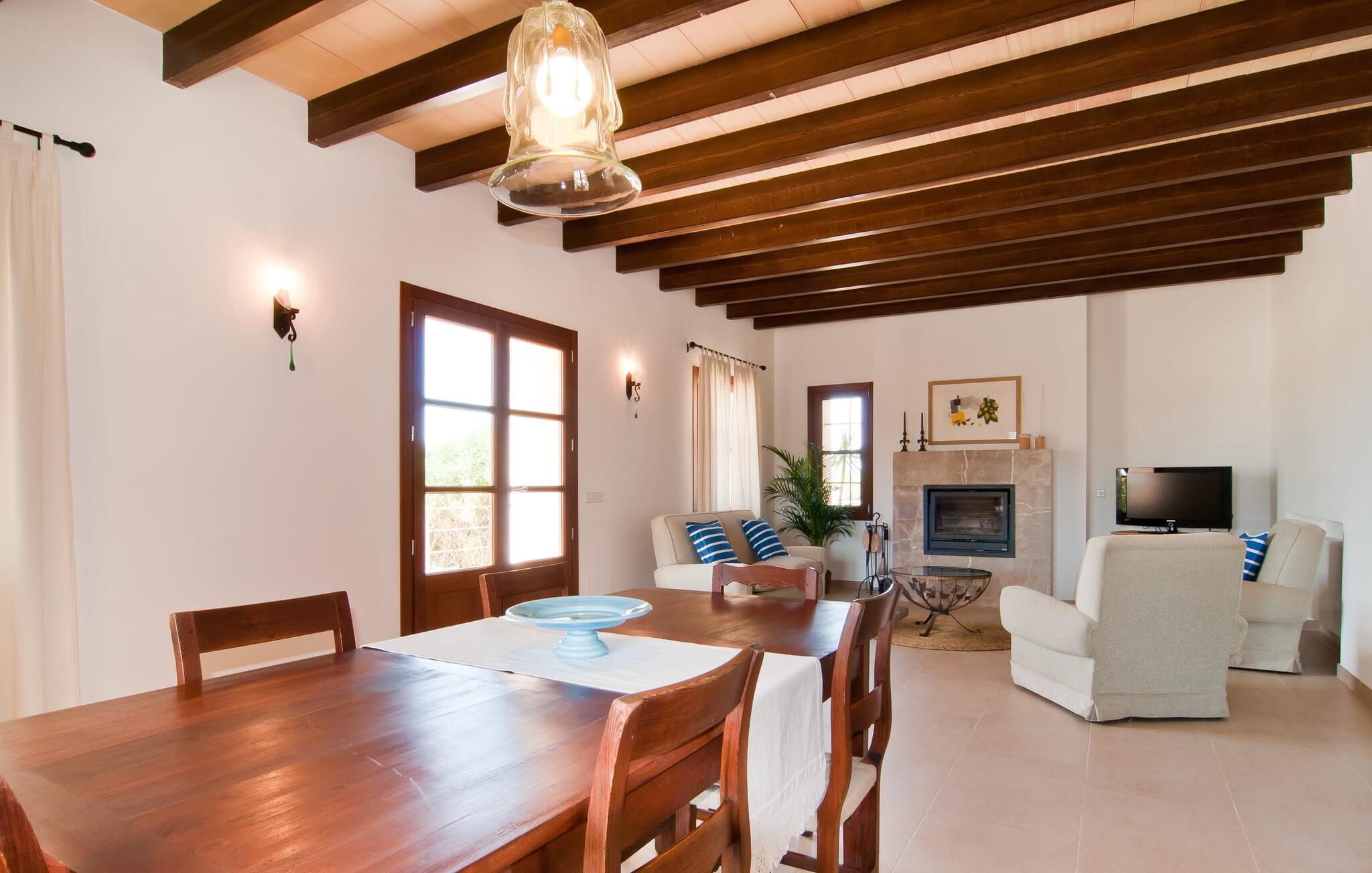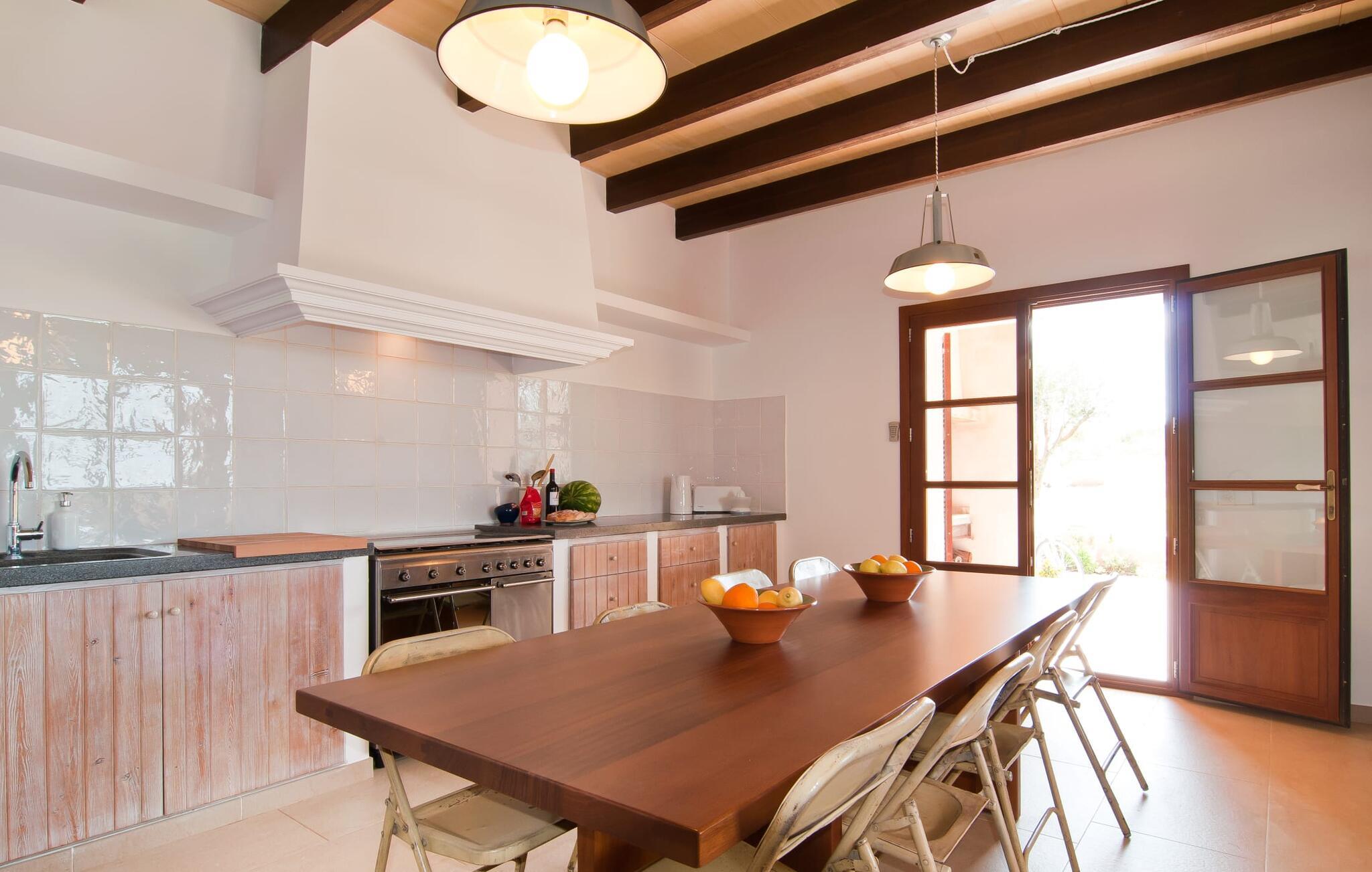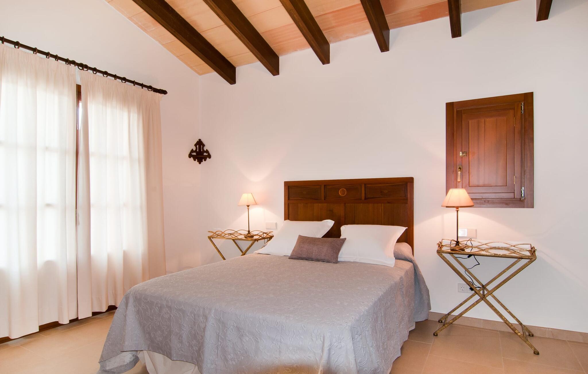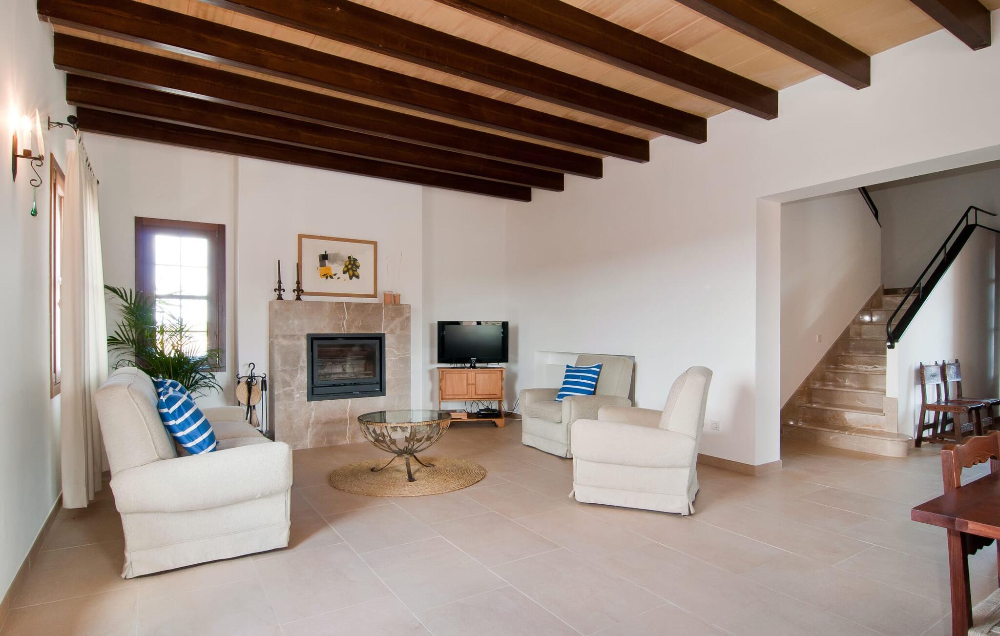 Selv på afstand kan I se, hvilket fortryllende feriehus villaen "Son Perot" er. Det to-etagers hus med en betagende smuk naturstensfacade samt trævinduer og skodder er beliggende på en 15.000 m² stor grund, der nyder godt af gode transportforbindelser mellem Manacor og Vilafranca og samtidig er i landlig beliggenhed de Bonany. Ejendommen tilbyder jer også alt, hvad I behøver for en fuldstændig tilfredsstillende ferie. En del af det smukt omgivne område er præget af terrasser og græsplæner samt forskellige dekorative middelhavsplanter i bede og krukker. I kan køle af på varme dage i den 9 m lange pool, som er placeret foran huset. Poolen kan nemt nås via en bred trappe og er omkranset af en indbydende solterrasse. Der er seks komfortable liggestole til rådighed for omfattende afslapning. Her kan I ligge og drømme under den dybblå middelhavshimmel og lægge hverdagen langt bag jer. En parasol er tilgængelig for yderligere beskyttelse mod UV-stråler. Terrassen direkte foran huset, som kan nås via få trin, giver også mulighed for at sidde i den luftige skygge og nyde de fantastiske omgivelser derfra. I kan sidde ved det massive spisebord i en fantastisk atmosfære, spise jeres måltider udendørs, som I ønsker, og lade blikket vandre i det fjerne. Udekøkkenet og grillen giver fremragende muligheder for at tilberede mad al fresco og giver mulighed for at tilberede lokale delikatesser ved hjælp af råvarer indsamlet fra markedet. Husets indretning er ikke kun hyggeligt, men også meget smagfuldt og skaber en fantastisk atmosfære at blive hængende i. Lyse materialer er omgivet af kontrasterende elementer, for det meste lavet af træ, som bidrager væsentligt til den harmoniske stemning. I kan finde jer tilpas i sofaområdet eller spise sammen i den afslappende stue/spisestue i åbent plan. Et fjernsyn og pejs fuldender komforten i dette værelse. I dette hus bliver dekoration brugt sparsomt og omhyggeligt, så der på intet tidspunkt opstår et overbelastet billede, men tværtimod præger følelsen af rummelighed behageligt rummene. Det gælder også det rummelige køkken, hvor typisk mallorcansk flair er blevet dygtigt kombineret med modernitet. Et godt sted for en fest med familie eller venner. Køkkenet byder på alt til jeres daglige behov. Filterkaffemaskinen giver jer mulighed for at lave frisk kaffe hver morgen. Fire soveværelser er individuelt indrettede og tilbyder det ideelle hvilested for enhver smag. Ejendommen er udstyret med seks senge i alt, hvoraf fire er 0,90x2,00m og to er 1,60x2,00m. Et andet soveværelse er smukt indrettet som børneværelse og har en enkeltseng og en køjeseng med en tredje udtræksseng. Madrasmålene er her 0,80x1,80m. Dette feriehus kan derfor højst rumme otte voksne og fire børn. De tre stilfulde badeværelser - et i stueetagen, de to andre på første sal - er udstyret med sofistikeret indretning, og deres design fortsætter på overbevisende vis husets æstetik. To hårtørrere og et strygejern er til rådighed i huset og skal ikke medbringes hjemmefra. Villaen ligger omkring en halv kilometer fra hovedvejen, der forbinder Manacor og Vilafranca. I Manacor finder I alt, hvad I har brug for til jeres daglige behov. Der er også et stort udvalg af restauranter med godt mallorcansk køkken. Sydøstkystens strande, som er nemme at nå fra feriehuset, er blandt de smukkeste bugter på øen. Den yderst charmerende villa "Son Perot" ligger kun 8 minutter vest for Manacor på den østlige del af øen. Vilafranca ligger i den anden retning, cirka samme afstand fra feriehuset. Det veludstyrede hus er ideelt til en familieferie. I Manacor finder I en solid infrastruktur og alt hvad I har brug for til jeres daglige behov. En af de nærmeste smukke strande er Cala Varques, som kun ligger 17 kilometer væk.