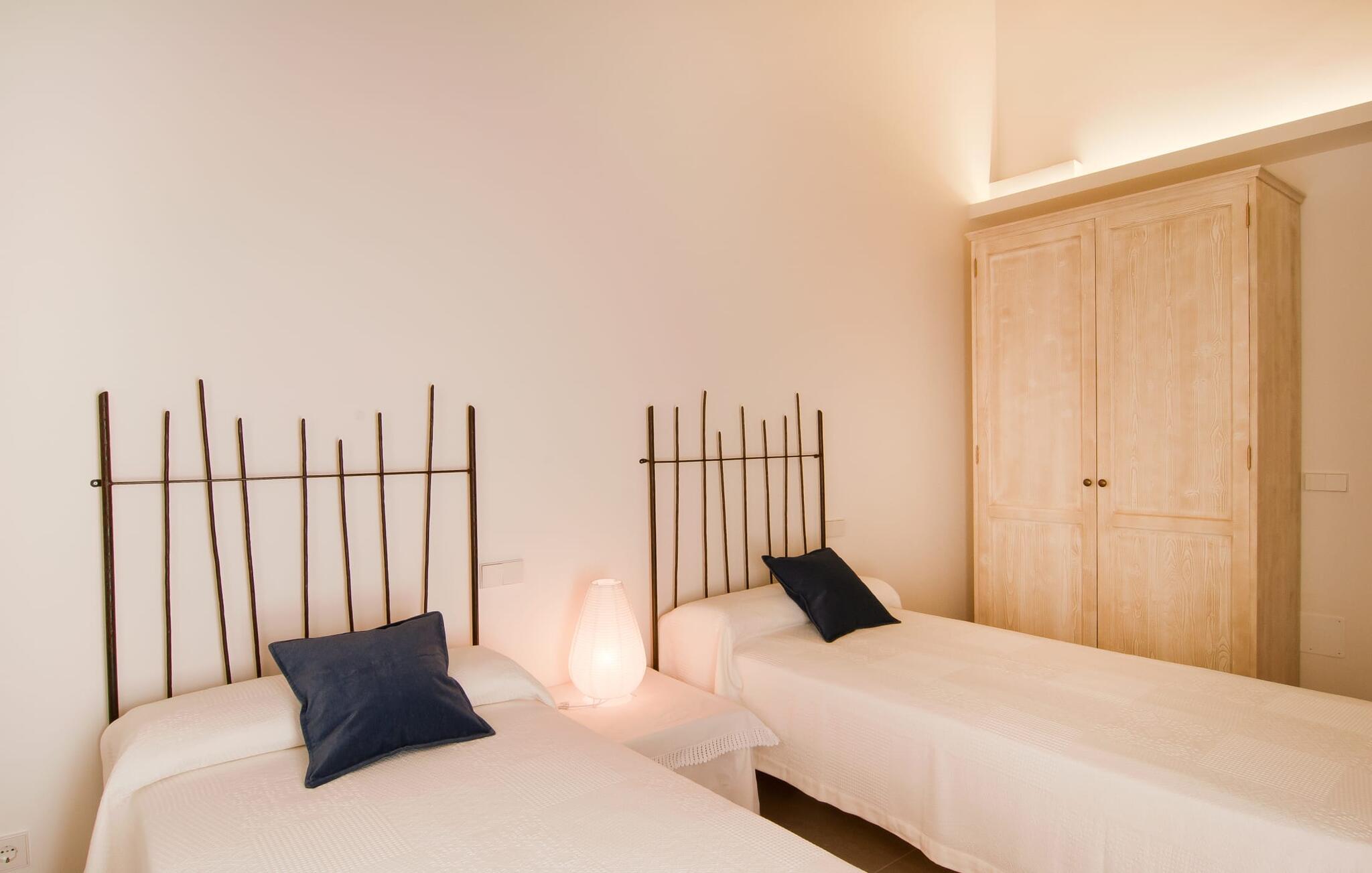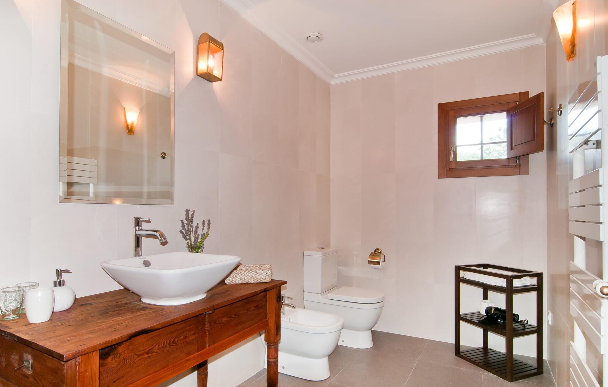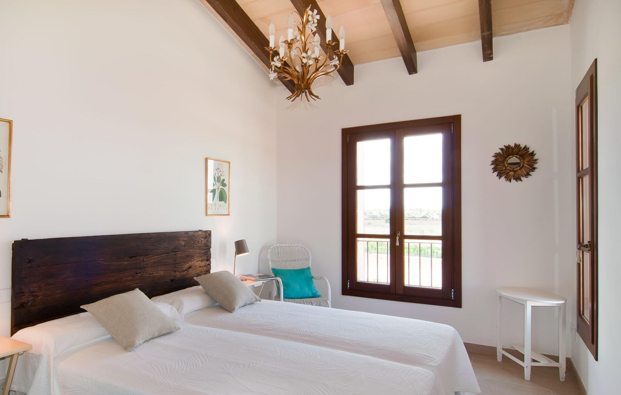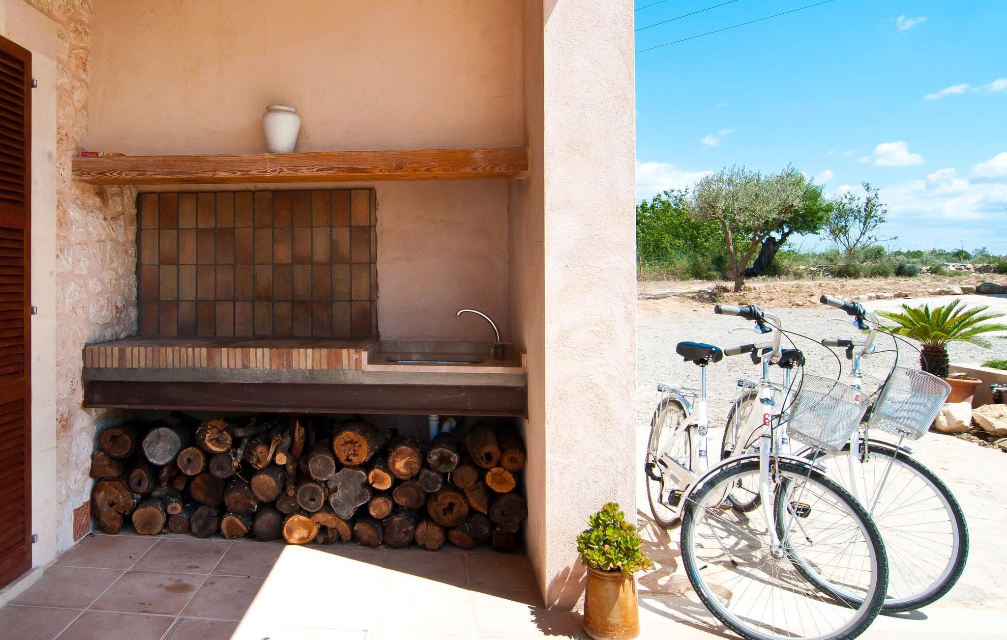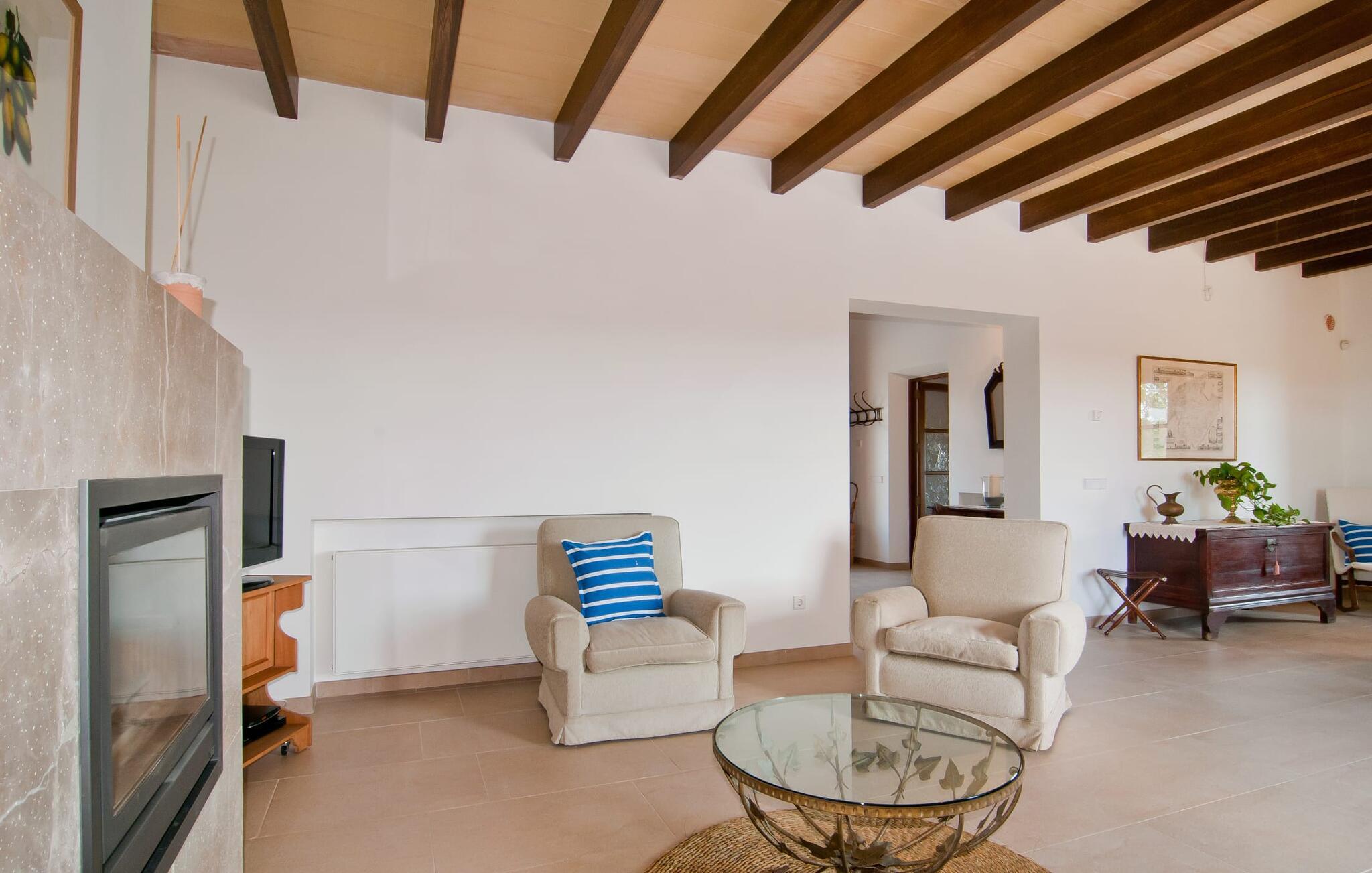 Selv på afstand kan I se, hvilket fortryllende feriehus villaen "Son Perot" er. Det to-etagers hus med en betagende smuk naturstensfacade samt trævinduer og skodder er beliggende på en 15.000 m² stor grund, der nyder godt af gode transportforbindelser mellem Manacor og Vilafranca og samtidig er i landlig beliggenhed de Bonany. Ejendommen tilbyder jer også alt, hvad I behøver for en fuldstændig tilfredsstillende ferie. En del af det smukt omgivne område er præget af terrasser og græsplæner samt forskellige dekorative middelhavsplanter i bede og krukker. I kan køle af på varme dage i den 9 m lange pool, som er placeret foran huset. Poolen kan nemt nås via en bred trappe og er omkranset af en indbydende solterrasse. Der er seks komfortable liggestole til rådighed for omfattende afslapning. Her kan I ligge og drømme under den dybblå middelhavshimmel og lægge hverdagen langt bag jer. En parasol er tilgængelig for yderligere beskyttelse mod UV-stråler. Terrassen direkte foran huset, som kan nås via få trin, giver også mulighed for at sidde i den luftige skygge og nyde de fantastiske omgivelser derfra. I kan sidde ved det massive spisebord i en fantastisk atmosfære, spise jeres måltider udendørs, som I ønsker, og lade blikket vandre i det fjerne. Udekøkkenet og grillen giver fremragende muligheder for at tilberede mad al fresco og giver mulighed for at tilberede lokale delikatesser ved hjælp af råvarer indsamlet fra markedet. Husets indretning er ikke kun hyggeligt, men også meget smagfuldt og skaber en fantastisk atmosfære at blive hængende i. Lyse materialer er omgivet af kontrasterende elementer, for det meste lavet af træ, som bidrager væsentligt til den harmoniske stemning. I kan finde jer tilpas i sofaområdet eller spise sammen i den afslappende stue/spisestue i åbent plan. Et fjernsyn og pejs fuldender komforten i dette værelse. I dette hus bliver dekoration brugt sparsomt og omhyggeligt, så der på intet tidspunkt opstår et overbelastet billede, men tværtimod præger følelsen af rummelighed behageligt rummene. Det gælder også det rummelige køkken, hvor typisk mallorcansk flair er blevet dygtigt kombineret med modernitet. Et godt sted for en fest med familie eller venner. Køkkenet byder på alt til jeres daglige behov. Filterkaffemaskinen giver jer mulighed for at lave frisk kaffe hver morgen. Fire soveværelser er individuelt indrettede og tilbyder det ideelle hvilested for enhver smag. Ejendommen er udstyret med seks senge i alt, hvoraf fire er 0,90x2,00m og to er 1,60x2,00m. Et andet soveværelse er smukt indrettet som børneværelse og har en enkeltseng og en køjeseng med en tredje udtræksseng. Madrasmålene er her 0,80x1,80m. Dette feriehus kan derfor højst rumme otte voksne og fire børn. De tre stilfulde badeværelser - et i stueetagen, de to andre på første sal - er udstyret med sofistikeret indretning, og deres design fortsætter på overbevisende vis husets æstetik. To hårtørrere og et strygejern er til rådighed i huset og skal ikke medbringes hjemmefra. Villaen ligger omkring en halv kilometer fra hovedvejen, der forbinder Manacor og Vilafranca. I Manacor finder I alt, hvad I har brug for til jeres daglige behov. Der er også et stort udvalg af restauranter med godt mallorcansk køkken. Sydøstkystens strande, som er nemme at nå fra feriehuset, er blandt de smukkeste bugter på øen. Den yderst charmerende villa "Son Perot" ligger kun 8 minutter vest for Manacor på den østlige del af øen. Vilafranca ligger i den anden retning, cirka samme afstand fra feriehuset. Det veludstyrede hus er ideelt til en familieferie. I Manacor finder I en solid infrastruktur og alt hvad I har brug for til jeres daglige behov. En af de nærmeste smukke strande er Cala Varques, som kun ligger 17 kilometer væk.