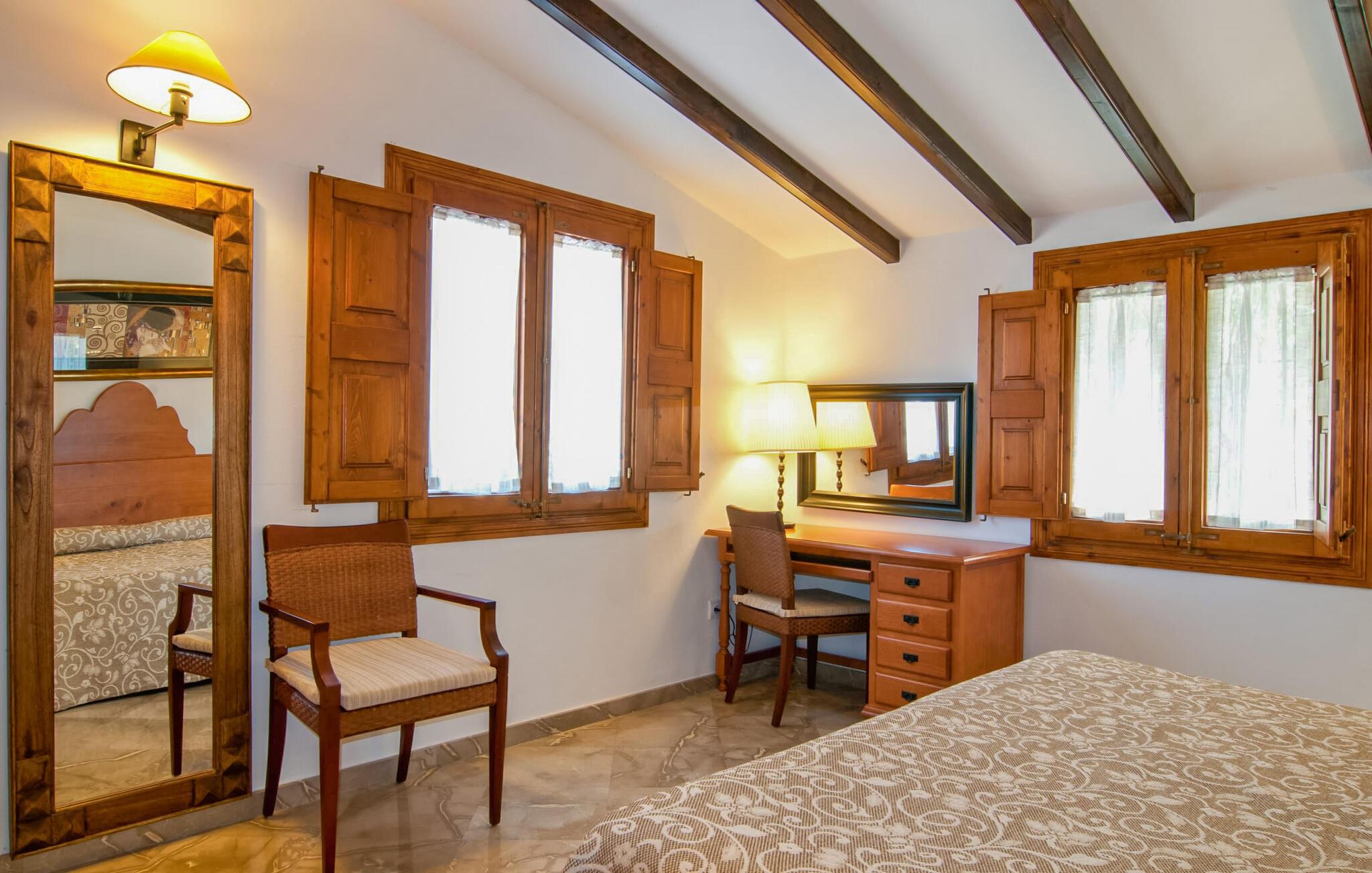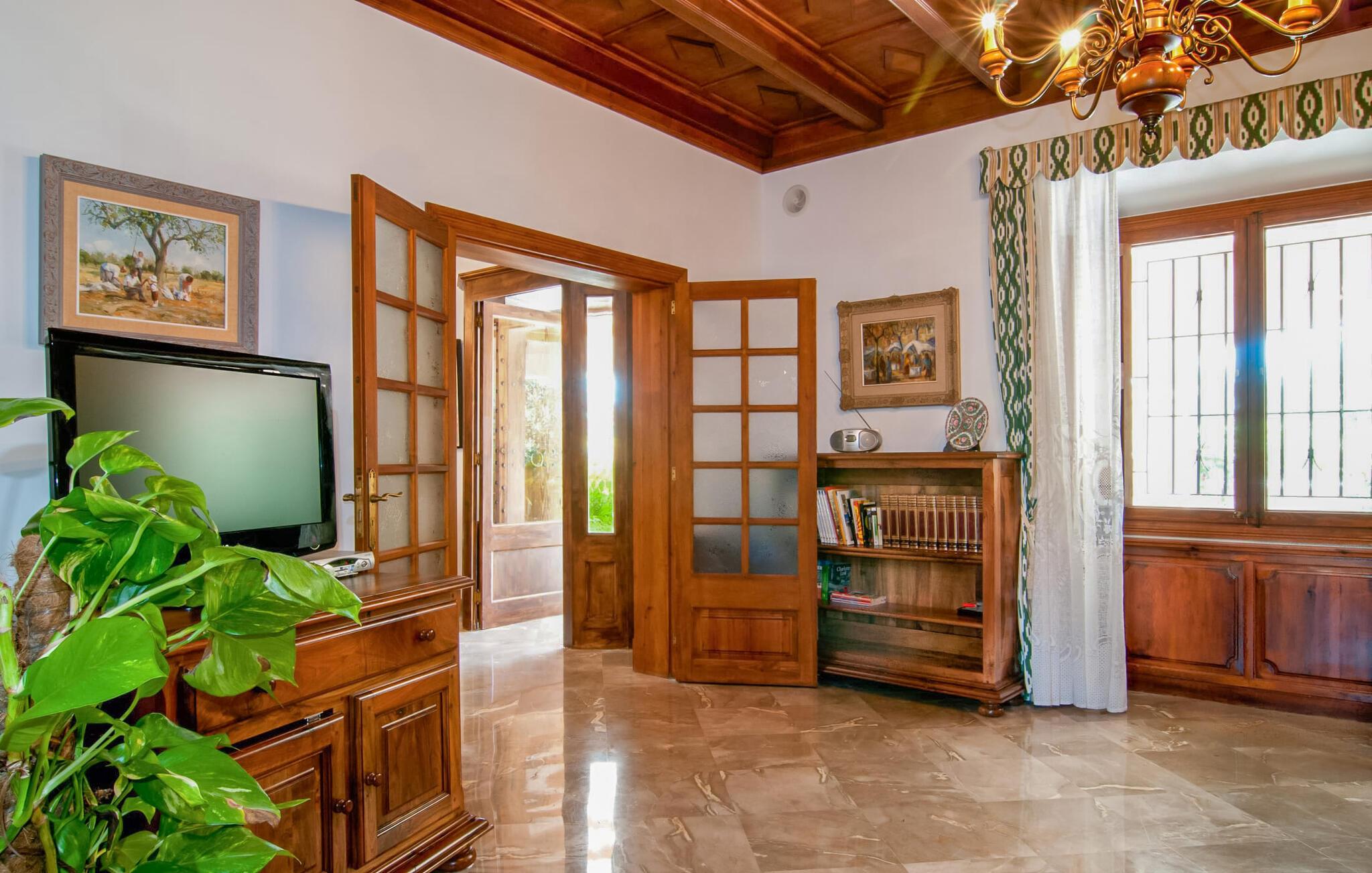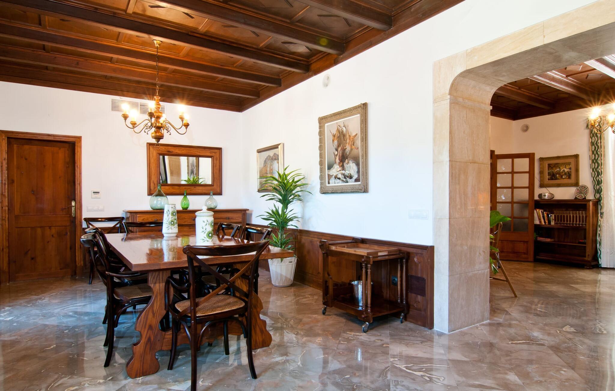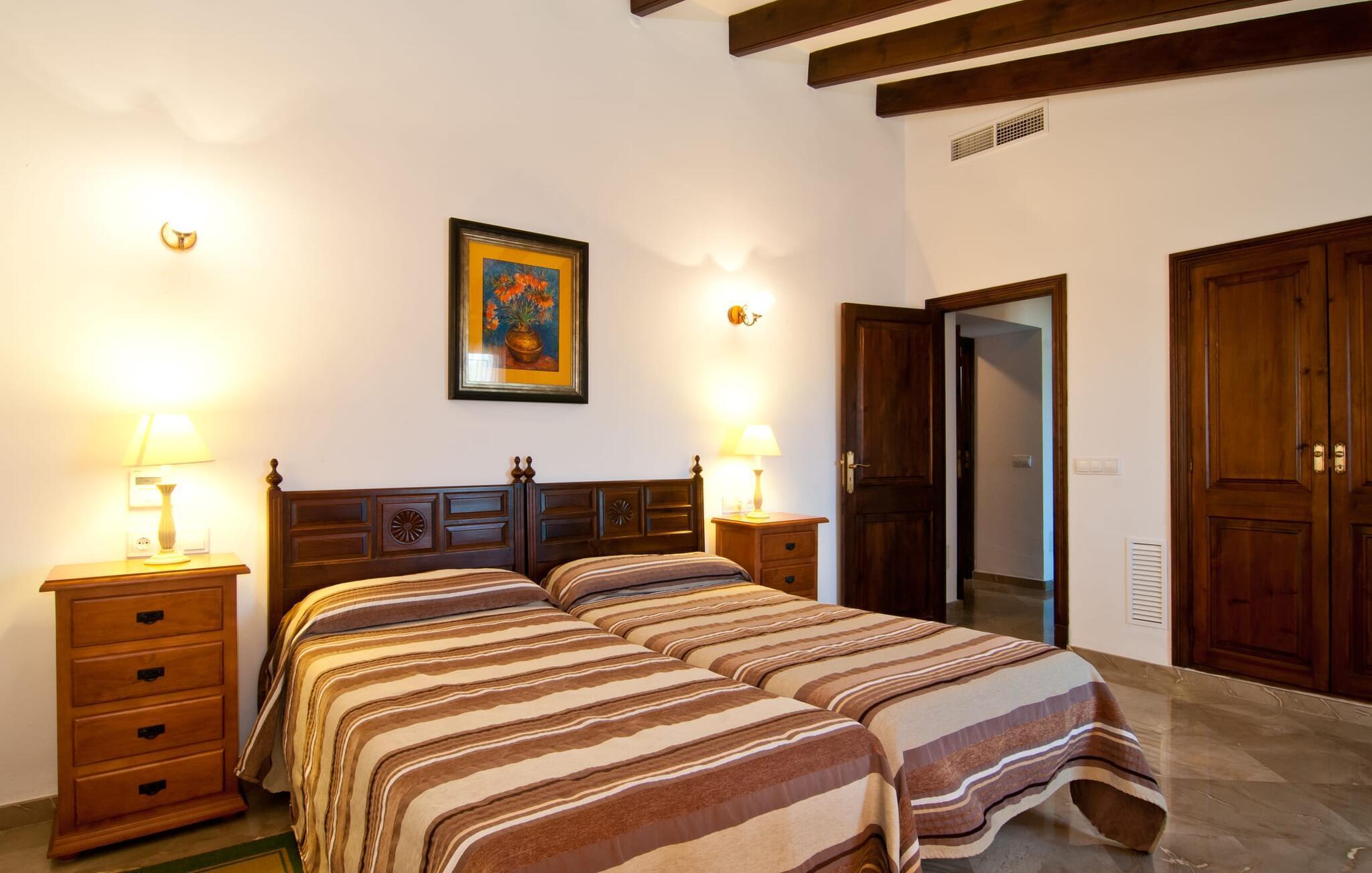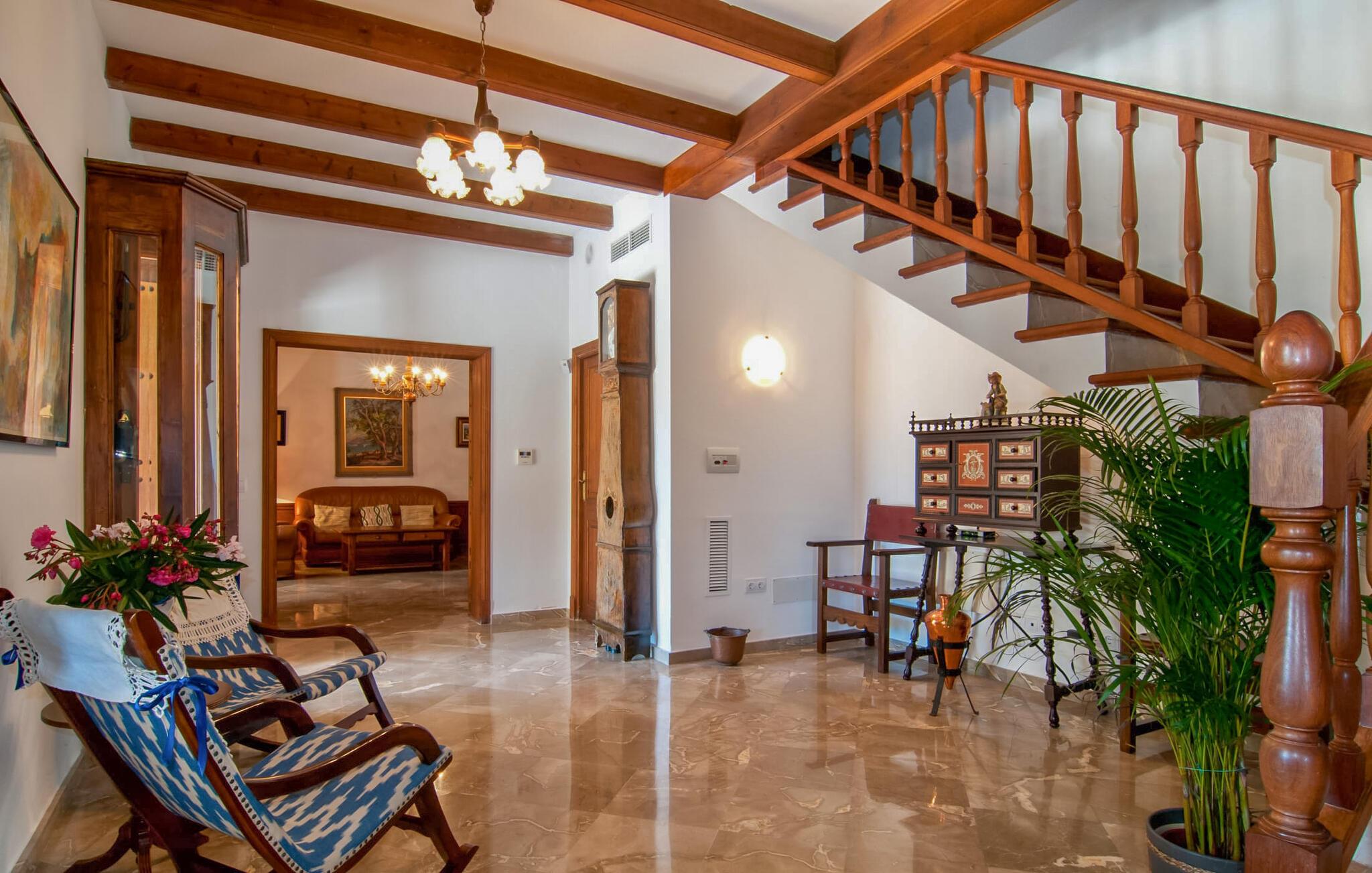 Indenfor har villaen smagfulde møbler, aircondition i alle værelser og traditionelle synlige bjælker. Der er fem komfortabelt renoverede dobbeltværelser, fire badeværelser og et gæstetoilet. Den rummelige opholds- og spisestue med to åbne brændeovne skaber en varm og indbydende atmosfære, mens det fuldt udstyrede køkken gør måltiderne nemmere.