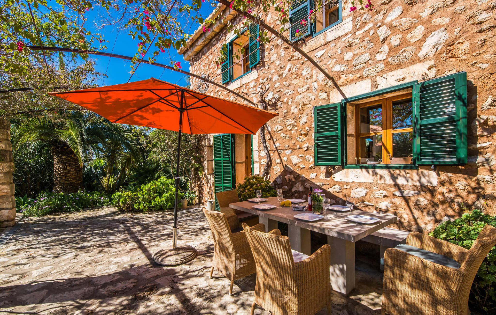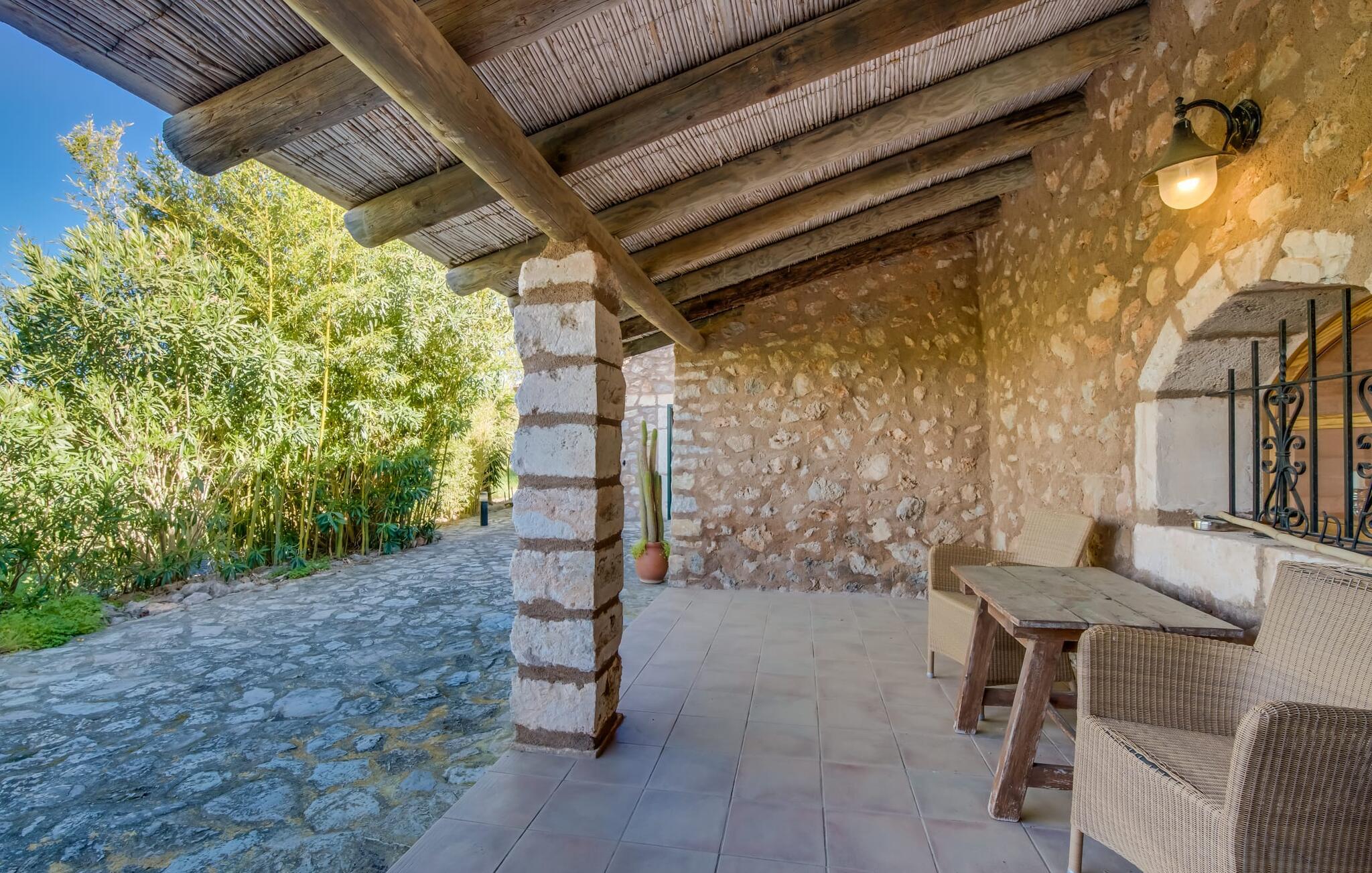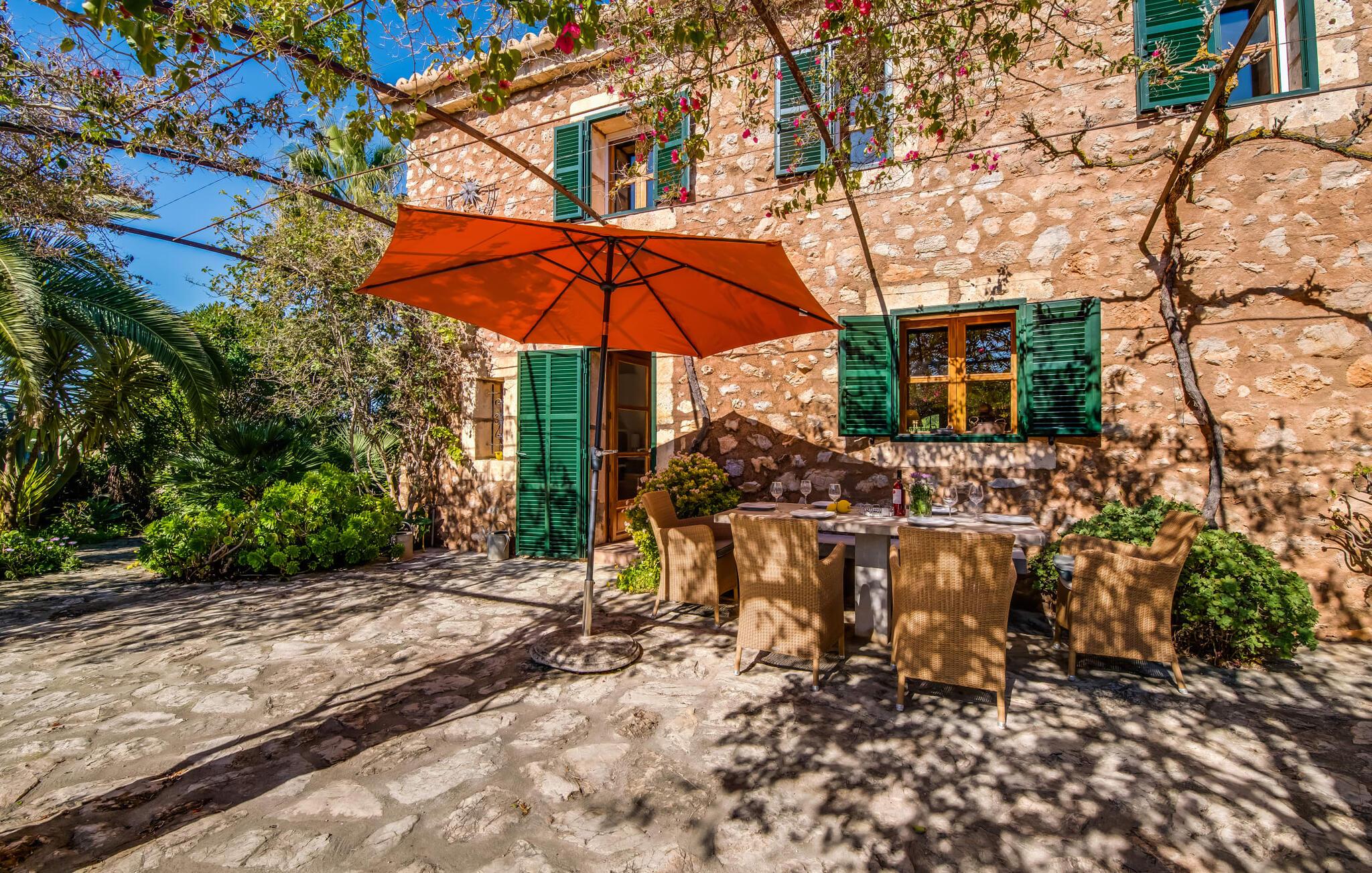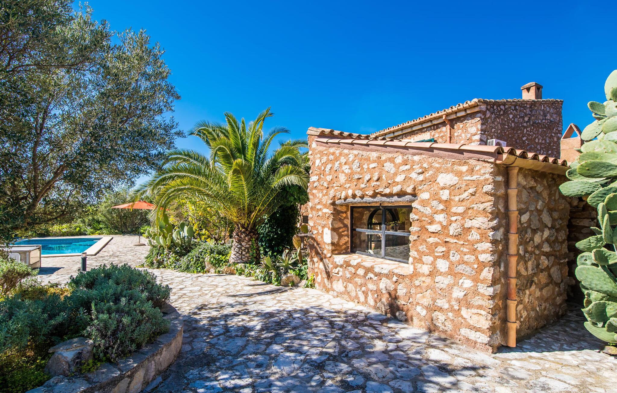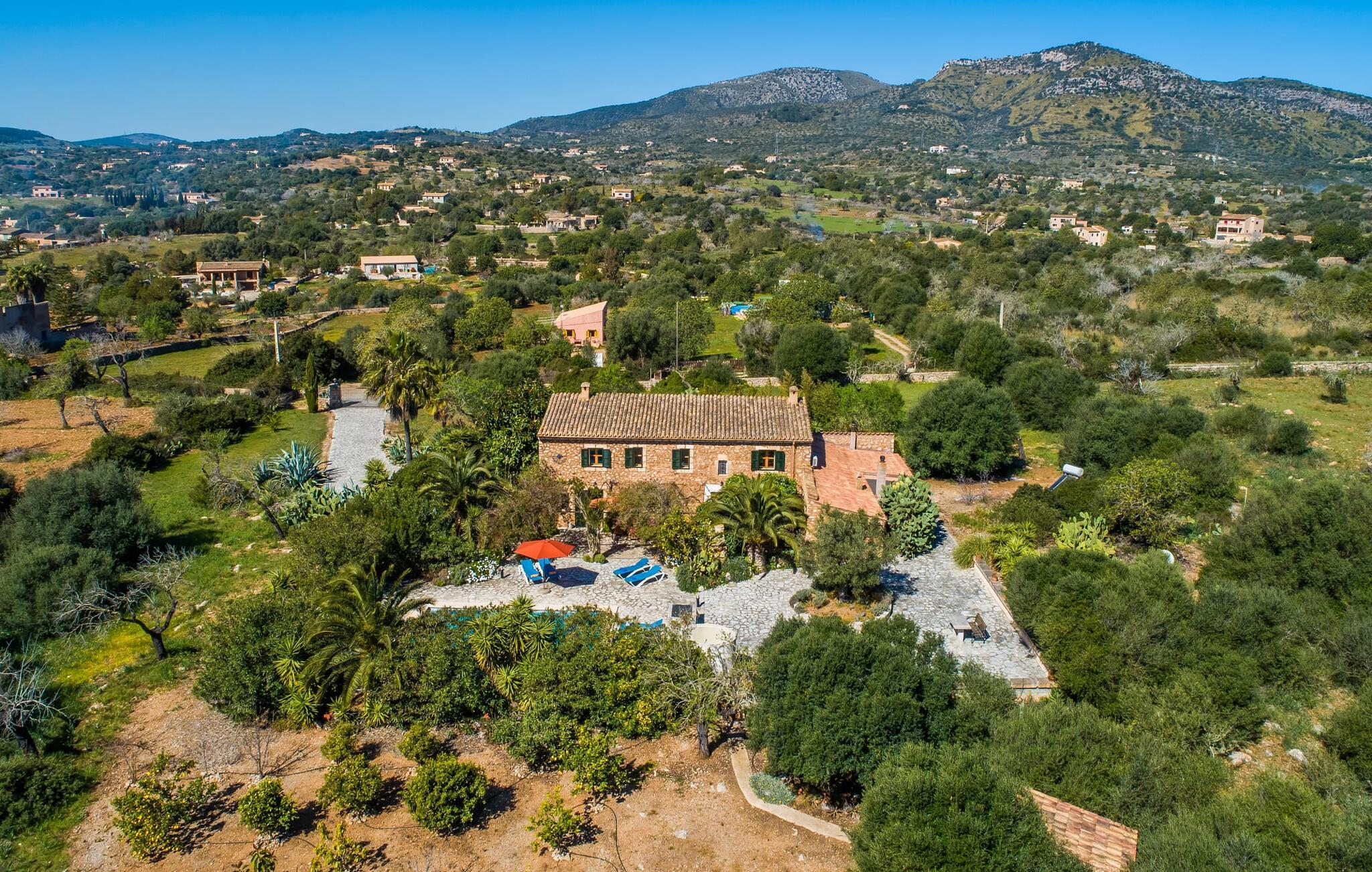 Citrontræer, palmer, kaktusser - "Son Pi" er omgivet af en vidunderligt fortryllende have, der næsten ikke kunne være mere naturlig og rustik. Ejendommen har ikke kun smukke planter, det omkringliggende område er også præget af frodig vegetation. Dette rundes af af det ru stengulv, som passer så vidunderligt ind i billedet, og selvfølgelig af selve villaen, der emmer af ren ro med sine grønne skodder. I kan finde siddepladser i delvis skygge af den tilgroede pergola, på komfortable rattanmøbler eller på den overdækkede terrasse foran huset. Hvis I ønsker det, kan I varme murstensgrillen op eller forkæle jer selv med en forfriskende svømmetur i den højkvalitets flisebelagte, velholdte pool - I kommer nemt ind via få trin. Der er også en udendørs bruser lige ved siden af poolen. Liggestole, mobile parasoller, masser af privatliv - I har alt hvad I behøver til en afslappende dag under den behagelige ø-sol. Praktisk for jeres ankomst: En asfalteret vej fører direkte til villaen og tilbyder plads til parkering. Interiøret er ikke mindre charmerende. Fuldstændig nyrenoveret, oprindeligt indrettet med stor sans for detaljer. Alt I skal gøre er at pakke jeres kufferter ud, og I vil føle jer afslappet. Masser af naturlige elementer, masser af træbjælker og stenvægge, plus varme farver og masser af naturligt lys. Den hyggelige stue/spisestue imponerer med sin smukke siddegruppe og store bord, men har også en pejs, der varmer jeres fødder på køligere aftener. Fra den anden ende af rummet kommer I ind i køkkenet, som er udstyret med mange praktiske faciliteter. Så smukt: den separate spisestue med en stor glasvæg og udsigt til haven. Et godt sted at afslutte dagen om aftenen med et knitrende bål. "Son Pi" har i alt tre dobbeltværelser, hvoraf to er ovenpå og har eget badeværelse og udsigt til havet i det fjerne. Alle værelser er venlige og komfortabelt indrettede, så intet står i vejen for en god nats søvn. Den østlige del af øen er præget af bølgende bakker, grøn vegetation og landlige vidder. Udover skøn fred og smukke gåture kan I også nyde nærheden til mange interessante byer og drømmestrande. Porto Cristo, den lille havn og fiskerlandsby med sit hvide sand og smukke strandpromenade, ligger 20 minutter væk i bil. "Son Pi" ligger på en lille gade, hvilket betyder, at der kan høres en del trafikstøj afhængig af vindretningen. Det positive er dog den næsten perfekte forbindelse til motorvej MA-15 og alle retninger på øen. Aktive rejsende vil måske tage til Pula Golfbane eller besøge en af de mange grotter i denne region, som bestemt er et besøg værd. Den charmerende villa "Son Pi" ligger i den smukke østlige del af øen, lige uden for Sant Llorenç des Cardassar. Udover gode restauranter og små butikker, finder I også nogle supermarkeder i byen til jeres ugentlige indkøb. Frisk frugt og grønt kan købes på det ugentlige marked i Son Servera, som kun ligger et kvarter væk i bil. Fantastisk: de smukke strande i Porto Cristo og Sa Coma er også kun 13 km væk.